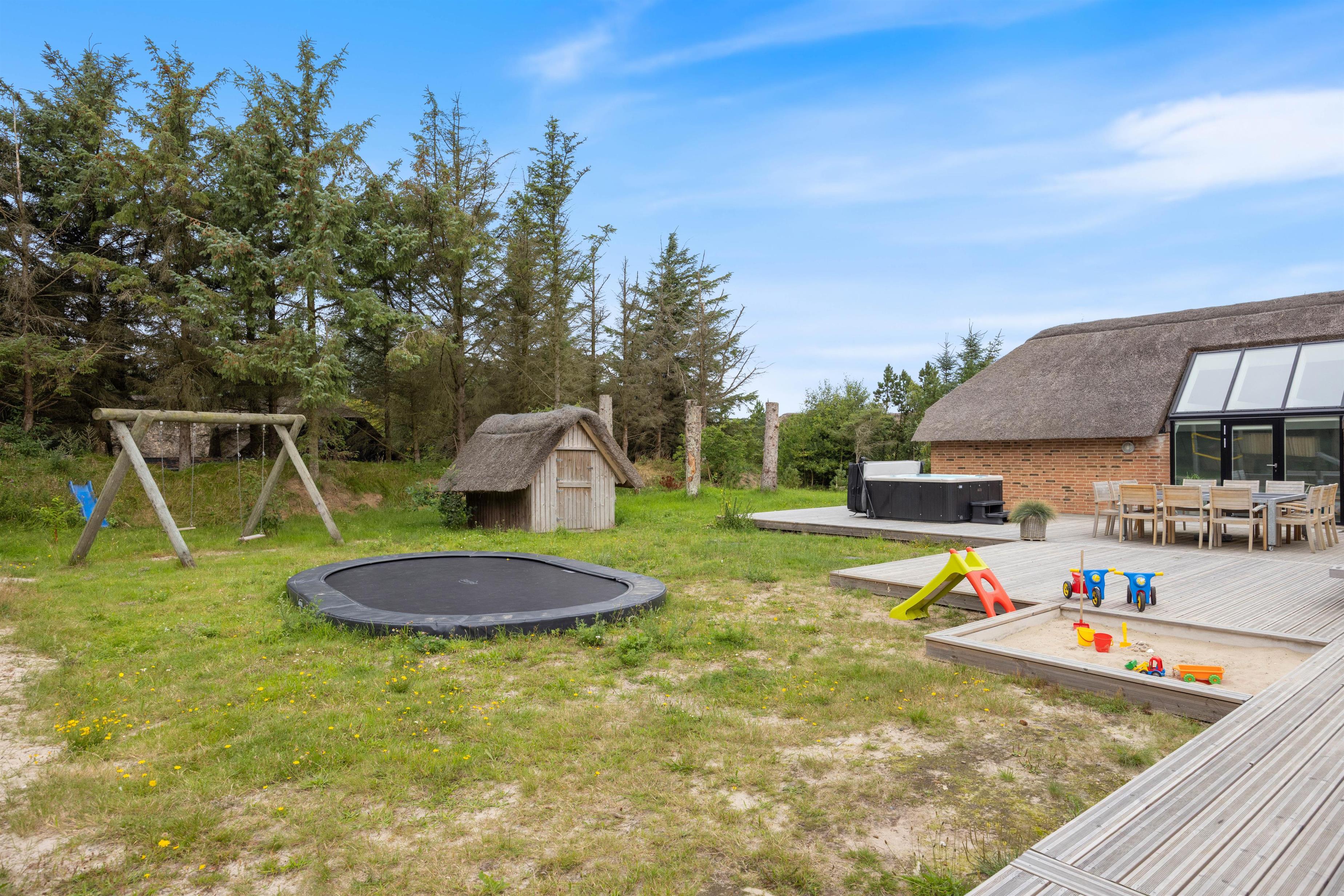 Slap af på den store sydvestvendte terrasse med kvalitets havemøbler, solvogne, parasol og gasgrill, eller find hyggen på den åbne terrasse, mens børnene leger på gynger, i sandkassen eller hopper på trampolinen. Grunden på 2.367 m² er et sandt paradis for udendørs aktiviteter, hvor I også kan spille beachvolley, lege i shelters eller bruge rutsjebanen.
