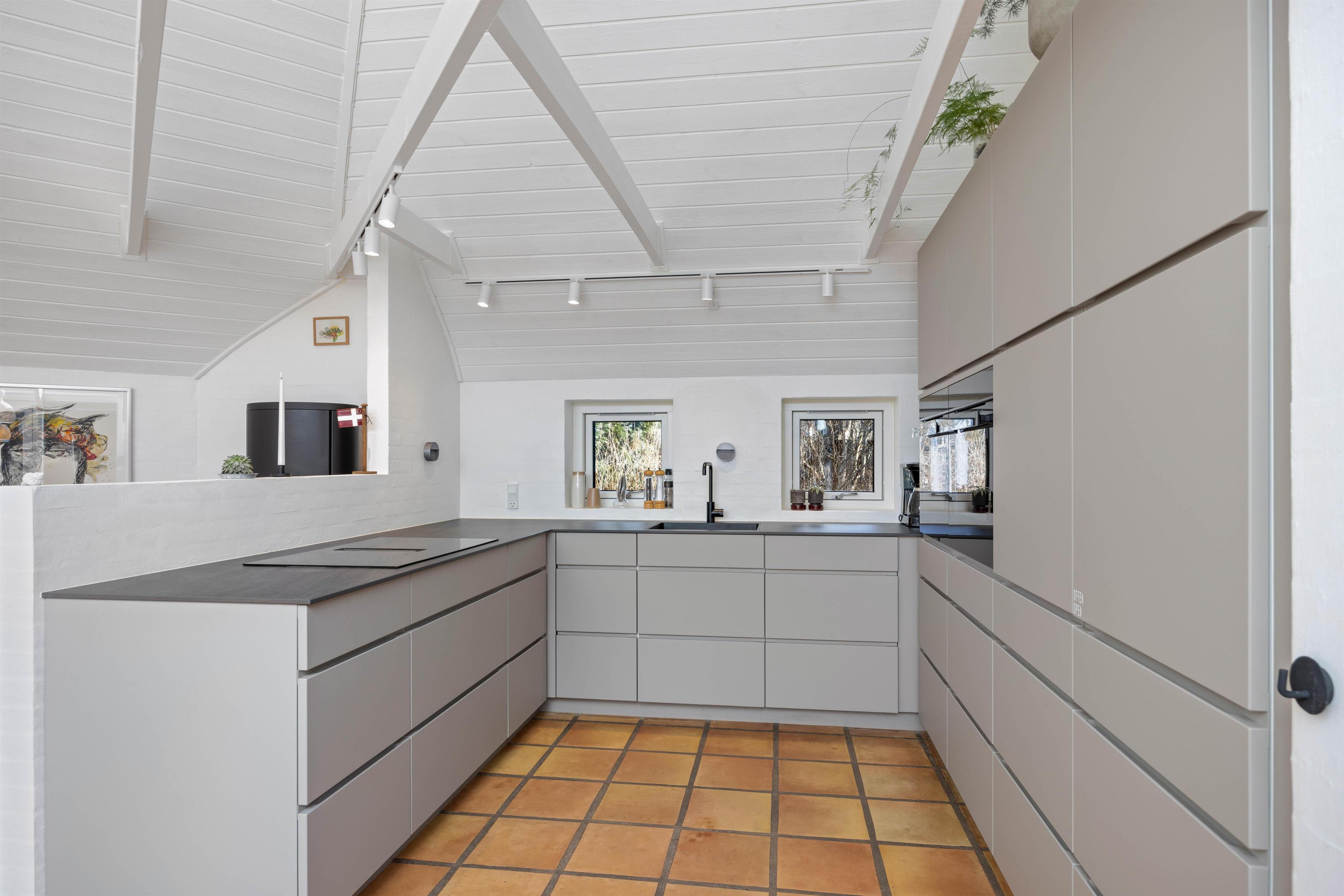 Lige så snart I træder ind i sommerhuset, bliver I budt velkommen af 220 kvadratmeters ren komfort, hvor der er tænkt på både store og små detaljer. Husets hjerte er den lyse stue- og køkkenafdeling med loft til kip, store ovenlysvinduer og panoramaudsigt over naturgrunden. Her finder I brændeovn, gulvvarme og en energibesparende varmepumpe, så temperaturen altid kan tilpasses. På de kølige dage kan I tænde op i brændeovnen og mærke varmen brede sig i hele huset.