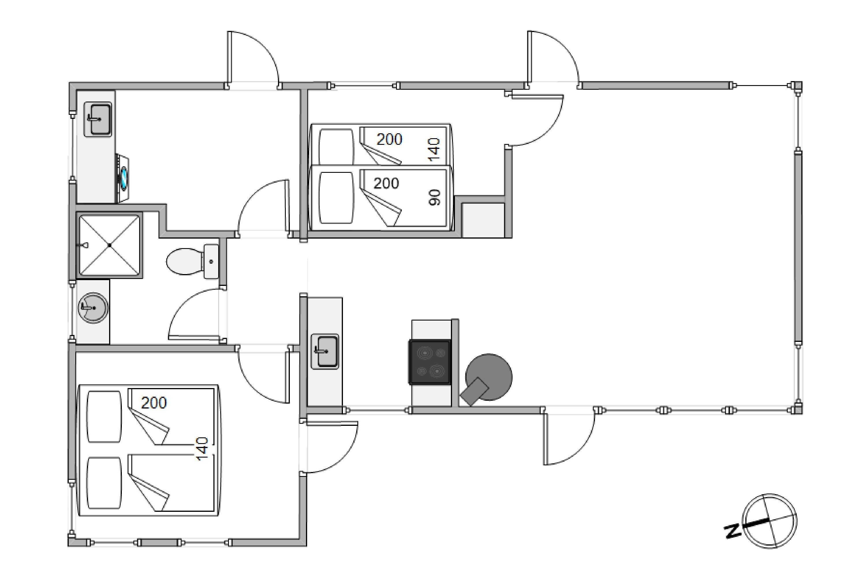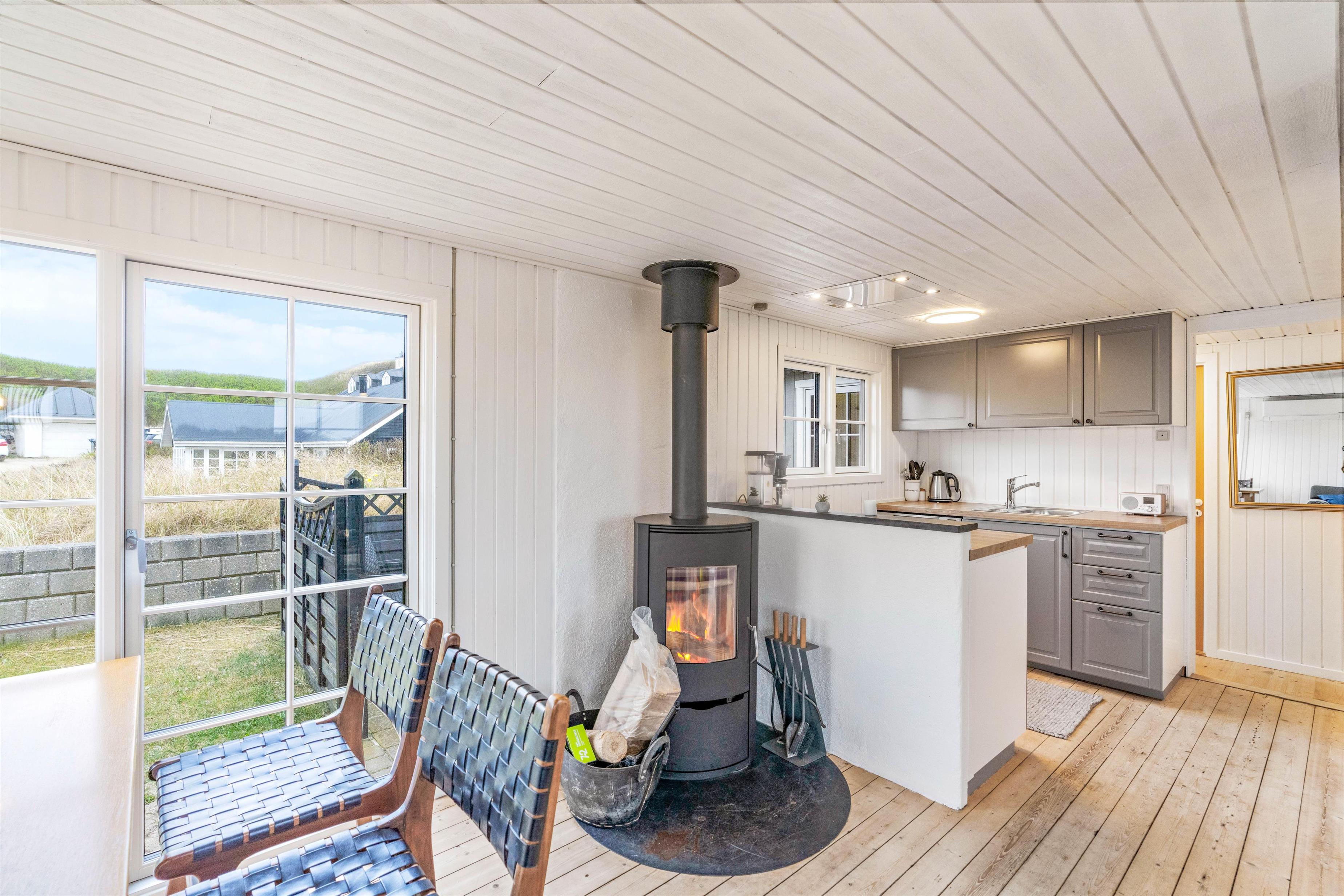 Der er et åbent køkken og spisebord i direkte forbindelse med stuen, så I kan hygge jer med madlavningen og et godt glas vin. Fra de store vinduespartier i spisestuen har I udsigt til det skønne klitlandskab udenfor. Køkkenet er veludstyret, og i feriehuset er der også et fint badeværelse og et godt soveværelse med dobbeltseng, så I har lige det, der skal til for at nyde en afslappende ferie. Der er også en køjeseng, hvis I rejser med mindre børn.