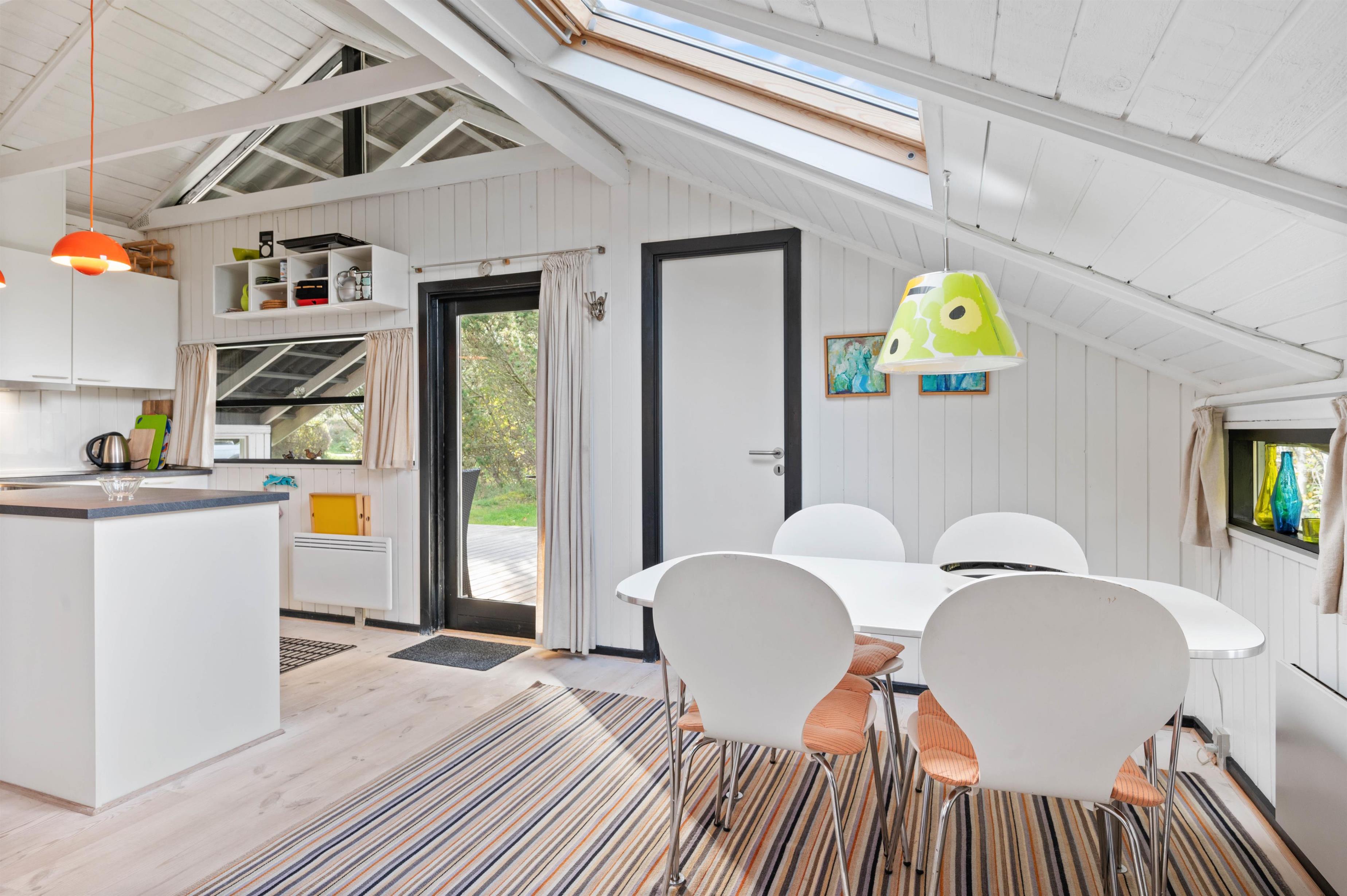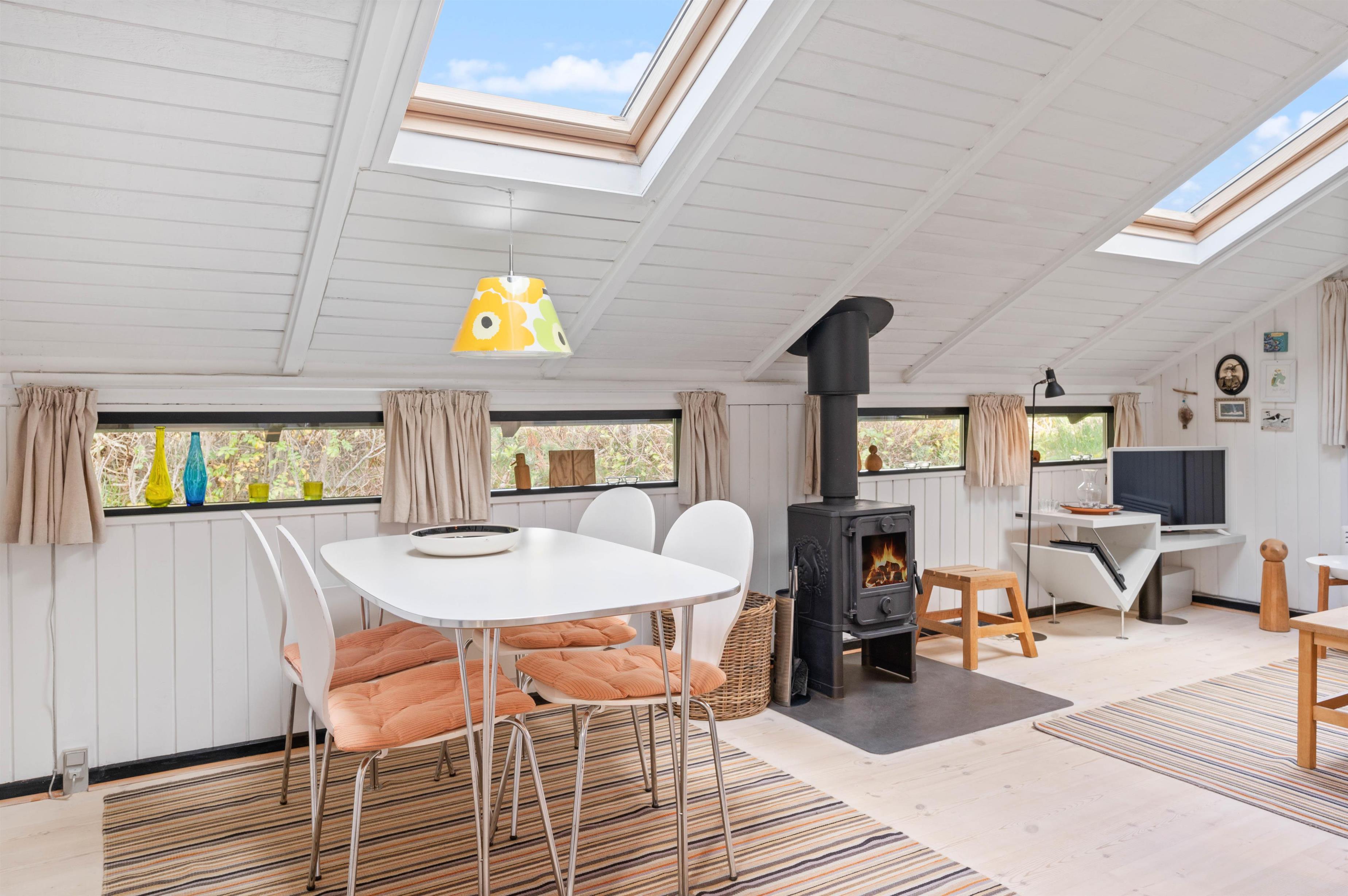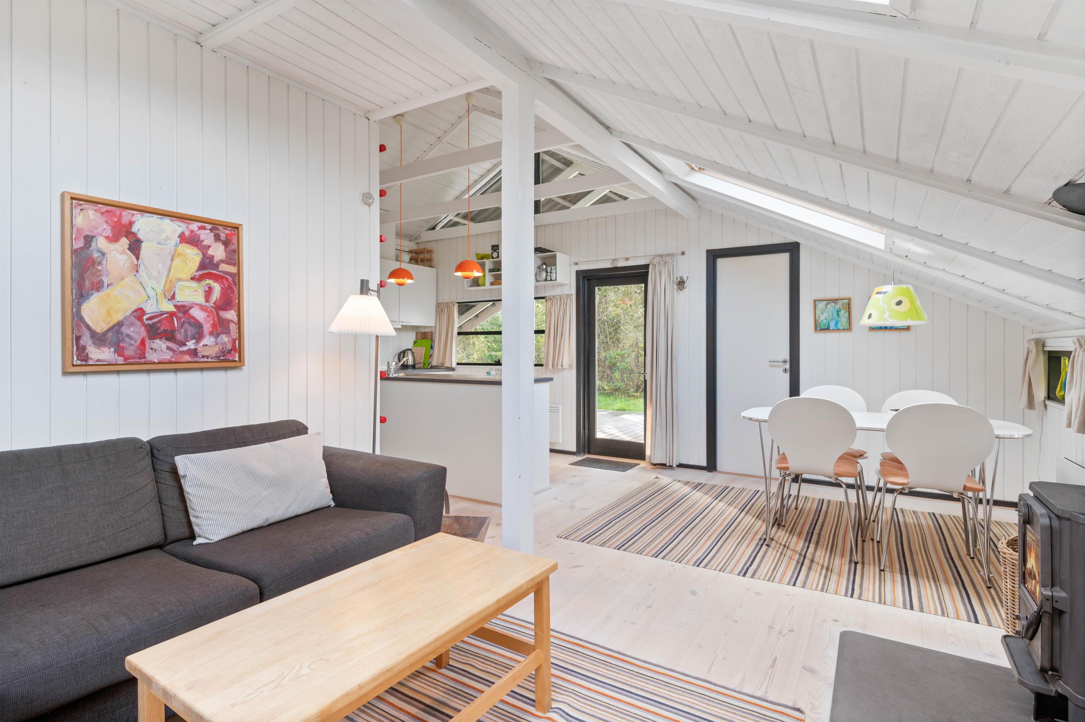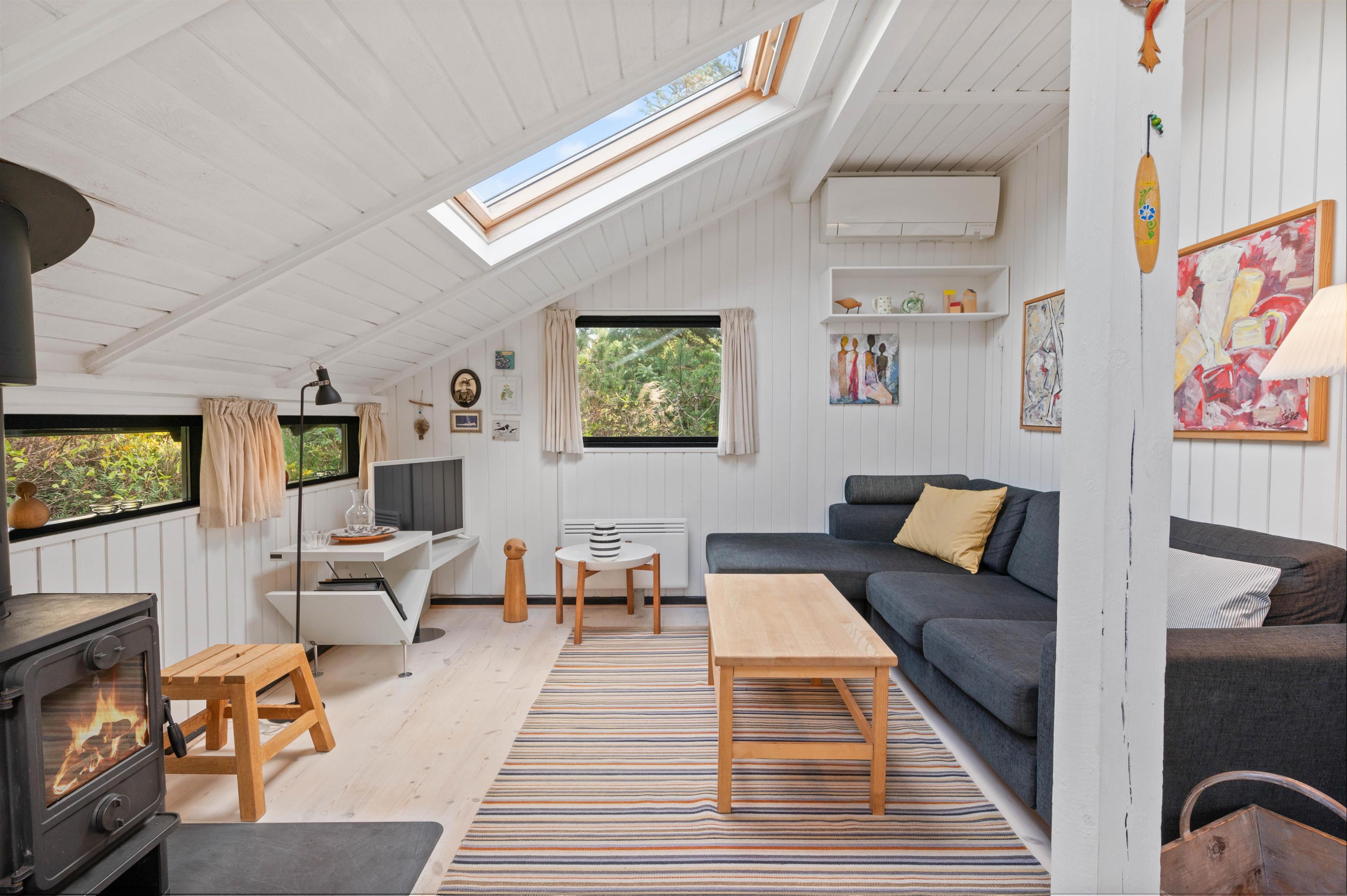 Det dejlige opholdsrum er husets hjerte. Rummet er især præget af de høje lofter til kip, lyse panelvægge og store ovenlysvinduer, der sørger for at skabe den helt rigtige sommerhusstemning. Indretningen er smagfuld og moderne, så det er umuligt ikke at føle sig tilpas. Møbler og interiør er holdt sorte og hvide nuancer, men de monokrome farver brydes af flere farverige indslag, der gør indretningen personlig, hyggelig og ikke mindst interessant. Her altid en ny detalje at opdage.