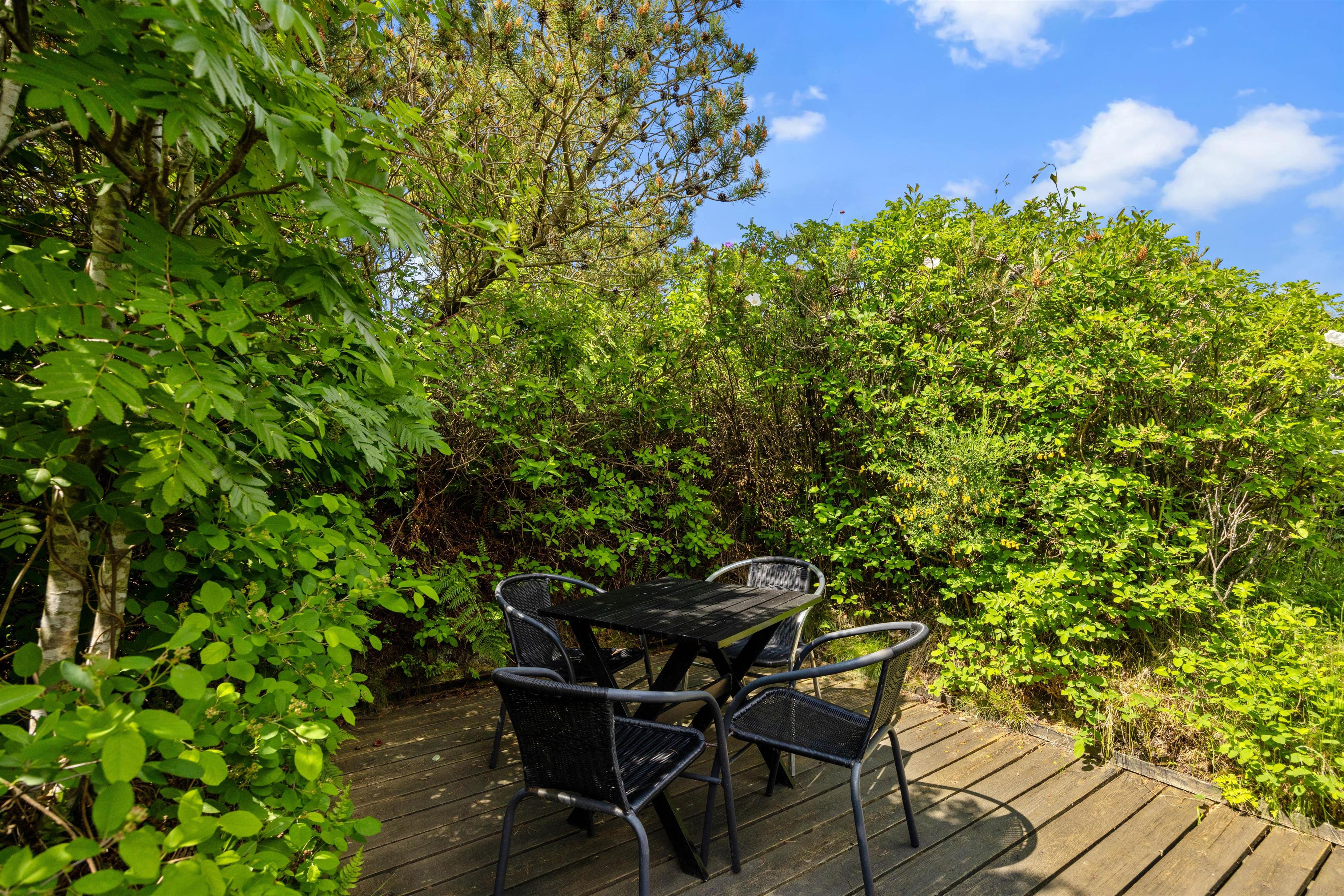 Huset ligger tilbagetrukket og fuldkommen ugeneret på en rolig vej, så I kan nyde jeres feriedage i fredelige og rolige omgivelser i jeres egen lille oase. Omkring grunden står nåletræer, buske og træer og skærmer for både vind, vejr og nysgerrige blikke.