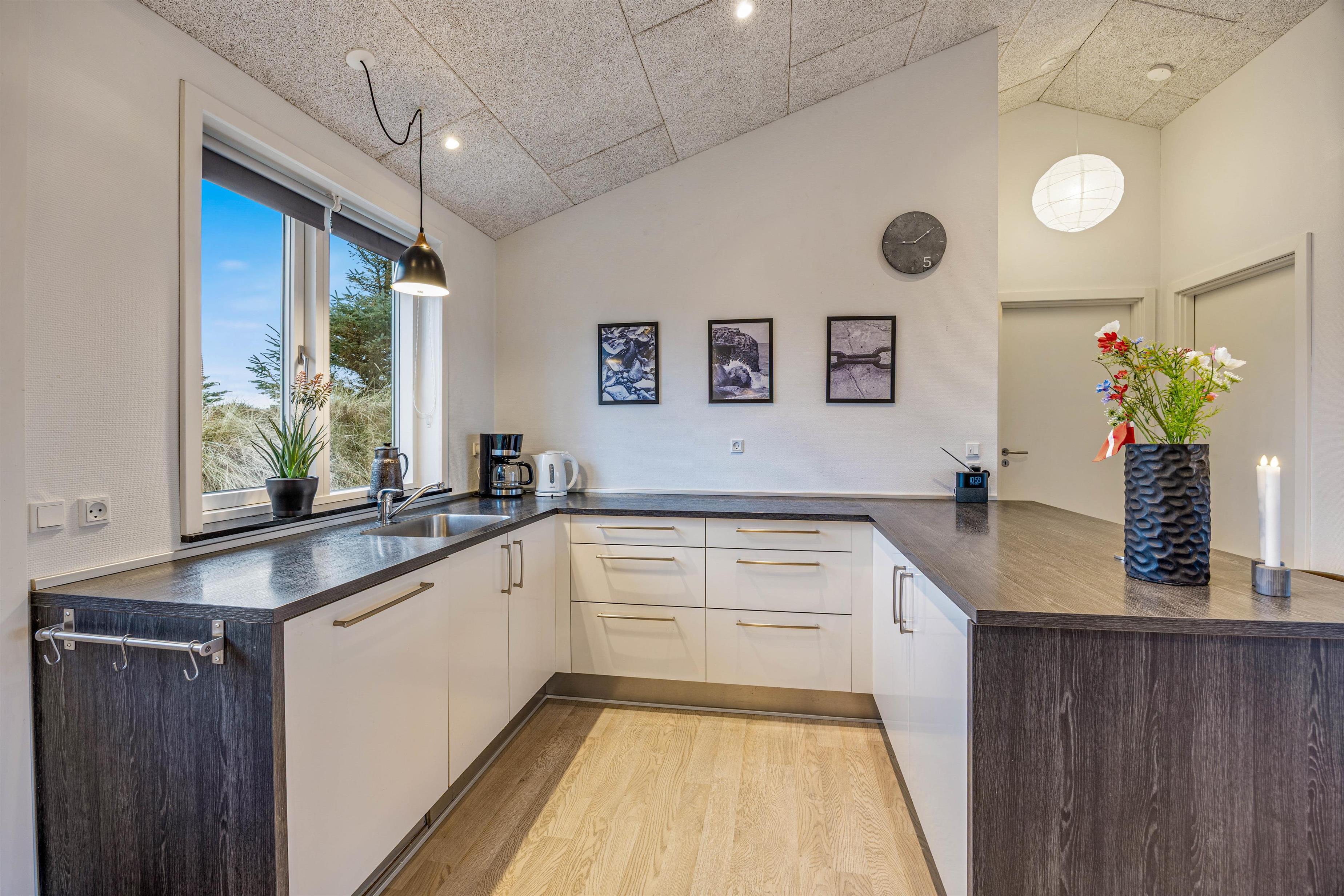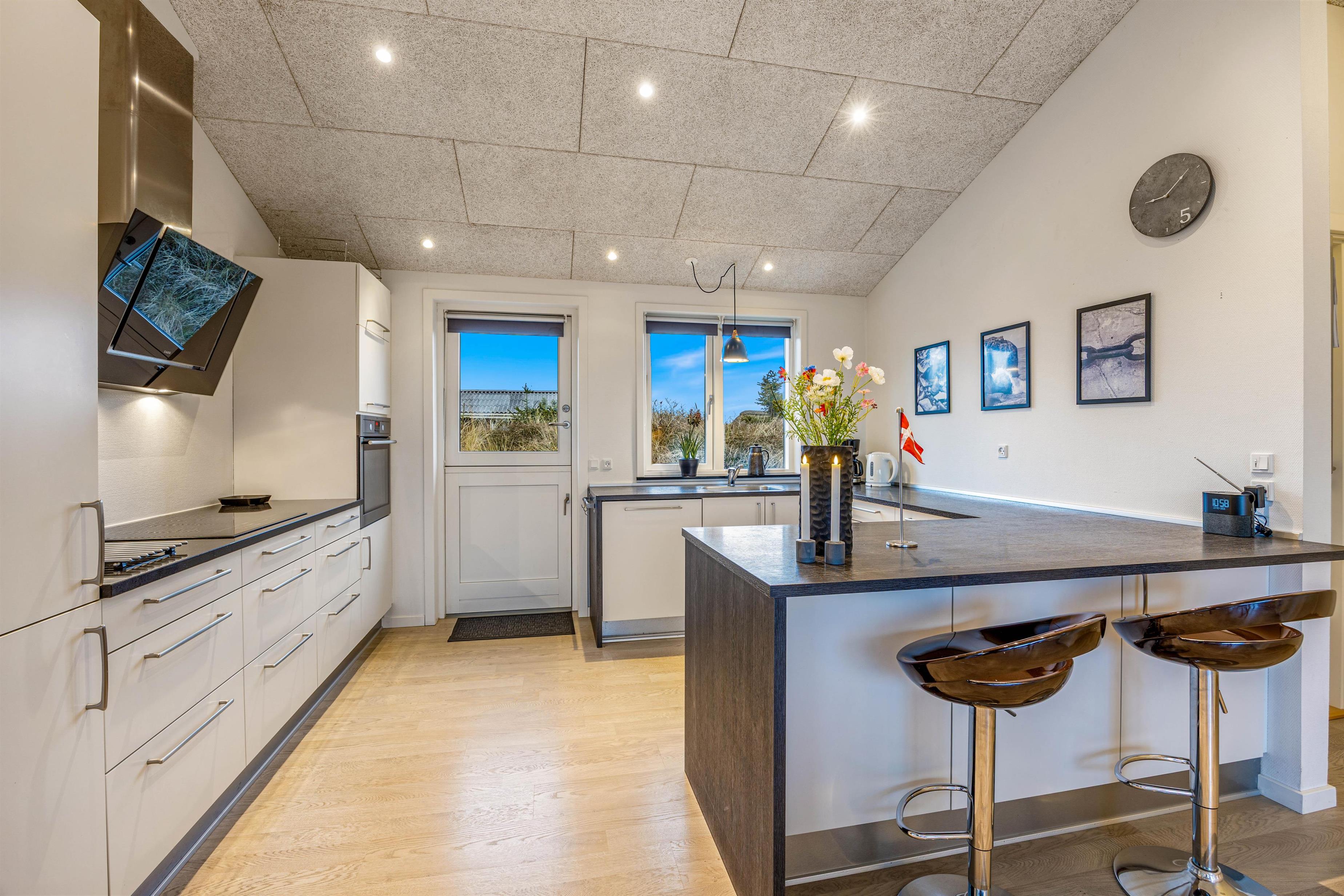 Det veludstyrede køkken-alrum ligger i åben forbindelse med den lyse spisestue, så feriekokken har de bedste betingelser for at tilberede lækre feriemåltider og samtidig være en del af samværet omkring spisebordet. Køkkenet er desuden udstyret med opvaskemaskine og en separat fryser på 60 liter, så der er mere tid til afslapning og hygge.