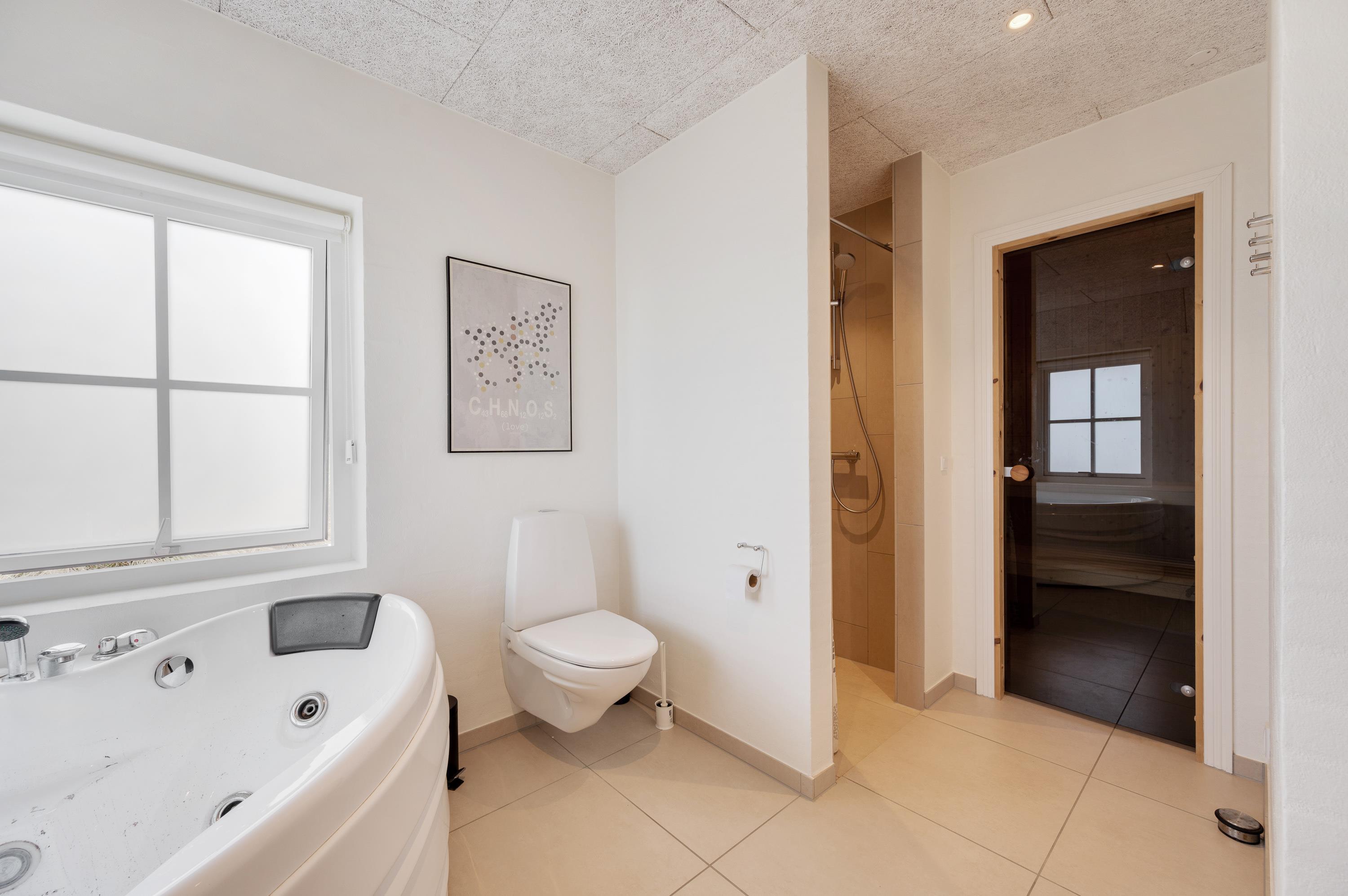Jeres ferieafslapning kan forsætte på det største af husets badeværelser, hvor I kan se frem til både spabad og sauna. Efter en lang gåtur ved vandet vil en tur i både spaen og saunaen med garanti være en skøn forkælelse. Herudover er der et mindre gæstetoilet, der fremstår pænt og lyst og både har gulvvarme og bruseniche.