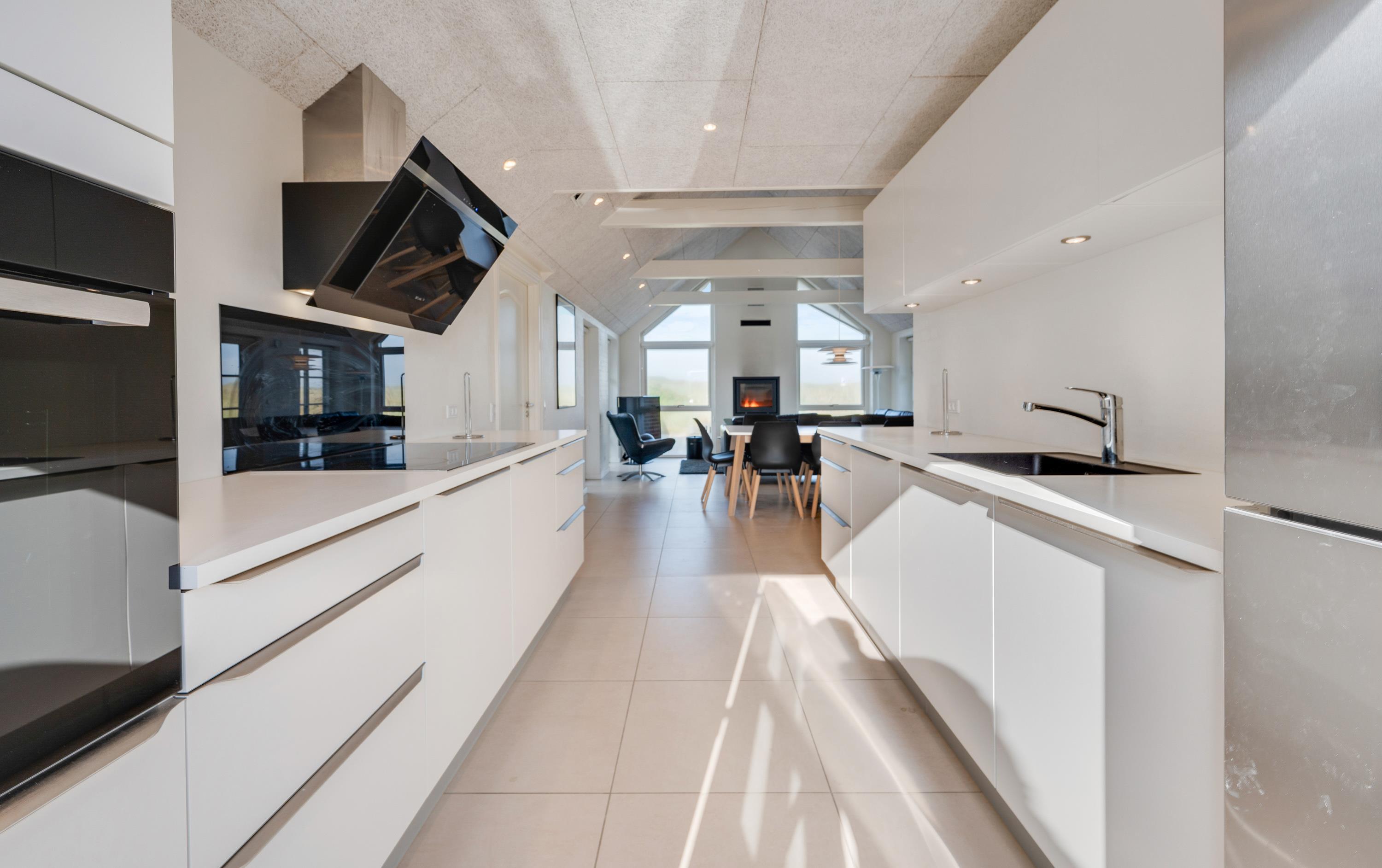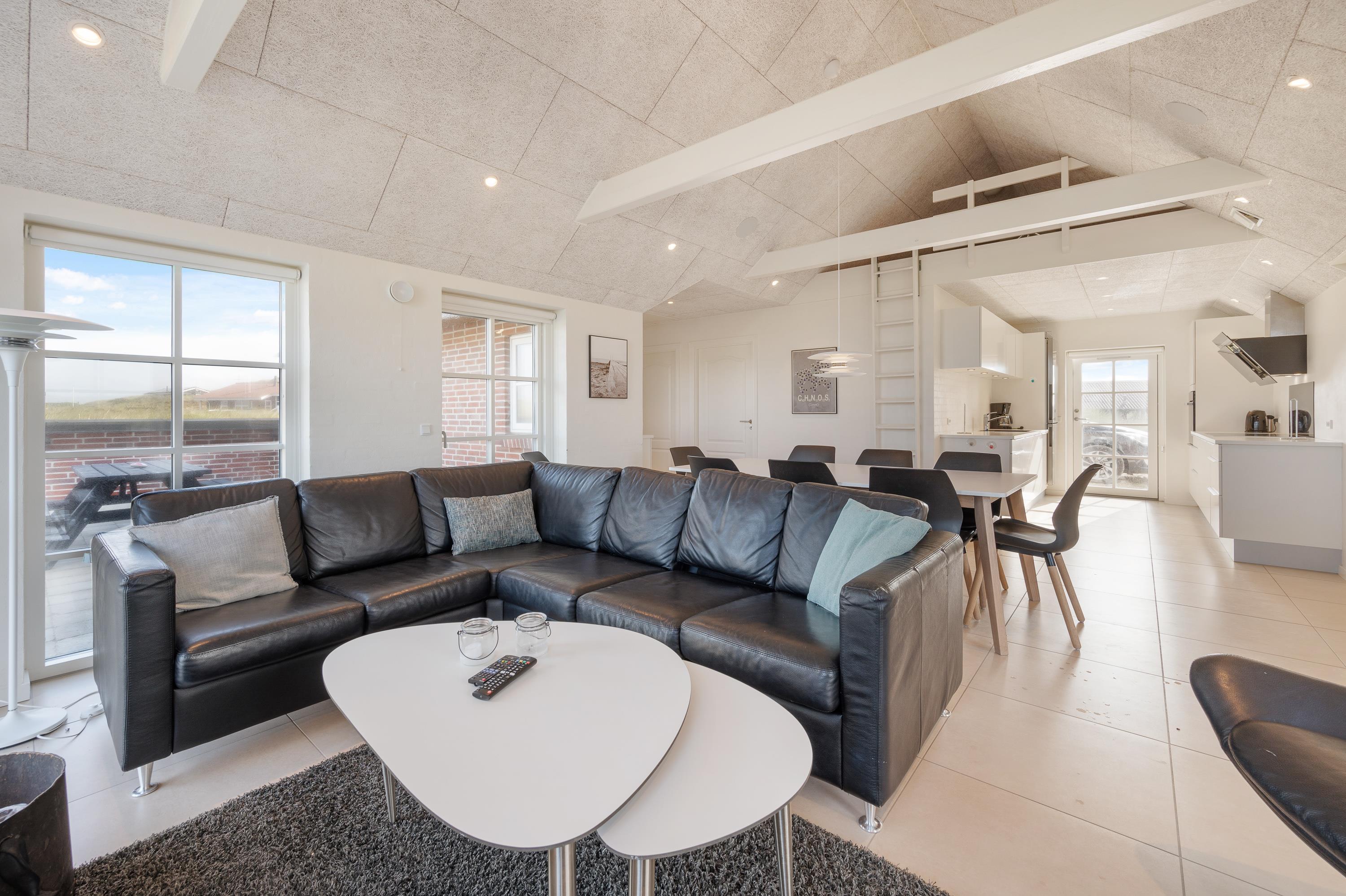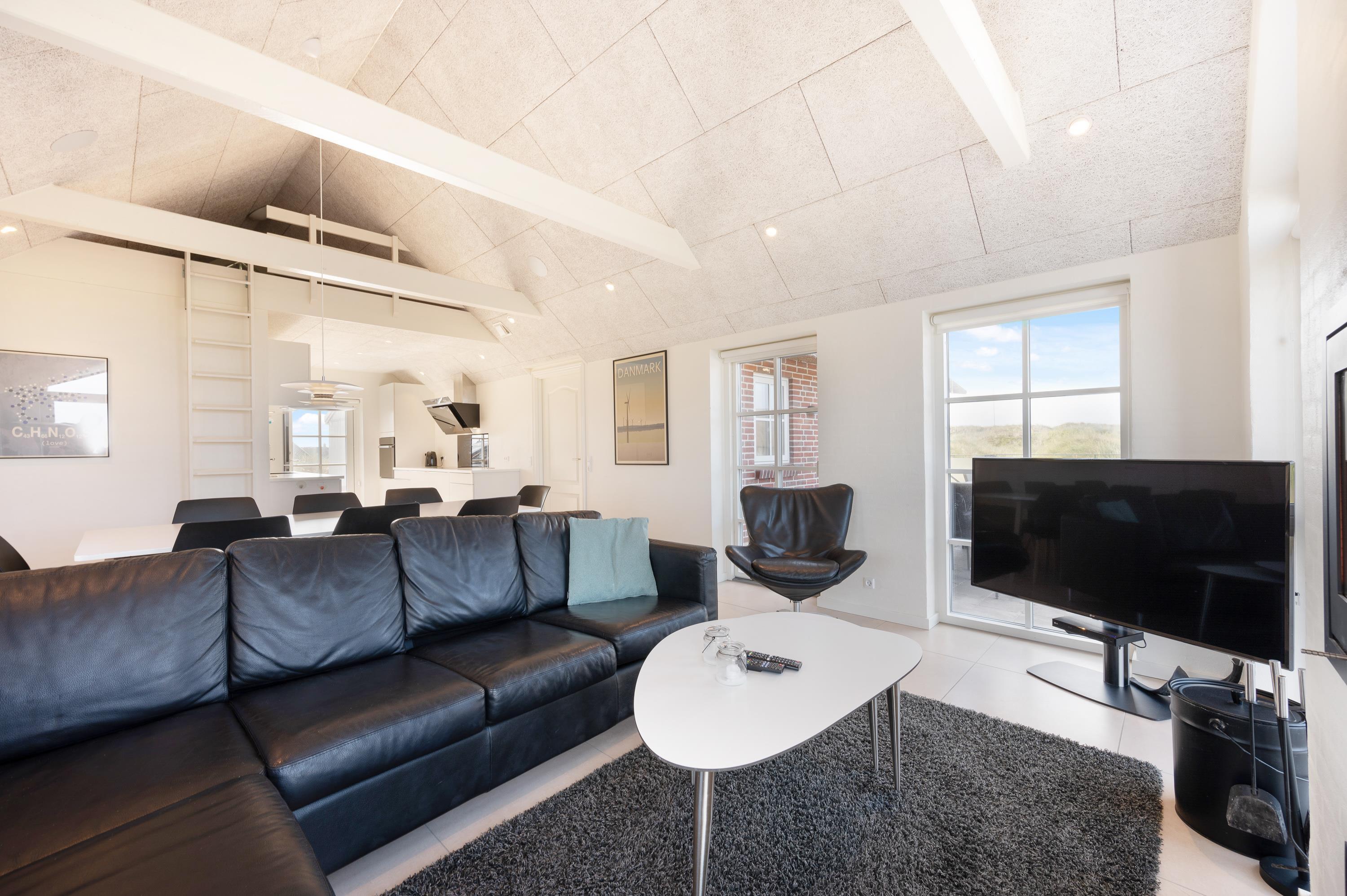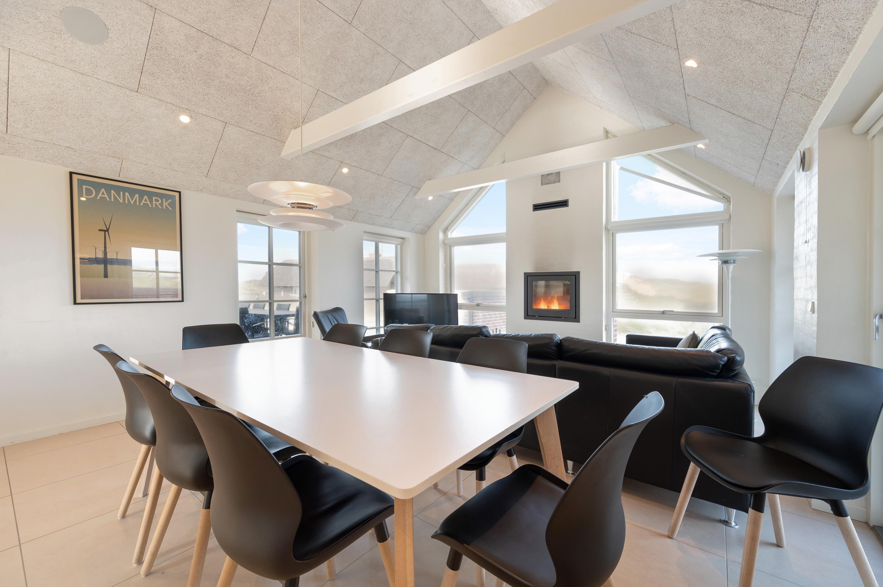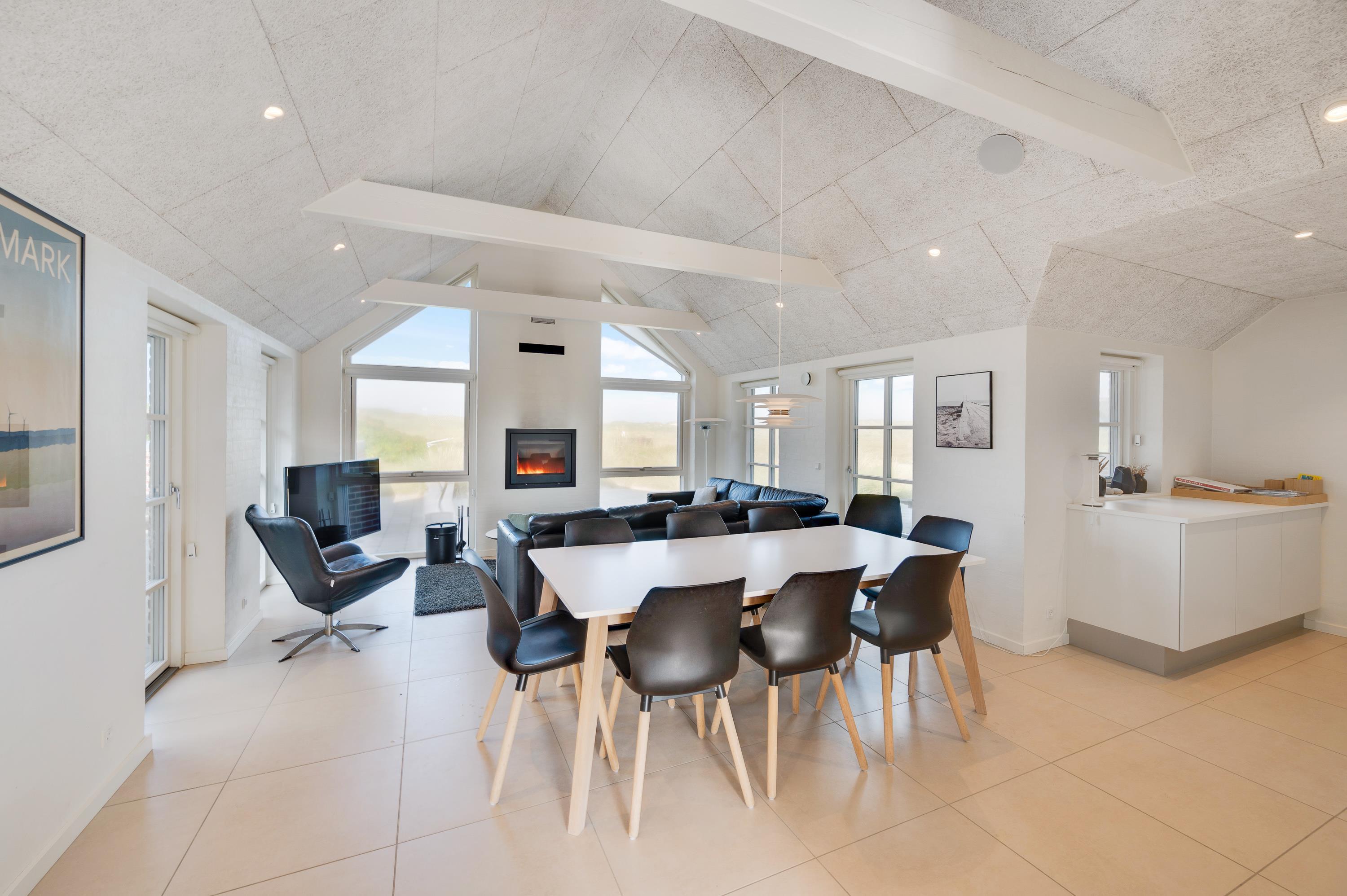 Husets hjerte er uden tvivl det store, lyse alrum med det enestående udsyn mod første klitrække. I stueafdelingen kan I nyde den flotte indbyggede brændeovn, der er et centerpiece i stuen. Den knitrende ild bidrager virkelig til den hyggelige feriestemning. Alrummet er indrettet med smagfulde møbler i sort-hvide nuancer, der giver et eksklusivt og smagfuldt udtryk. I selve stueafdelingen finder I både fladskærms-tv, DVD, radio og CD-afspiller.