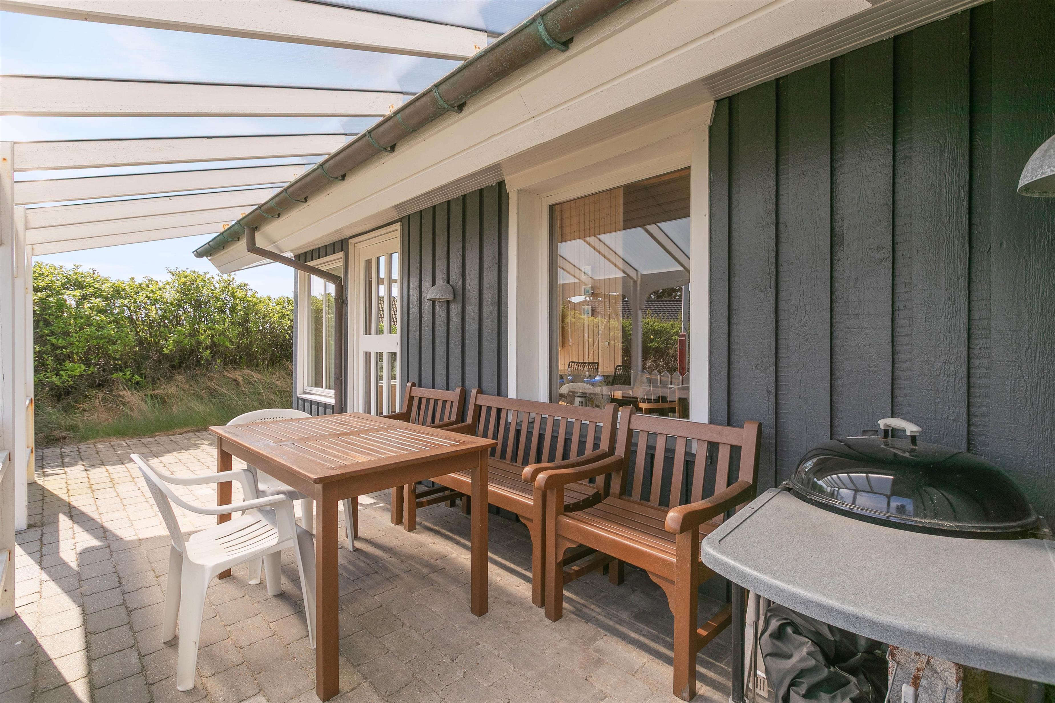 Udearealet består af en overdækket terrasse med havemøbler, hvor I kan nyde det gode vejr med lidt koldt at drikke. På græsplænen kan børnene lege og spille bold, mens I forbereder aftenens middag på grillen.