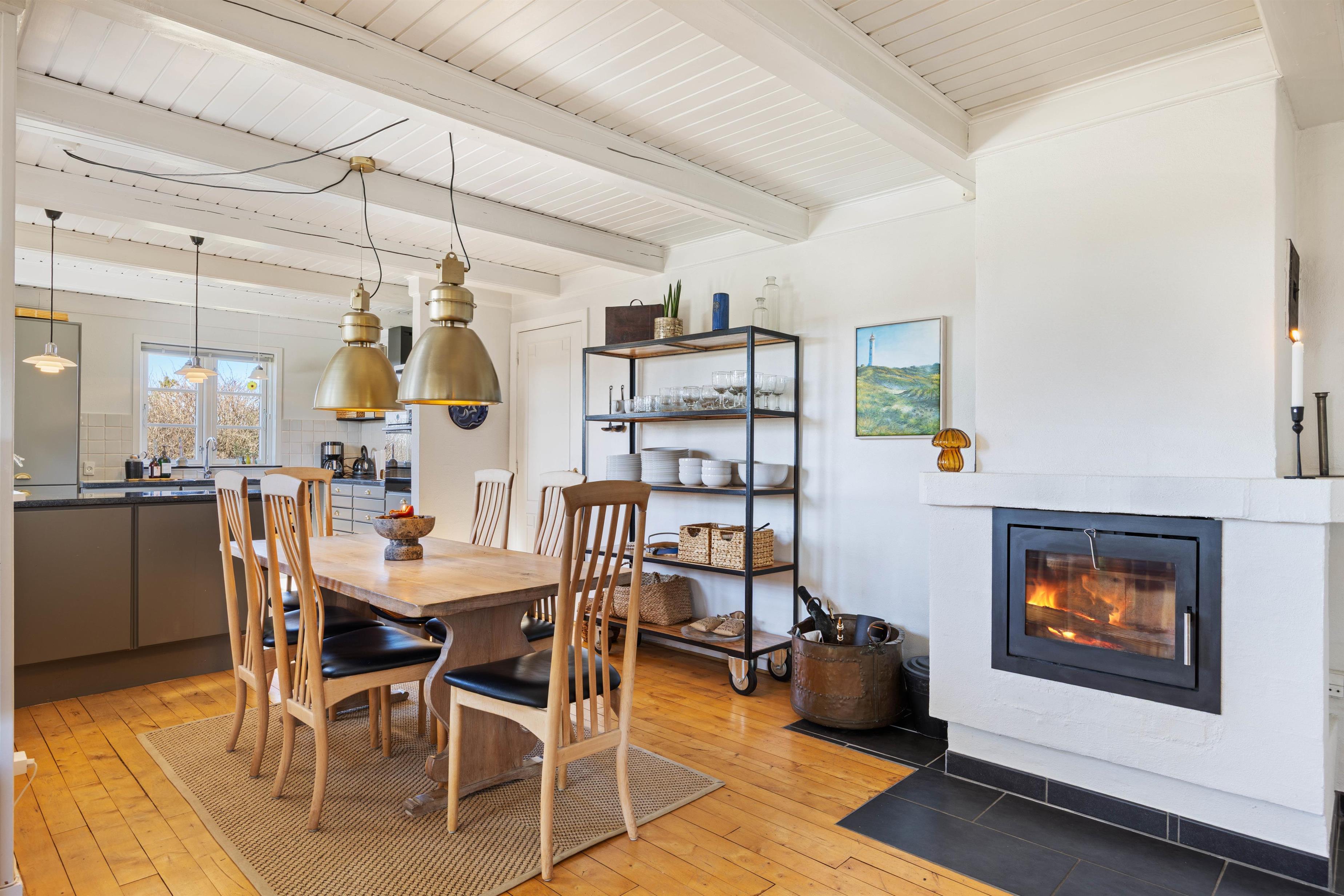 Med 129m2 har I god plads i dette bindingsværkshus. Huset er smukt indrettet med en fin blanding af romantisk nostalgi og moderne med hvidmalede lofter og vægge og lyse møbler. En smuk indbygget kamin afrunder billedet og skaber en dejlig varm stemning. Foruden den herlige udestue med stengulv og udsigt til klitterne.