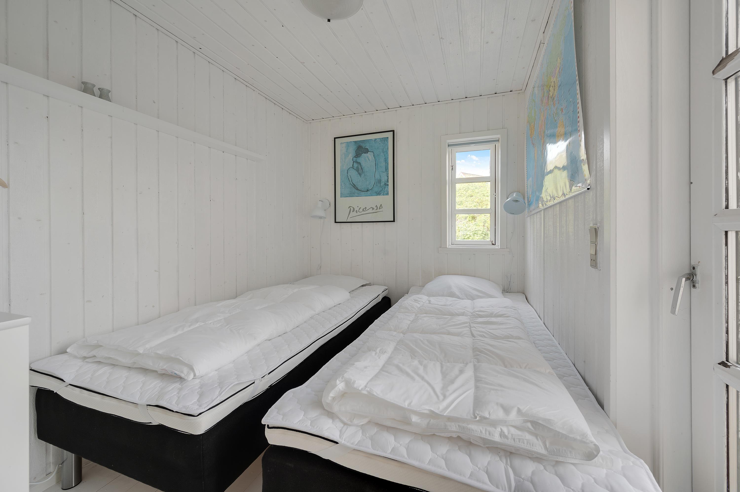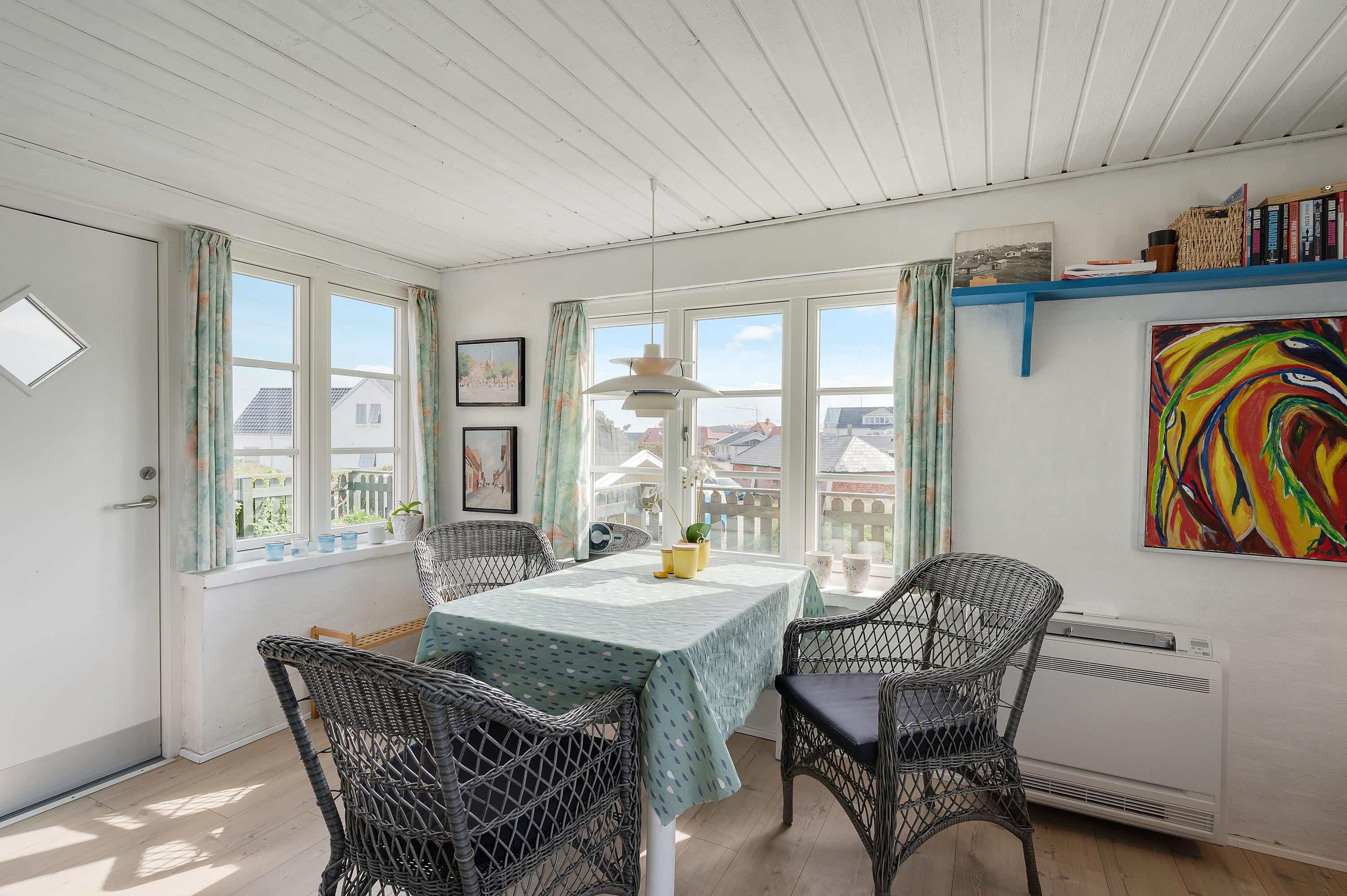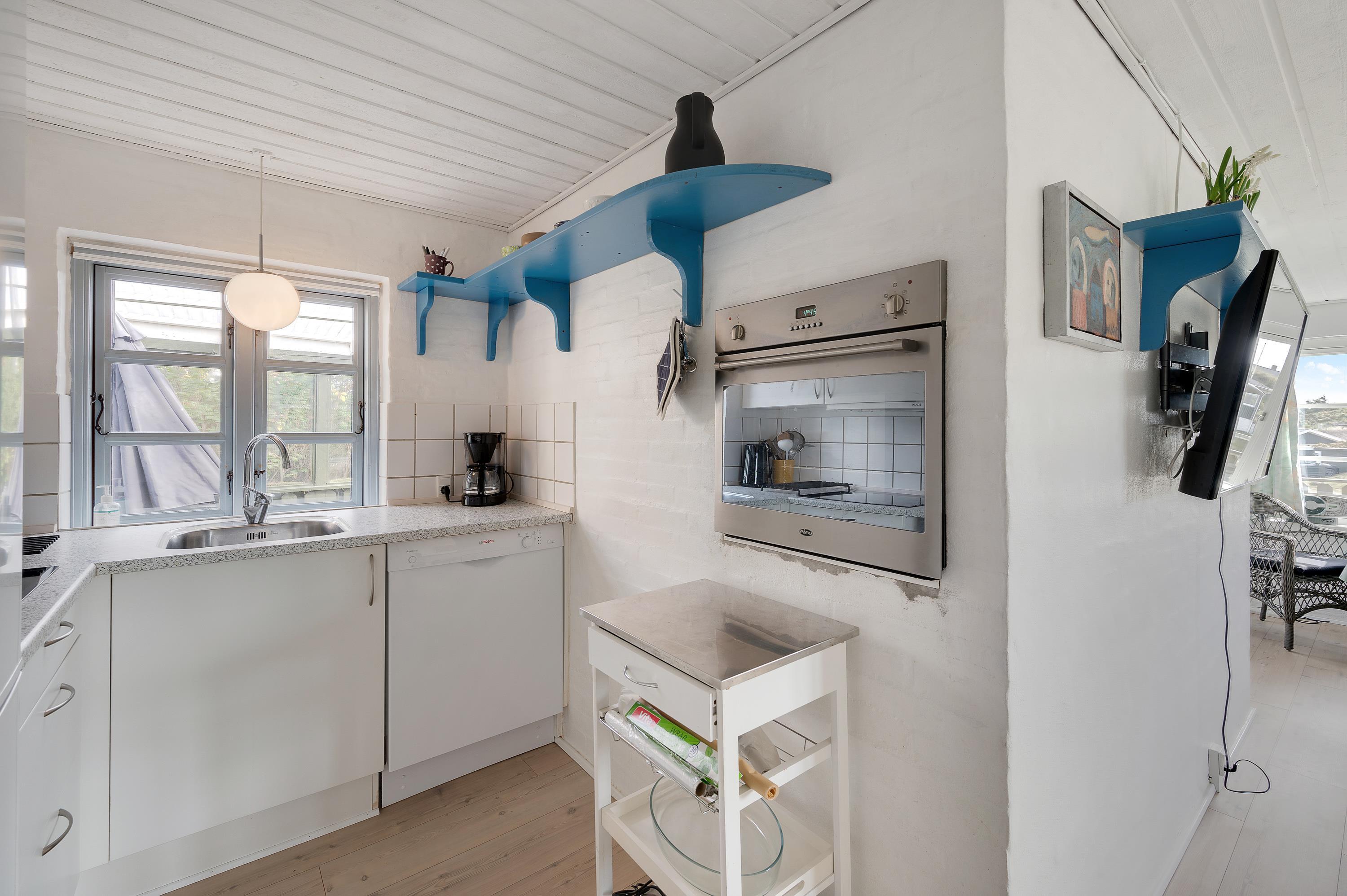 Sommerhuset rummer plads til tre personer og har to soverum (heraf et med en køjeseng), hvilket gør det helt ideelt til parret der ønsker en ferie her på vestkysten. Her er også et lille, men funktionelt køkken med opvaskemaskine. Desuden er der vaskemaskine og tørretumbler på badeværelset. Fra både stuen og soveværelset kan I træde ud på verandaen, som løber rundt om feriehuset.