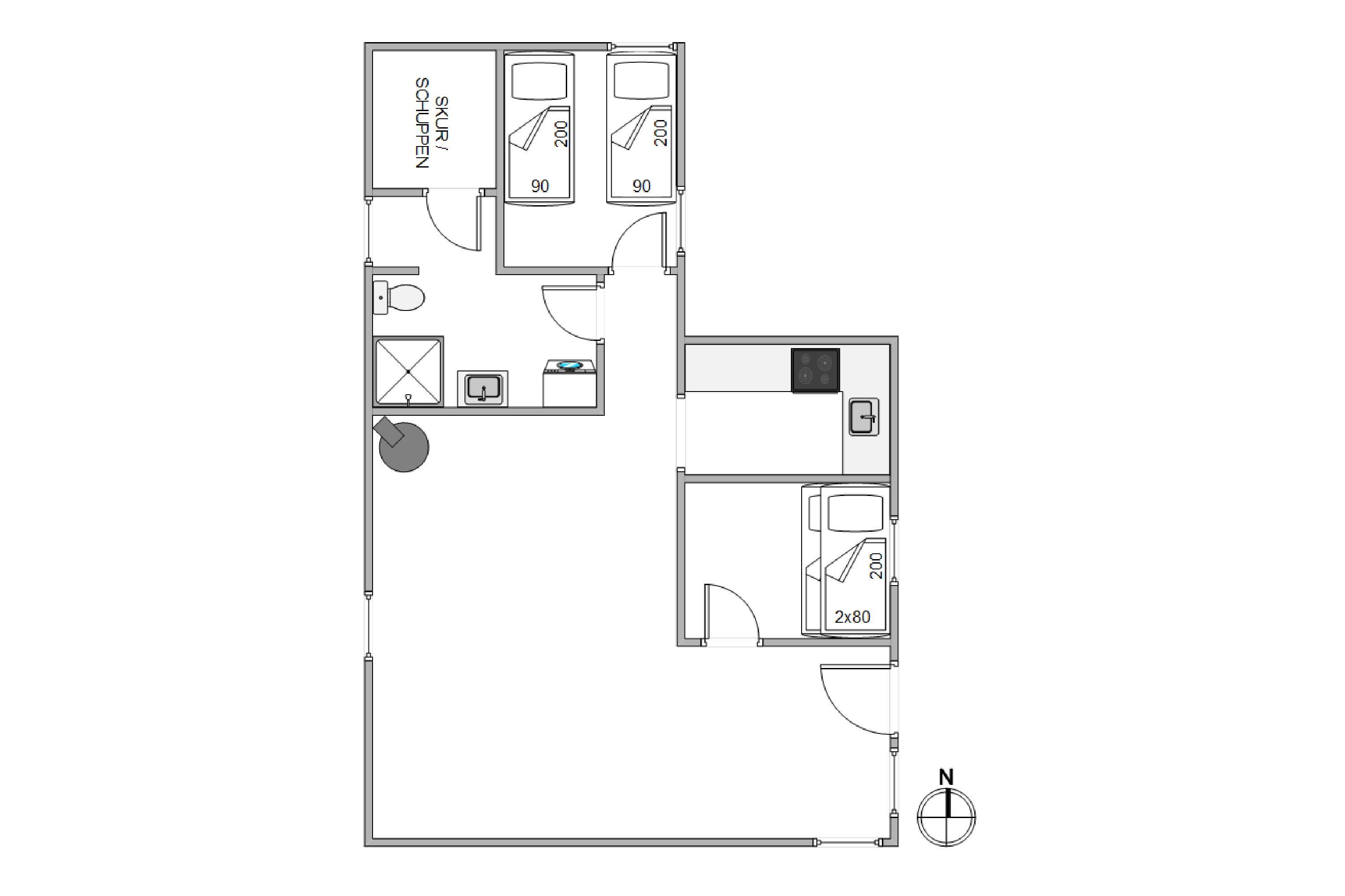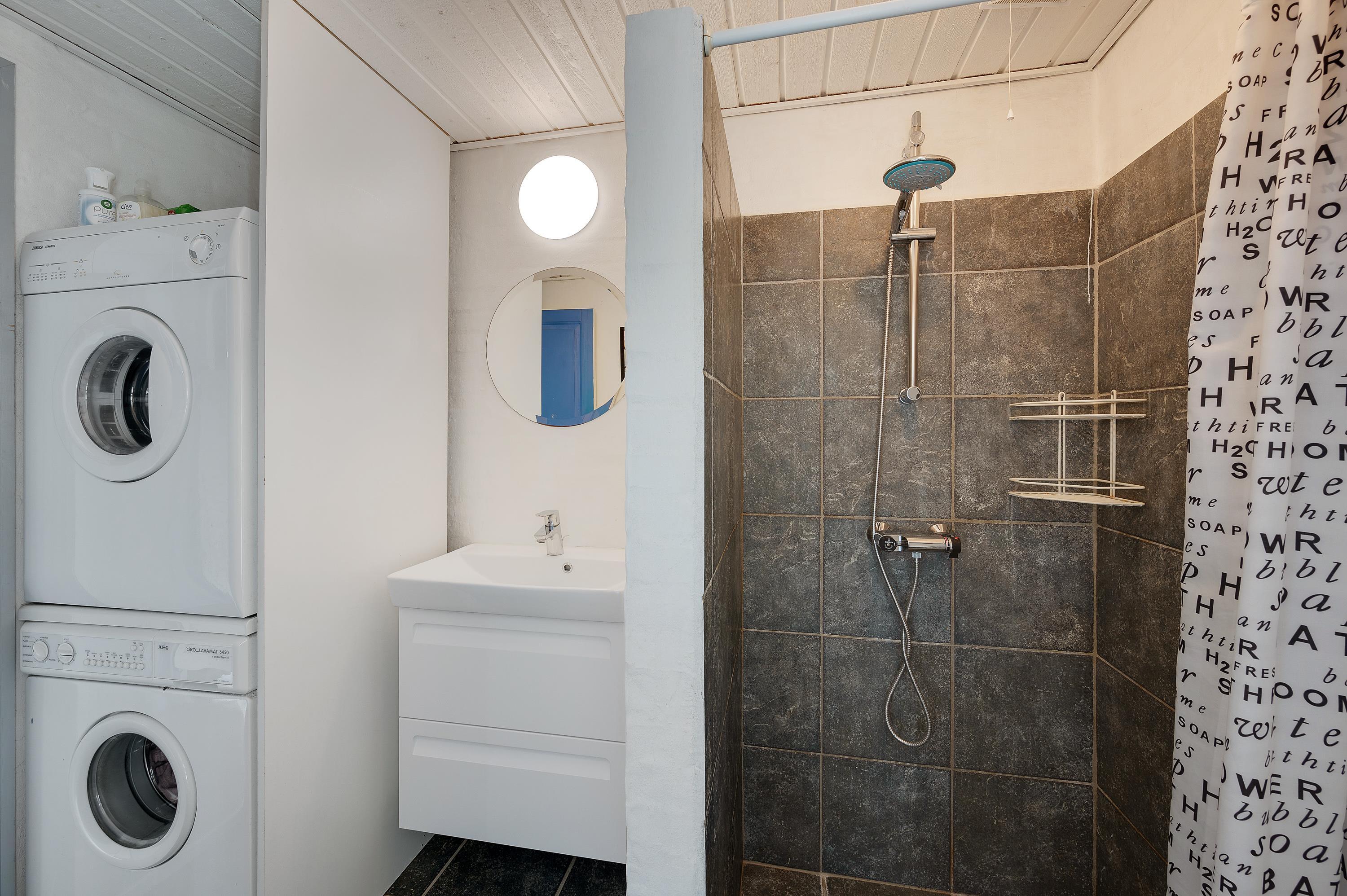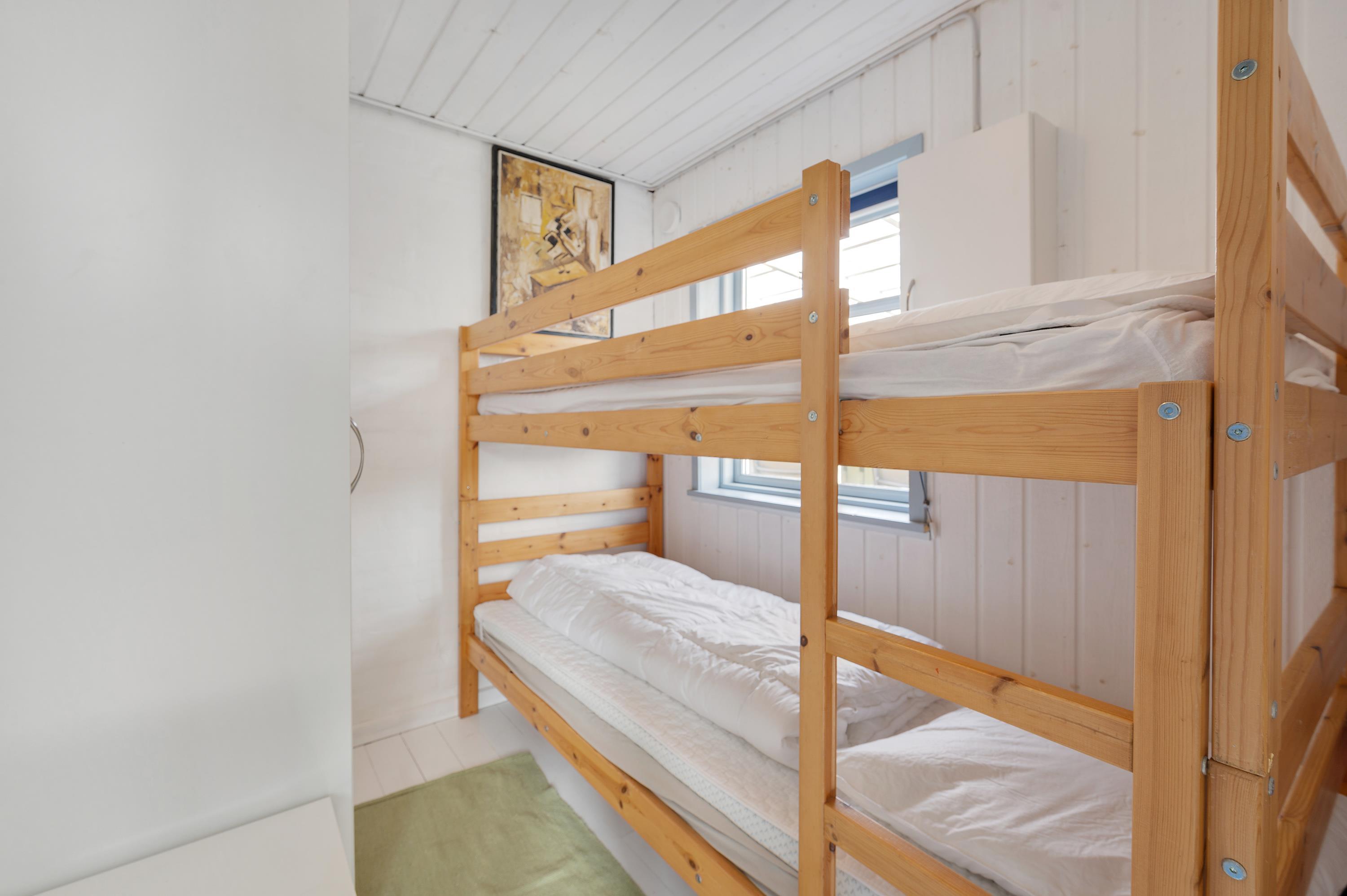 Sommerhuset rummer plads til tre personer og har to soverum (heraf et med en køjeseng), hvilket gør det helt ideelt til parret der ønsker en ferie her på vestkysten. Her er også et lille, men funktionelt køkken med opvaskemaskine. Desuden er der vaskemaskine og tørretumbler på badeværelset. Fra både stuen og soveværelset kan I træde ud på verandaen, som løber rundt om feriehuset.