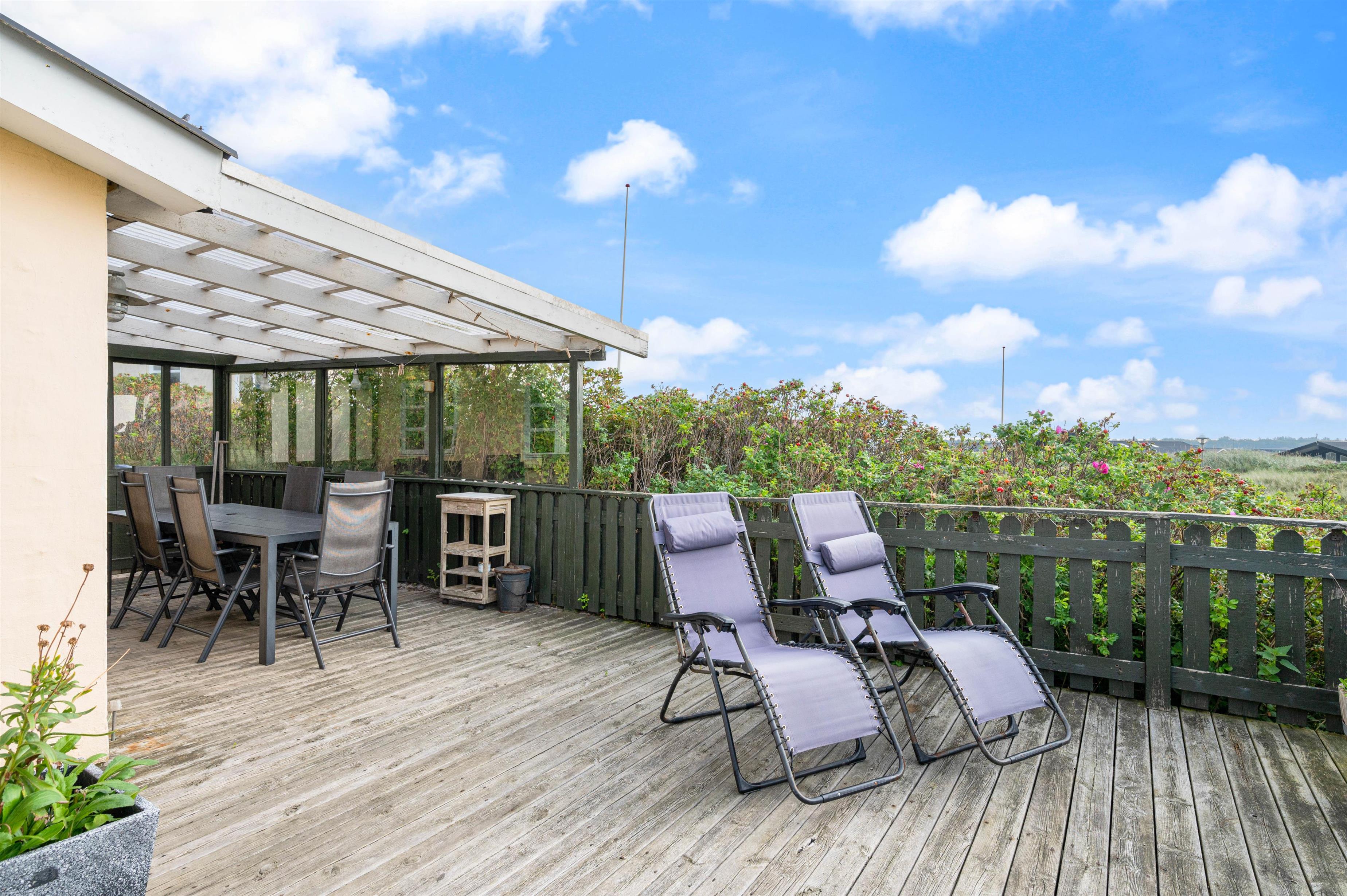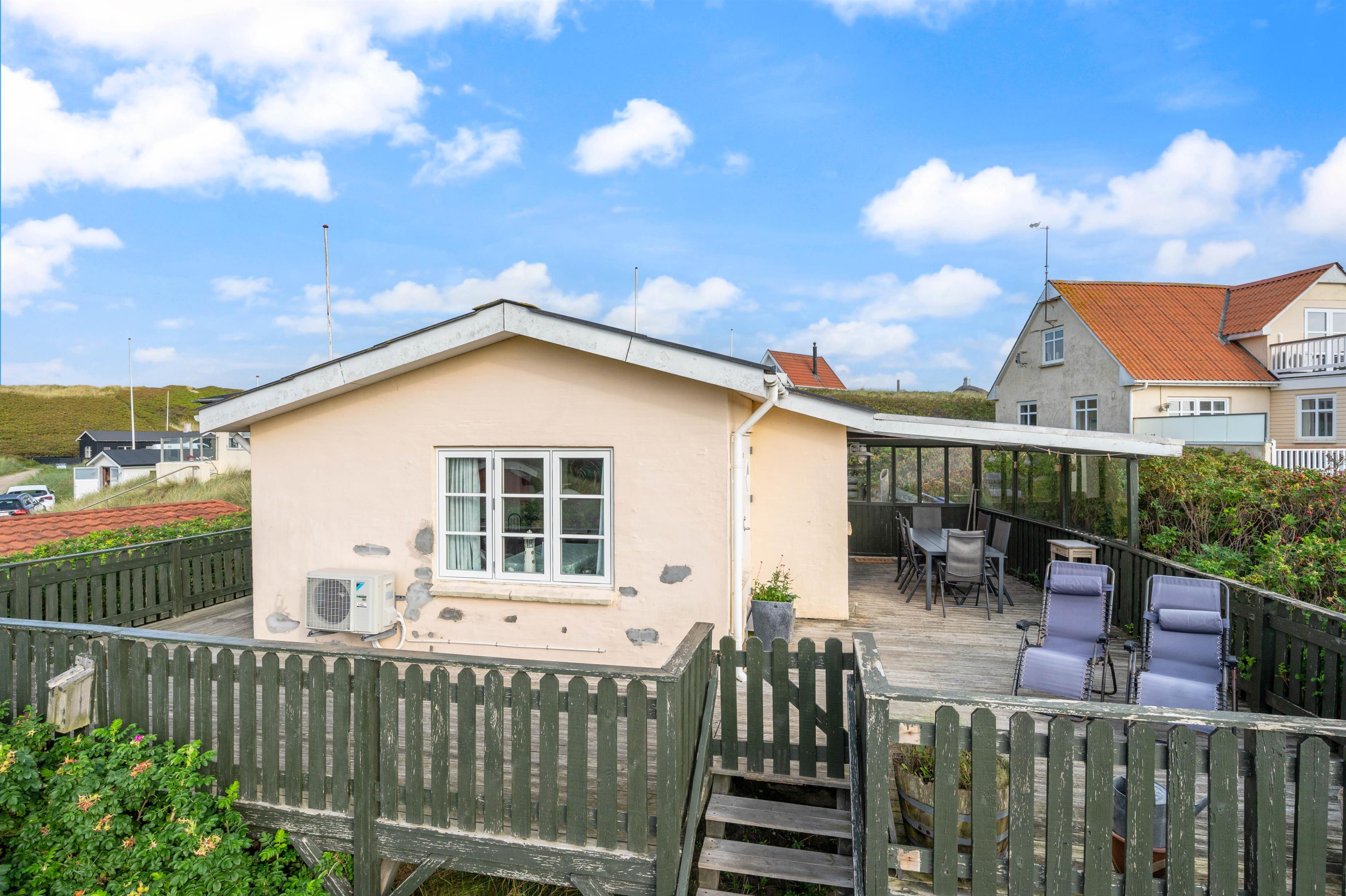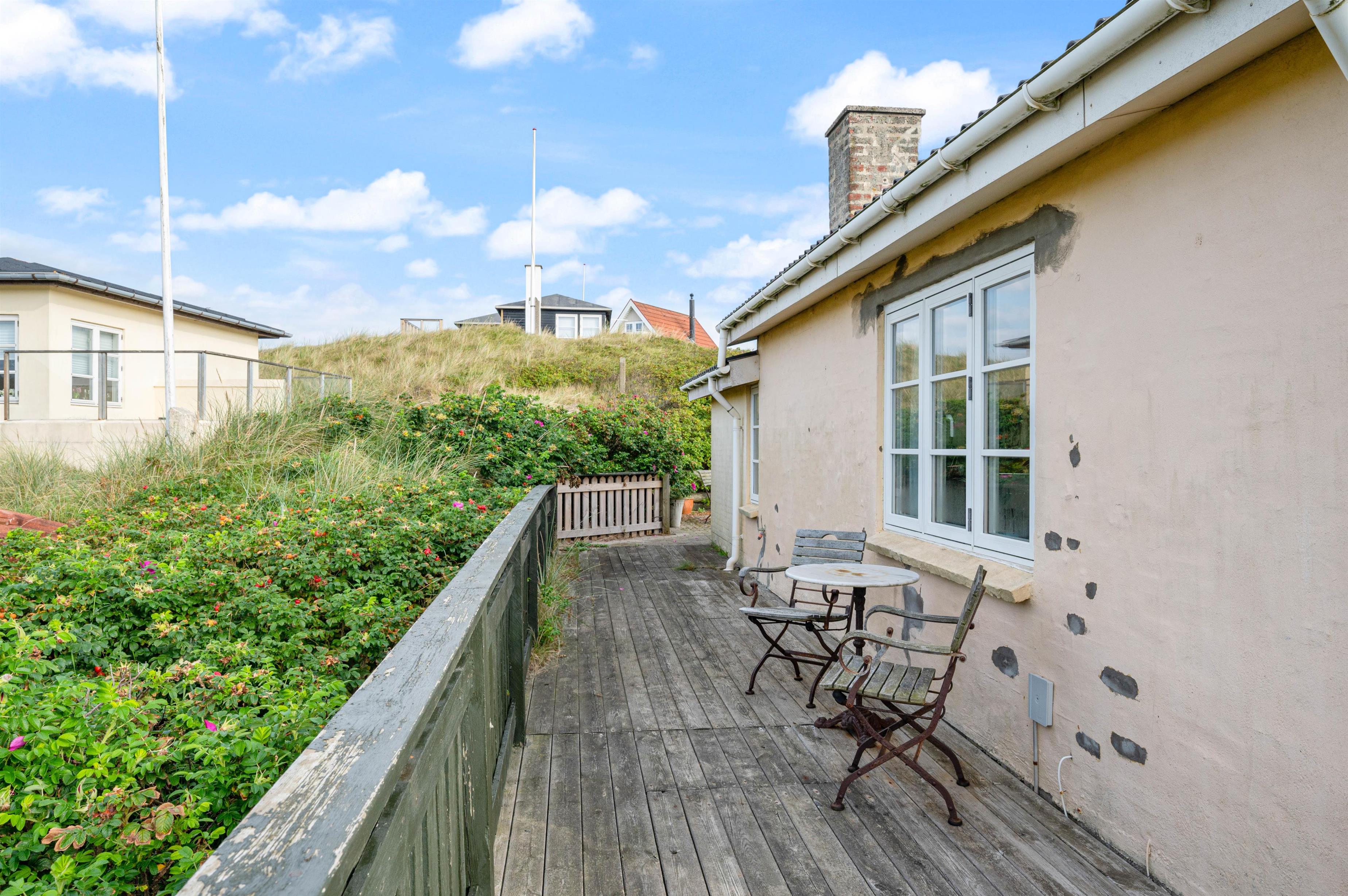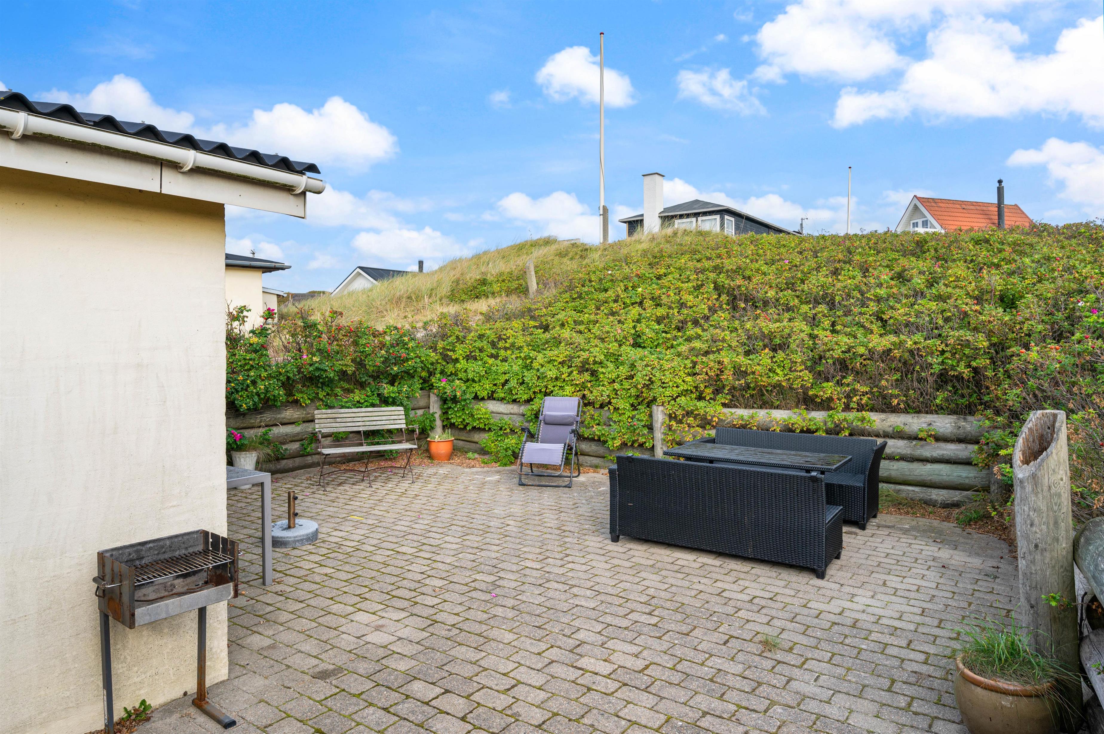 Sommerhuset på Lodbergsvej 351 er omgivet af en veranda, der løber rundt om feriehuset og slutter i en terrasse bag feriehuset. Her kan I sidde og nyde freden, roen og klitroselandskabet, mens I nyder en god kop kaffe eller indtager den typiske danske sommerdessert rødgrød med fløde. Det er også oplagt at grille her på en vindstille sommeraften. Selv hvis det danske sommervejr skulle skuffe og det regner, kan I stadig nyde noget udeliv, da huset også har en overdækket terrasse, hvor I kan sidde i læ for vind og regn.