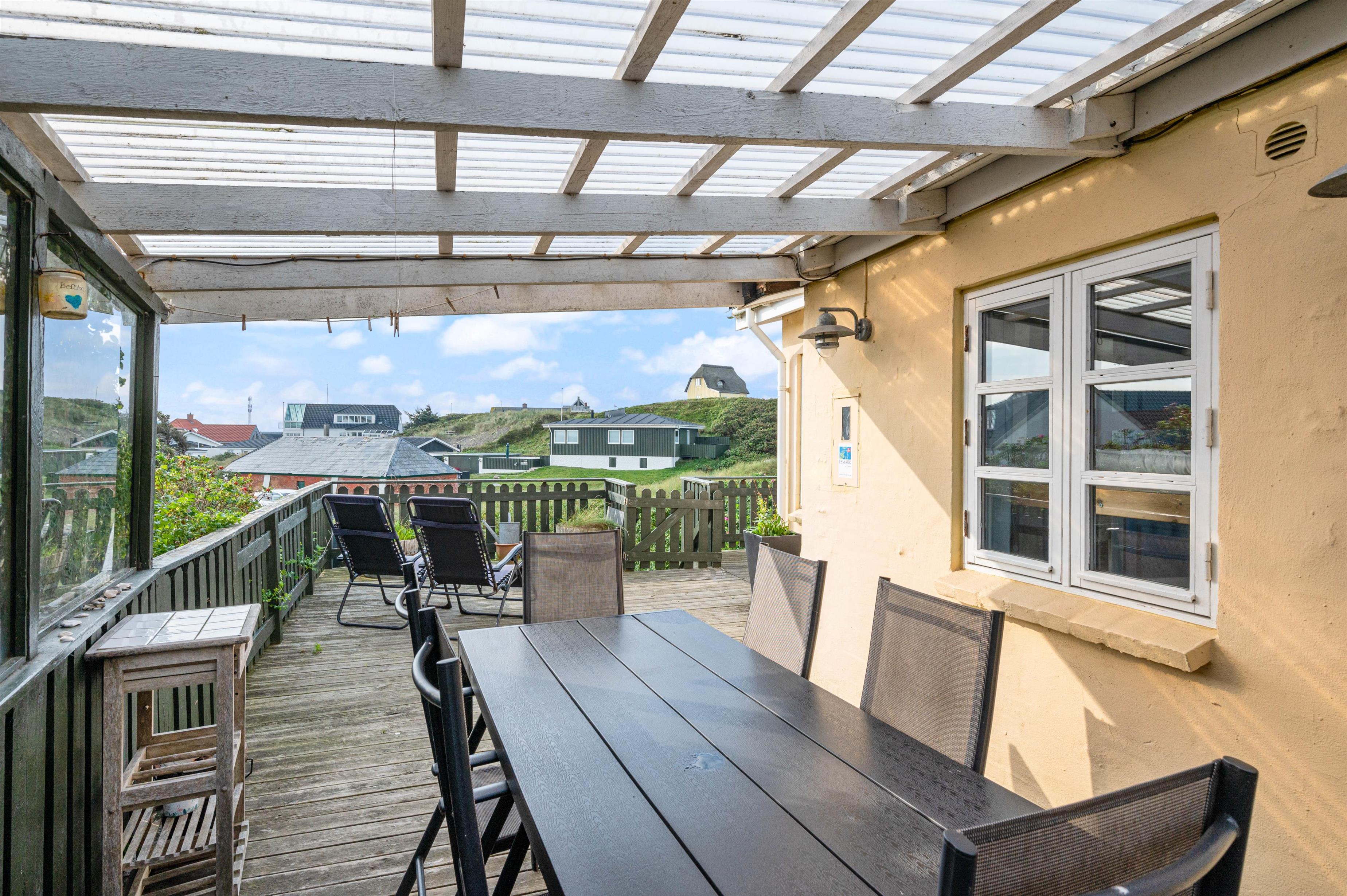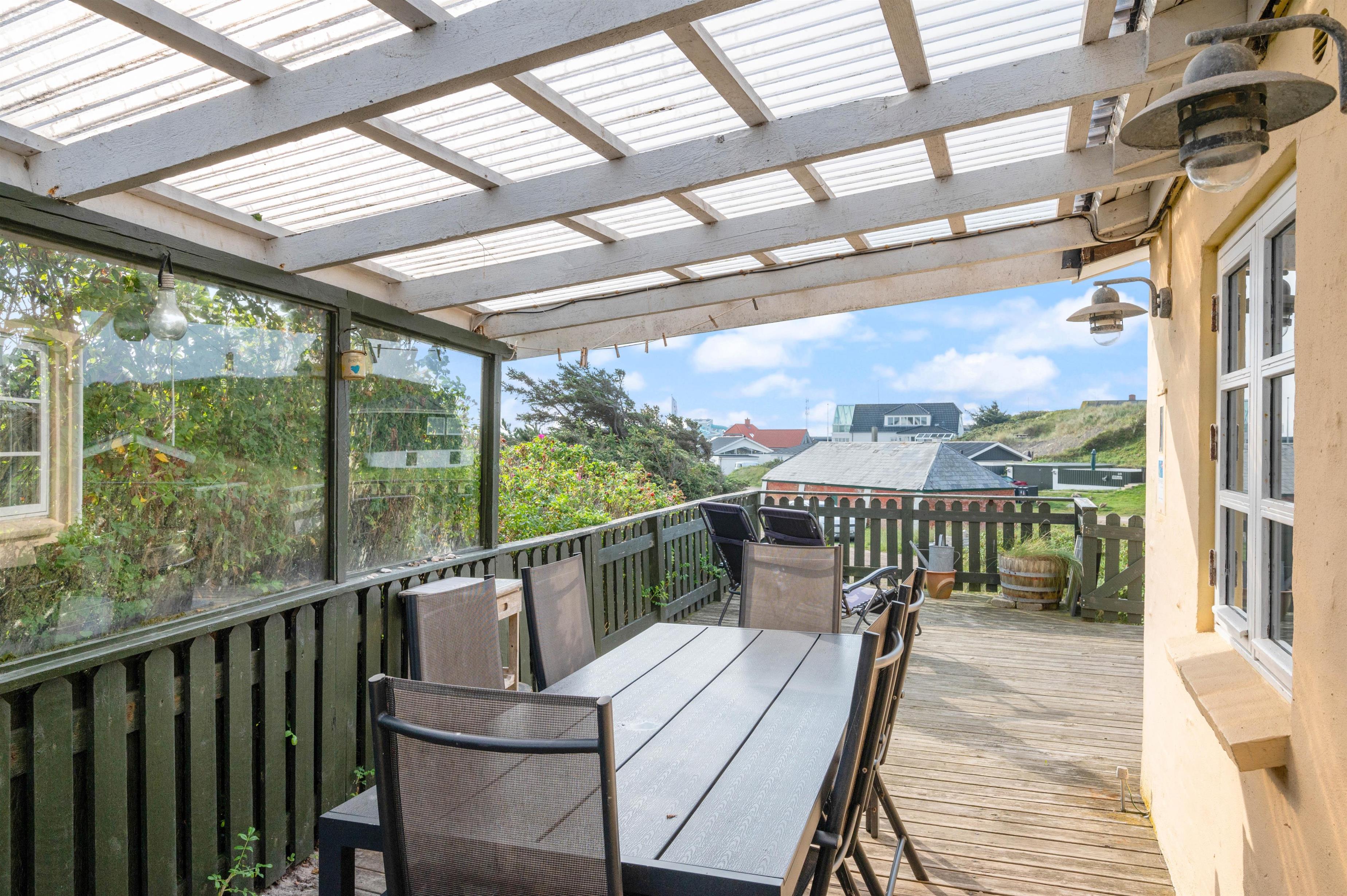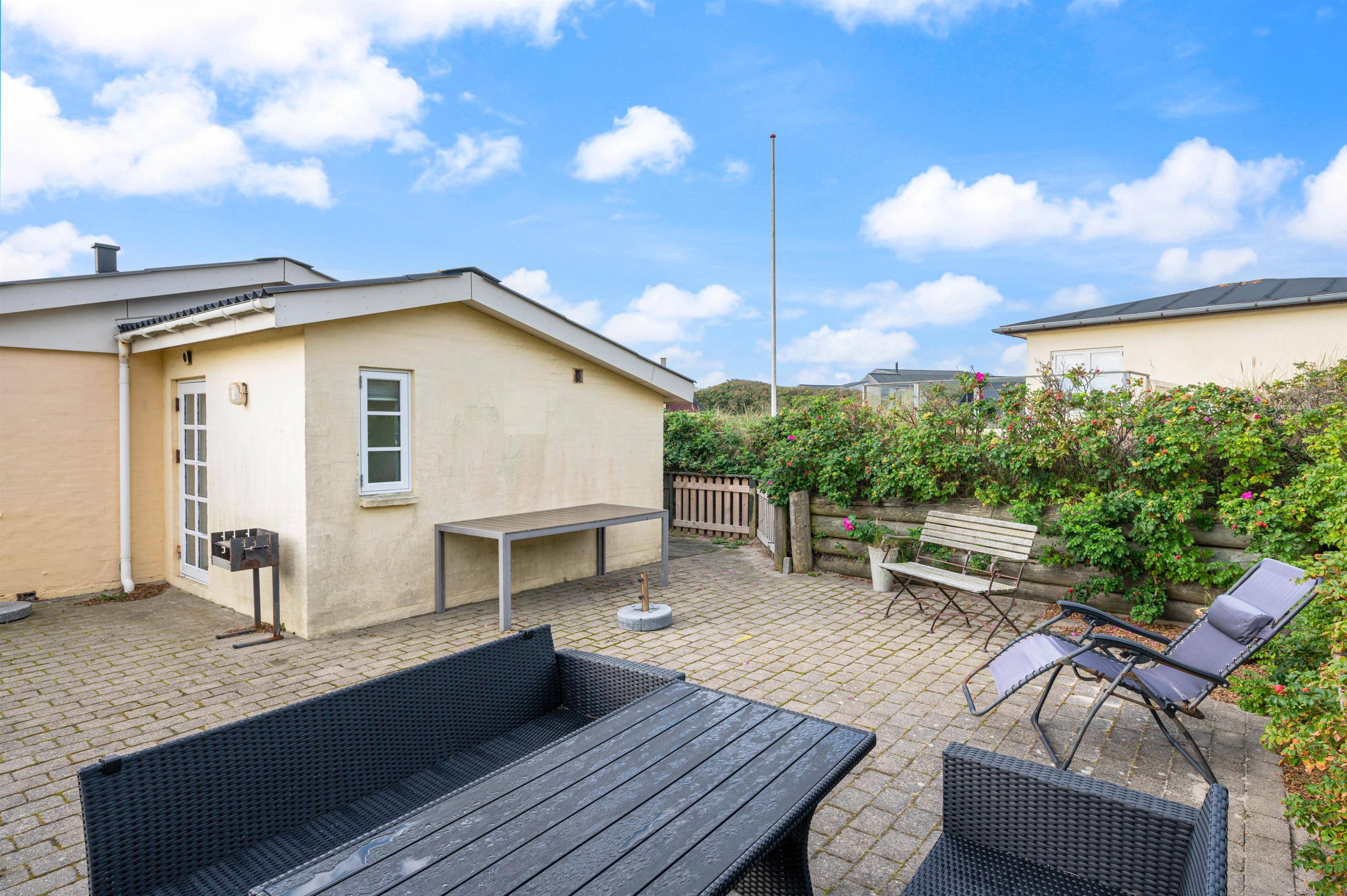 Sommerhuset på Lodbergsvej 351 er omgivet af en veranda, der løber rundt om feriehuset og slutter i en terrasse bag feriehuset. Her kan I sidde og nyde freden, roen og klitroselandskabet, mens I nyder en god kop kaffe eller indtager den typiske danske sommerdessert rødgrød med fløde. Det er også oplagt at grille her på en vindstille sommeraften. Selv hvis det danske sommervejr skulle skuffe og det regner, kan I stadig nyde noget udeliv, da huset også har en overdækket terrasse, hvor I kan sidde i læ for vind og regn.