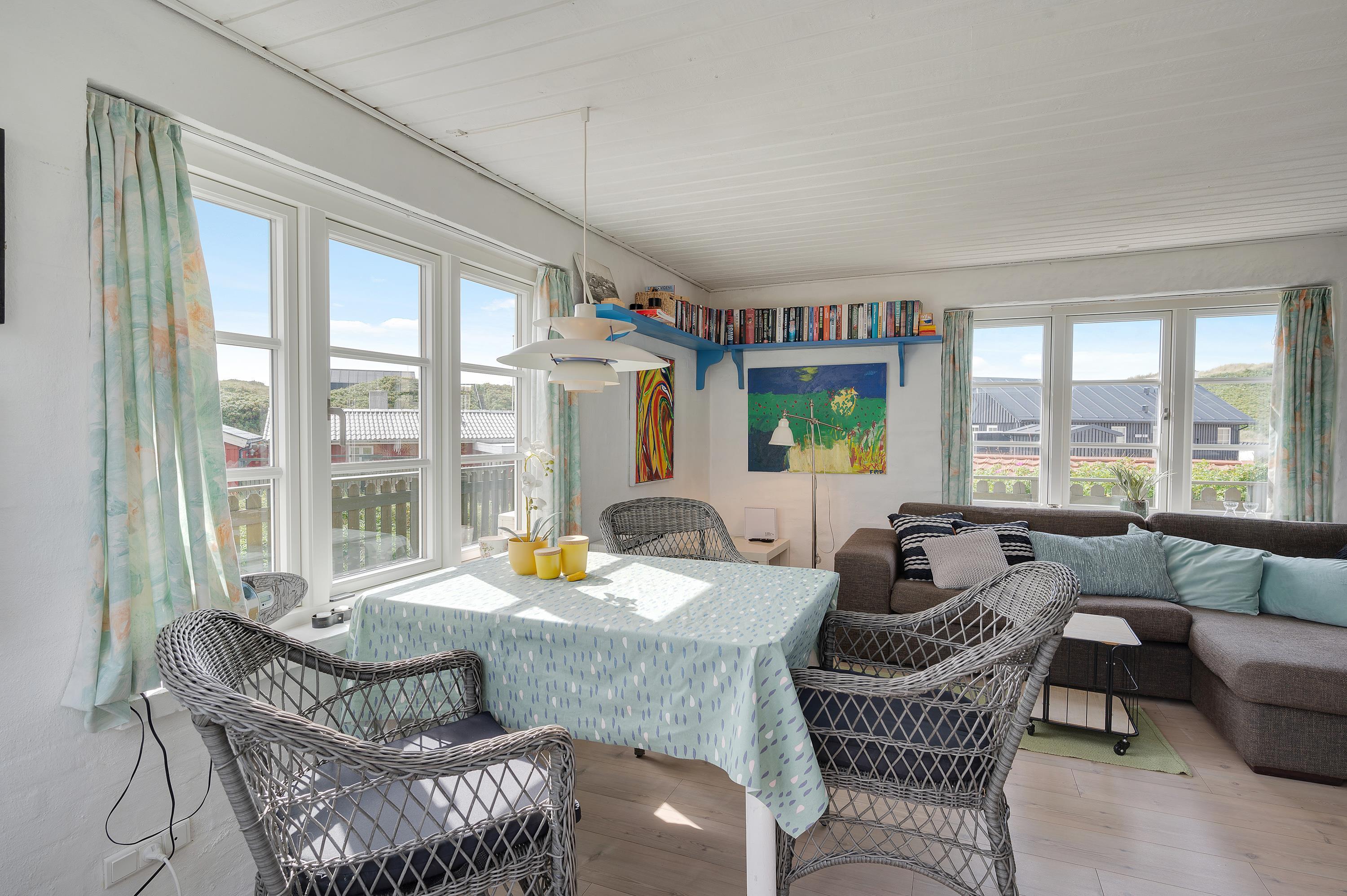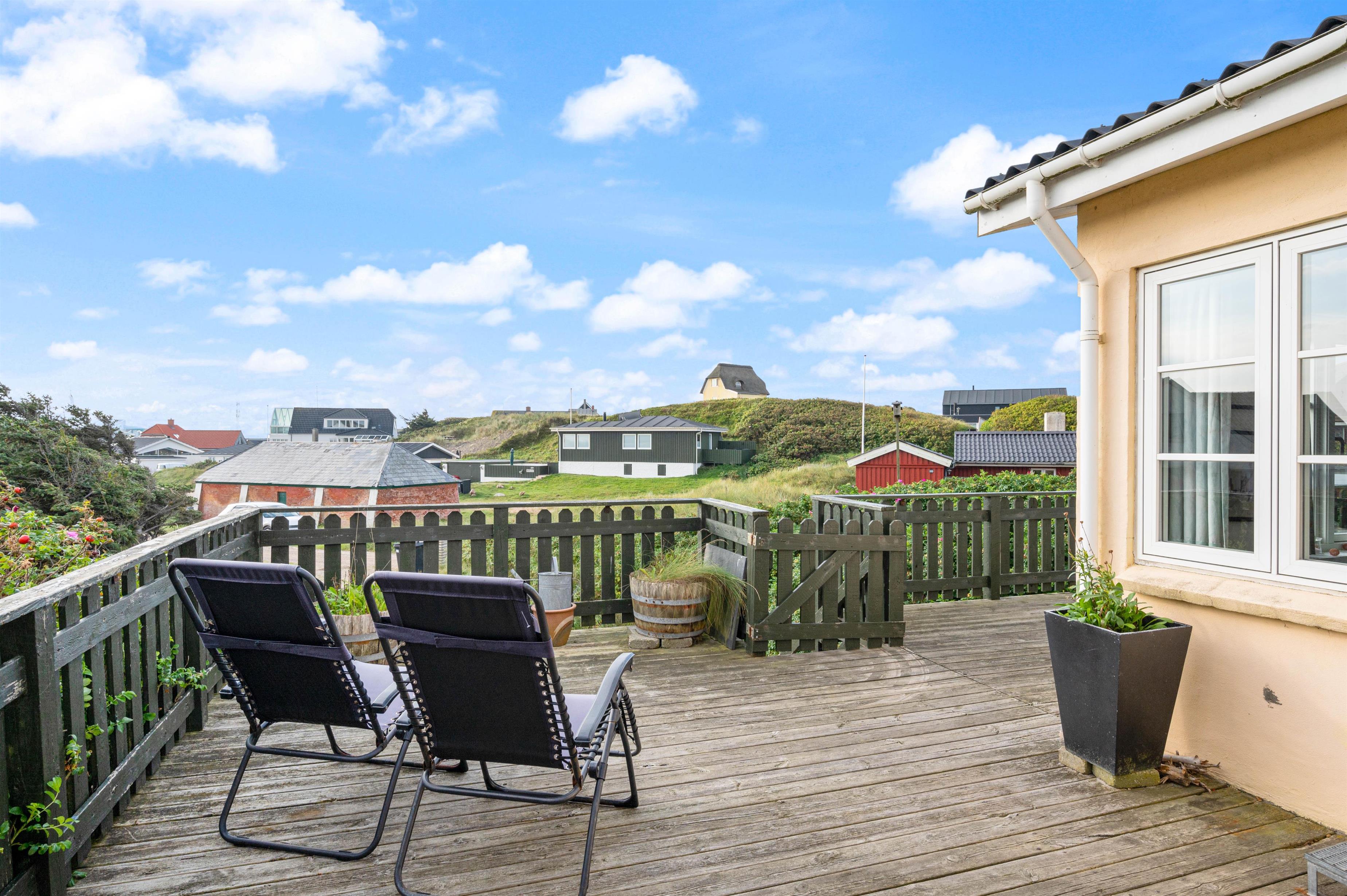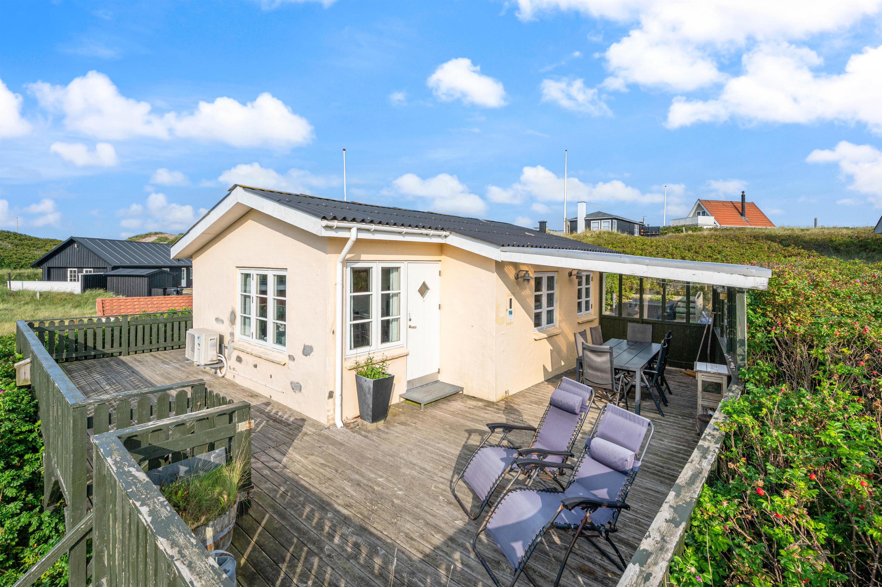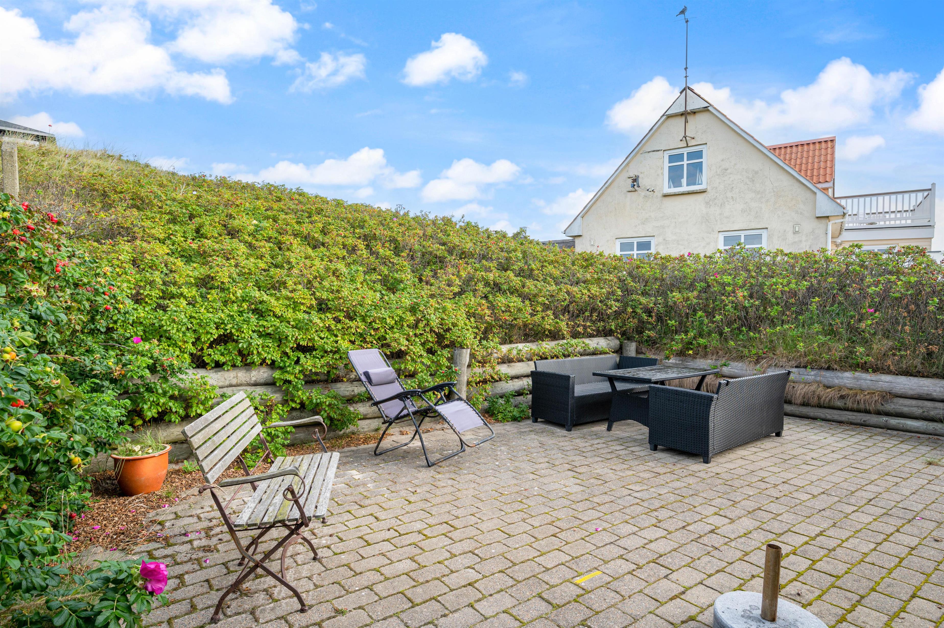 Sommerhuset på Lodbergsvej 351 er omgivet af en veranda, der løber rundt om feriehuset og slutter i en terrasse bag feriehuset. Her kan I sidde og nyde freden, roen og klitroselandskabet, mens I nyder en god kop kaffe eller indtager den typiske danske sommerdessert rødgrød med fløde. Det er også oplagt at grille her på en vindstille sommeraften. Selv hvis det danske sommervejr skulle skuffe og det regner, kan I stadig nyde noget udeliv, da huset også har en overdækket terrasse, hvor I kan sidde i læ for vind og regn.