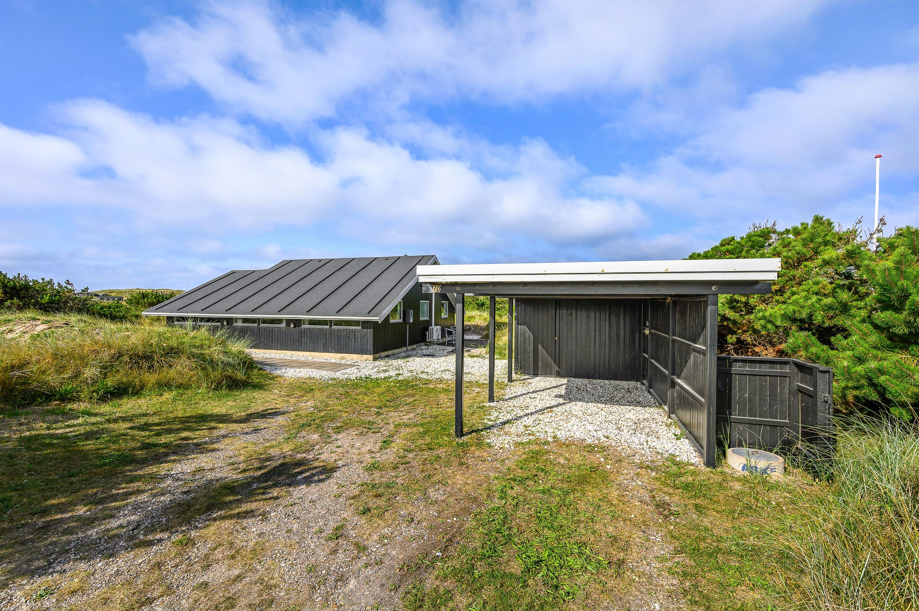 Gennem terrassedøren kommer man ud til den delvist overdækkede og afskærmede terrasse. Da sommerhuset er placeret på en 2800 kvadratmeter stor naturgrund, sidder I her ugenert og kan I nyde jeres aftensmad med udsigt over klitterne. På Holmsborgvej 70 er der altså hele året rundt tid til afslapning og hygge, om det er inden- eller udendørs. Den store grund byder også op til leg for børn, da de her kan udforske grunden, og måske lege noget gemmeleg?