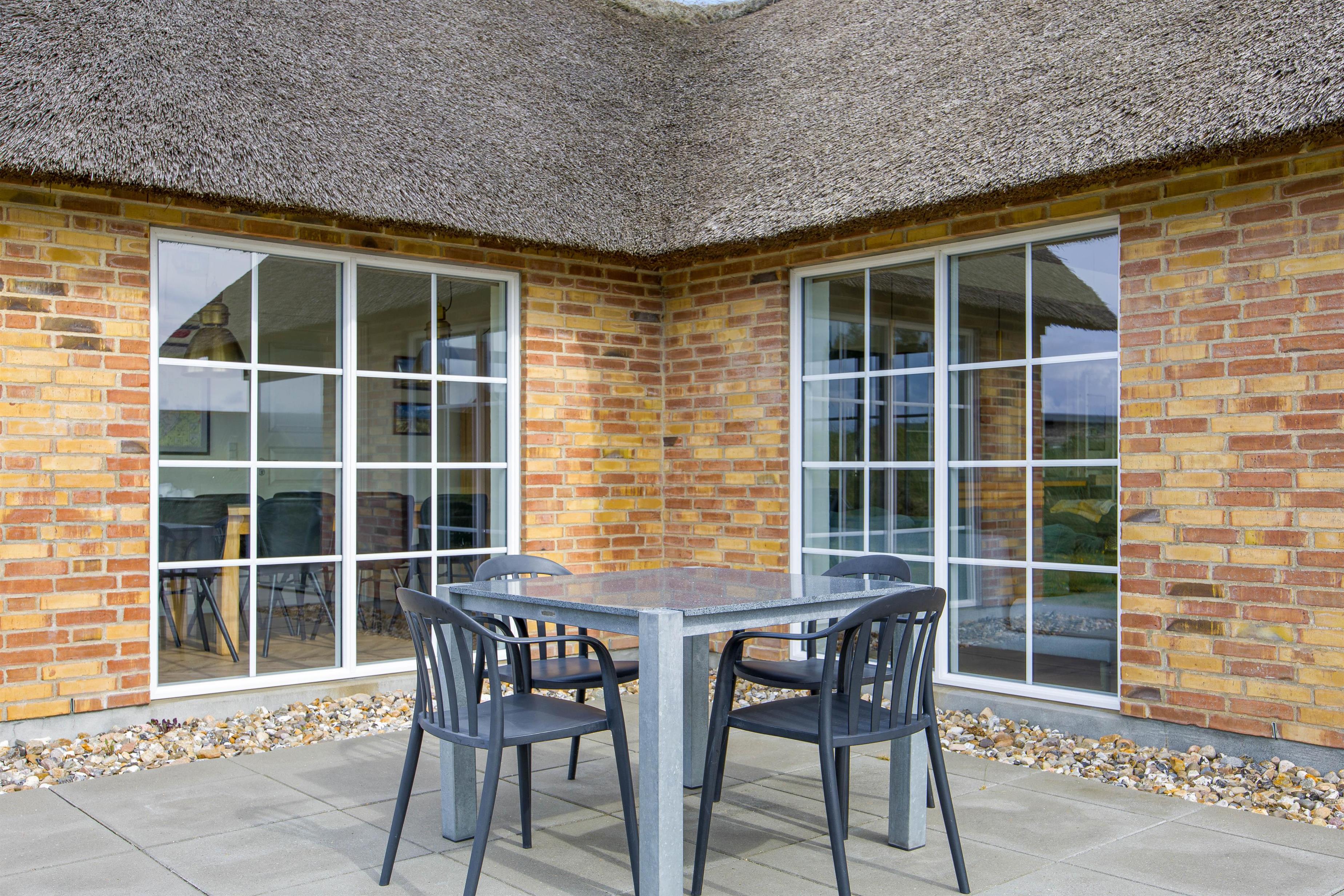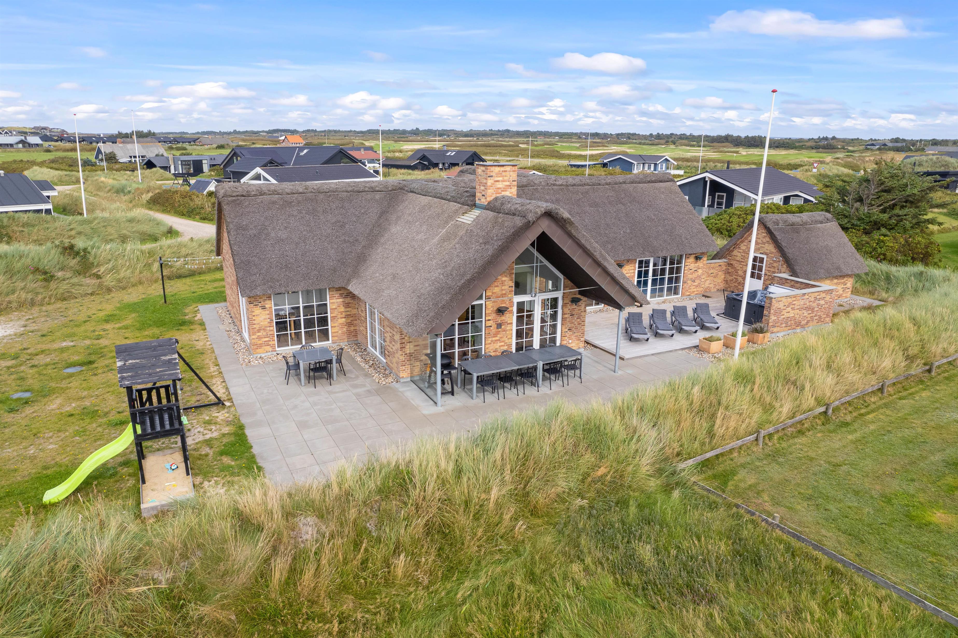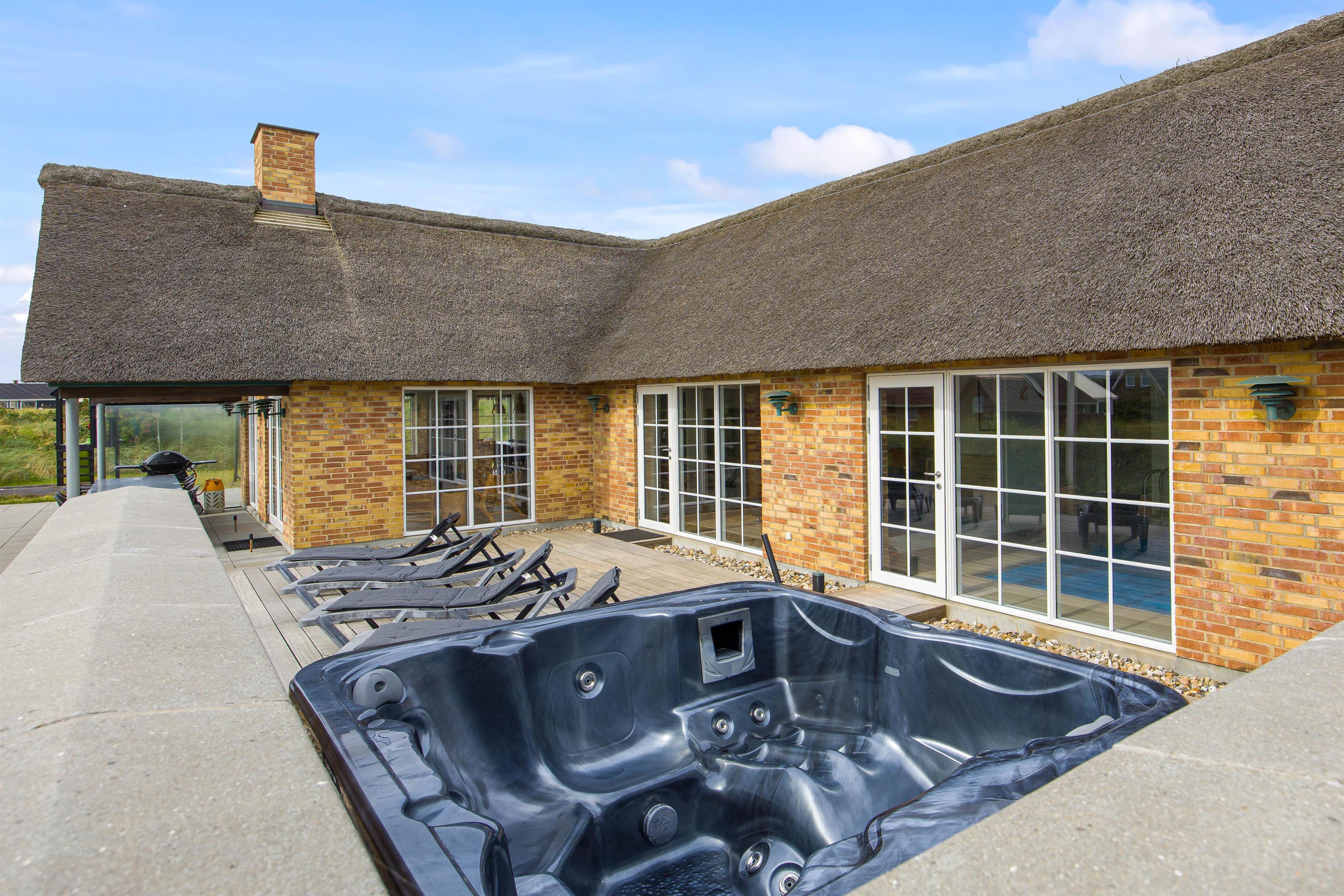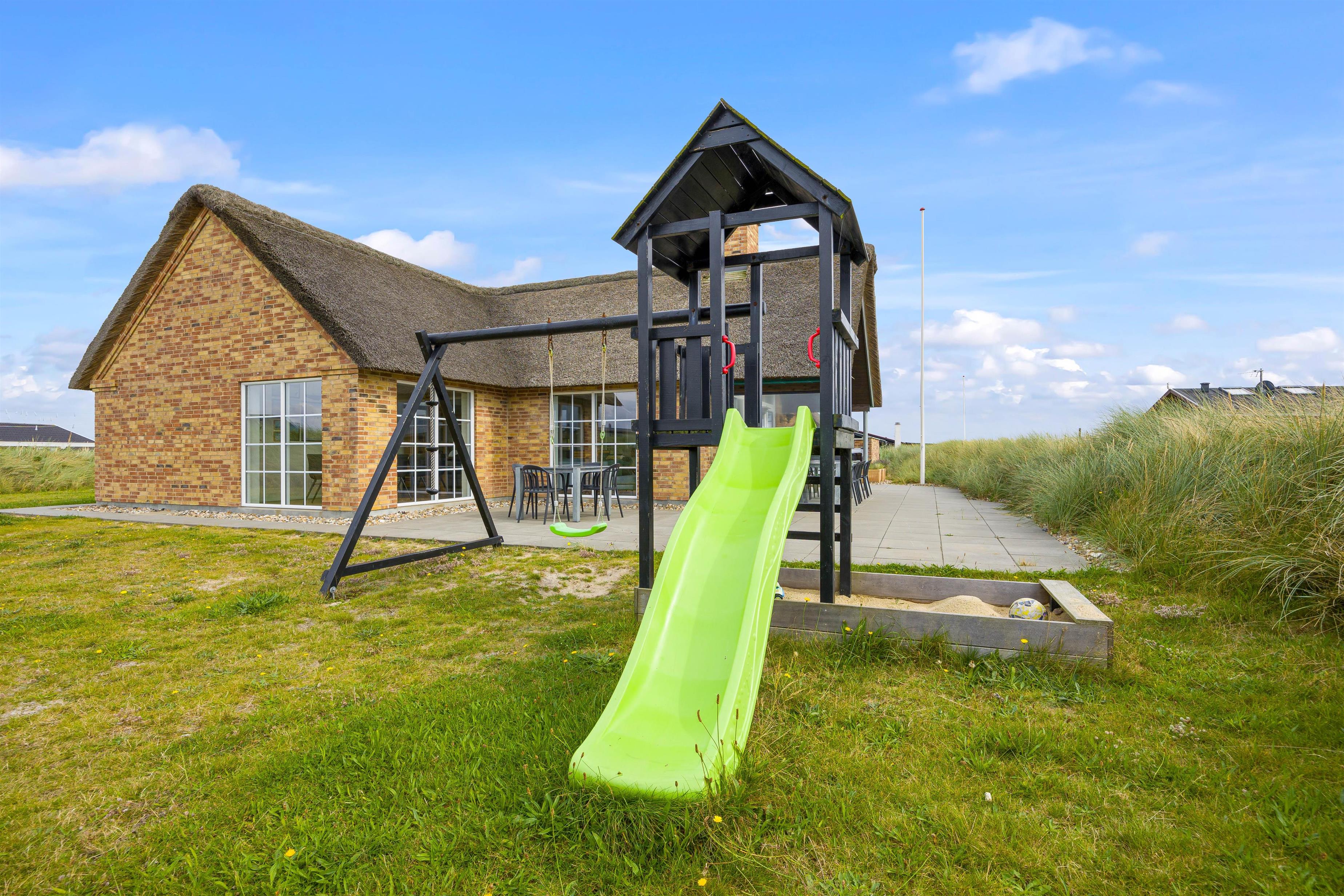 Udenfor feriehuset er terrasserne indrettet således, at man altid kan finde et afskærmet hjørne, hvor man kan hygge sig med en god bog i de medfølgende havemøbler, når vejret er godt. Der er også en udendørsspa på terrassen, som giver en særlig oplevelse under stjernehimlen. Til børnene er der et legetårn, hvor de kan klatre, gynge og rutsje, og kun fantasien sætter grænser for hvad de kan lave. Efter en lang dag på stranden kan I tænde op for gasgrillen og nyde de lækkerier, I har købt i Søndervigs supermarked, som ligger ca. 1,4 km væk.