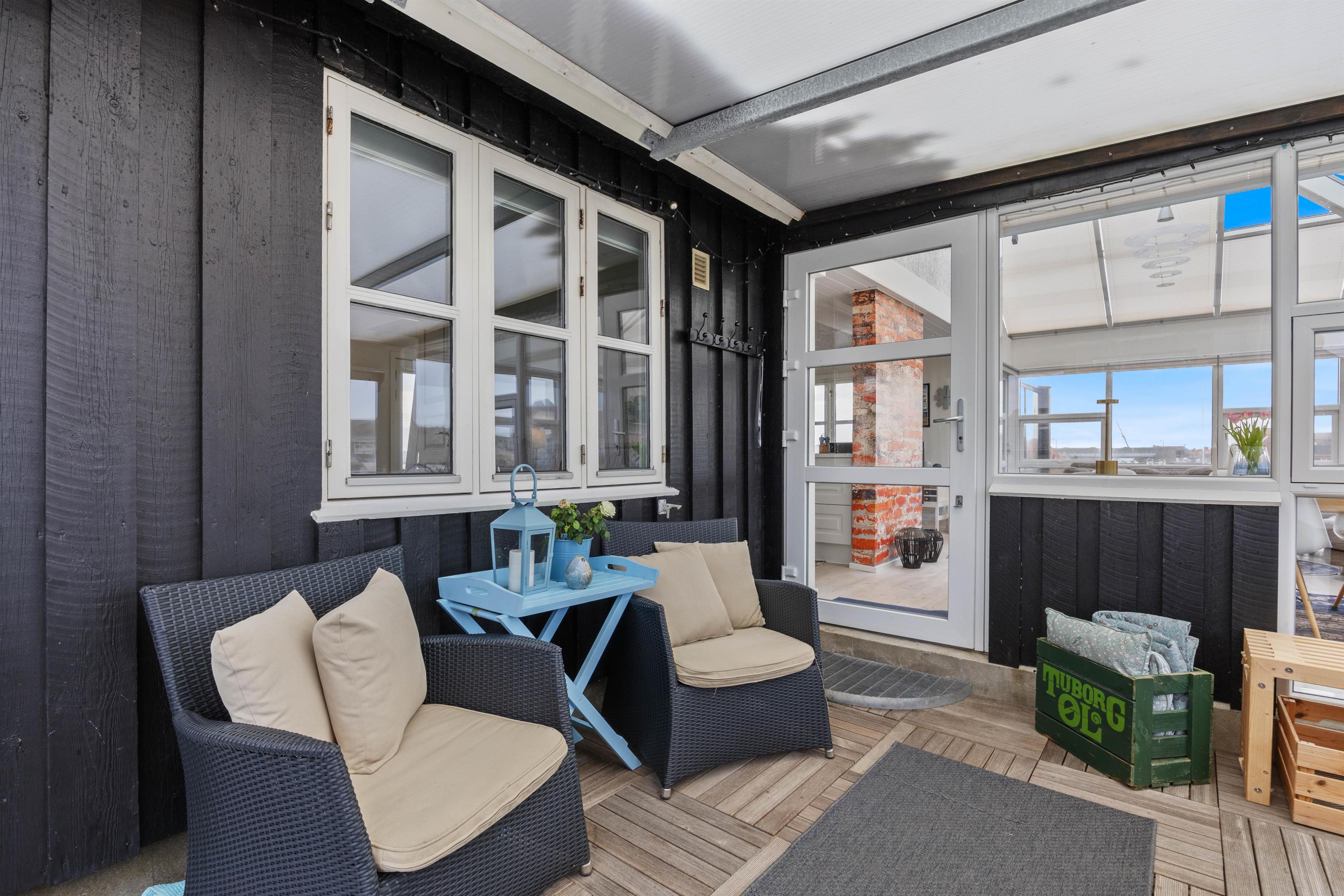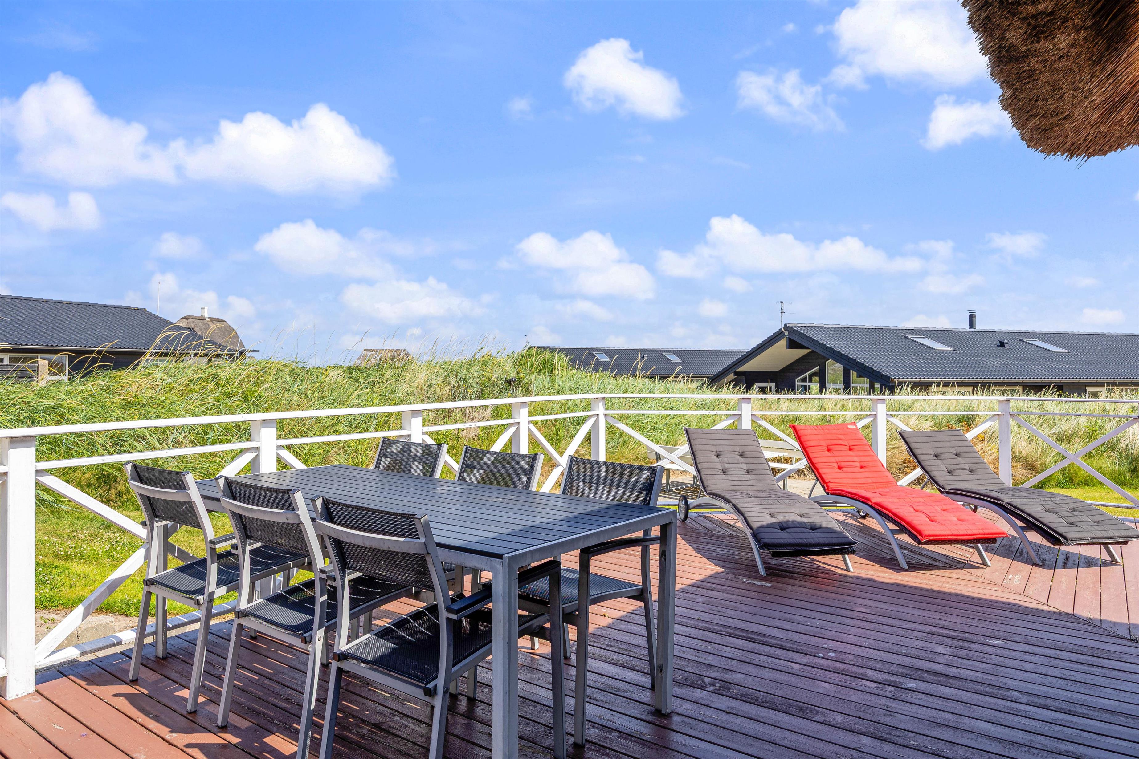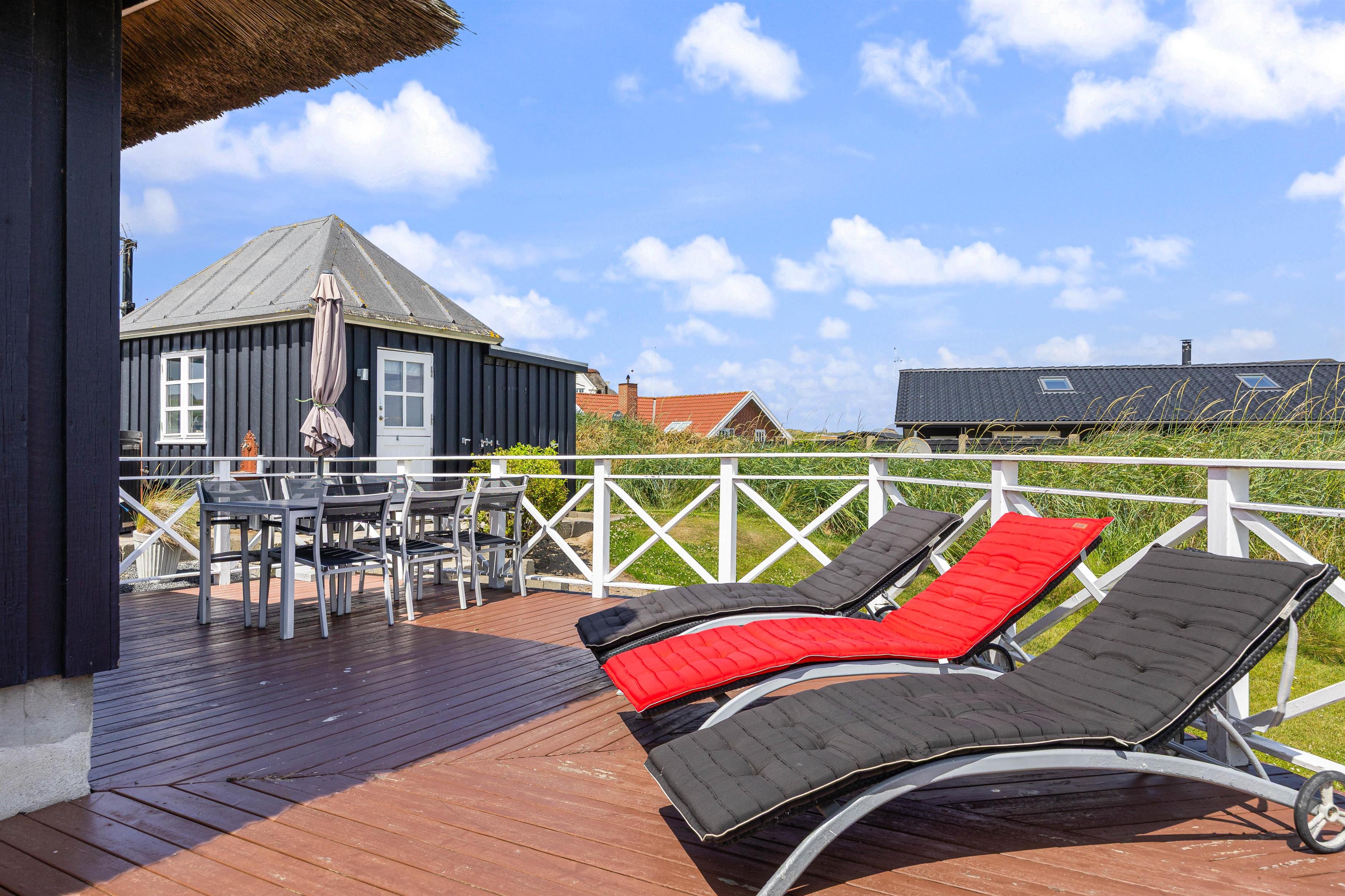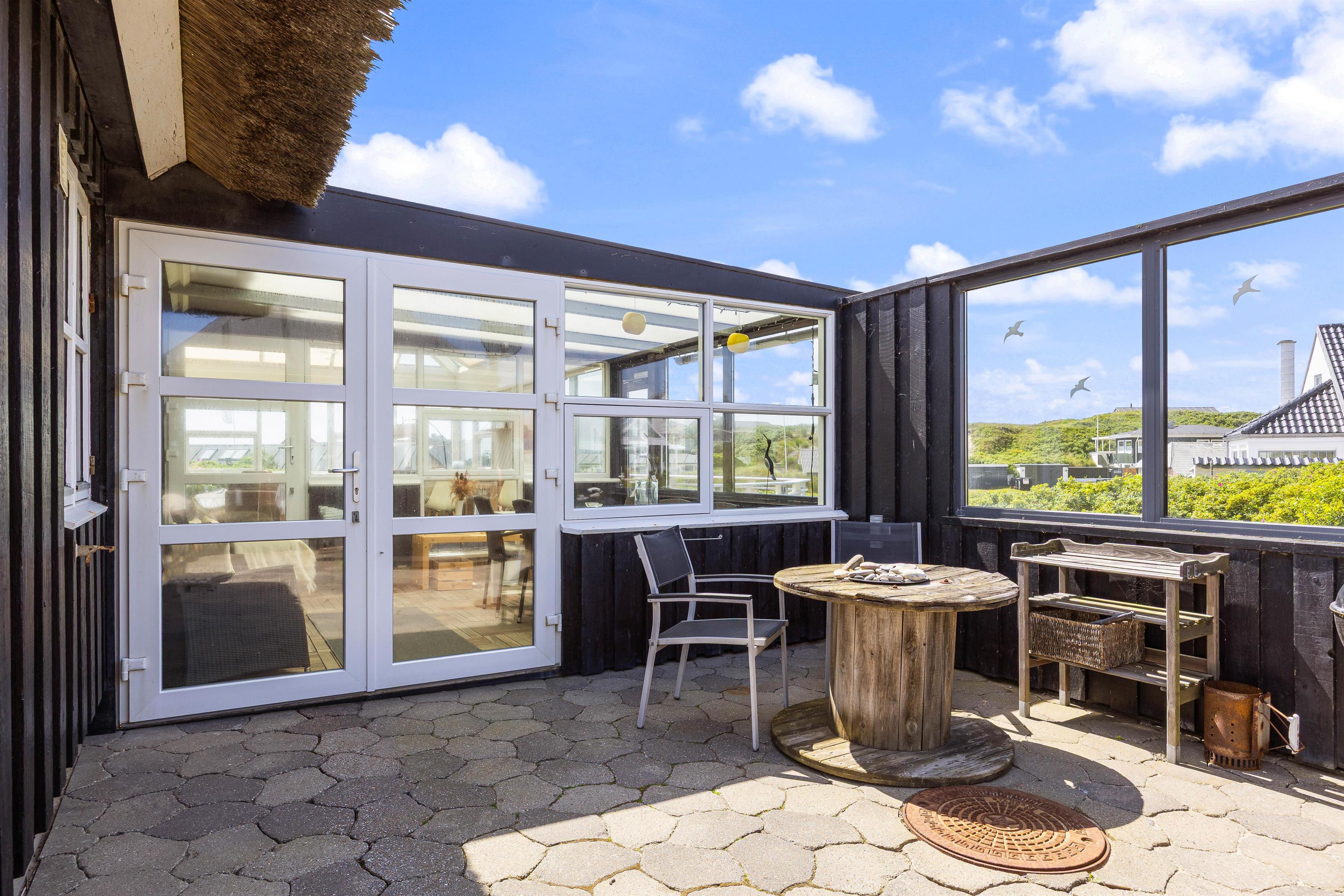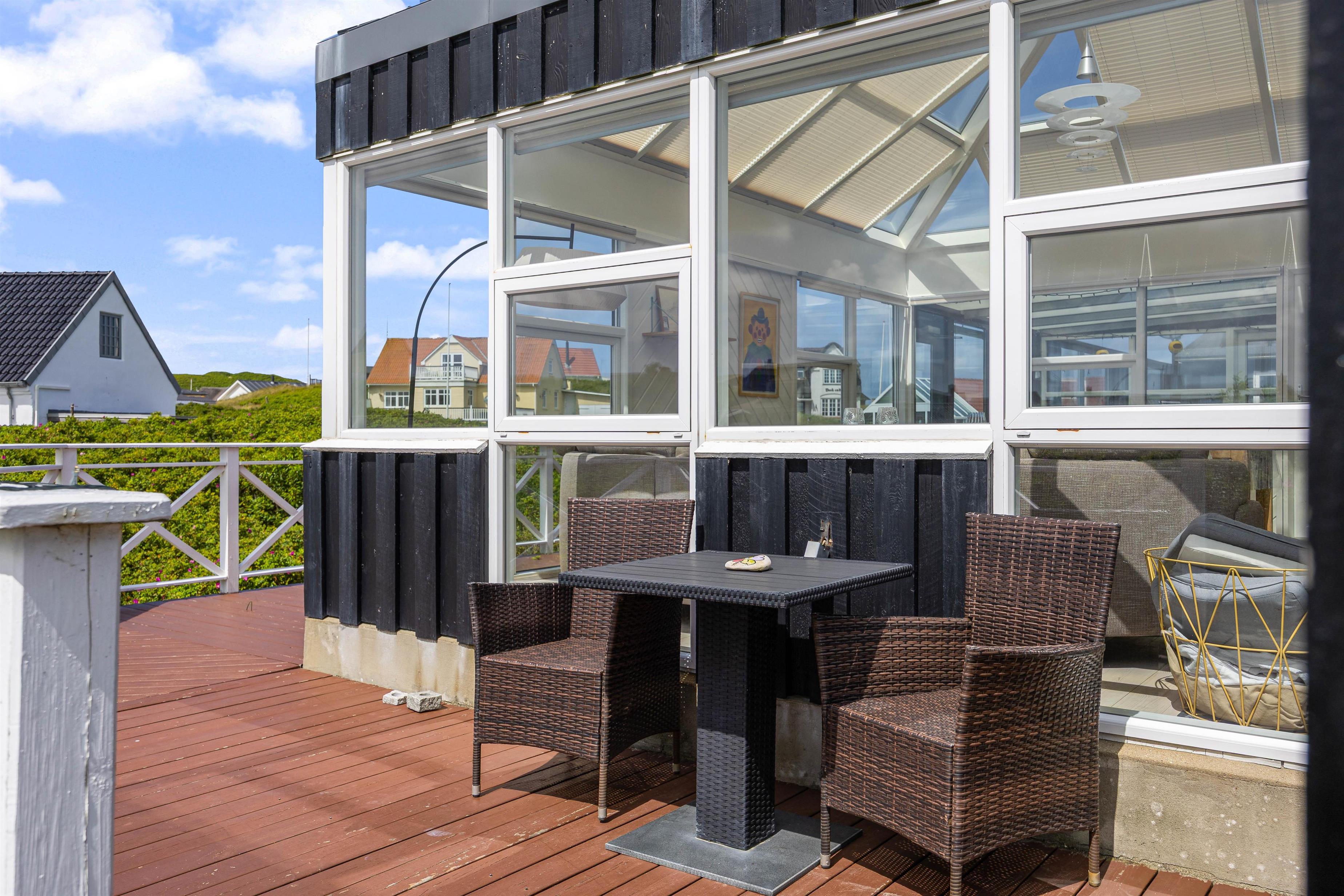 Der er skønne terrasser tilhørende dette sommerhus, Lodbergsvej 363. Mod øst er der en god og åben terrasse, som er ideel fra morgenstunden af og til hen på eftermiddagen. Mod vest er der en afskærmet terrasse, som gør den særdeles velegnet til hyggelige grill aftener. Man fornemmer tydeligt vesterhavet fra terrasserne, både duften og lyden, ligesom den hyggelige stemning fra den populære badeby Søndervig, tydeligt fornemmes fra hus og terrasser.