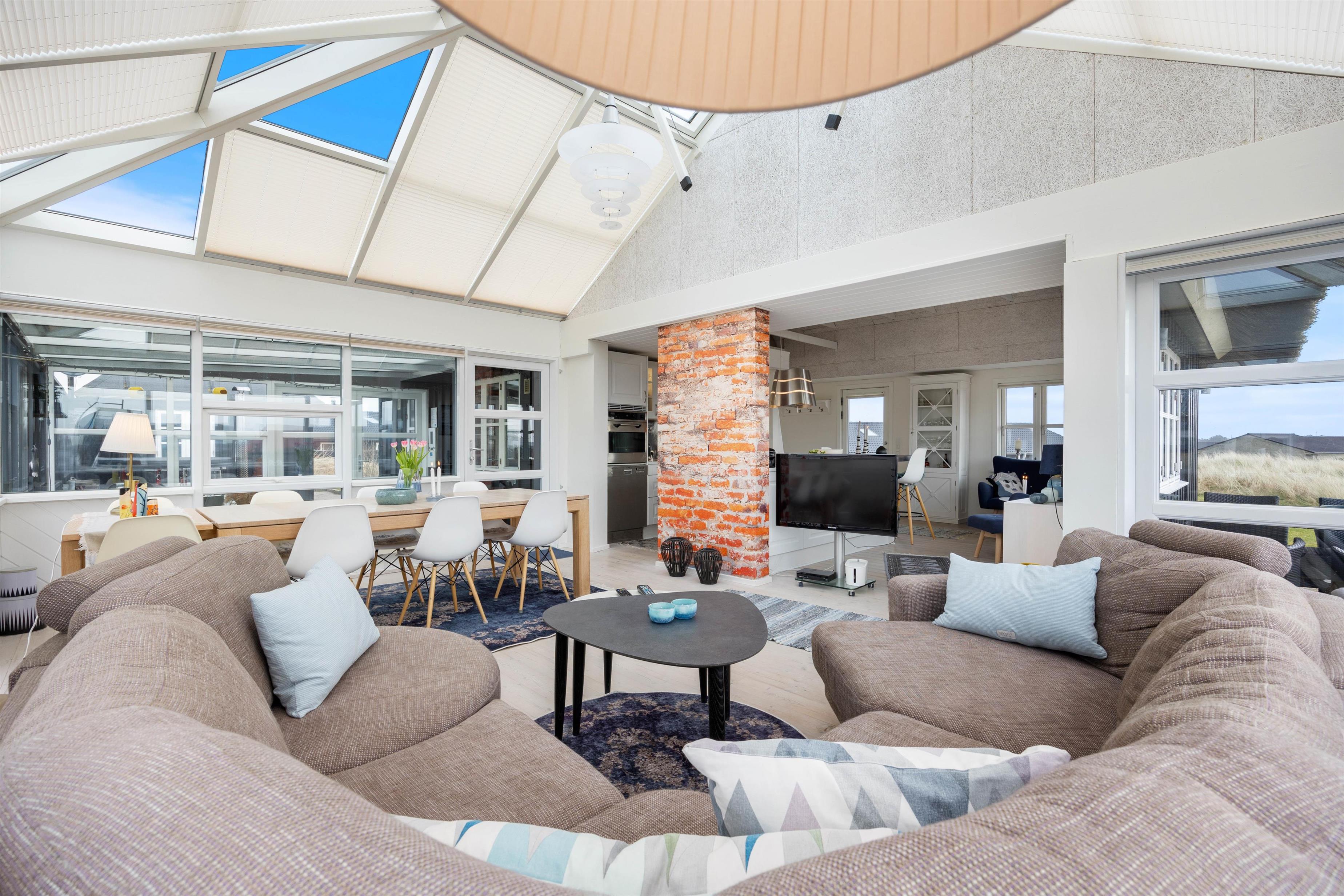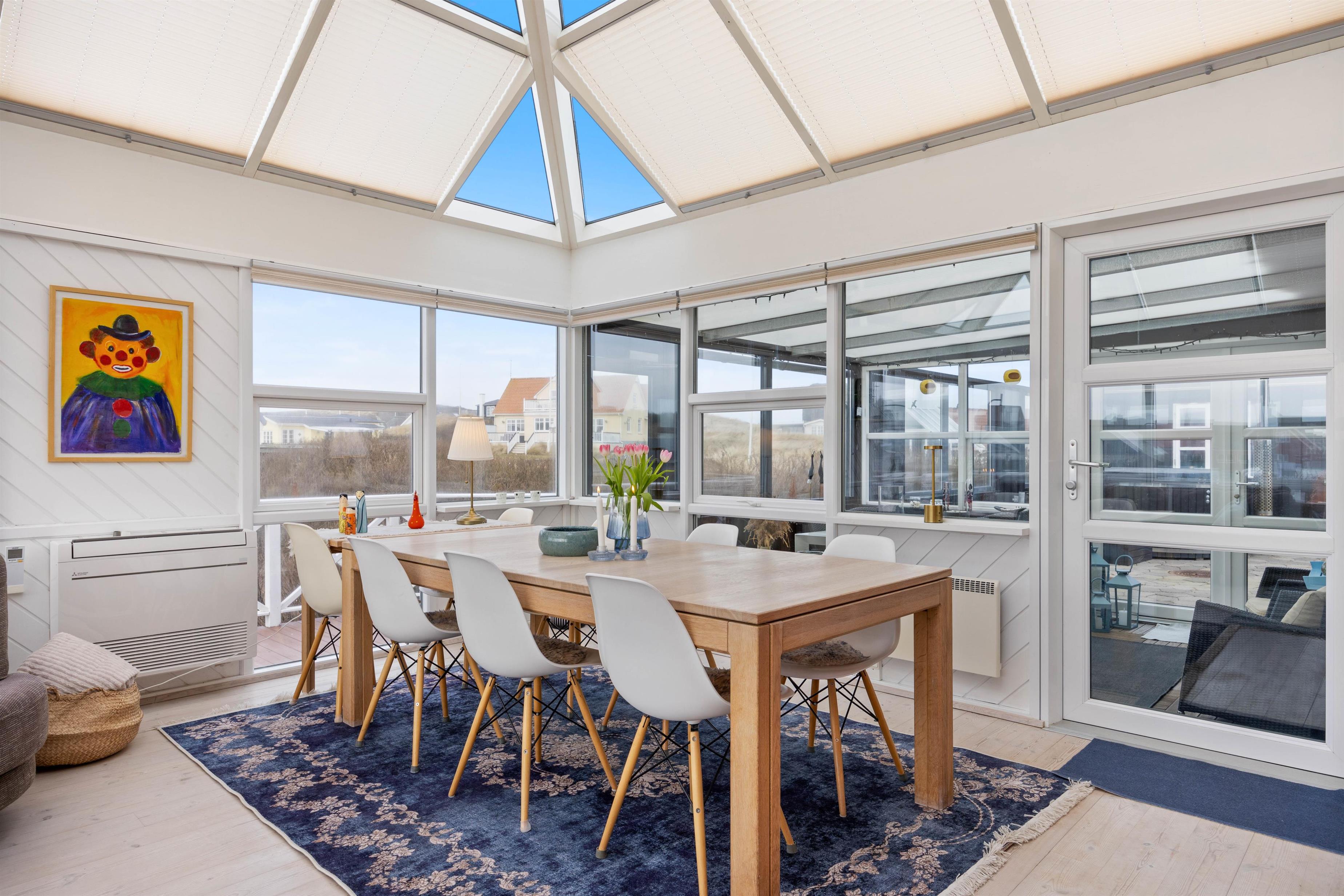 Stuen er rigtig hyggelig og stilfuldt indrettet med lækre og komfortable møbler. Her er der et fladskærms-TV, radio og gratis trådløst internet, så I kan virkelig føle jer hjemme. Udestuen ligger i forbindelse med stue og køkken, og helt mod vest. Den er fantastisk, der er et vidunderligt lys i den, og den er smukt forbundet med resten af huset, selvom den er meget anderledes, primært fordi der er loft til kip samt store vinduespartier. Her kan I sidde trygt og varmt, og bare føle jer i et med den omkringliggende natur.