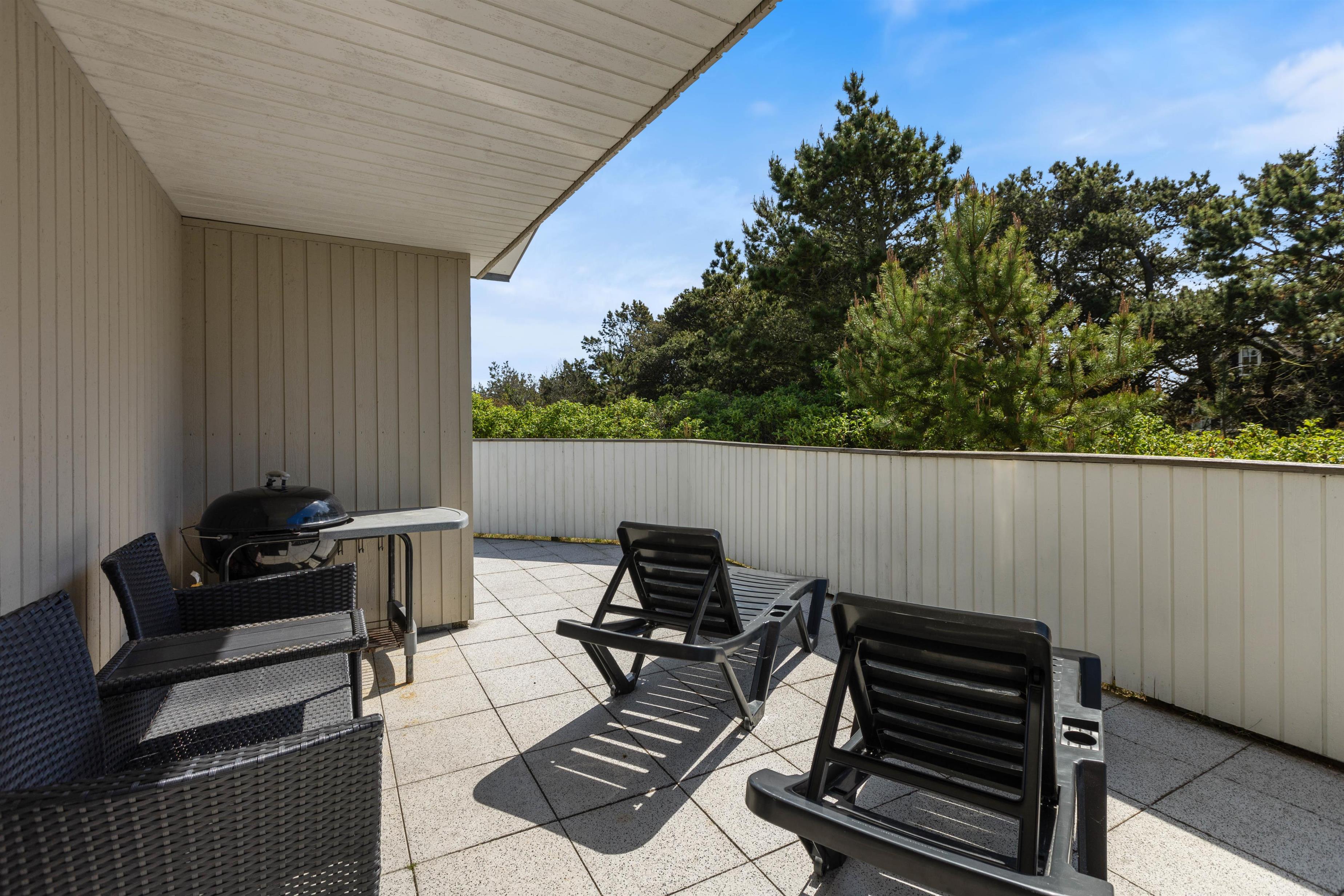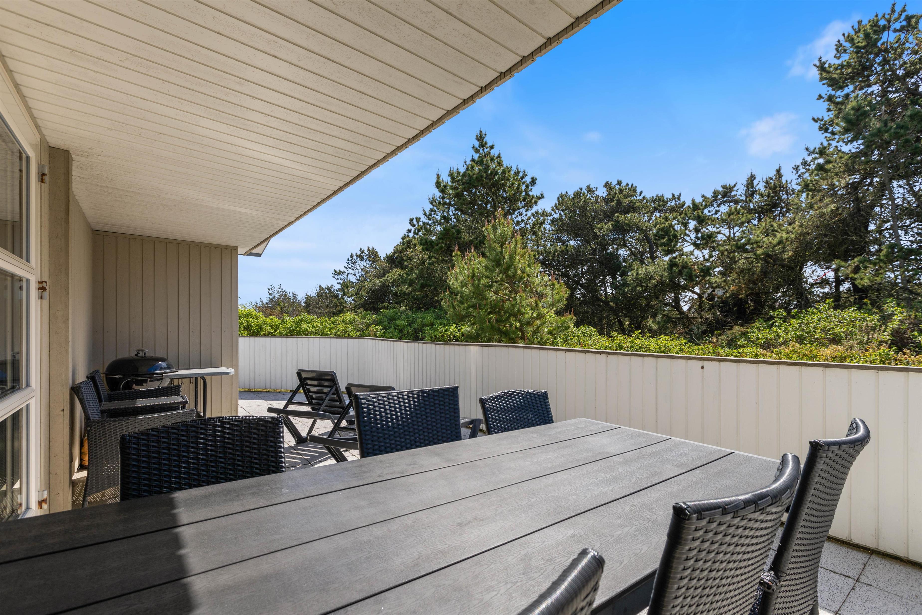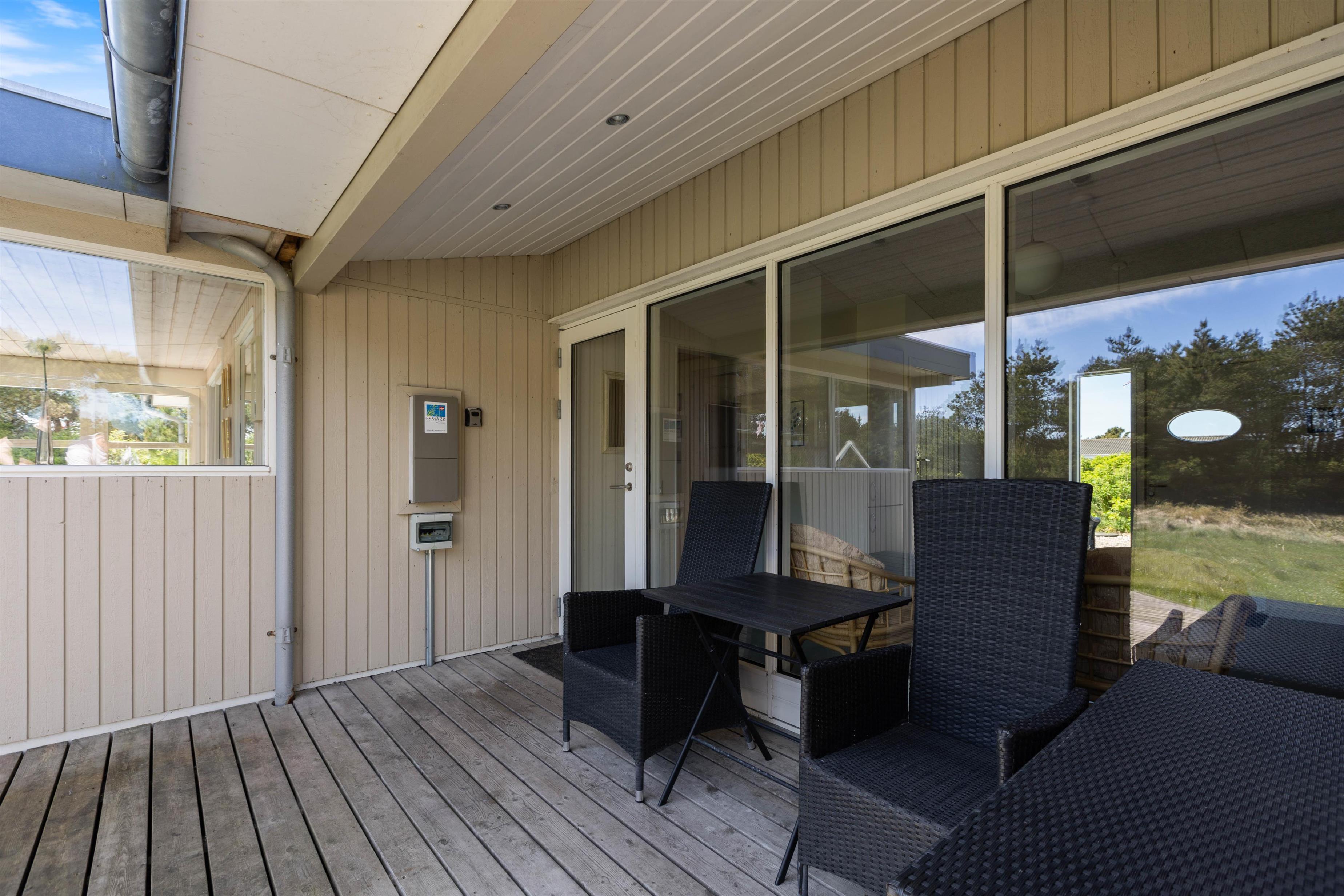 Huset ligger på en skøn hjørnegrund og er naturligt afskærmet fra andre huse. Fra stuen er der direkte adgang til en stor, lukket og delvist overdækket terrasse, der ligger mod syd/øst. Her er der naturligvis både havemøbler og grill til rådighed.