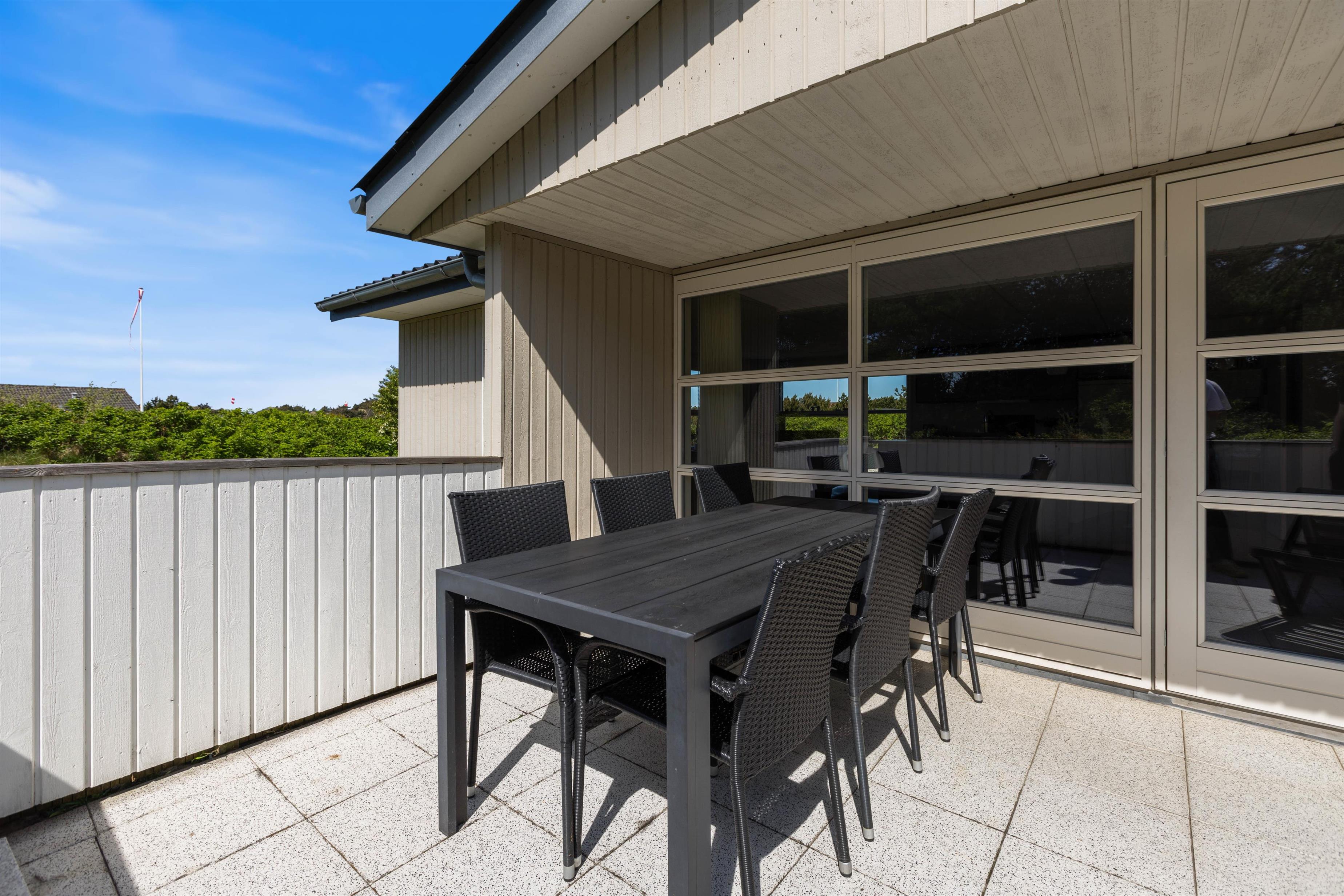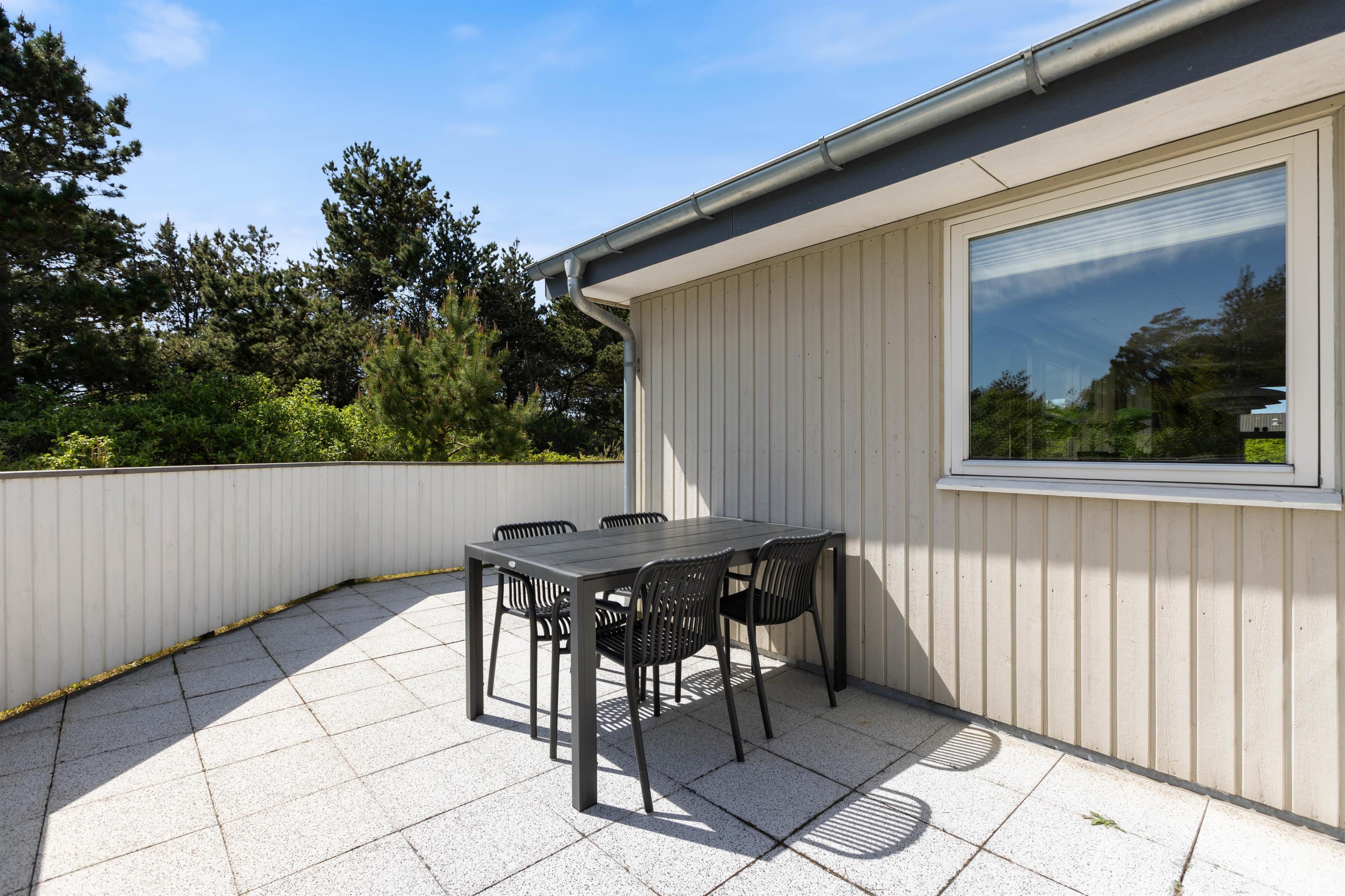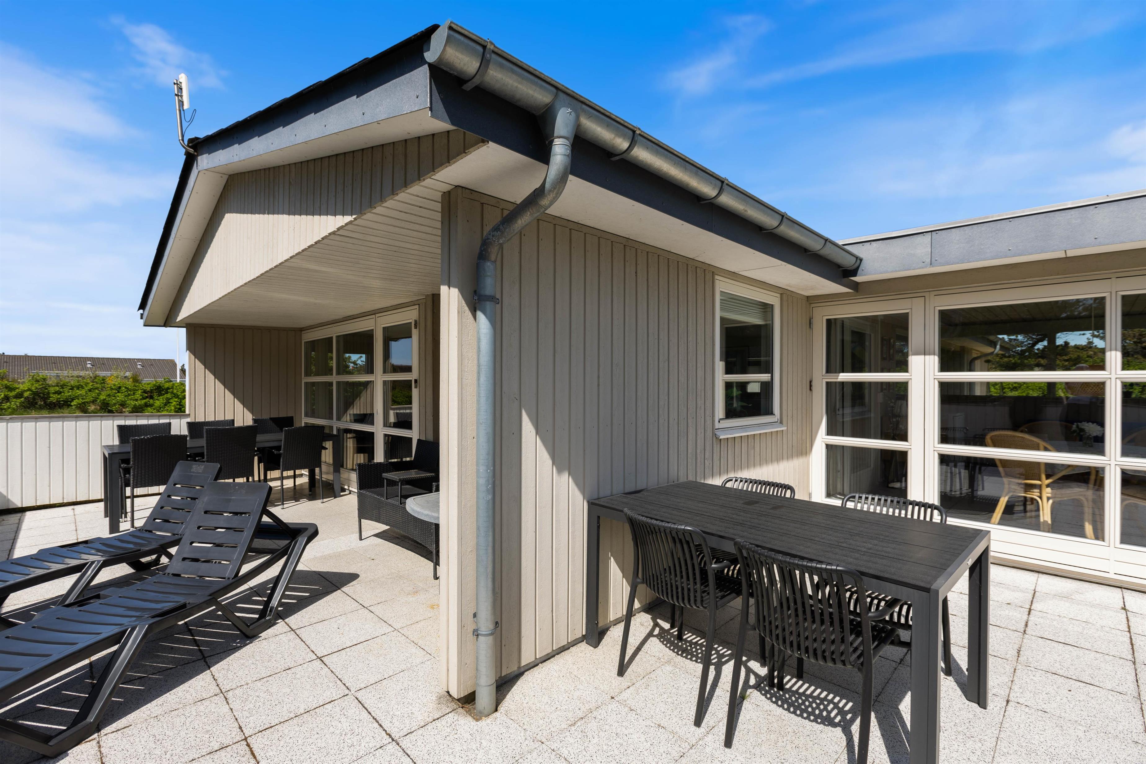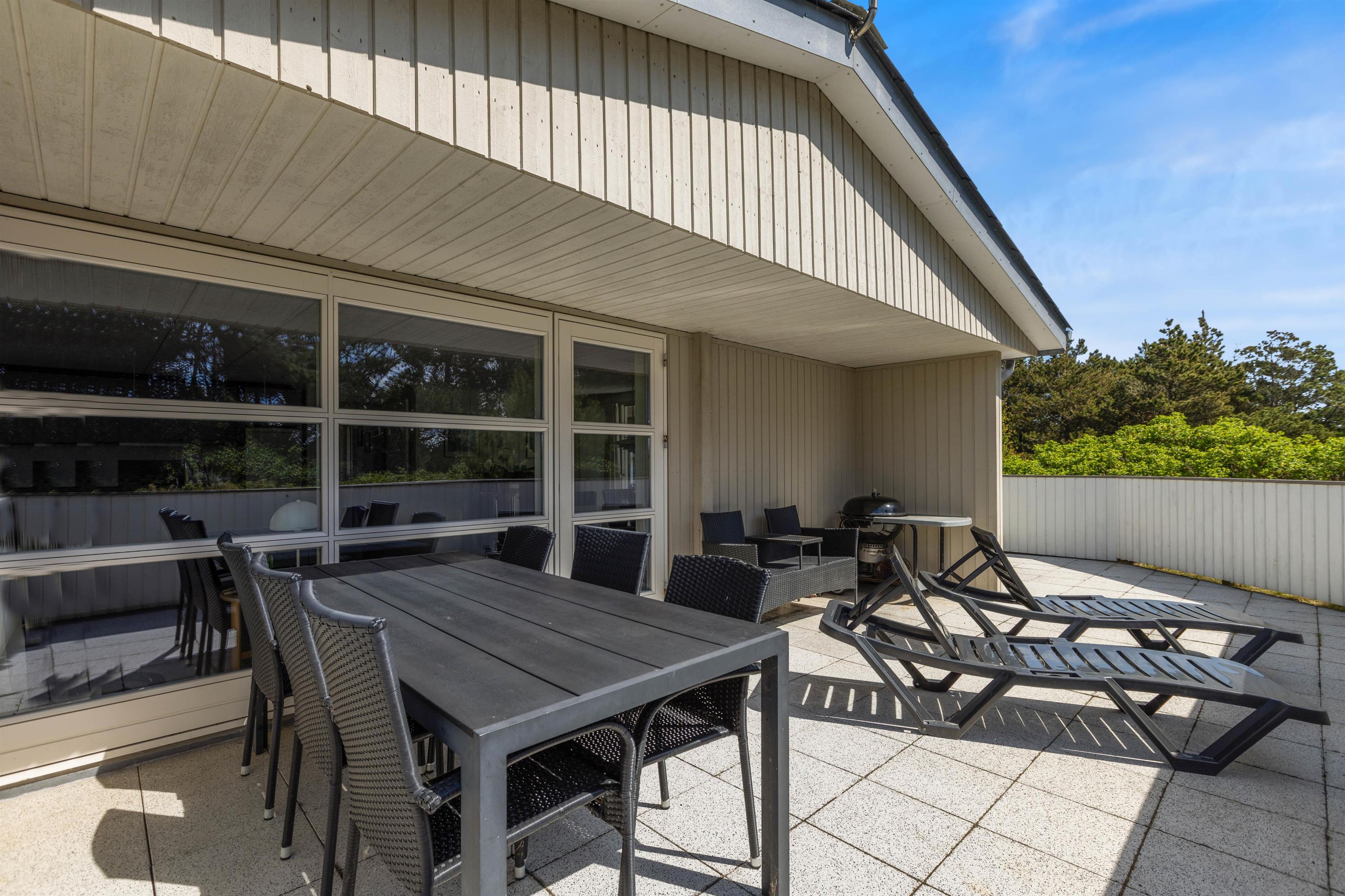 Huset ligger på en skøn hjørnegrund og er naturligt afskærmet fra andre huse. Fra stuen er der direkte adgang til en stor, lukket og delvist overdækket terrasse, der ligger mod syd/øst. Her er der naturligvis både havemøbler og grill til rådighed.