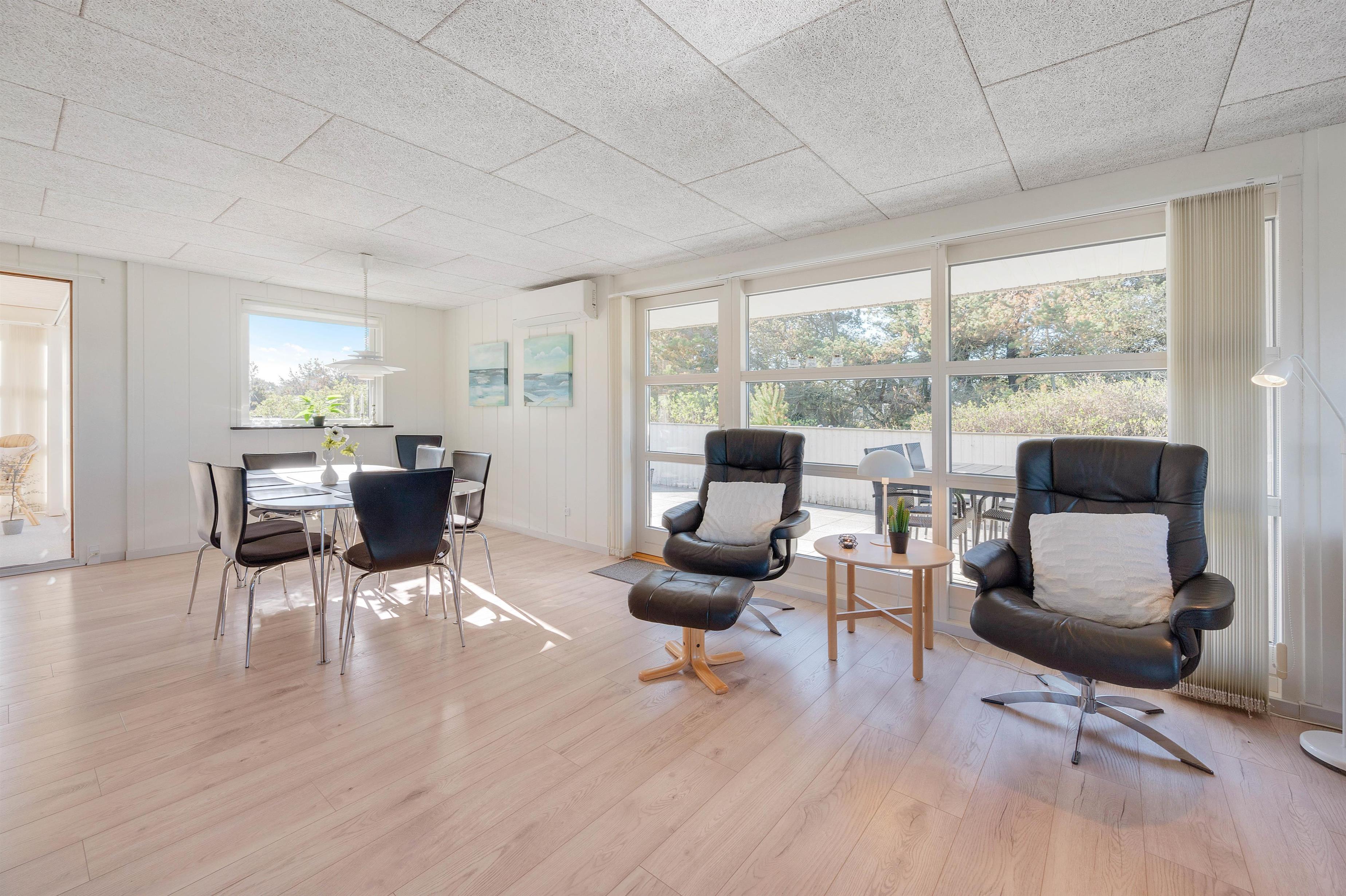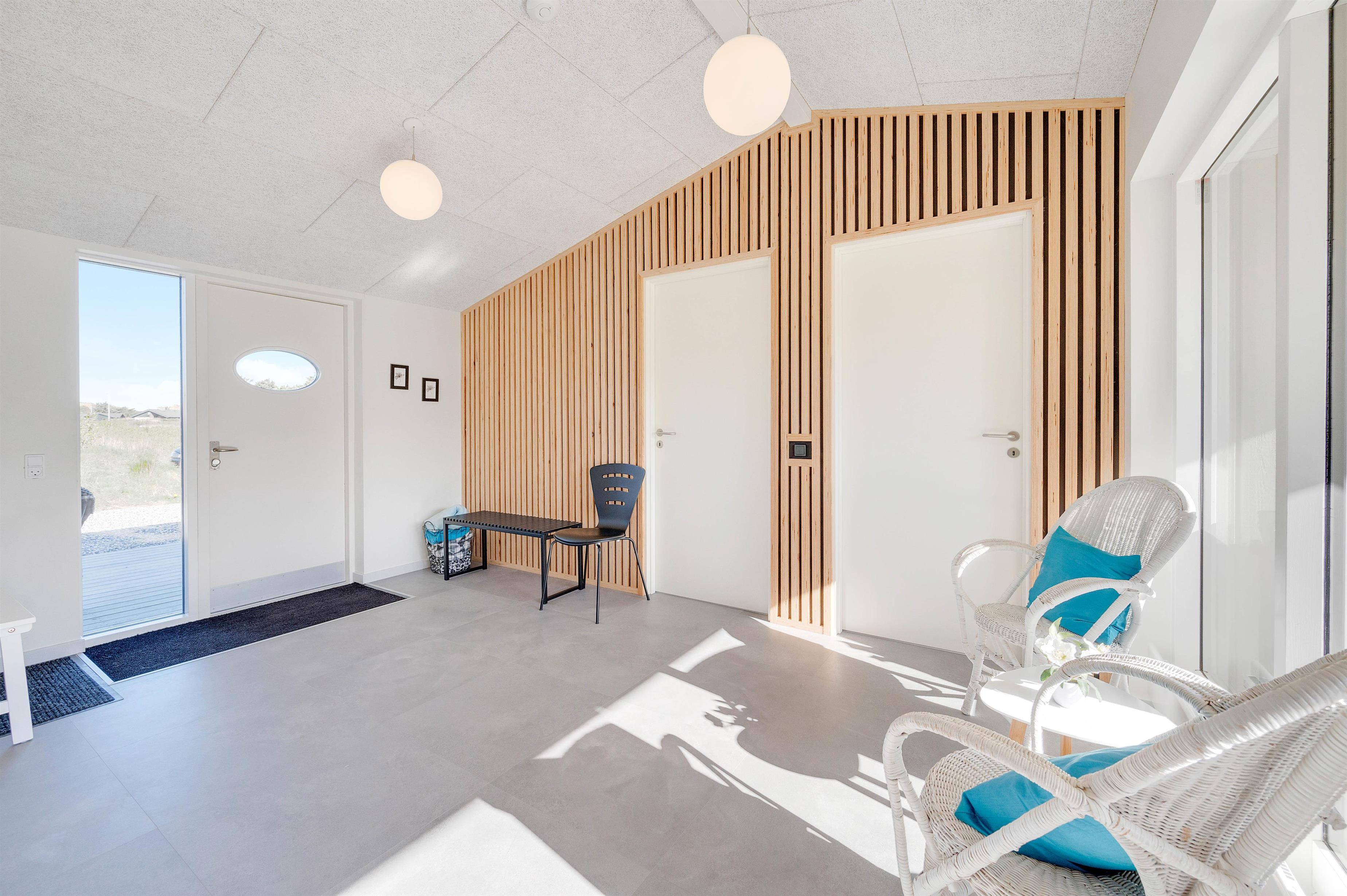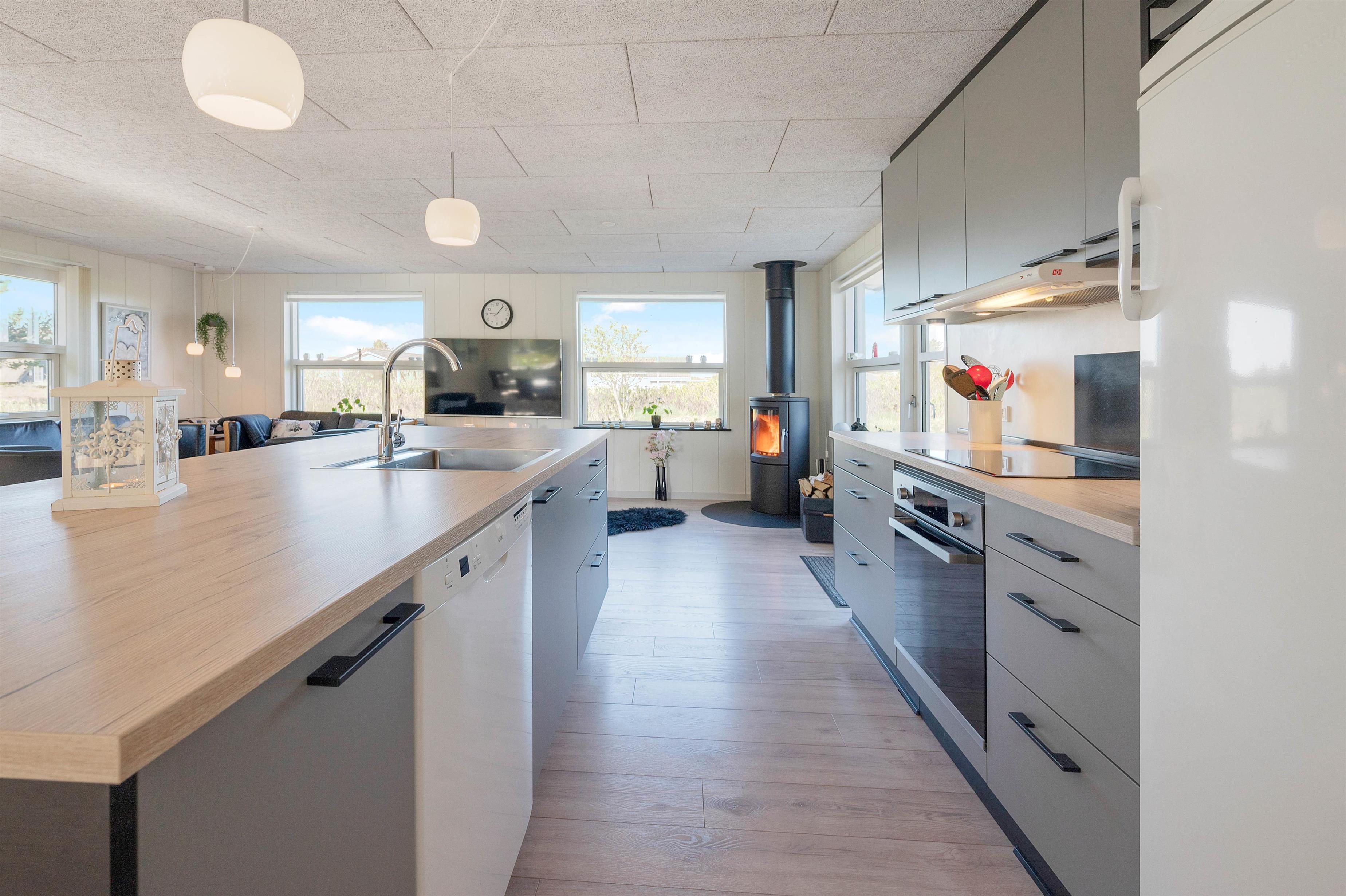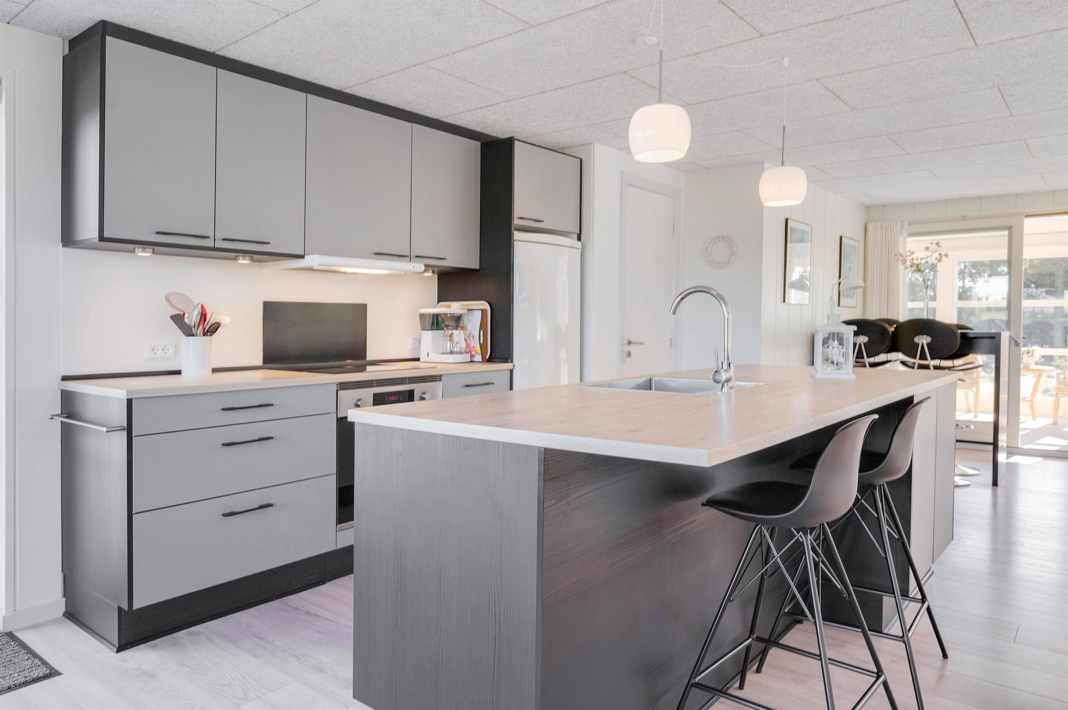 Dette velplejede og energivenlige sommerhus i Søndervig fremstår lyst og indbydende. Man mærker tydeligt, at der er tænkt på selv de mindste detaljer og gæstens ve og vel. Indretningen er holdt i smagfulde sorte og hvide nuancer, der kun brydes af det flotte, moderne køkkens grå fronter og enkelte billeder i sarte pastelfarver.