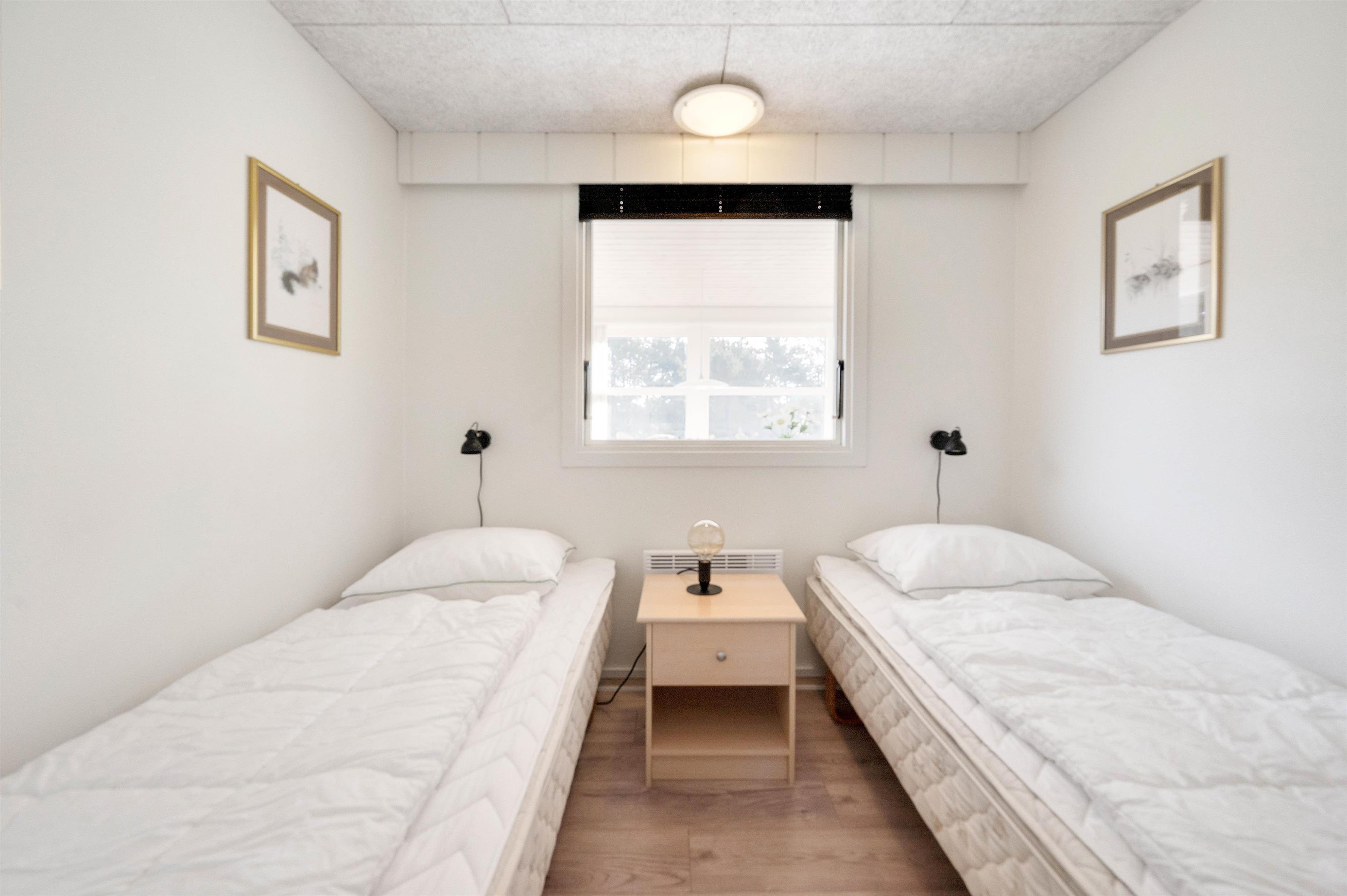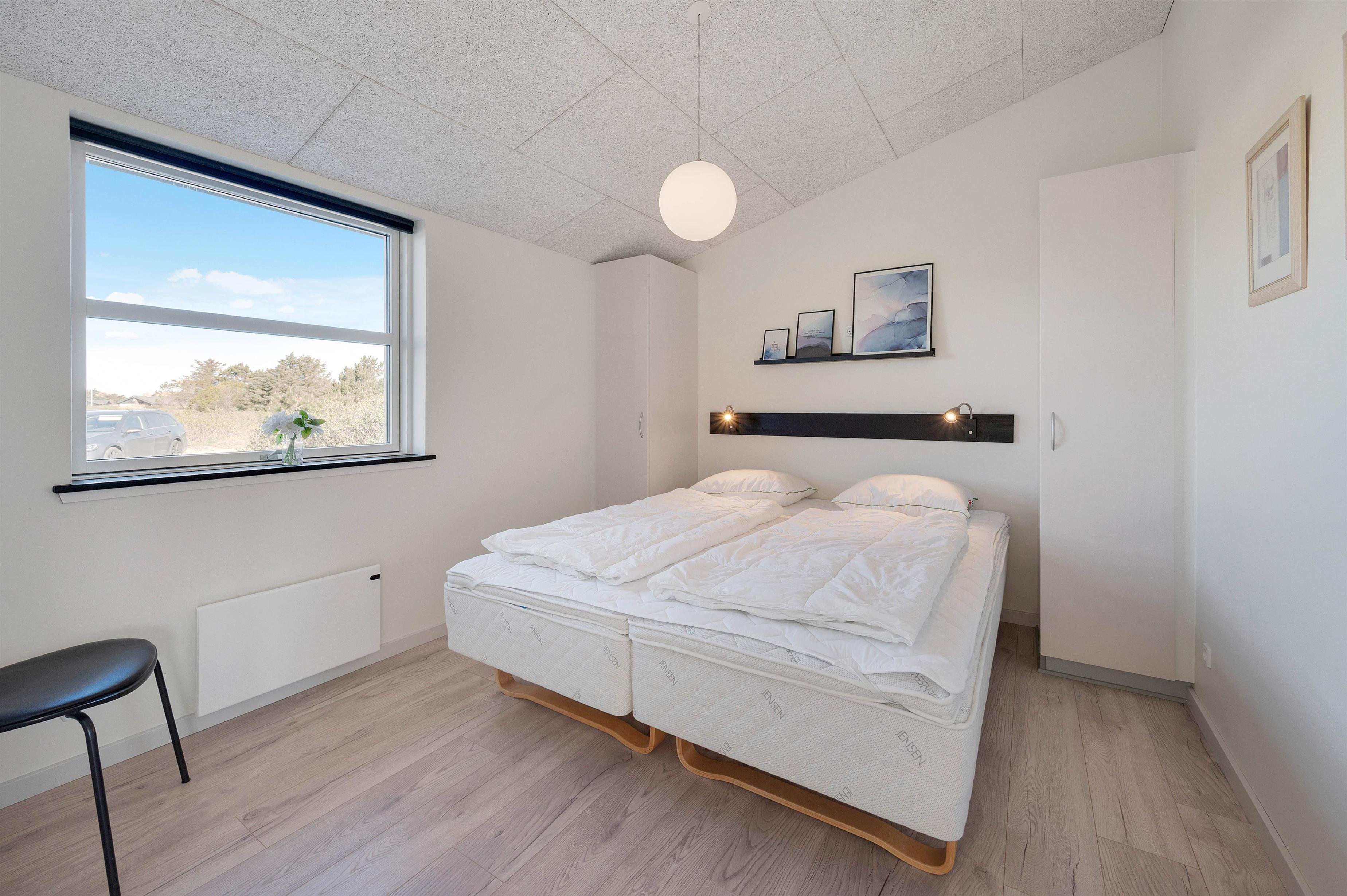Der findes tre gode og lyse soveværelser i huset – to med dobbeltseng og et værelse med to enkeltsenge. Derudover er der et fint og lyst badeværelse med bruseniche og opvarmet flisegulv. En energibesparende varmepumpe/aircondition sørger desuden for en behagelig opvarmning af huset.