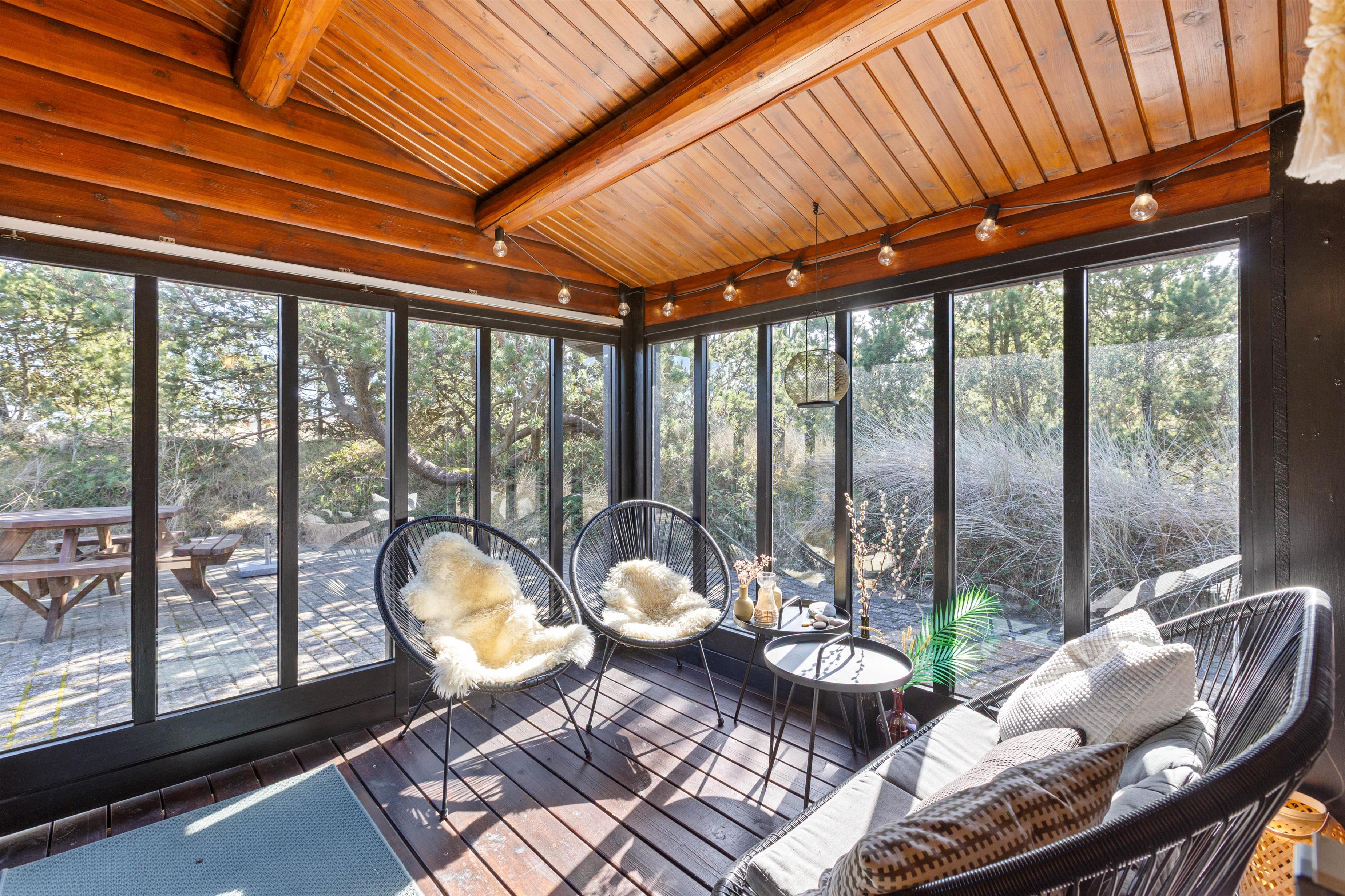 Dette fine træhus på Marehalmen 12 i Søndervig emmer af ægte sommerhushygge. Feriehuset er velegnet både til den store familie, men også til to familier, som ønsker sig en afslappende ferie midt imellem hav og fjord. Sommerhuset har et tilstødende anneks, med ekstra sovepladser og eget badeværelse. I kælderen under annekset finder I husets aktivitetsrum med dart, billardbord og bordtennis. Her kan op til ni personer og jeres to hunde holde en skøn ferie i den vestjyske natur.
