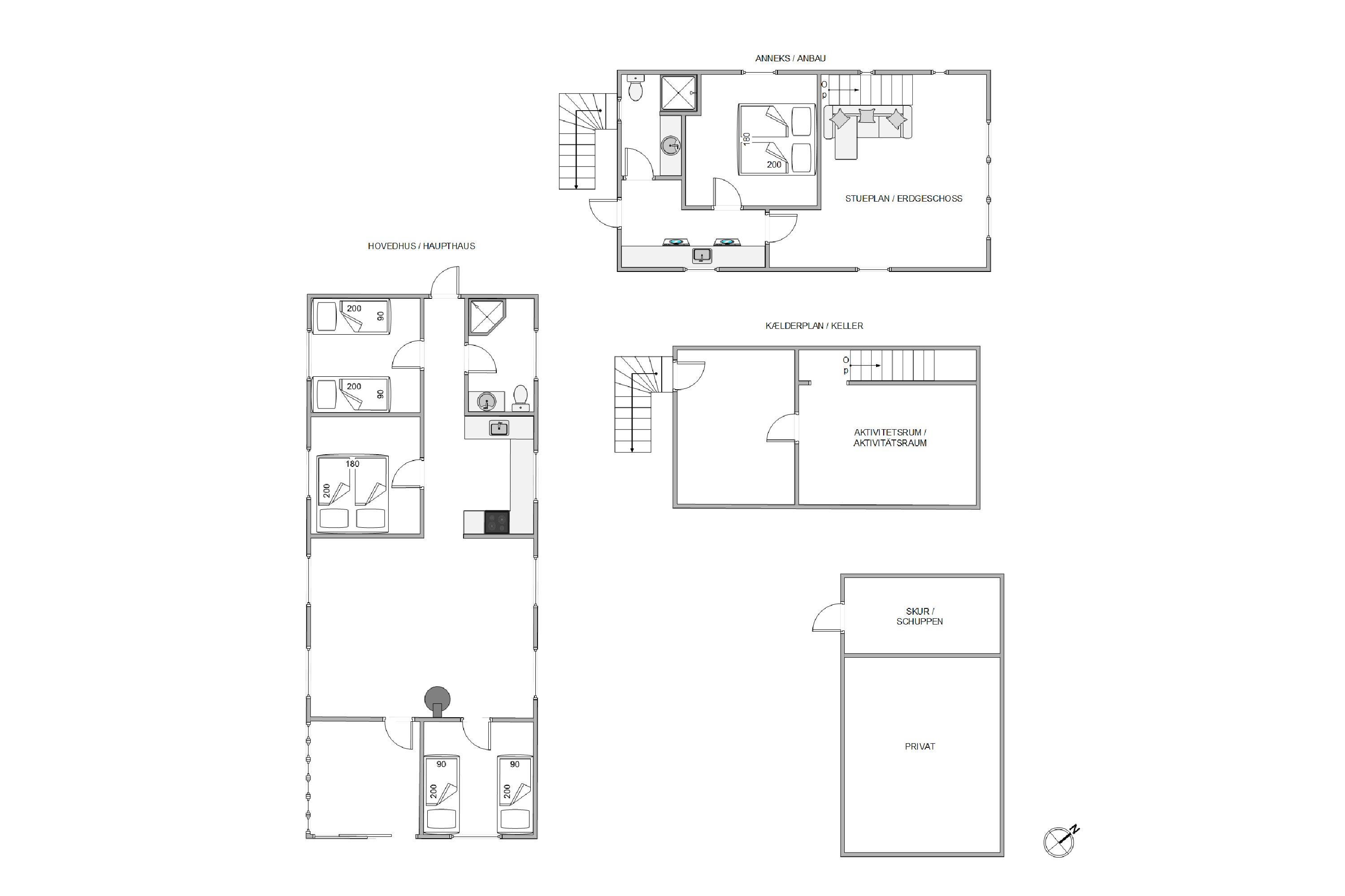 Sommerhusets indretning er ideel til familien med ældre børn eller flere familier. I hovedhuset er der masser af plads i opholds- og spiseområdet til, at man kan hygge alle samlet. Hjørnekøkkenet er veludstyret, så feriekokken kan slå sig løs. Tre af husets soveværelser med i alt 6 sovepladser, og det ene badeværelse er også placeret i hovedhuset.