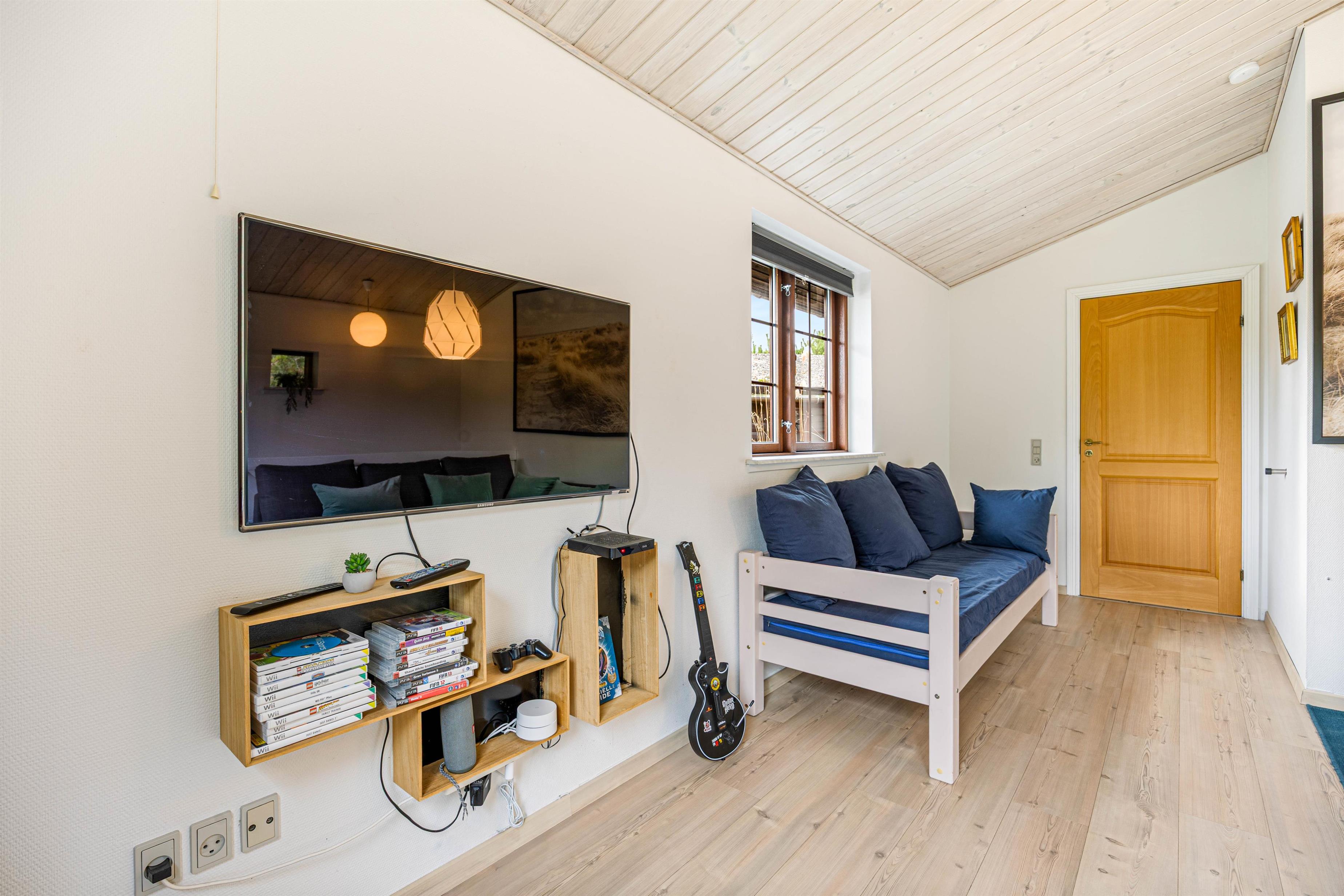Hovedhuset og annekset er forbundet af en overdækket terrasse, så man problemfrit kan gå frem og tilbage. Annekset rummer et lyst værelse med tv, to sovesofaer, et soveværelse med dobbeltseng, et bryggers med vaskemaskine og tørretumbler, og et badeværelse med gulvvarme.