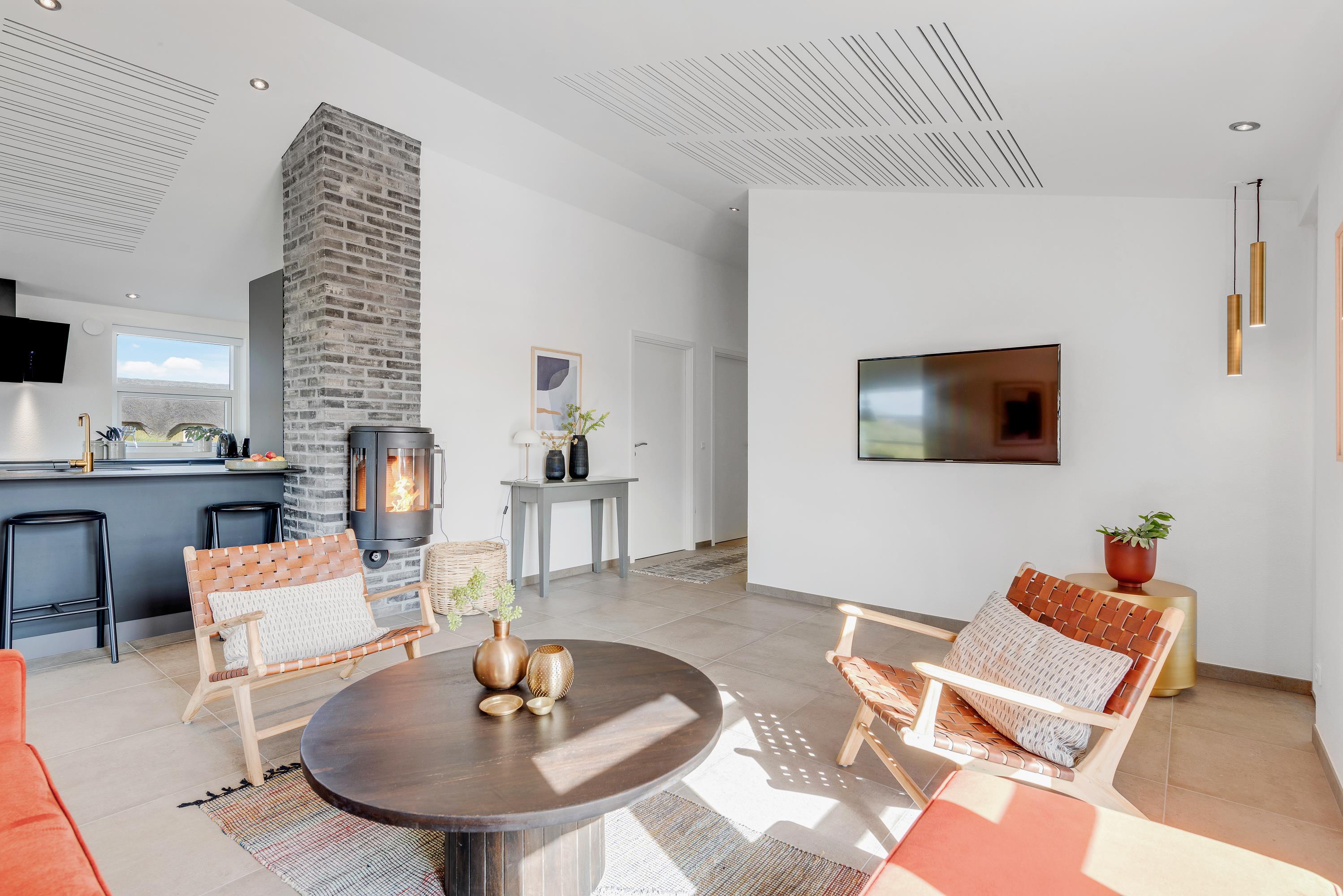Det flotte sorte sommerhus har et stort opholdsrum, hvori stuen og køkkenet indgår – Dette fungerer altså som feriehusets hjerterum, hvor der er plads til hele jeres familie. Nyd nogle hyggelige og afslappende dage med hinanden – Hvor det eneste I behøver at bekymre jer om, er hvad aftensmadsmenuen skal stå på. I kan også slappe af foran tv'et i stuen og hvis man ønsker at se en anden film end de andre, er der tv i alle soverrum.