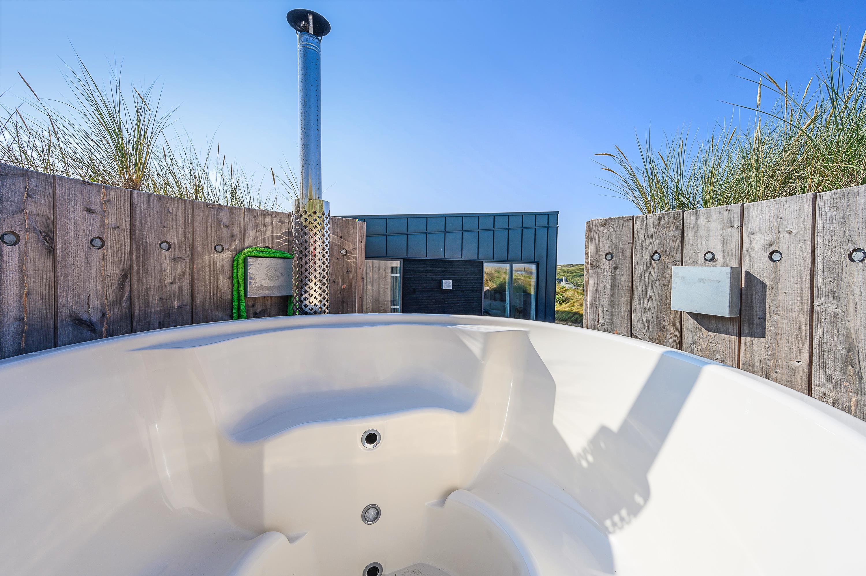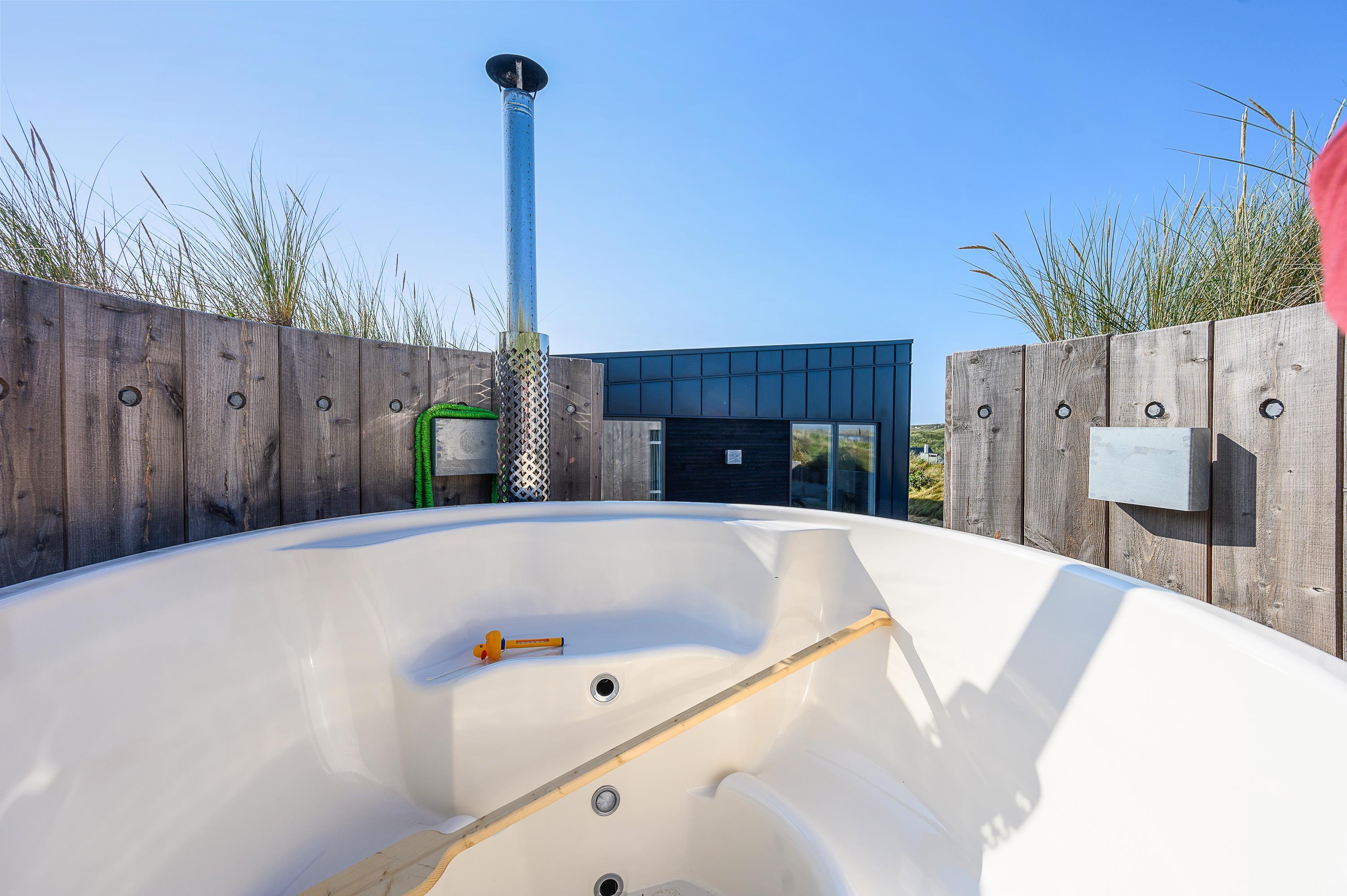 Sommerhuset byder på flere fænomenale feriehighlights både udvendigt og indvendigt. Den store terrasse har sit helt eget wellnessområde med vildmarksbad, saunahus og udendørs bruser. Derudover er der masser af skønne siddekroge, hængekøje og loungesæt, så I kan nyde den friske luft og den flotte udsigt i fulde drag.