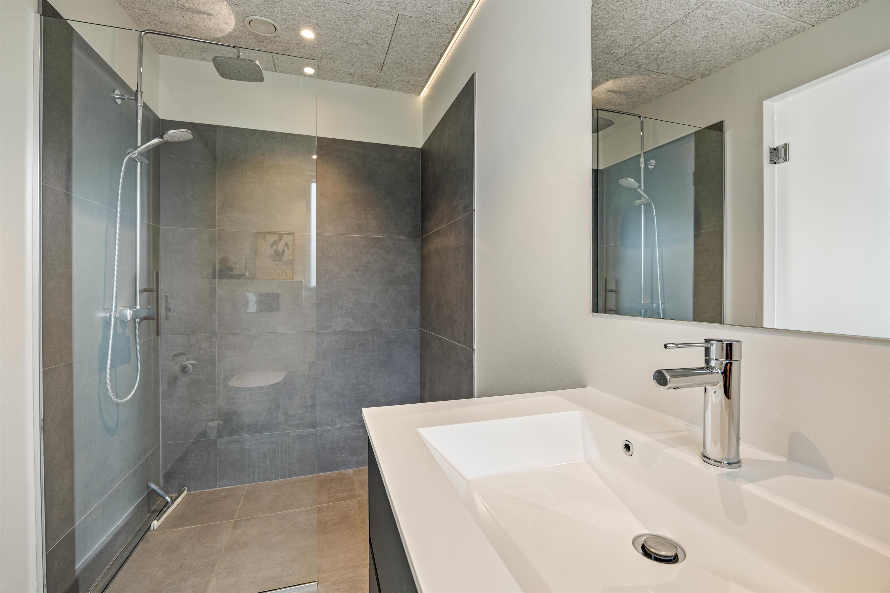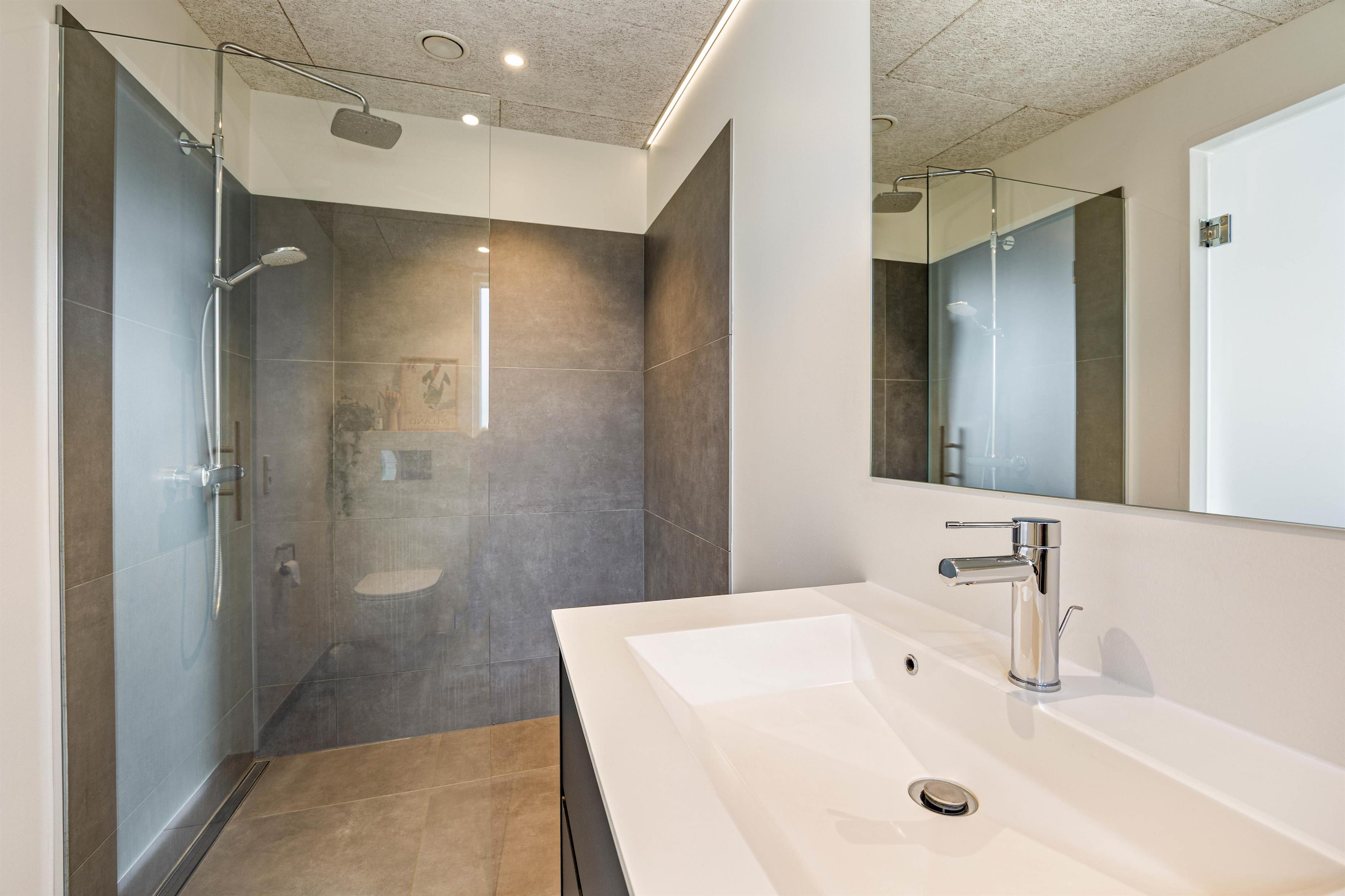 Ud over de 3 badeværelser i forlængelse af soveværelserne rummer sommerhuset desuden et ekstra badeværelse med dobbeltbruser. De i alt 4 badeværelser er selvfølgelig alle udstyret med gulvvarme, ligesom der er gulvvarme i opholdsrummet.