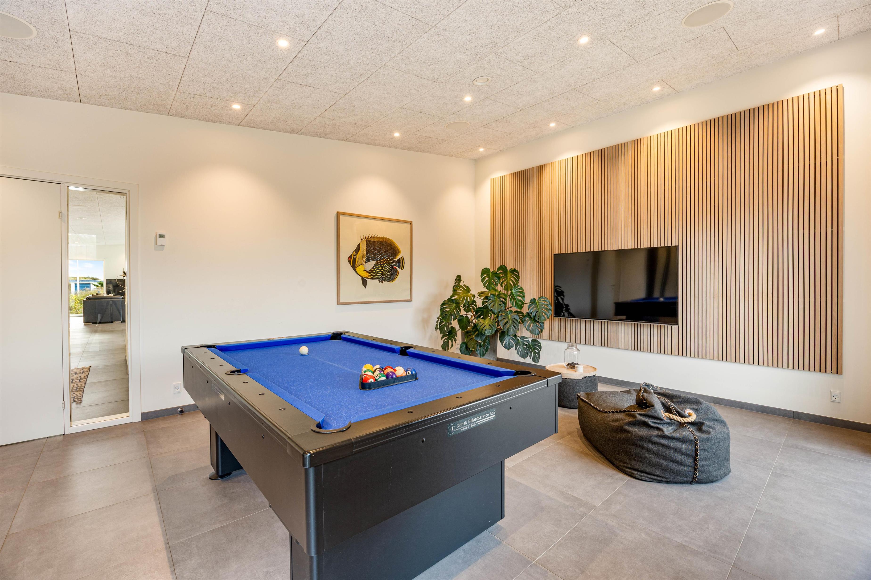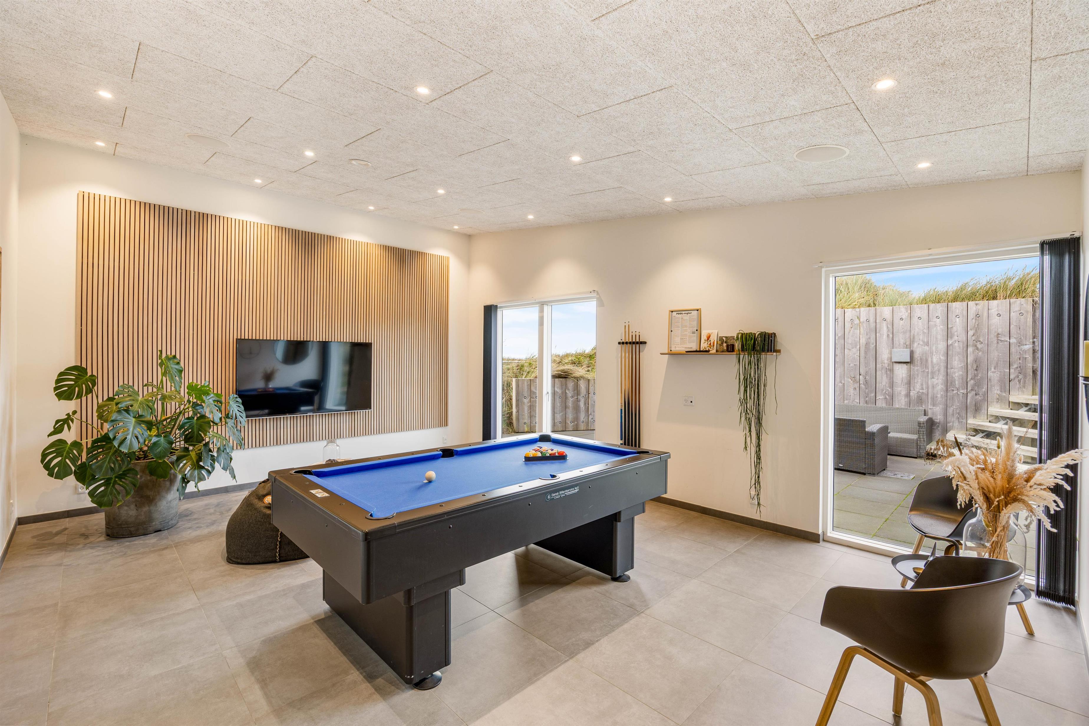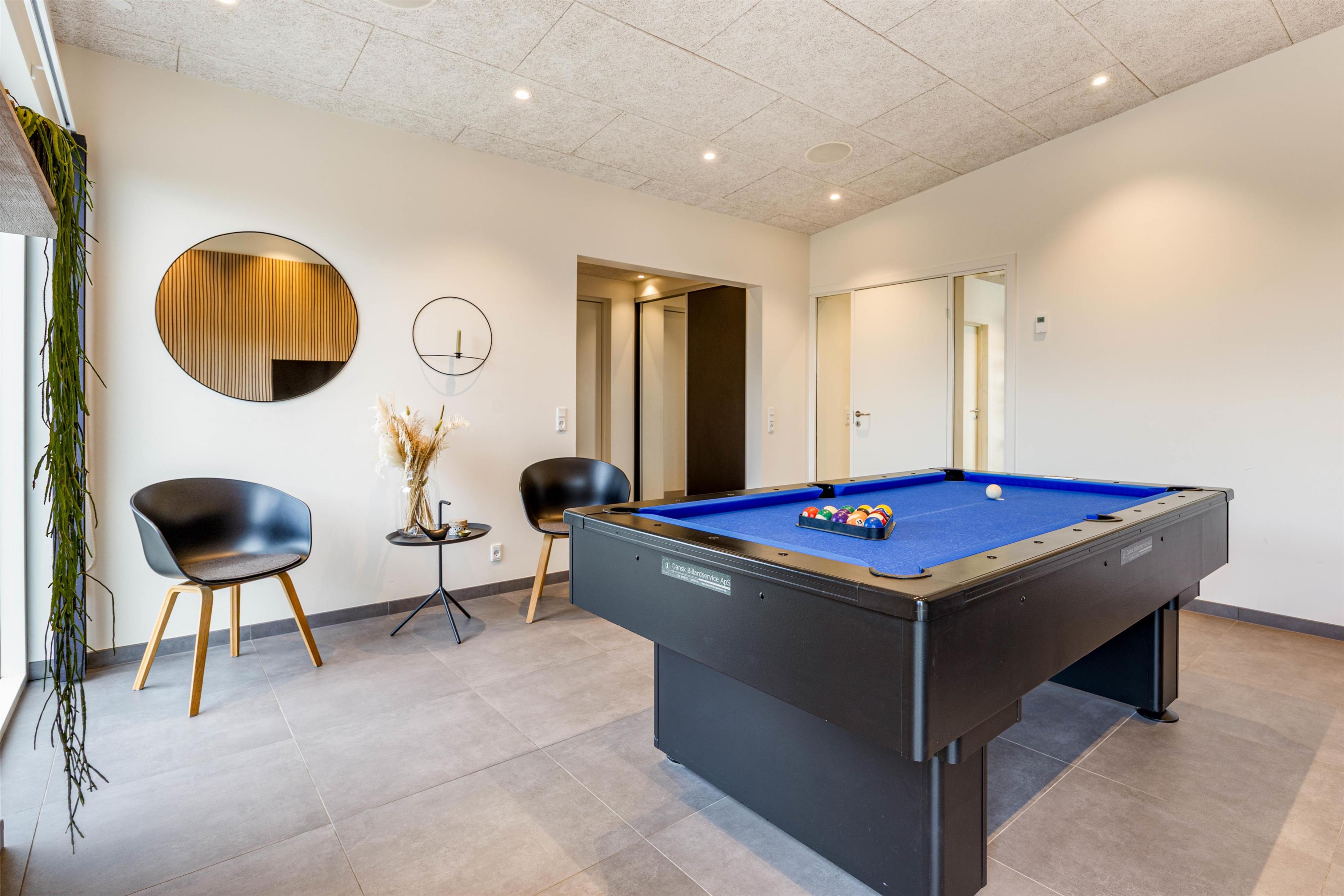 Indenfor finder I et aktivitetsrum med billardbord, og der er bluetooth-højtaler indbygget i loftet.