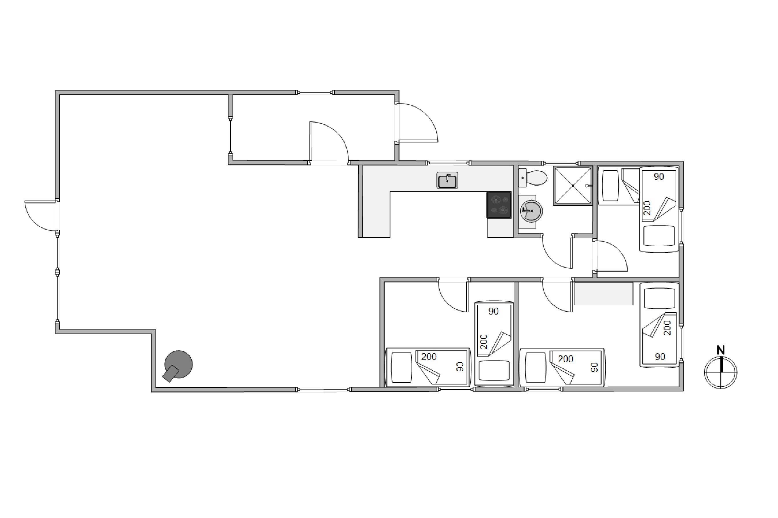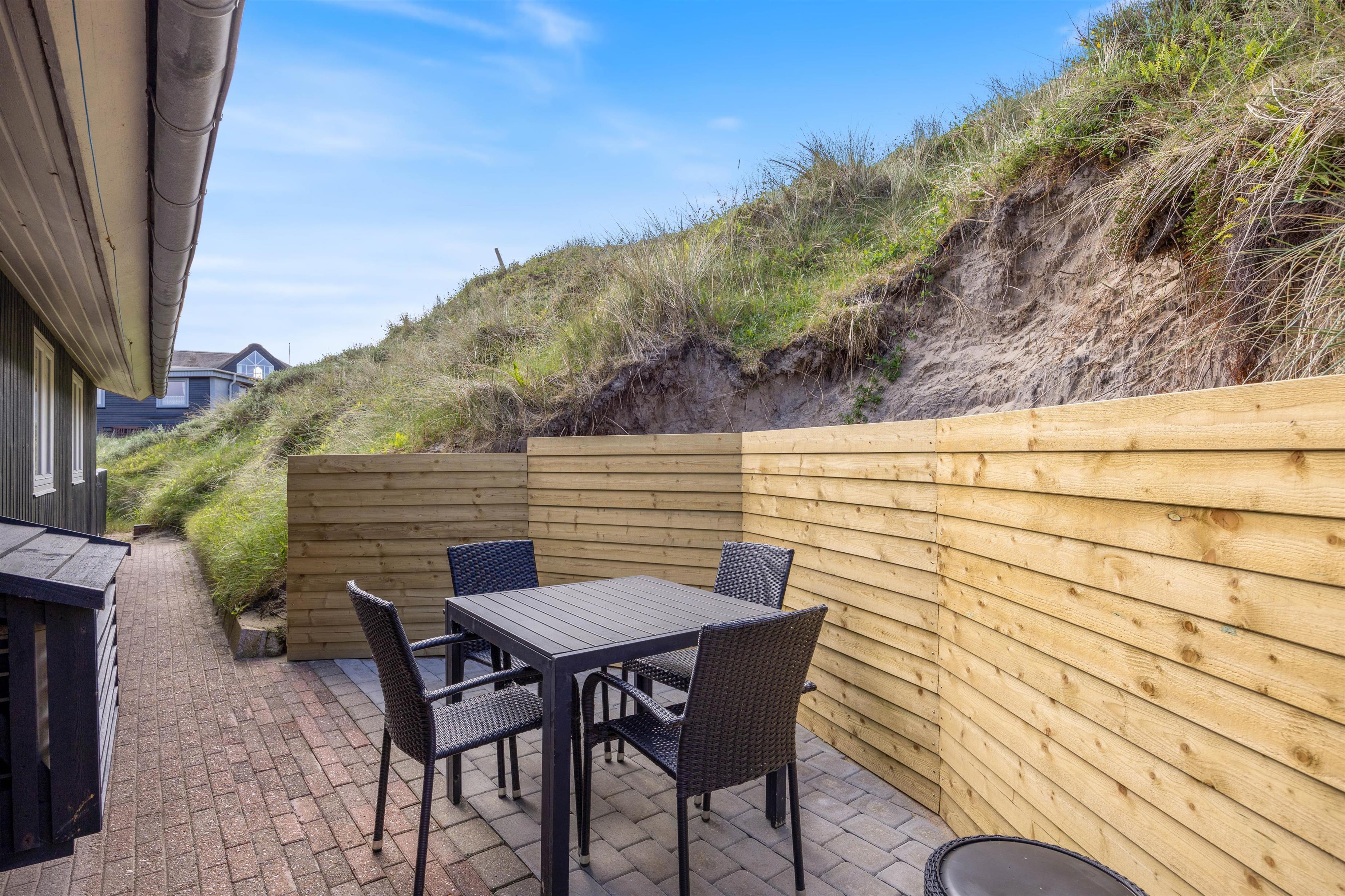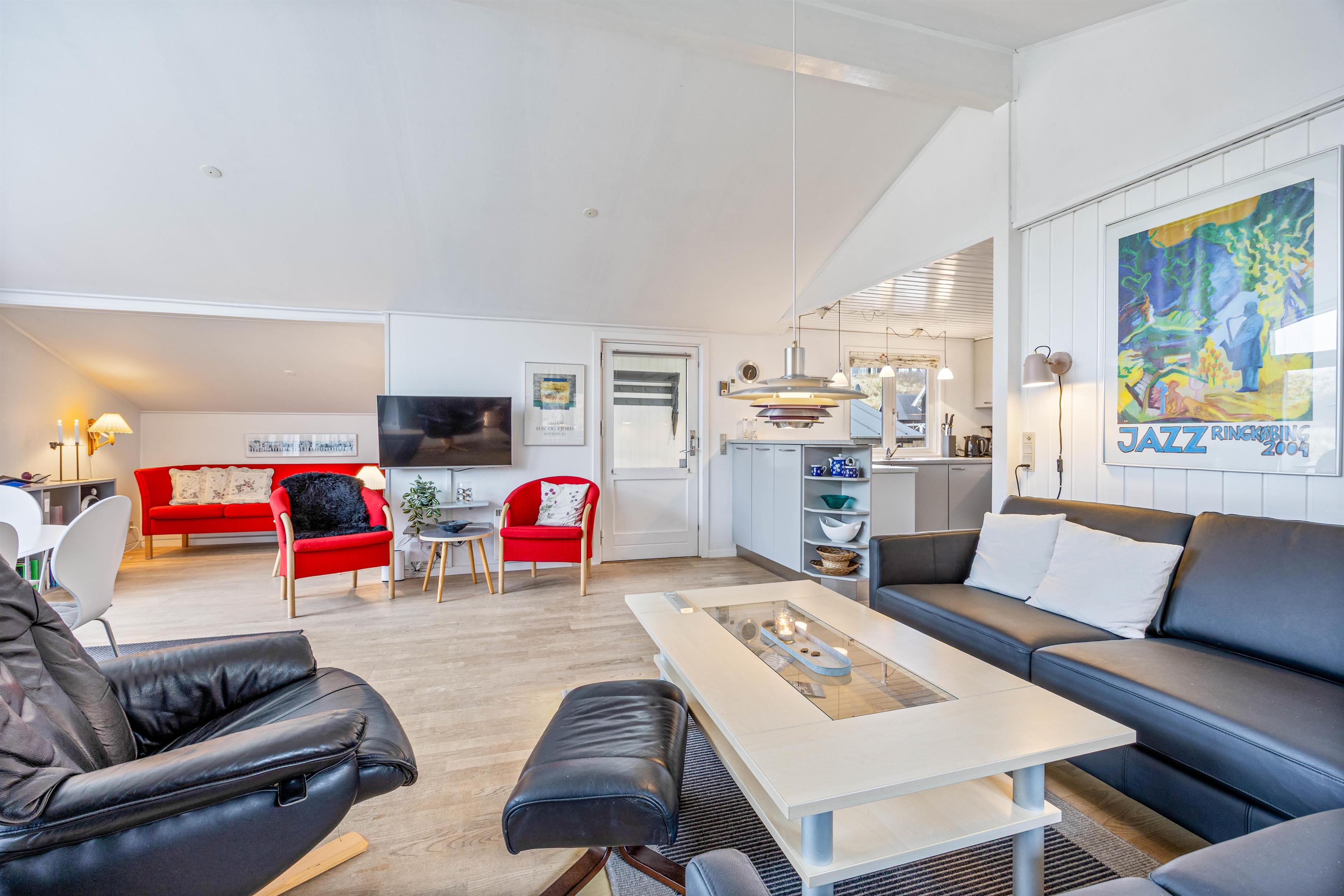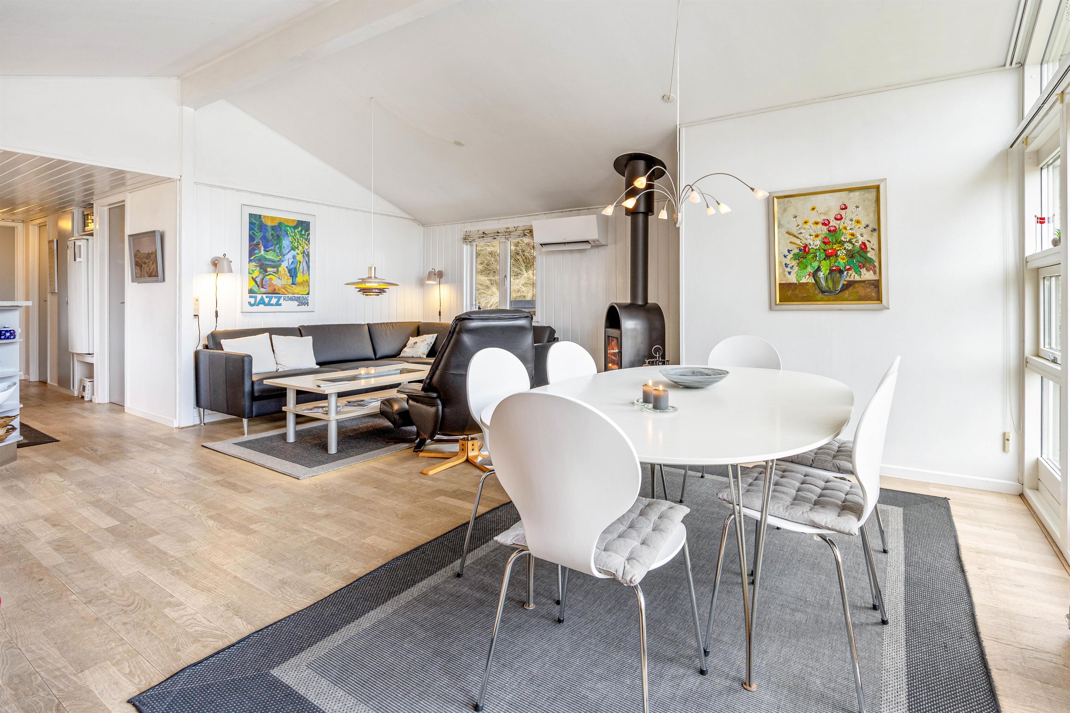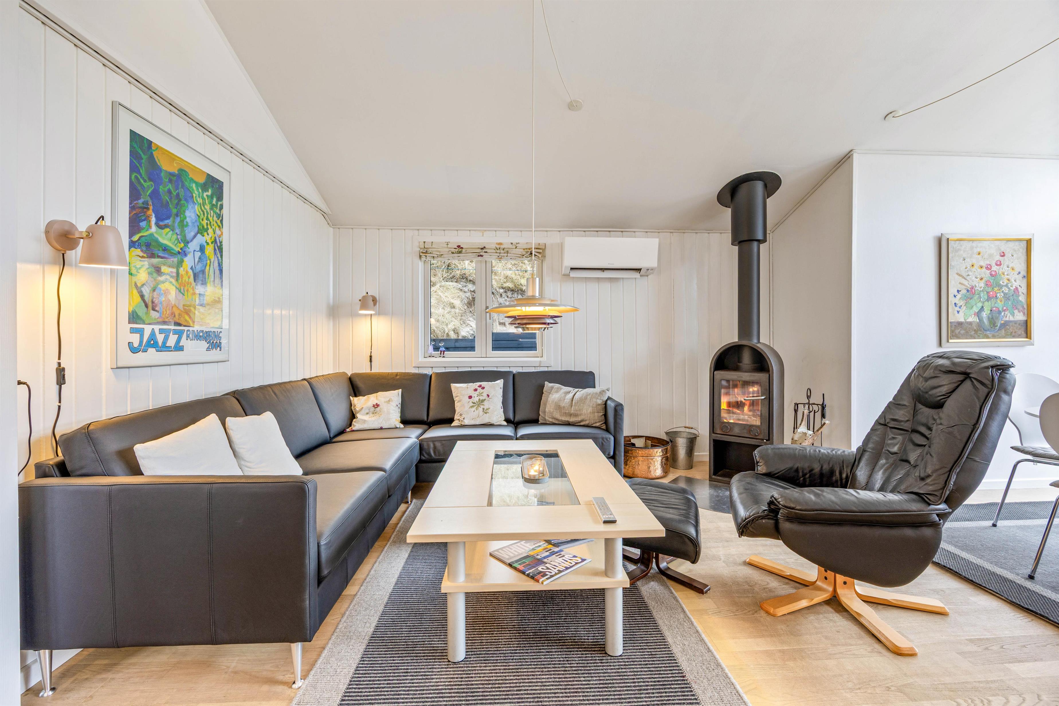 Det store opholdsrum, hvor køkken og stue flyder sammen er også udstyret med en brændeovn, der er perfekt til de lidt køligere dage og den hyggelige atmosføre, samtidig med at de lyse farver i indretningen også bidrager til den gode atmosfære, samt får rummene til at virke større. Det samlede resultatet er en meget hjemlig atmosfære, der indbyder til afslapning og nærvær med ens medrejsende. Mod syd er der i 2024 lavet en terrasse med afskærmning, så der på denne måde er læ for nordvestvinden. Derudover har I rig mulighed for at nyde varmen fra solen i de skønne sommermåneder. I kan lade børnene lege frit imens I slapper af, da den ene terrasse er lukket.