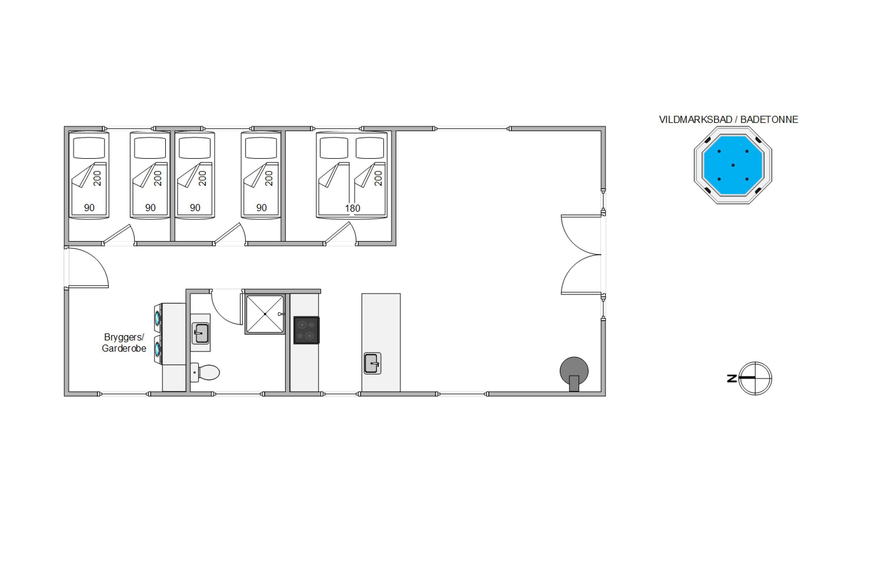 I træder som det første ind i feriehusets bryggers, hvor der blandt andet er vaskemaskine, tørretumbler og en god garderobe. Herefter kommer fordelingsgangen, hvorfra I har adgang til de 3 soveværelser mod øst og badeværelse mod vest. Endeligt kommer I til sommerhusets hjerte, det åbne alrum, hvor det veludstyrede køkken, spiseafdelingen og stuen er slået sammen til ét hyggeligt fællesrum.