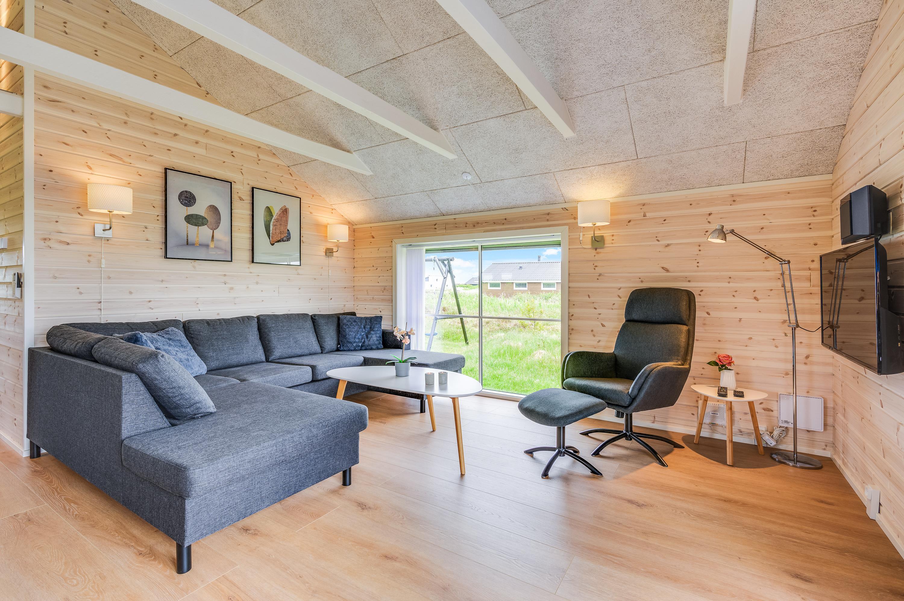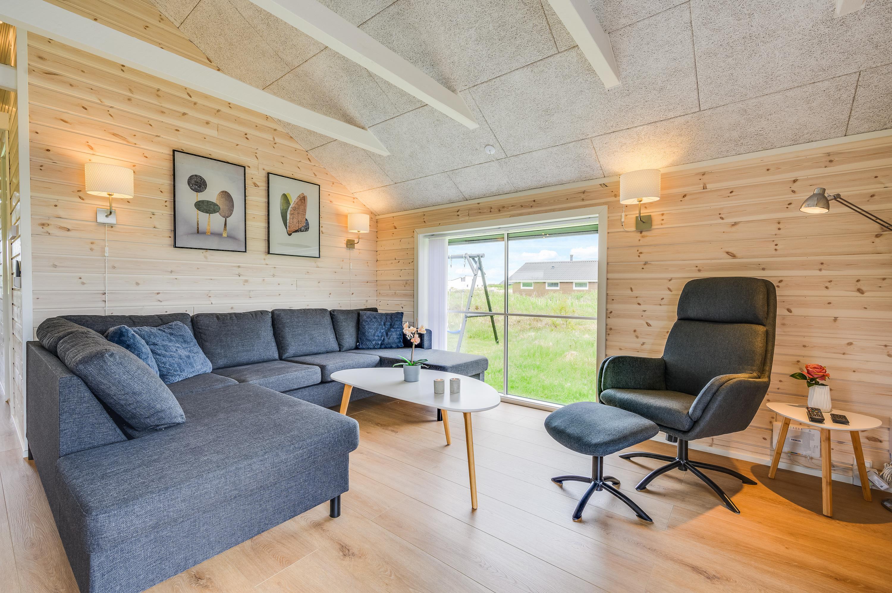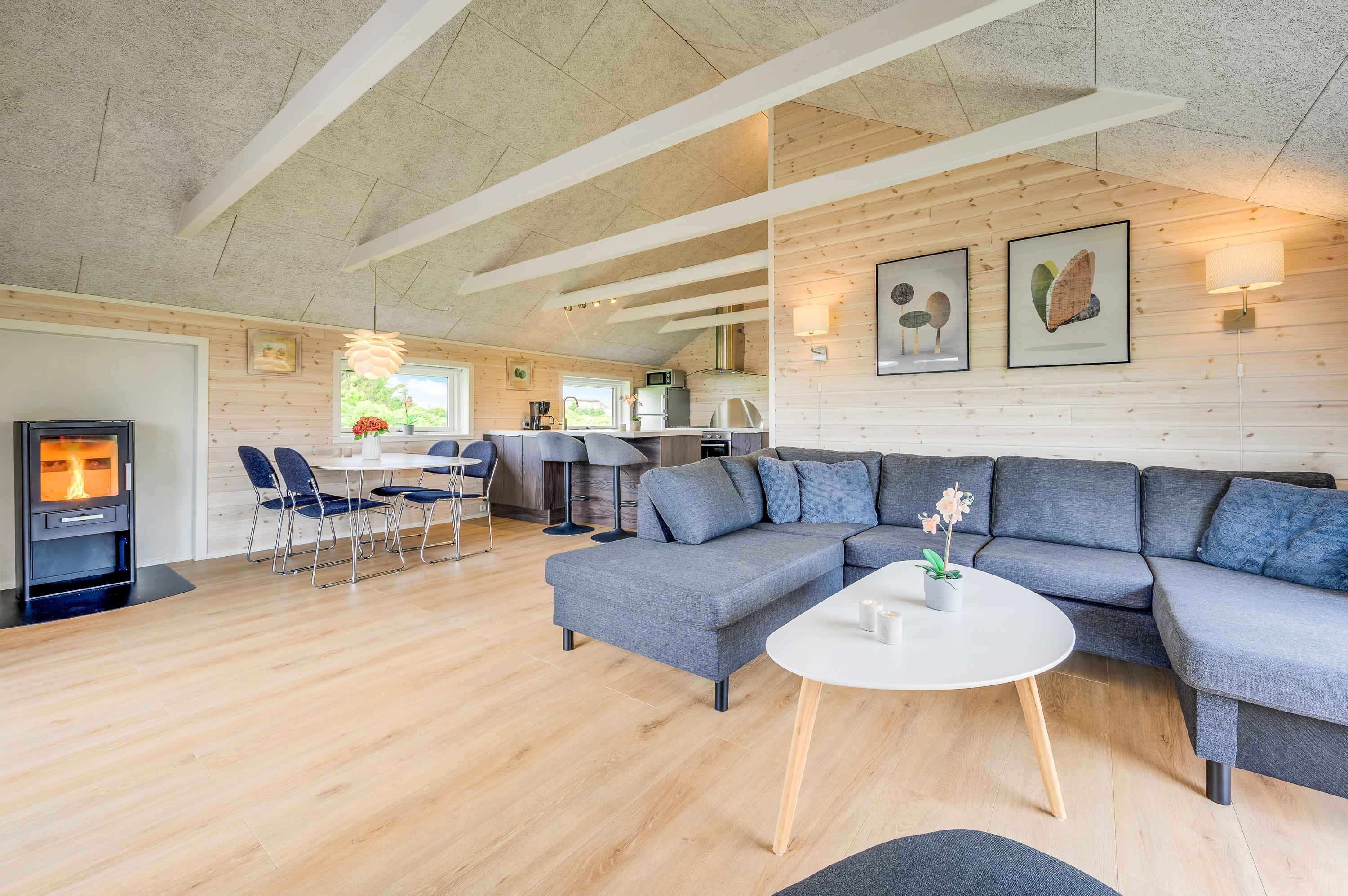 Fra alrummet har I udsigt til den flotte natur gennem store vinduesfronter på alle sider. I hjørnet står brændeovnen, som med sin knitrende ild altid er garanti for god feriestemning – både på en regnfuld dag med kortspil rundt om spisebordet og på en sen aften, hvor der slappes af på sofaen med en god bog og et glas rødvin.