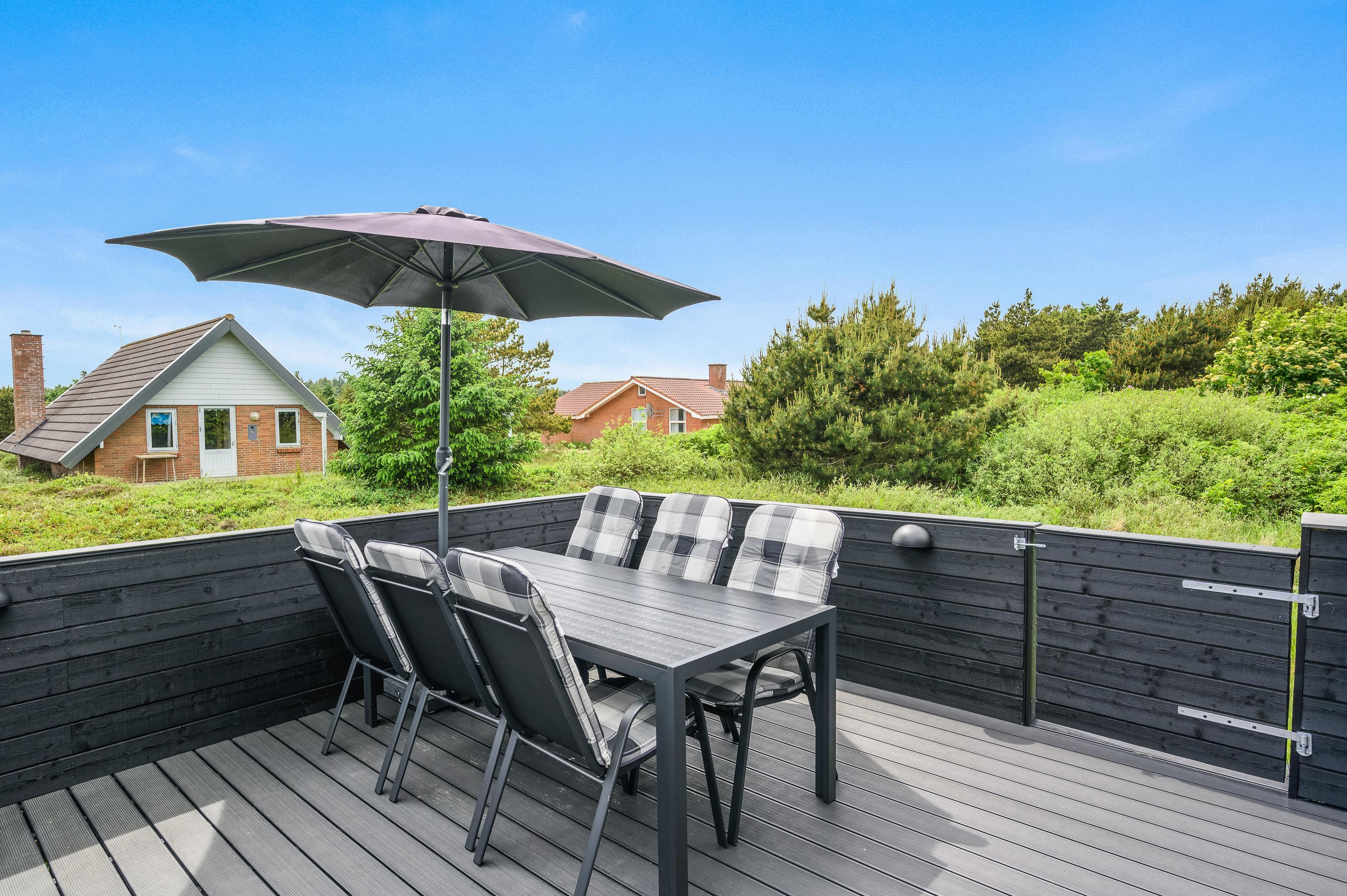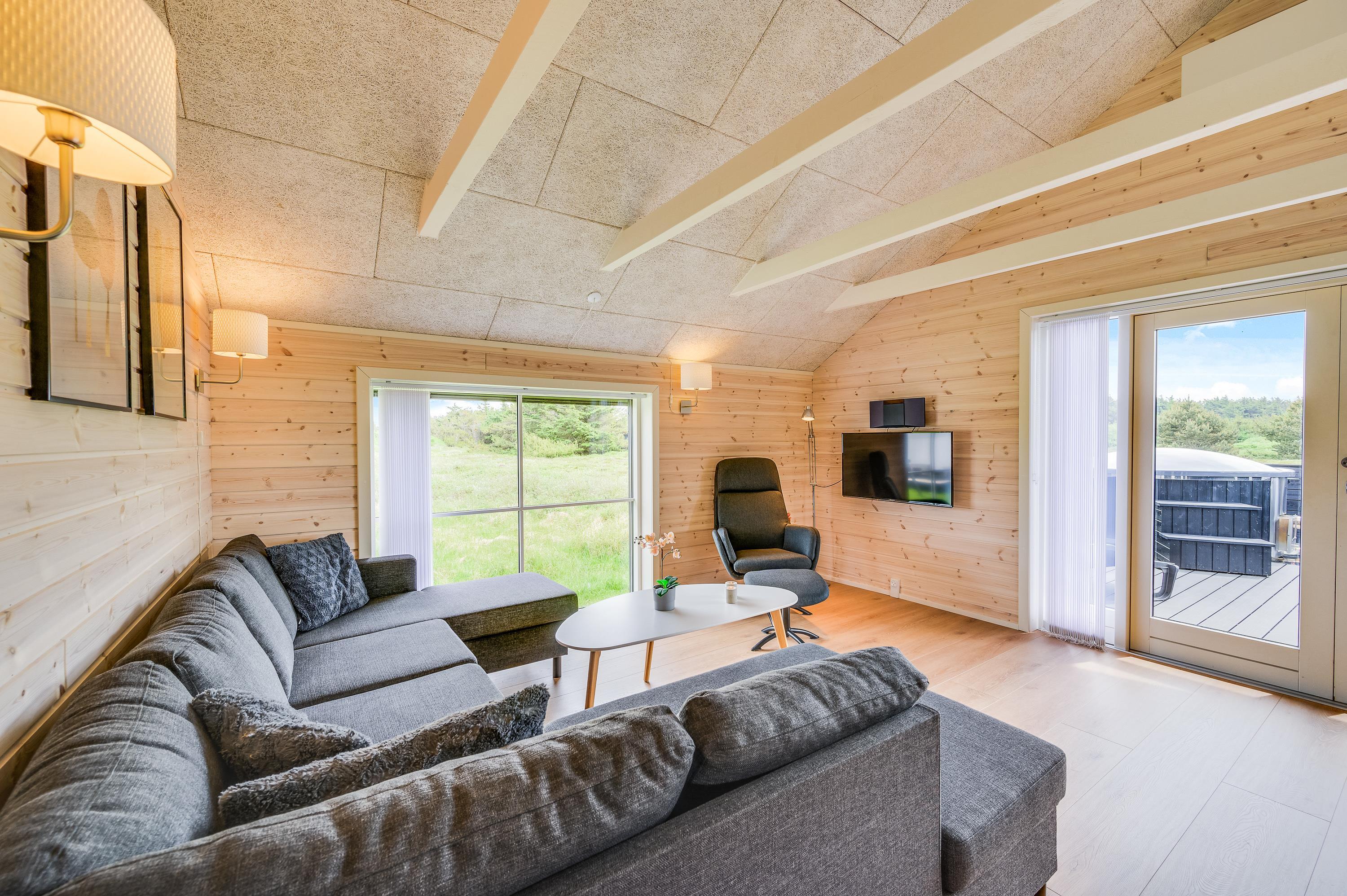 Fra stuen kommer I ud på feriehusets overdækkede terrasse, der er helt lukket af. Her finder I også et af feriens højdepunkter, det store vildmarksbad. En afslappende stund i det varme boblebad, mens fuglene kvidrer eller vinden rusker i trætoppene, er velvære på højt plan.
