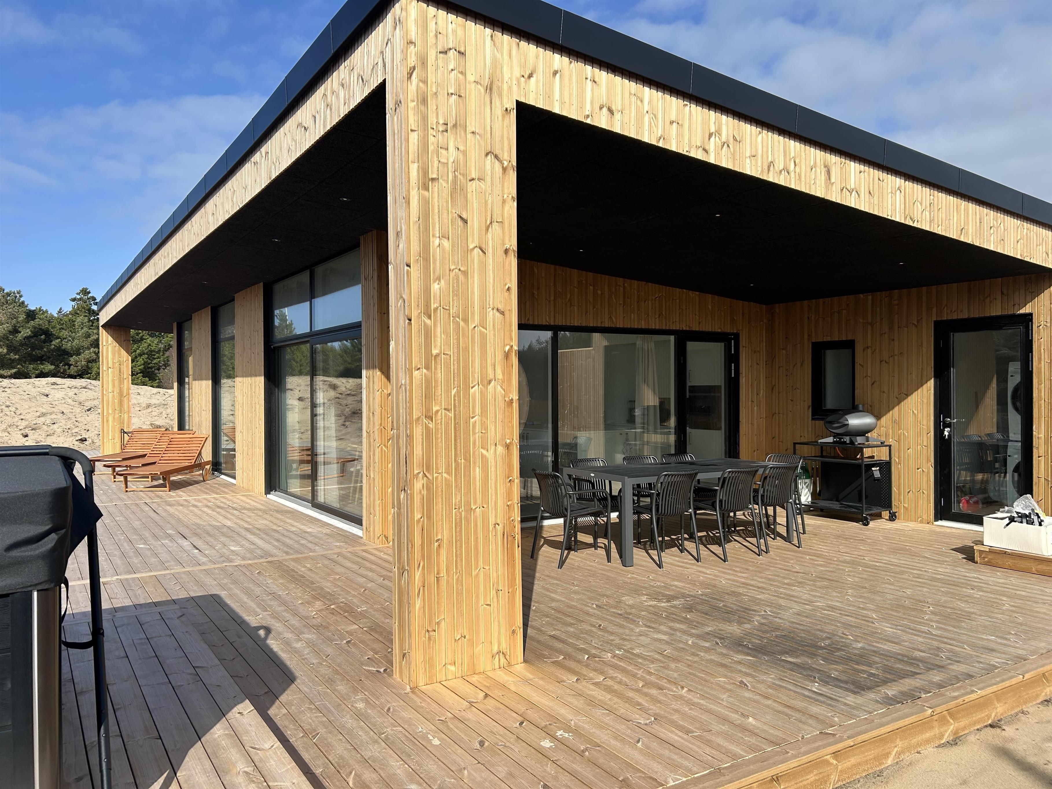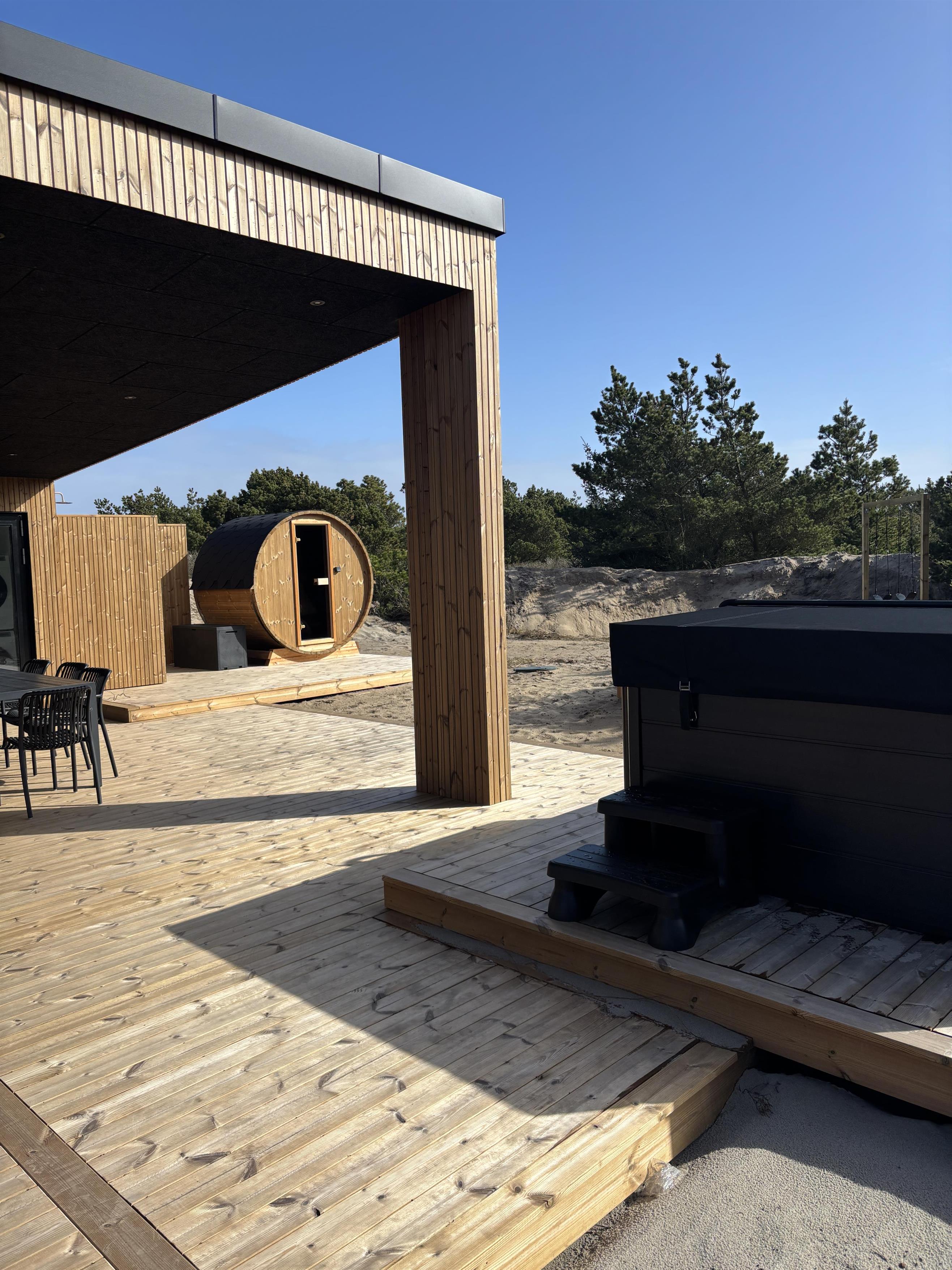 Udearealet lægger op til masser af afslapning og gode stunder. På den afskærmede og overdækkede terrasse kan I sidde i læ og nyde de komfortable havemøbler, hvor I kan spise eller bare slappe af, alt imens I nyder den omkringliggende natur. På terrassen finder I også nogle af husets højdepunkter, da I blandt andet kan tage en tur i det lækre udespa. Wellnessfølelsen suppleres af en udendørs sauna og en udendørs bruser – perfekt til at afrunde dagen. For de små gæster er der desuden en gynge og en sandkasse. For at undgå frostskader kan udendørsbruseren kun benyttes fra april til november.