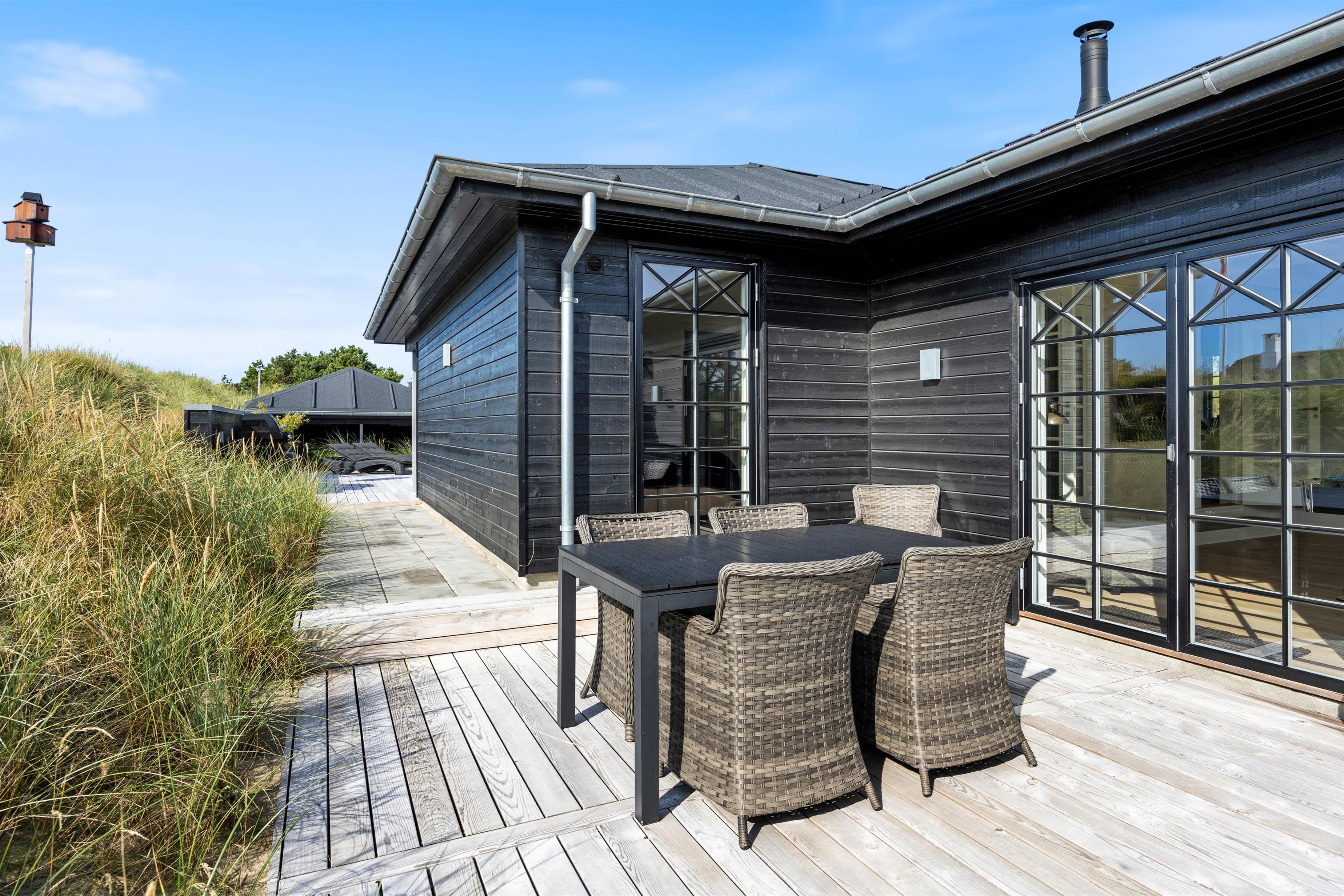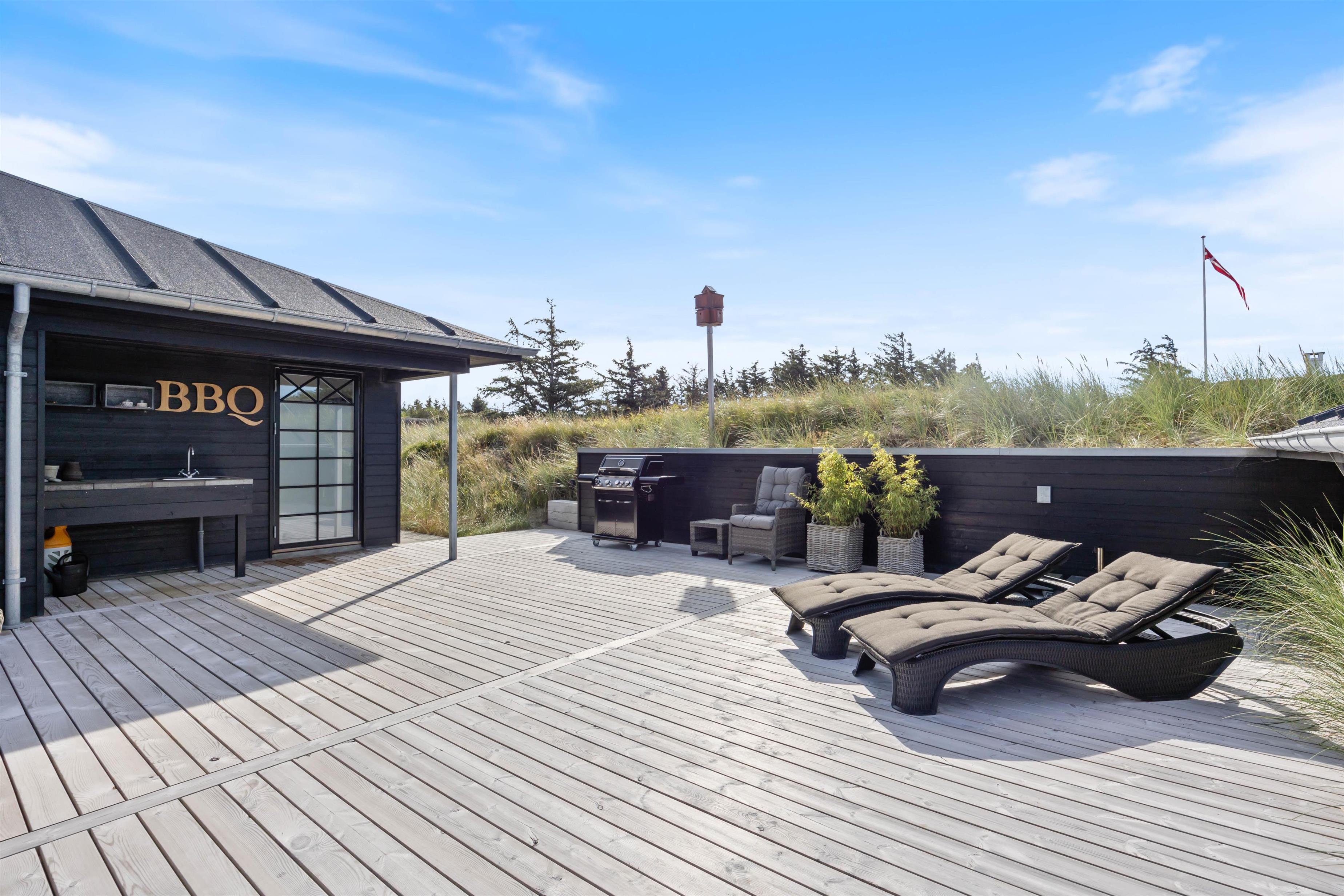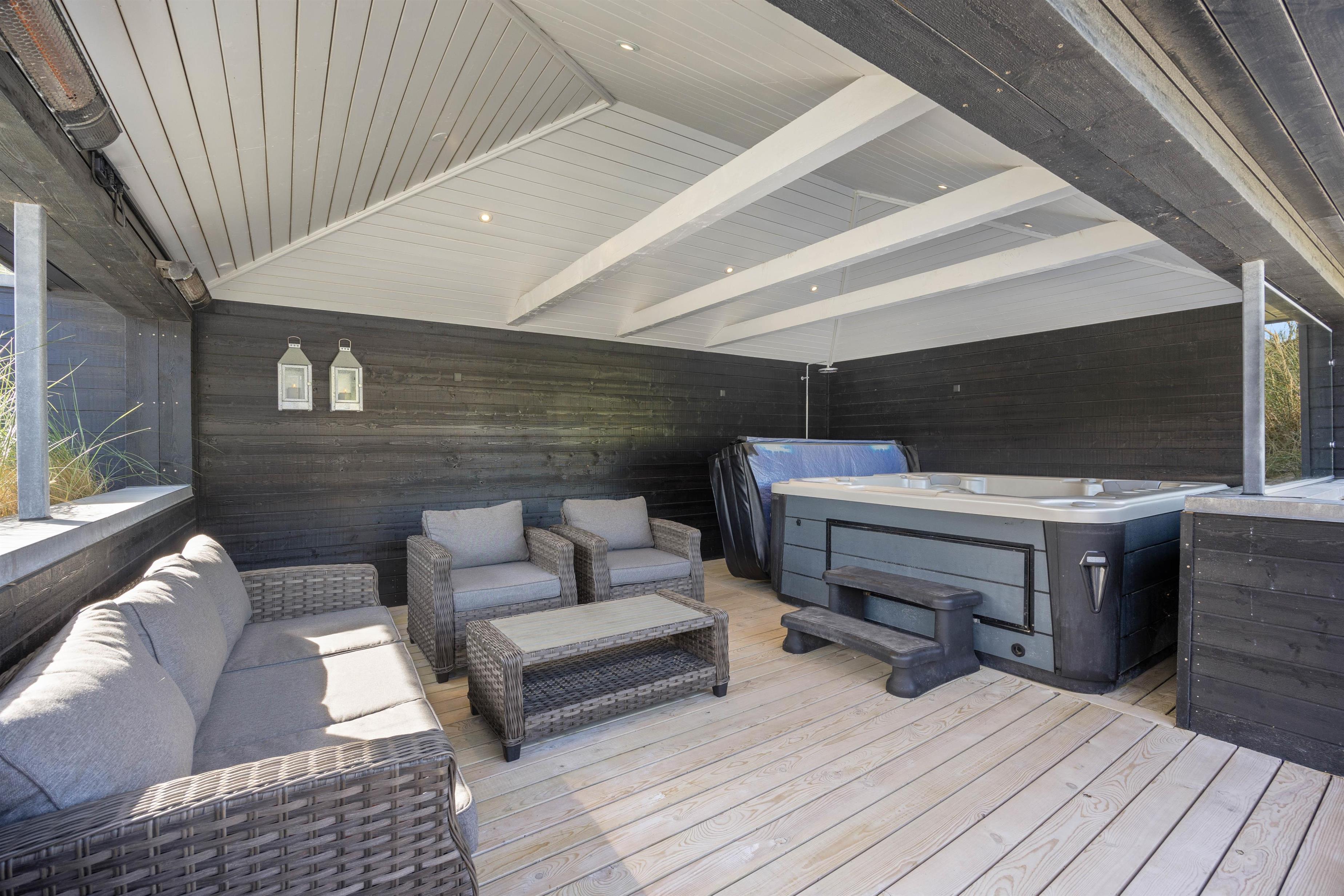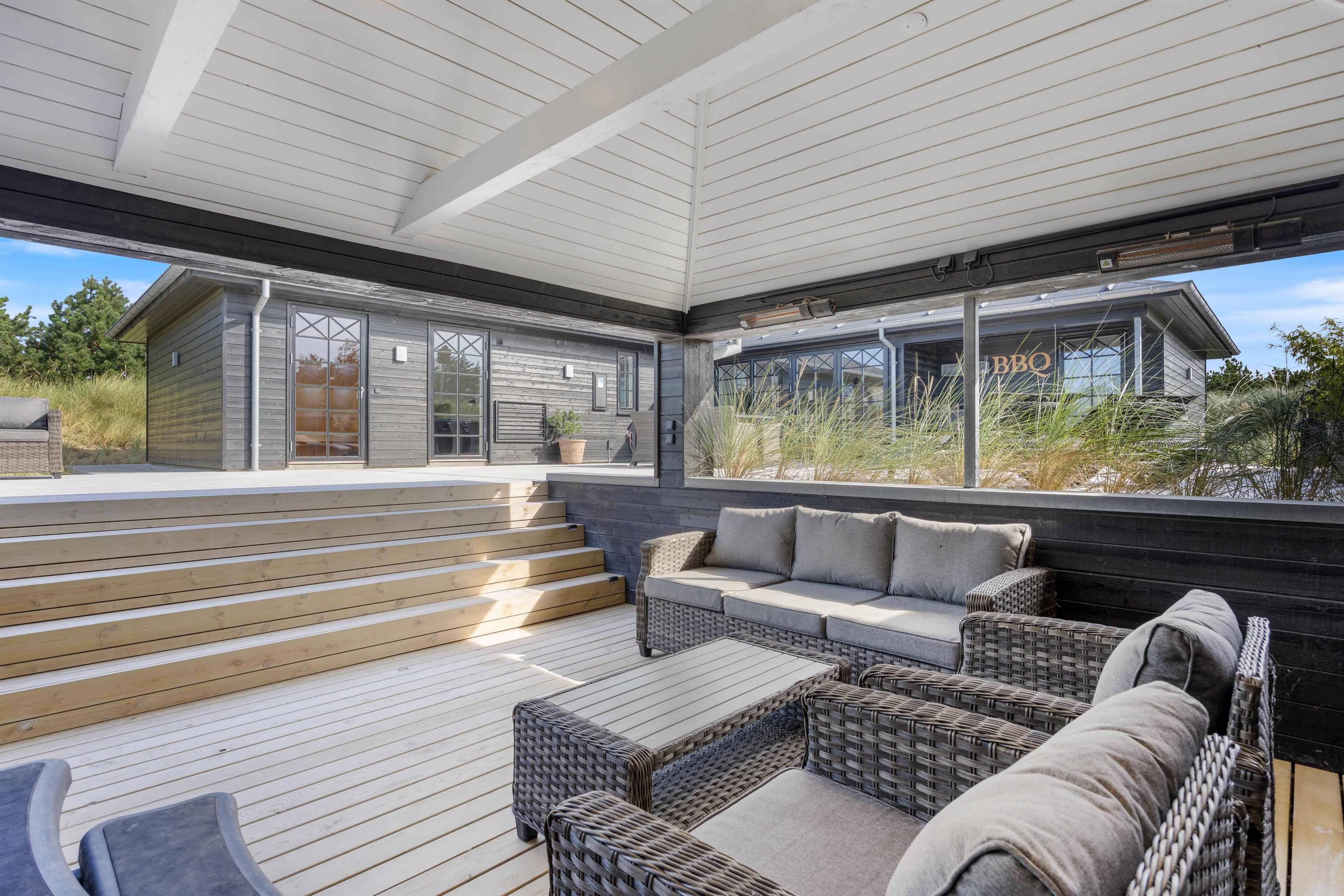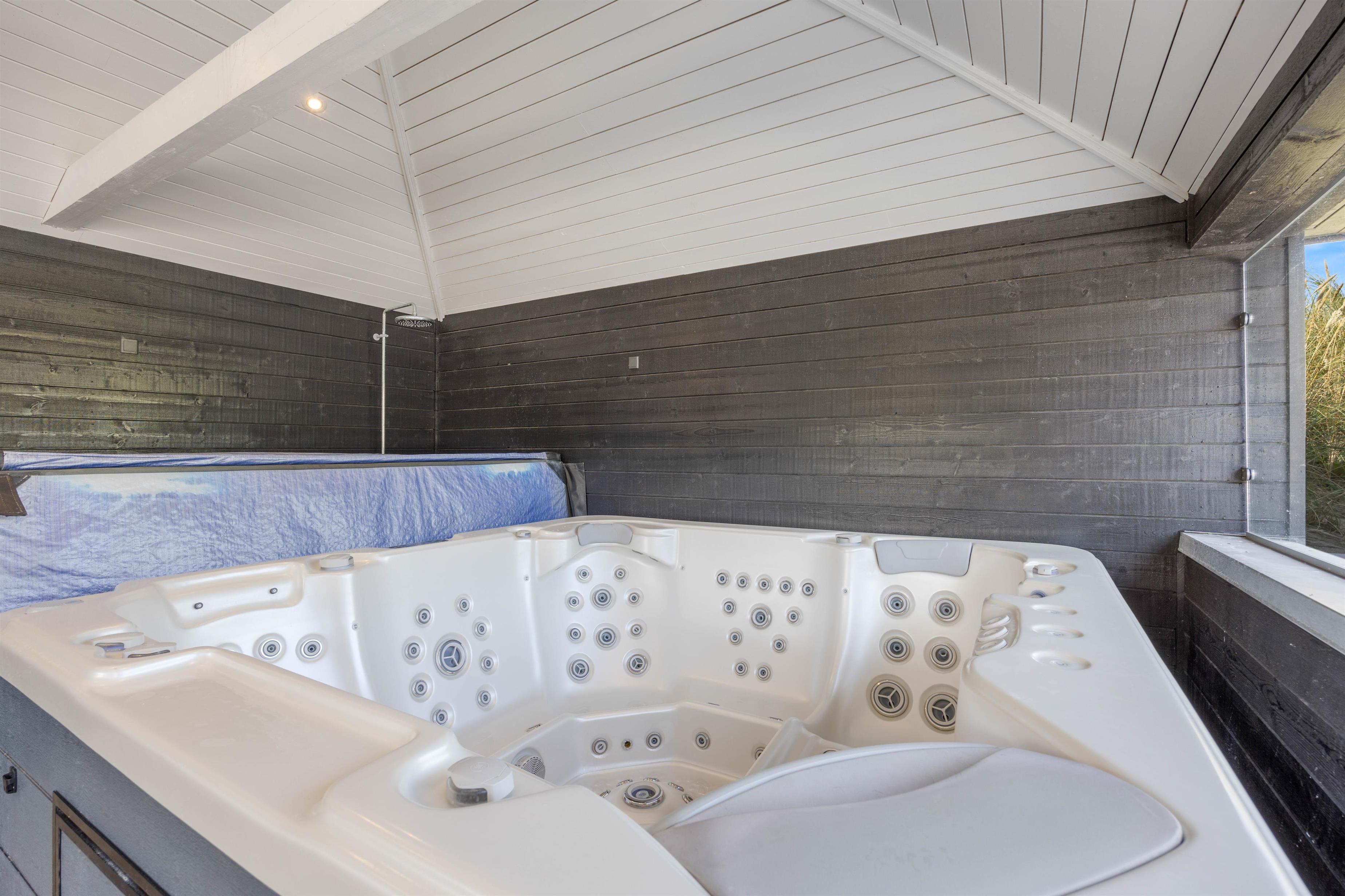 Sommerhusets nedsænkede terrasse er et højdepunkt i sig selv. Her er der for alvor lagt op til masser af hygge og afslapning i lækre omgivelser. På terrassen er der et udendørs spabad, som I kan læne jer tilbage i og nyde ferien - under aftenens stjernehimmel er det helt fantastisk. Derudover er der også en udebruser, I kan skylle jer under efter en tur på stranden. Udebruseren er tilgængelig i perioden fra april til november.