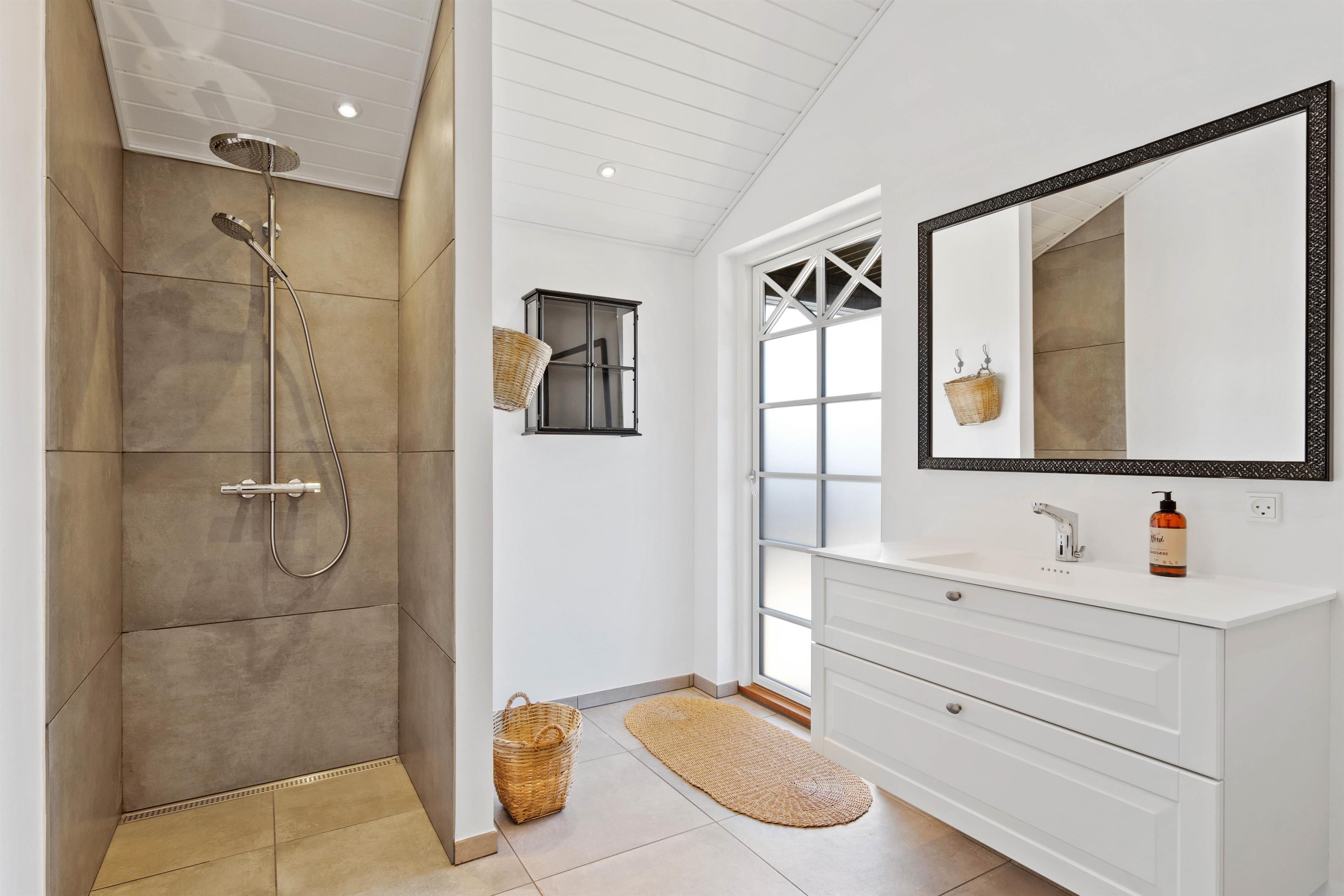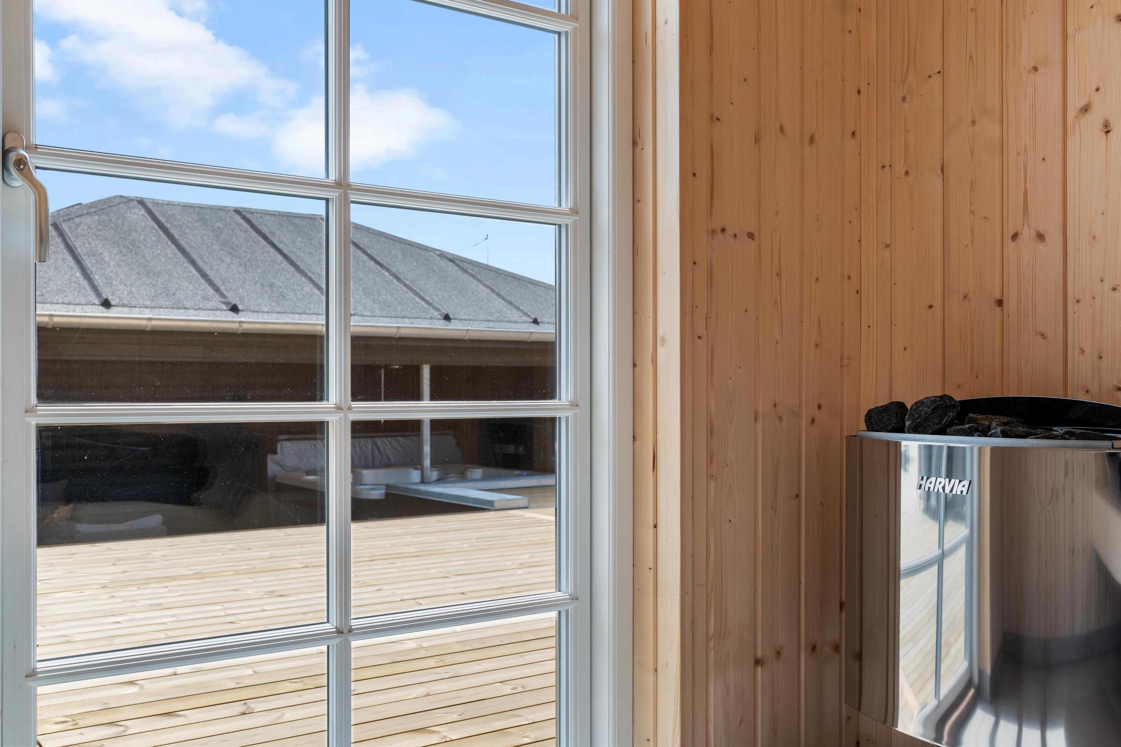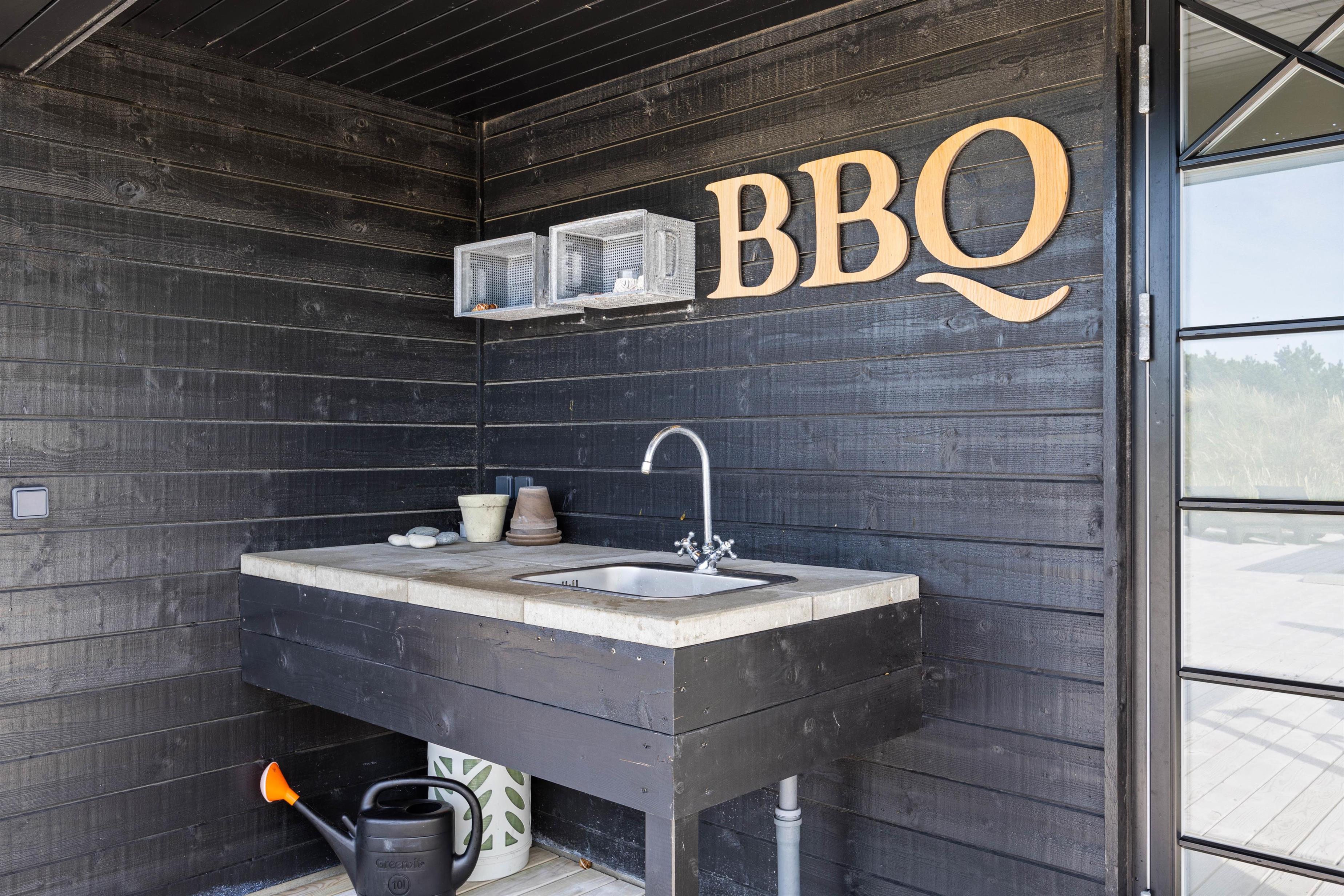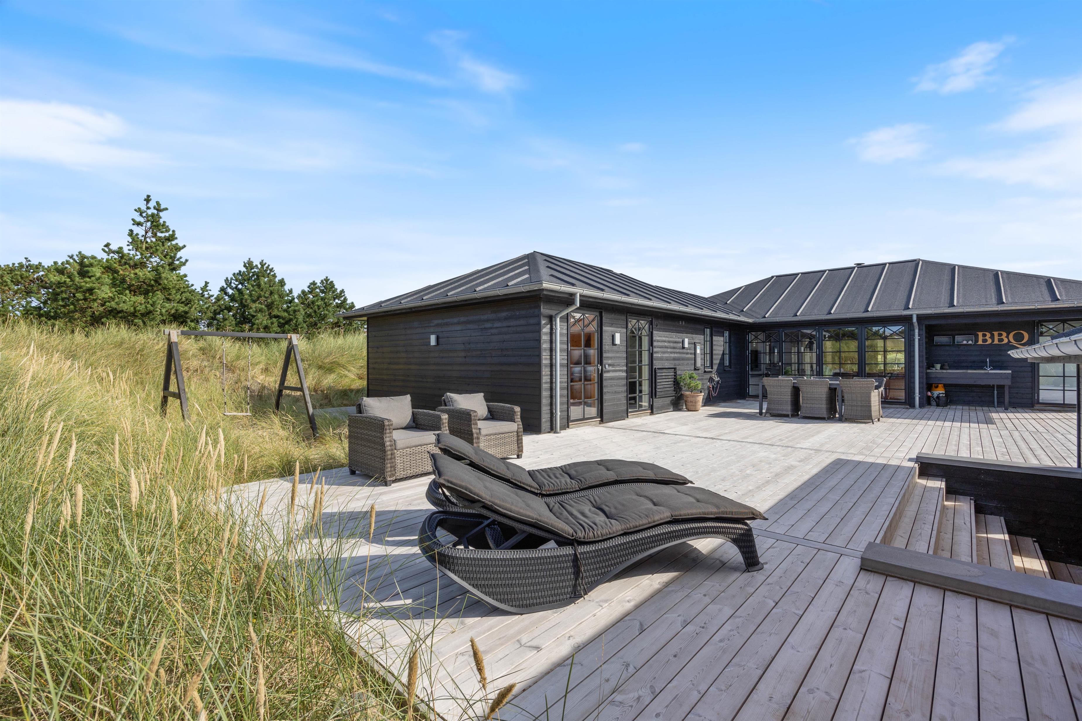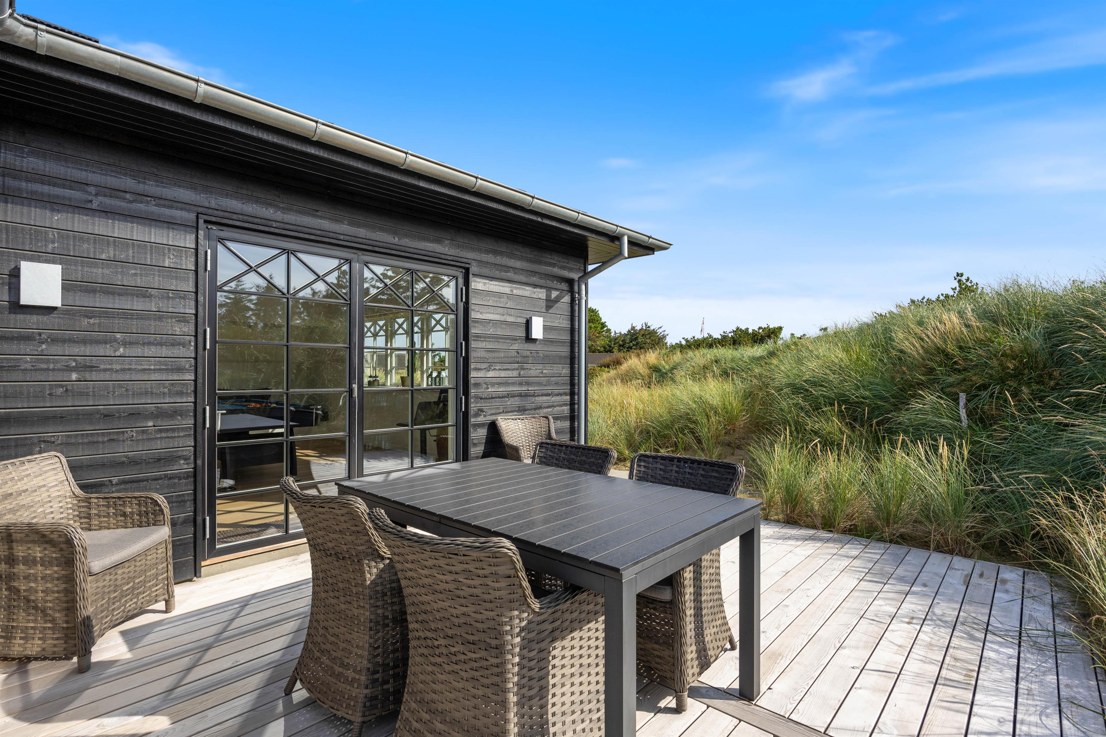 Sommerhusets nedsænkede terrasse er et højdepunkt i sig selv. Her er der for alvor lagt op til masser af hygge og afslapning i lækre omgivelser. På terrassen er der et udendørs spabad, som I kan læne jer tilbage i og nyde ferien - under aftenens stjernehimmel er det helt fantastisk. Derudover er der også en udebruser, I kan skylle jer under efter en tur på stranden. Udebruseren er tilgængelig i perioden fra april til november.