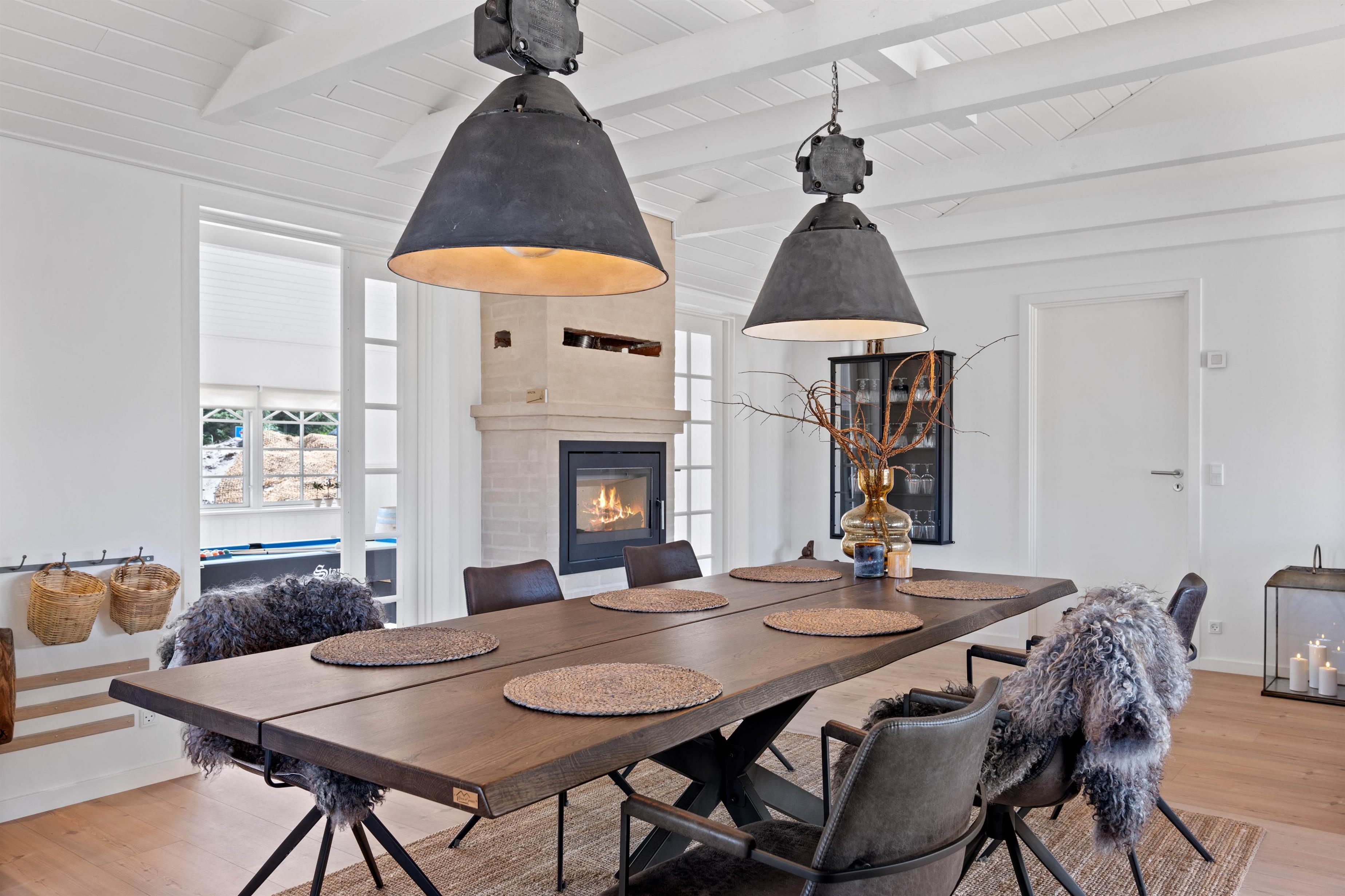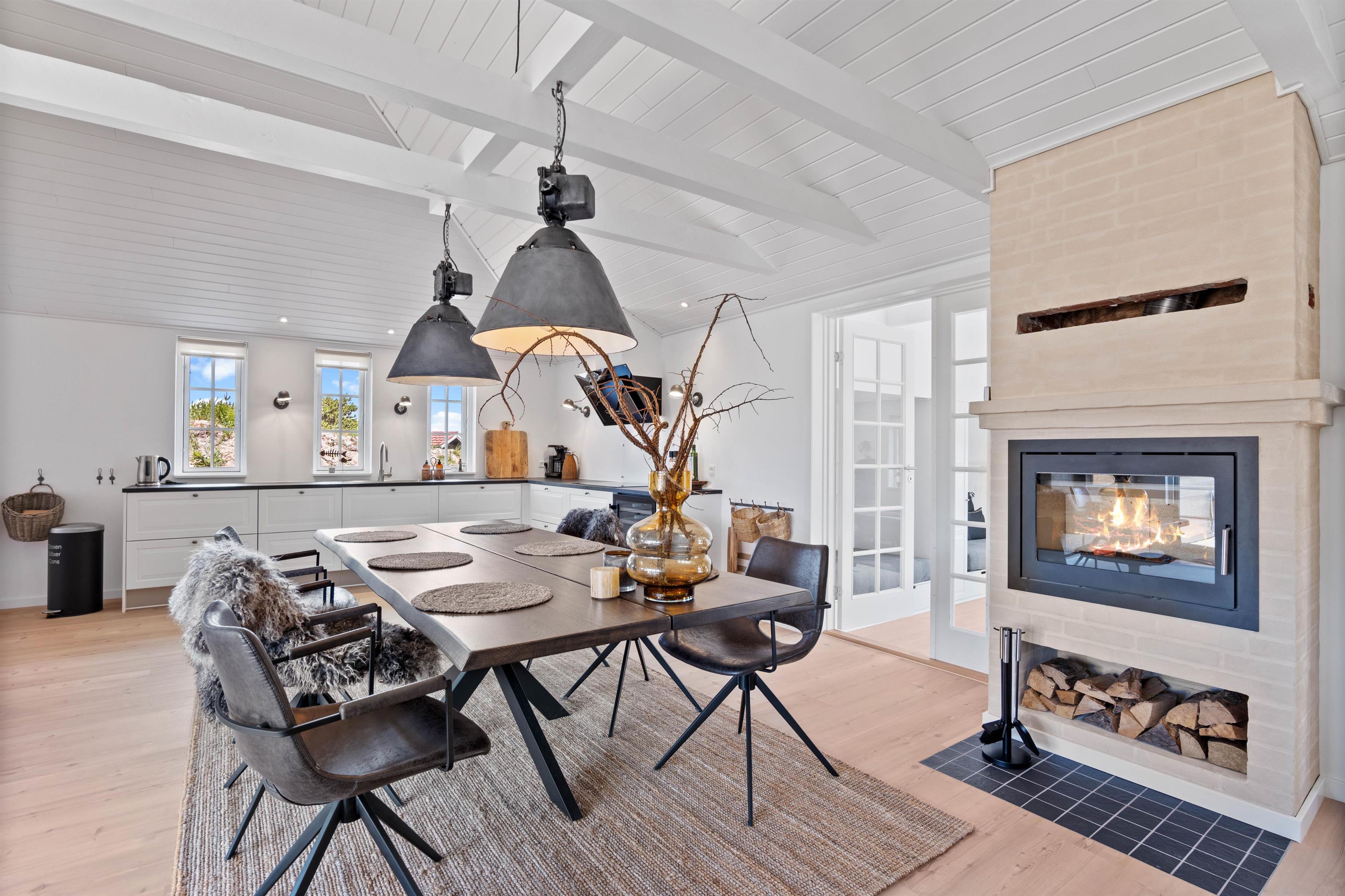 Også i både soveværelser og i stuen kan I få glæde af gulvvarme. Ellers opvarmes feriehuset af en energivenlig varmepumpe, der sørger for gode temperaturer uden høje omkostninger. Skal der skrues op for hyggen og varmen, kan I tænde op i pejseindsatsen.