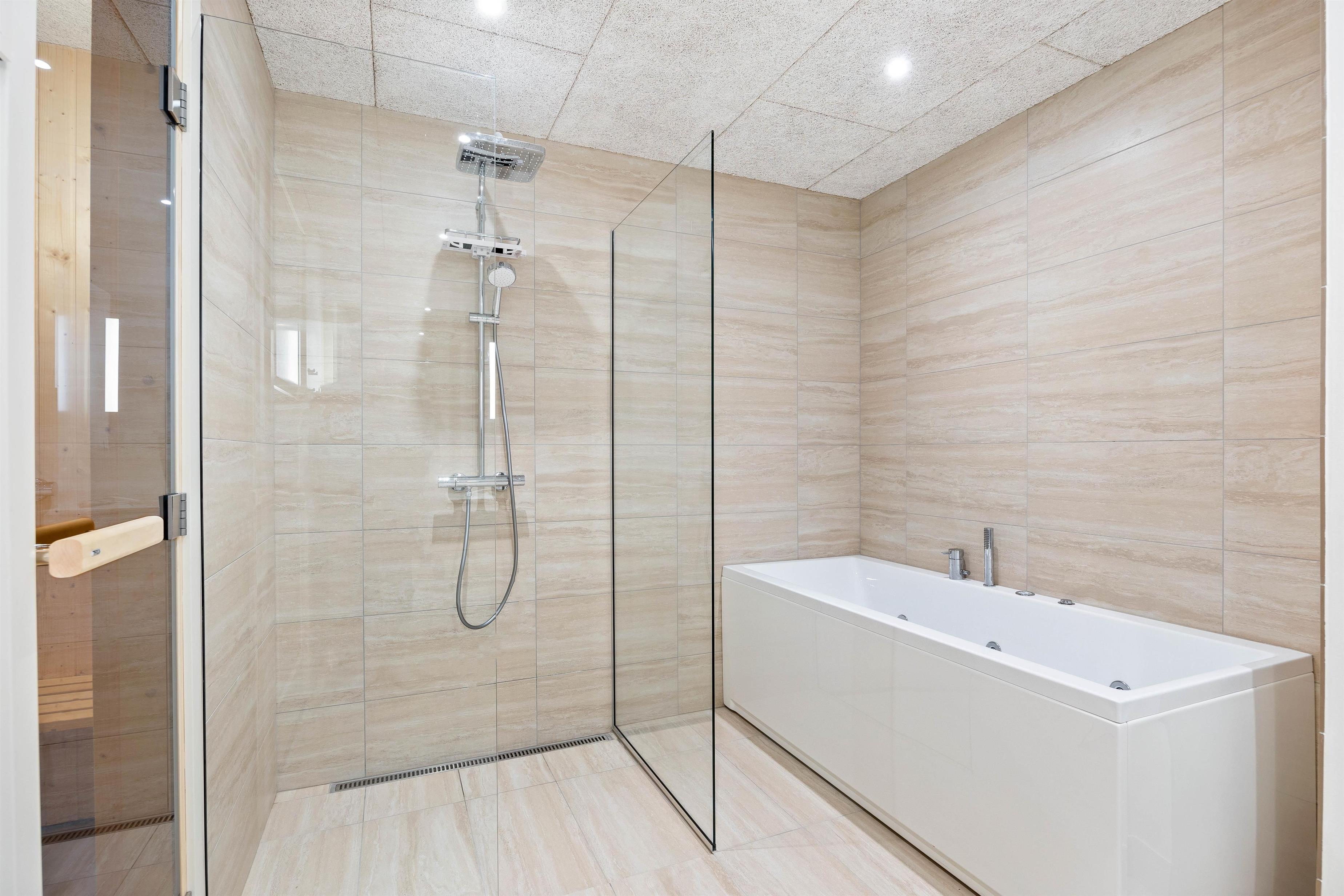 På øverste etage er der to soveværelser. Det ene værelse har en dobbeltseng, og det andet soveværelse har to enkeltsenge. På badeværelset finder I en vaskemaskine og tørretumbler. Efter en lang gåtur på stranden, kan I nyde en velfortjent pause i boblebadet og saunaen, så I kan slappe helt af.