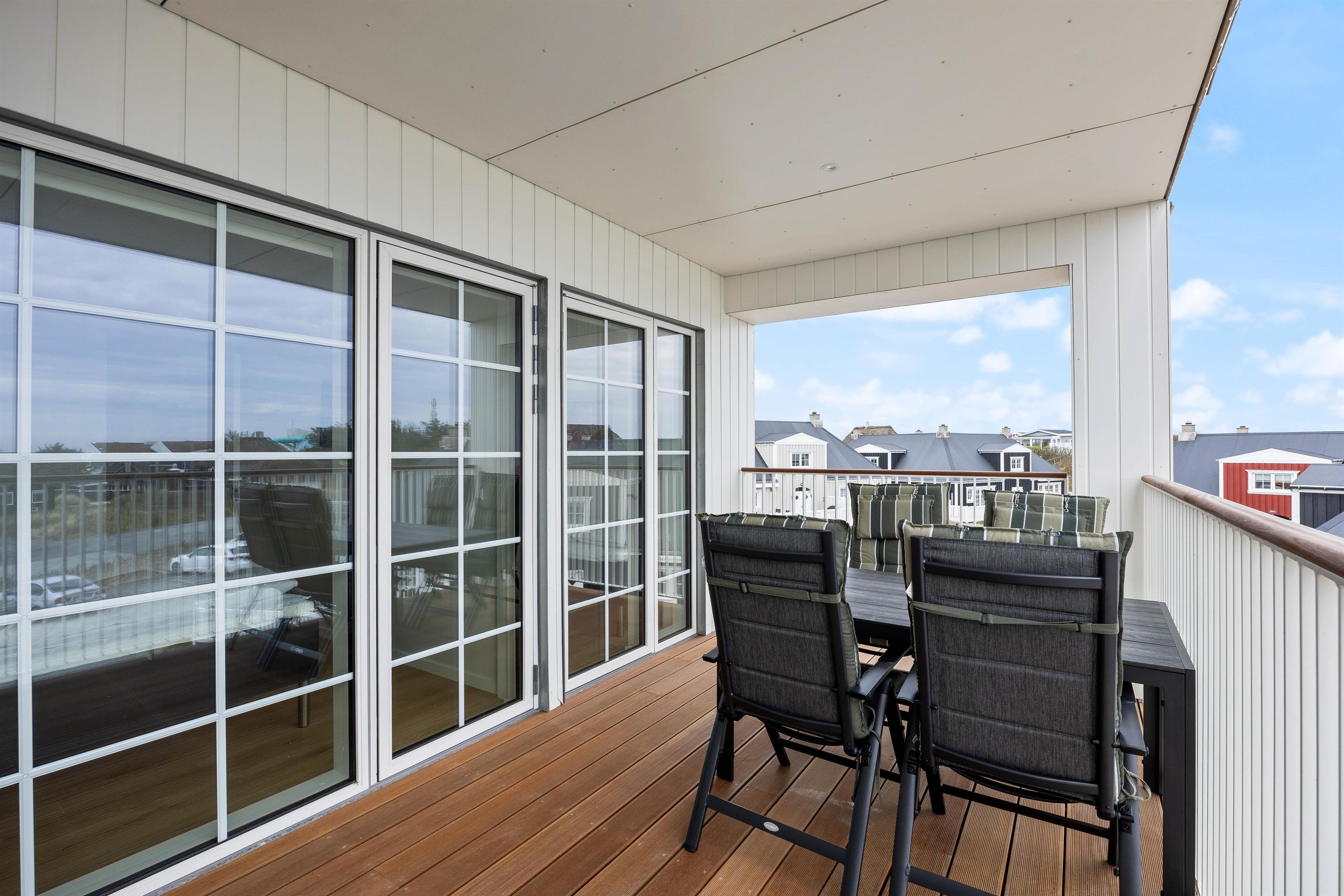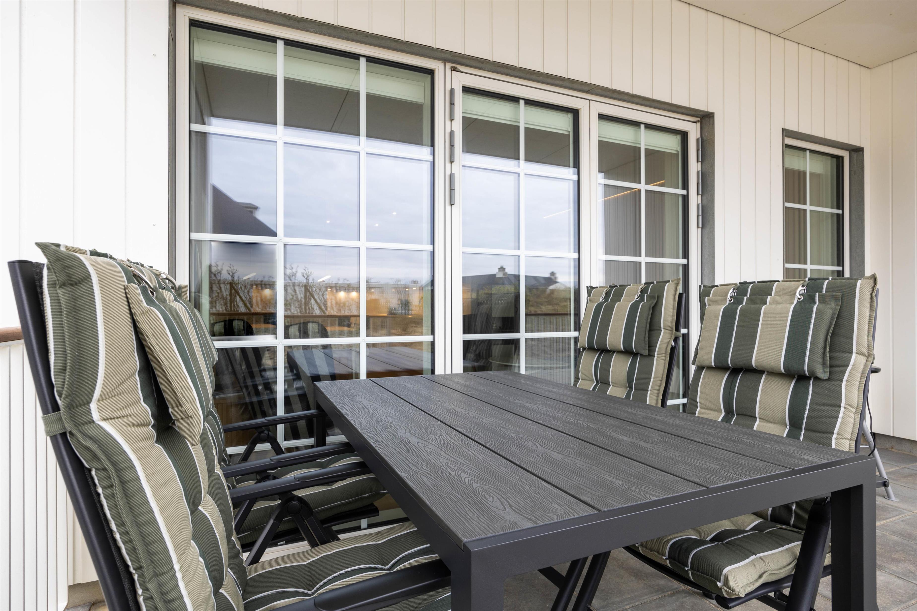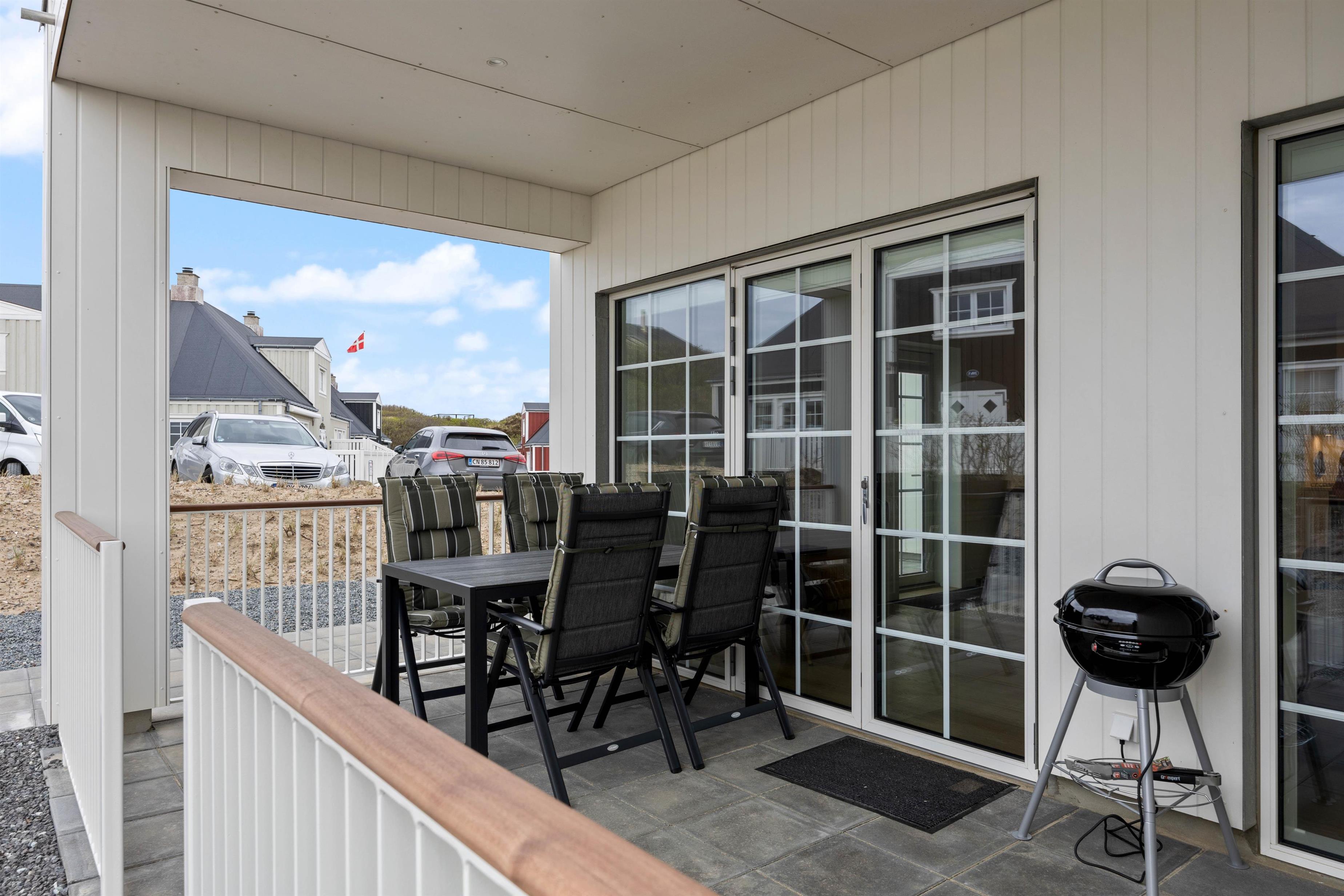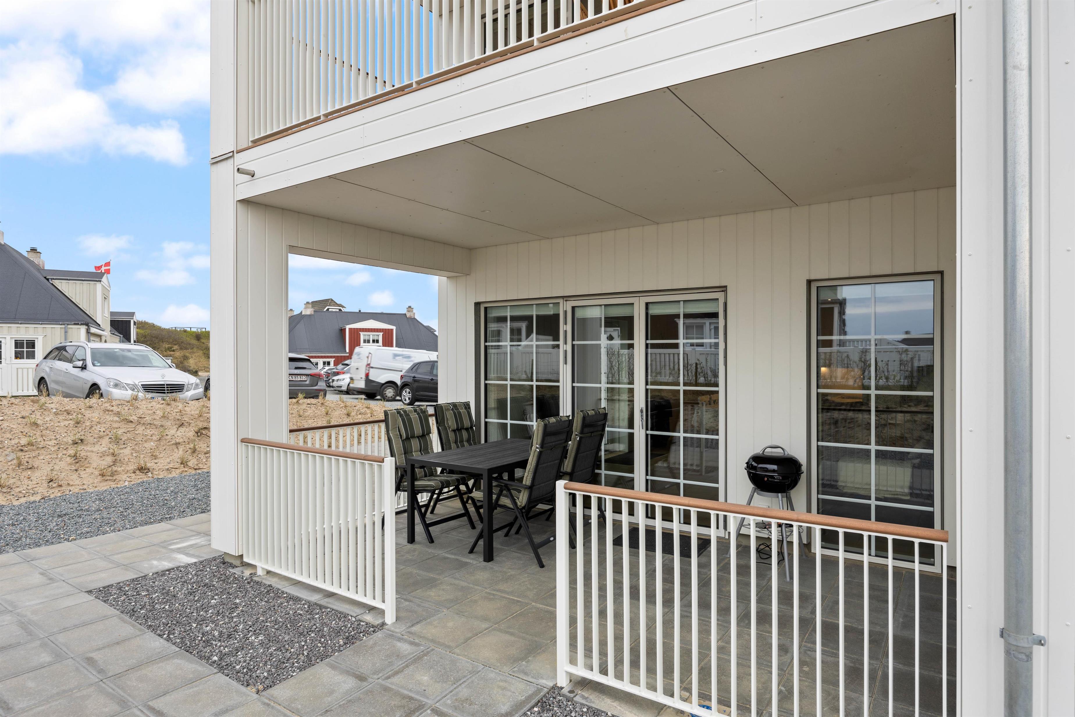 Uanset hvilken etage I befinder jer på, er der en overdækket og afskærmet terrasse. Afhængigt af tidspunktet på dagen kan I se solopgangen eller solnedgangen fra jeres terrasser. På begge terrasser er der havemøbler, og på den nederste terrasse finder I også en elektrisk grill. Hvad er bedre end at grille et godt måltid på en varm sommeraften, nyde en kold drink og høre bølgernes brusen i baggrunden?