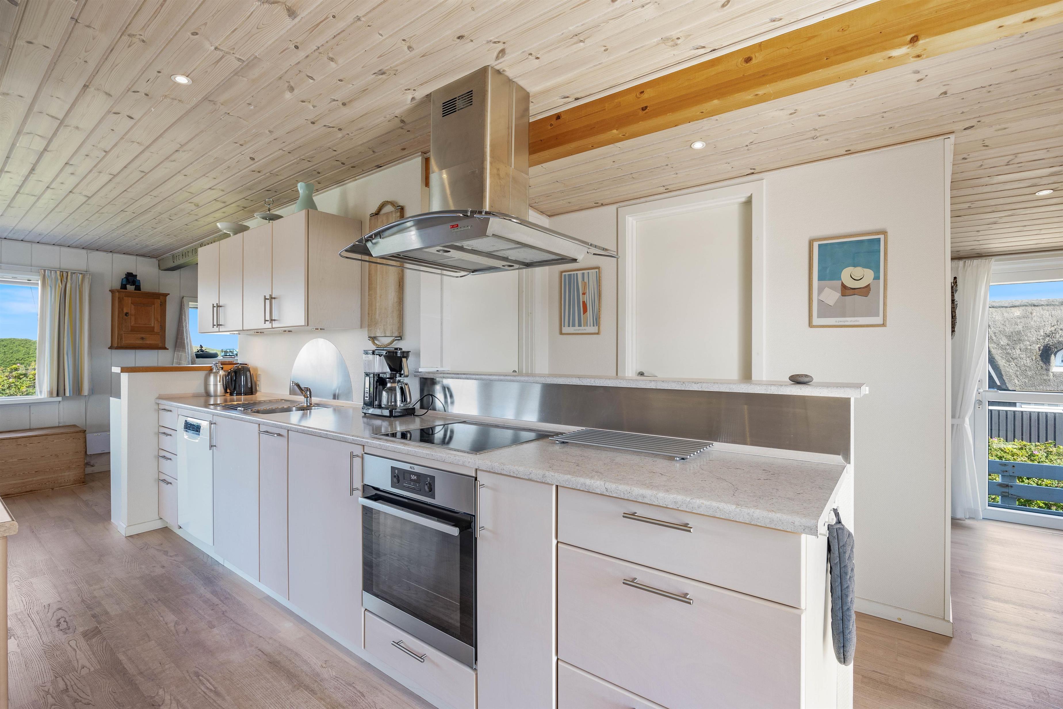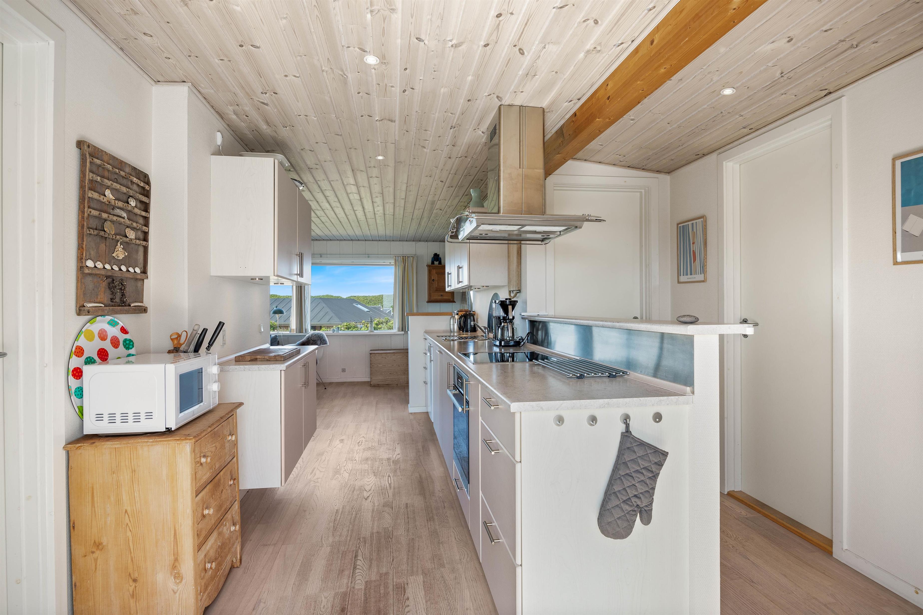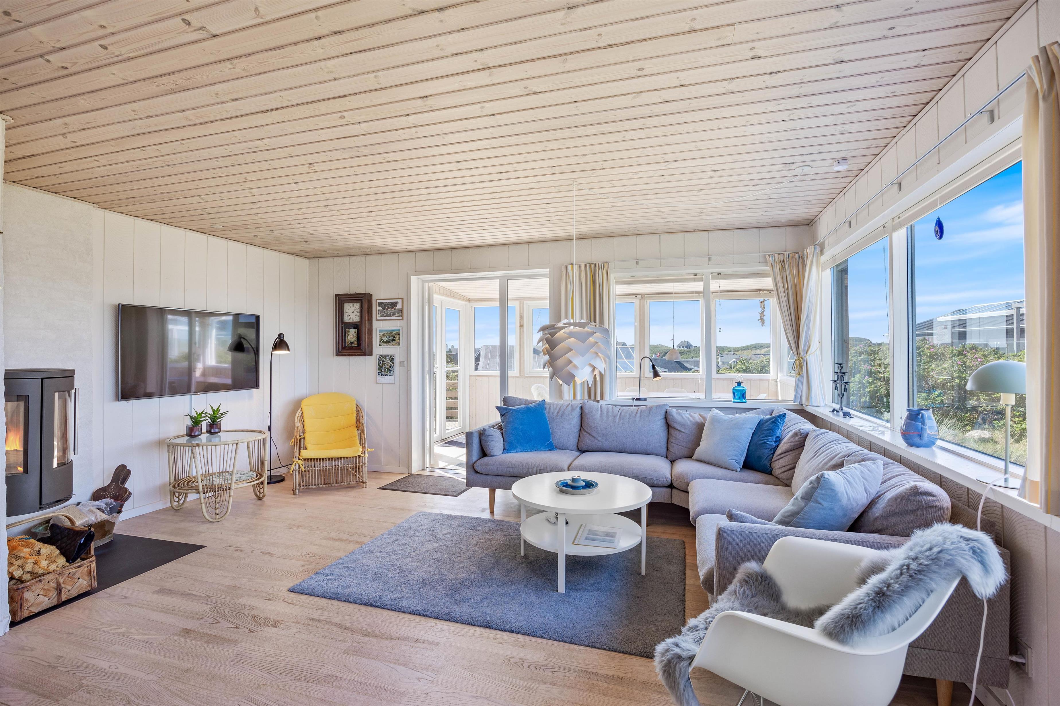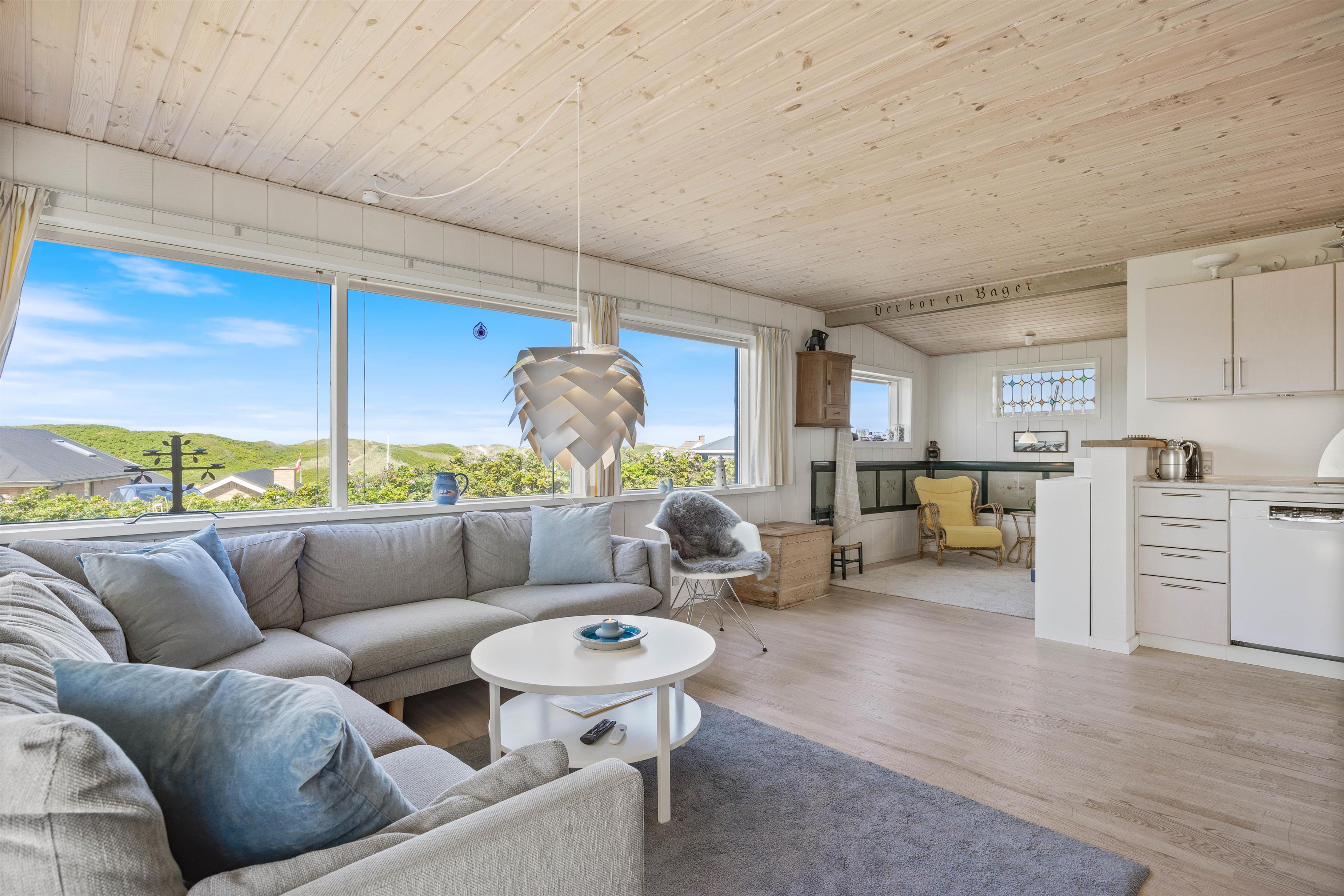 Den hyggelige stue og det veludstyrede køkken ligger i åben forbindelse med hinanden, og der er masser af små kroge, hvor I kan sætte jer til rette med en friskbrygget kop kaffe og læse en god bog eller nyde den flotte udsigt til klitlandskabet gennem vinduerne, mens brændeovnen knitrer i baggrunden.