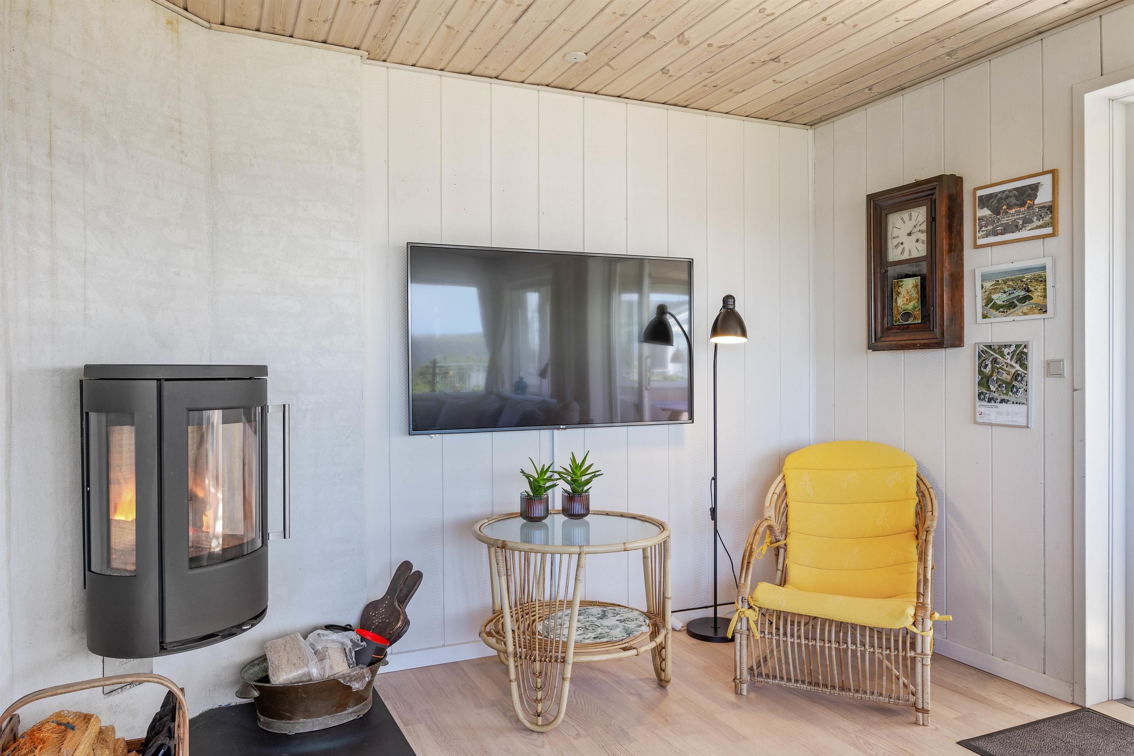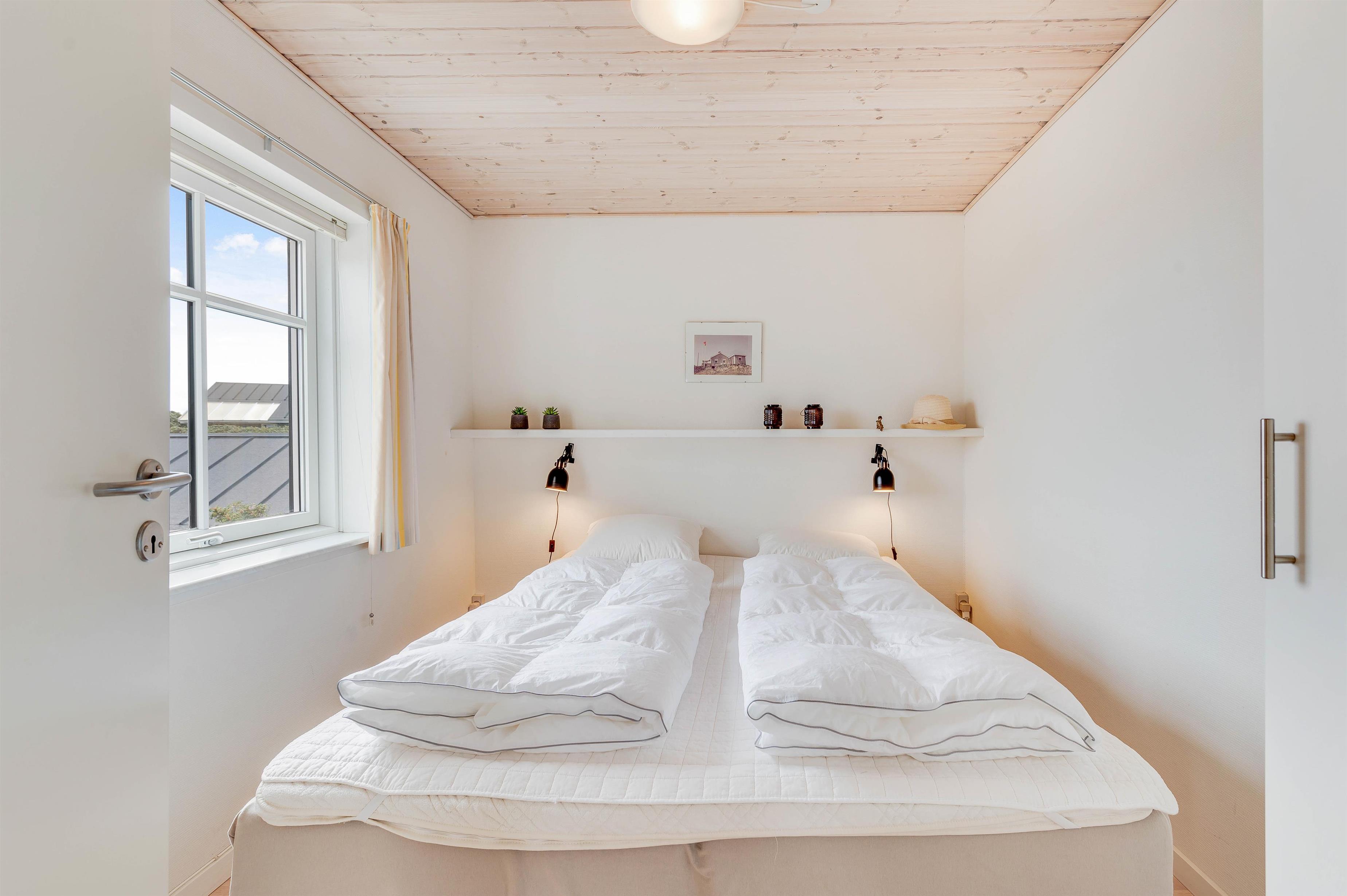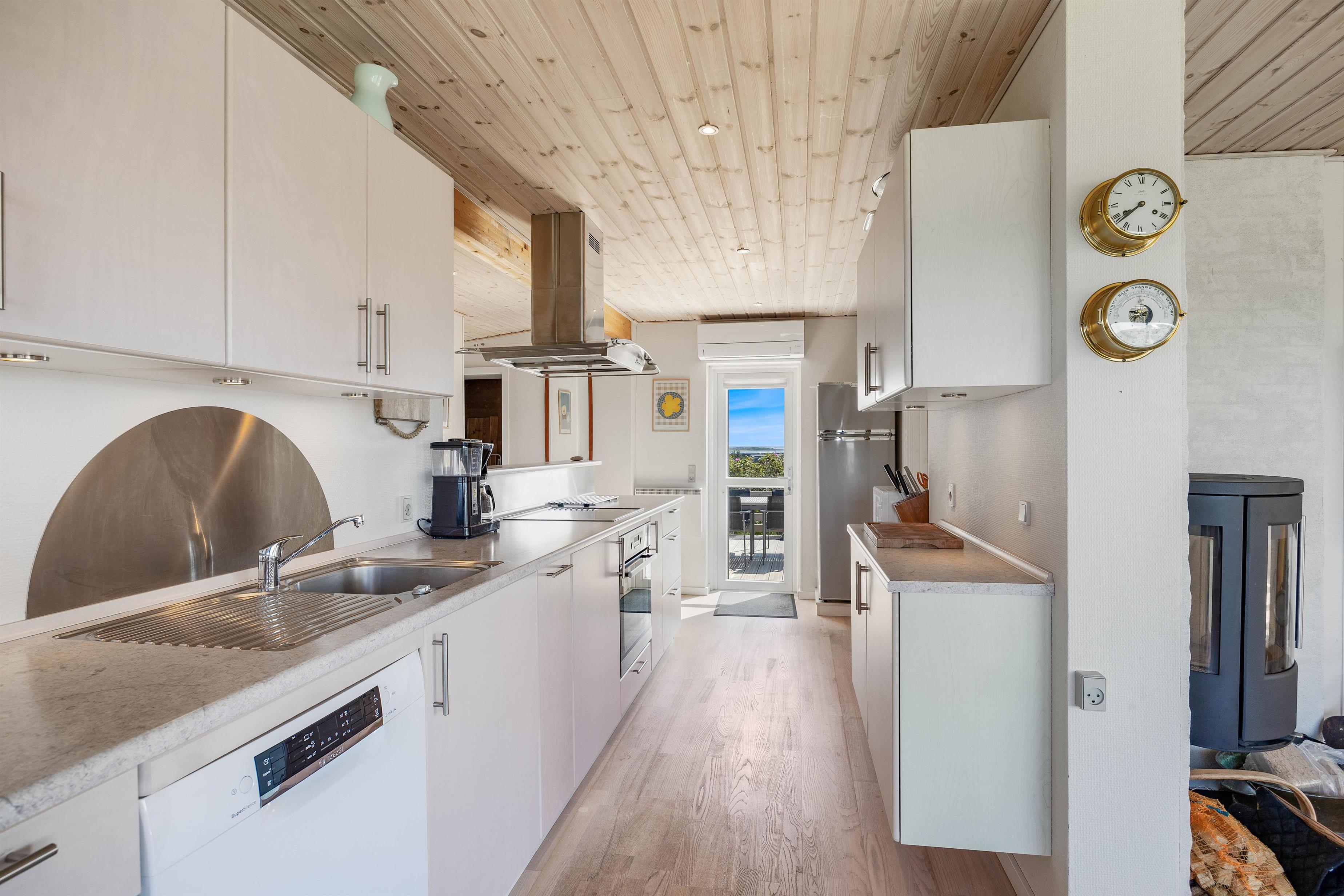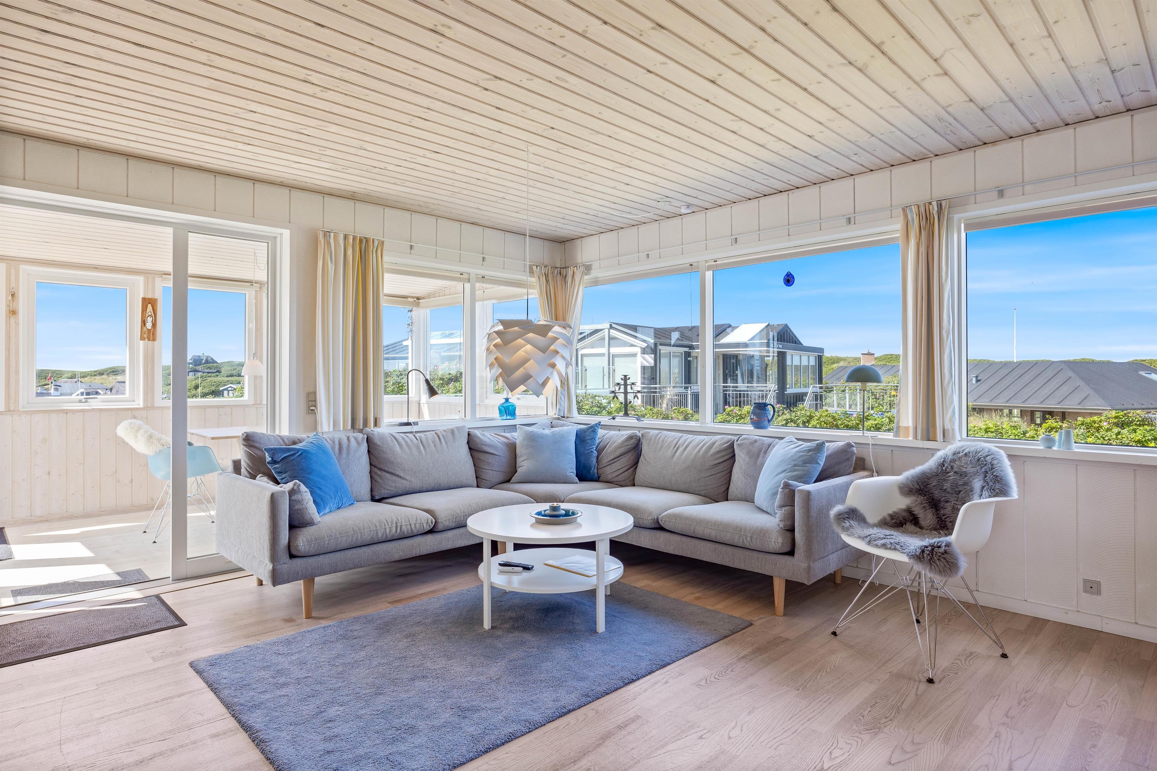 Den hyggelige stue og det veludstyrede køkken ligger i åben forbindelse med hinanden, og der er masser af små kroge, hvor I kan sætte jer til rette med en friskbrygget kop kaffe og læse en god bog eller nyde den flotte udsigt til klitlandskabet gennem vinduerne, mens brændeovnen knitrer i baggrunden.
