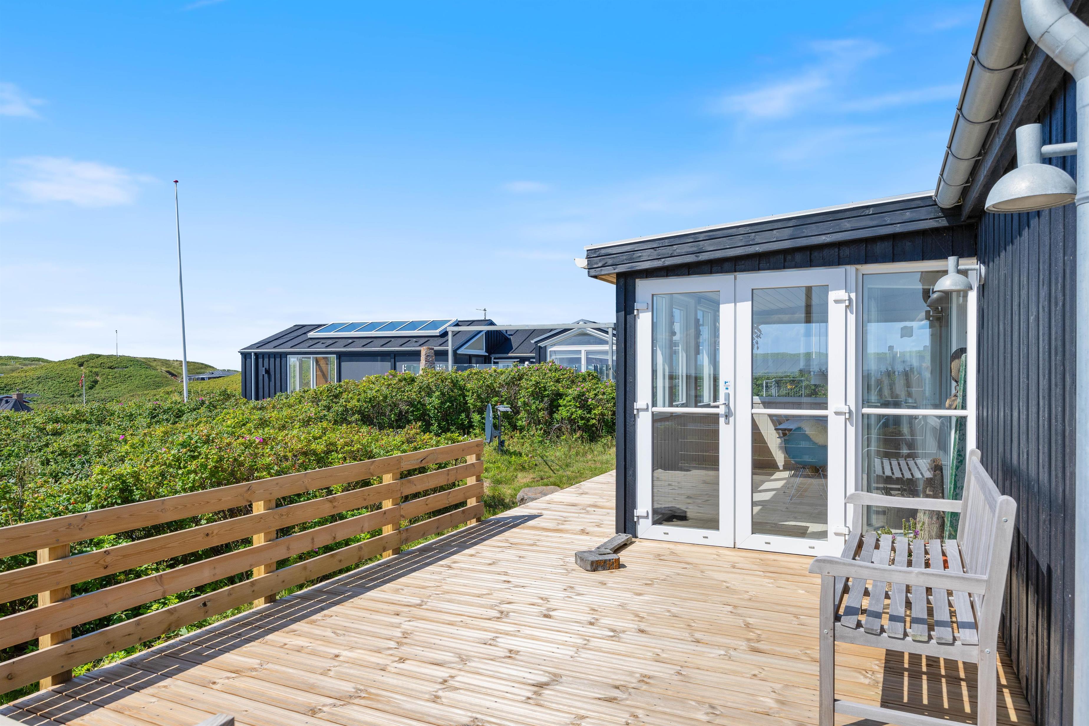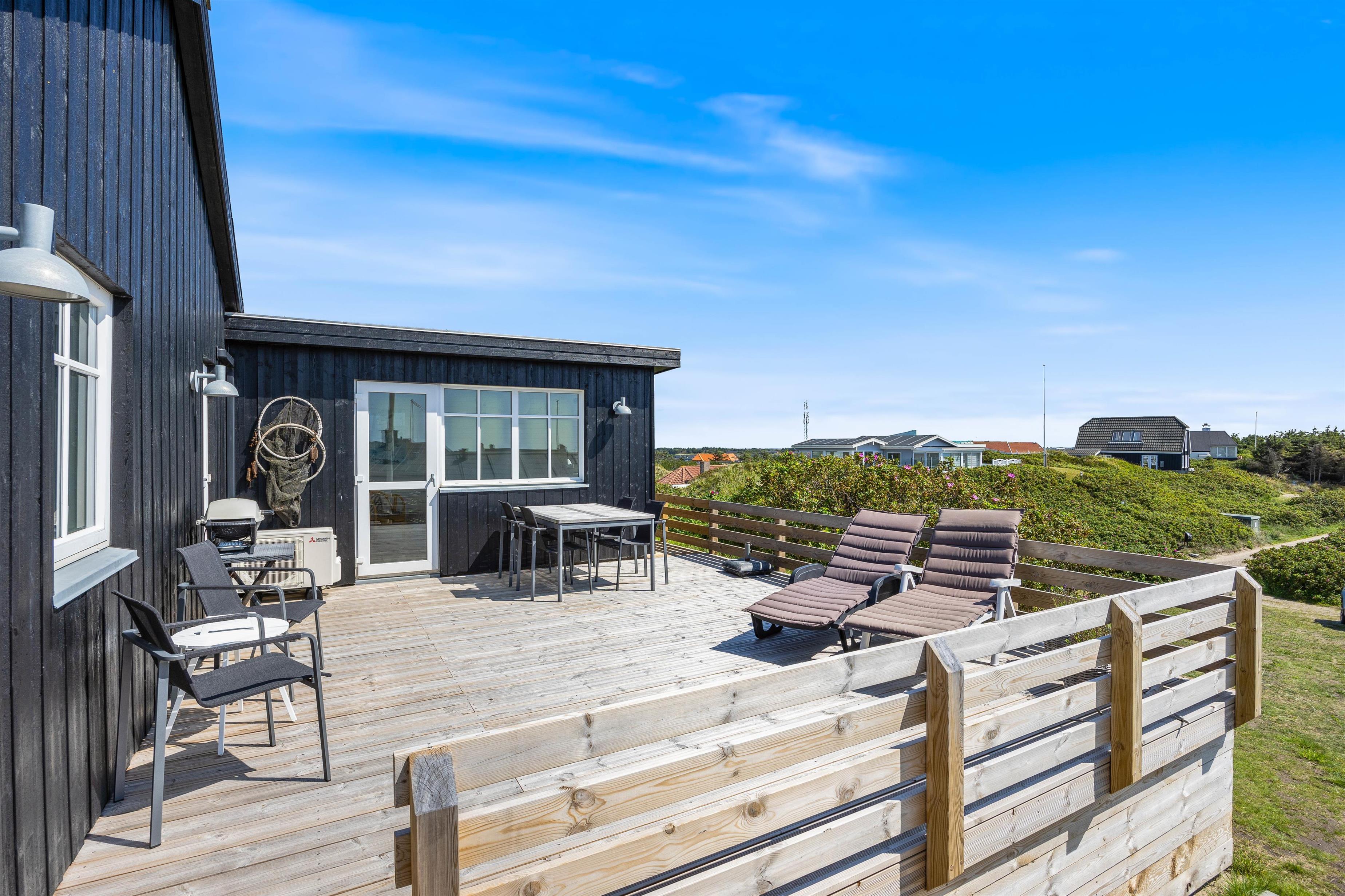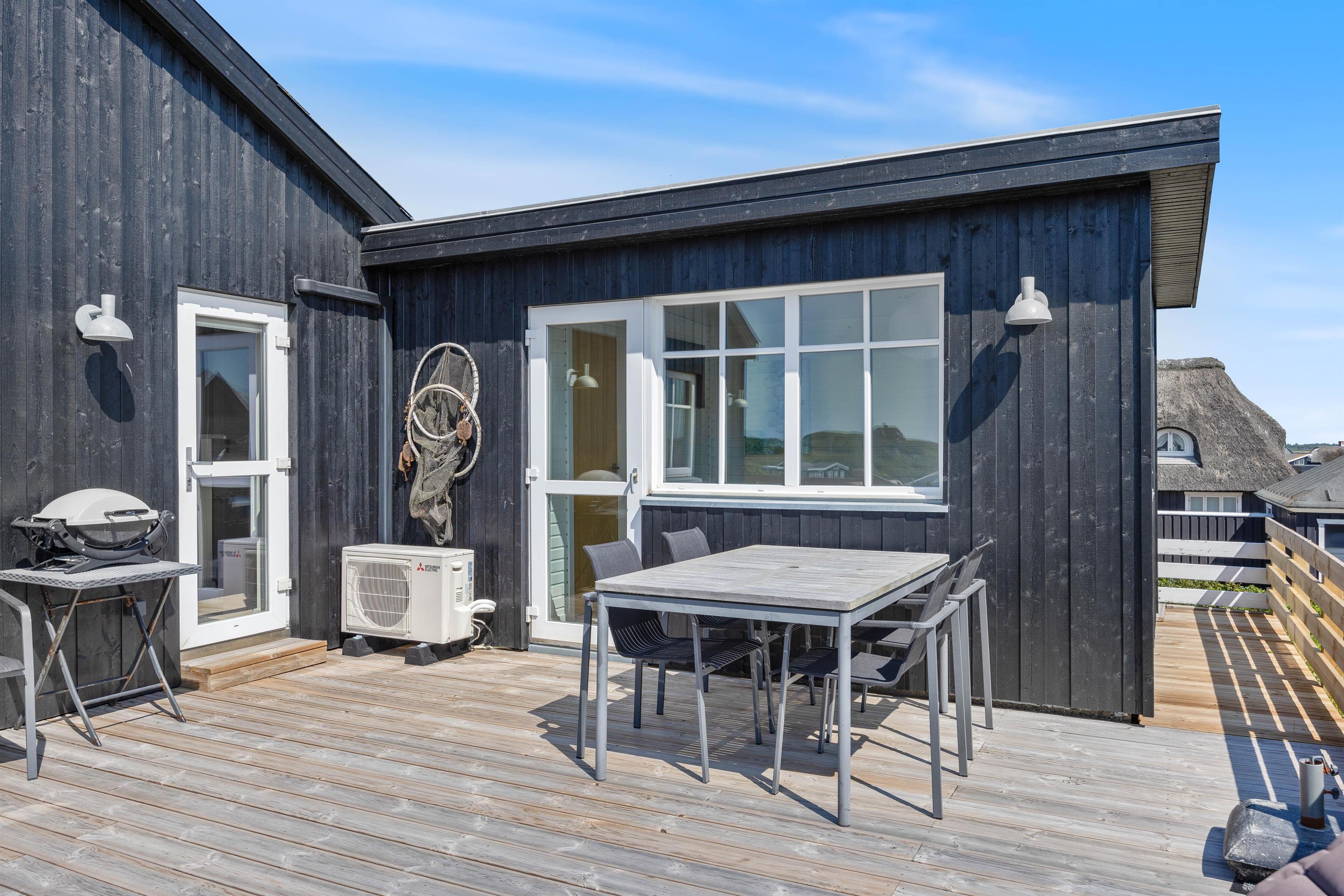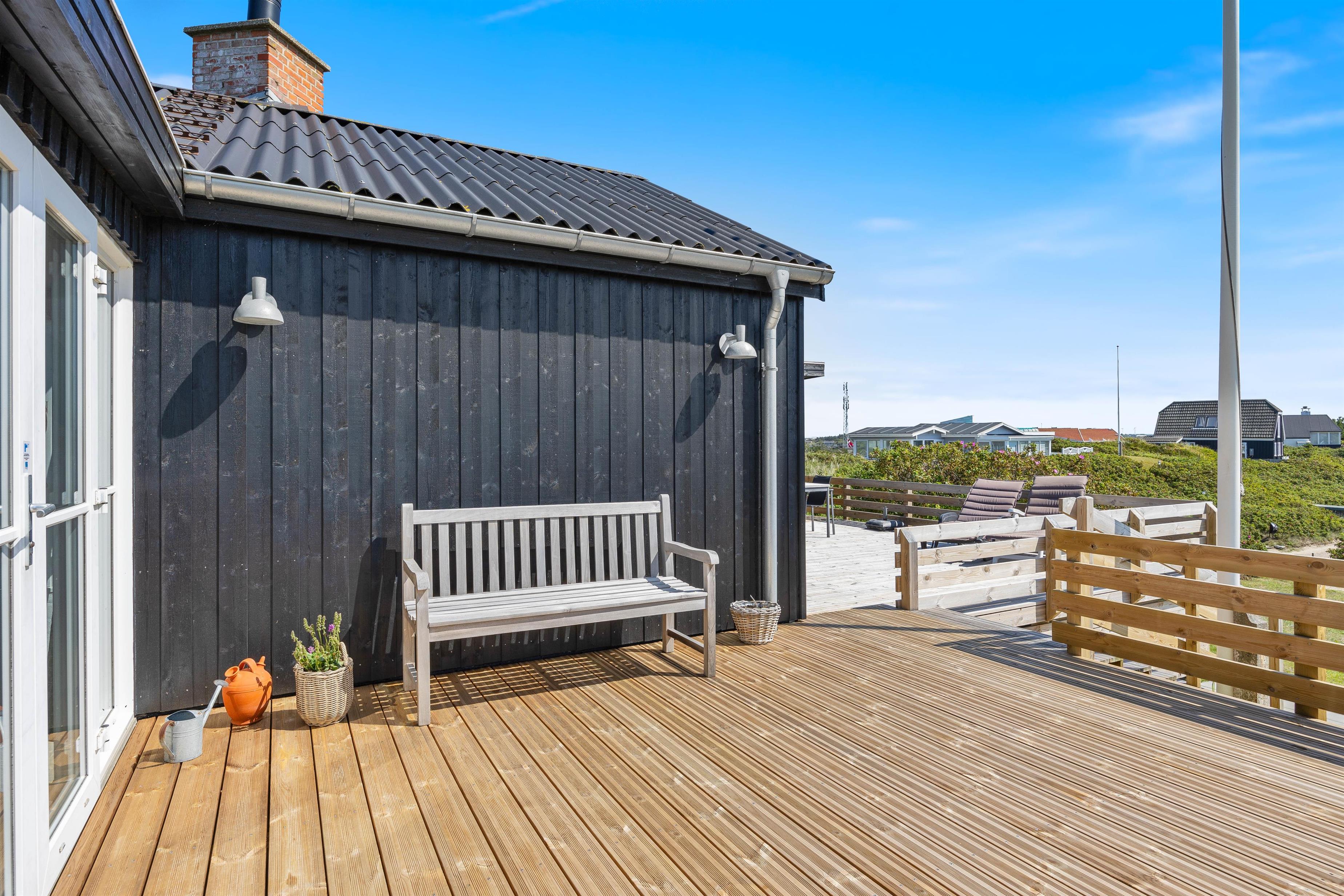 Rundt om huset går en stor, dejlig træterrasse med et hav af små hyggekroge og mere end nok siddepladser til alle feriegæster. Her kan I for alvor tanke ny energi og nyde den friske havluft og den fantastiske udsigt ud over Søndervig, og når vejret viser sig fra sin bedste side, kan I hive liggestolene frem og nyde solens stråler på bedste vis.