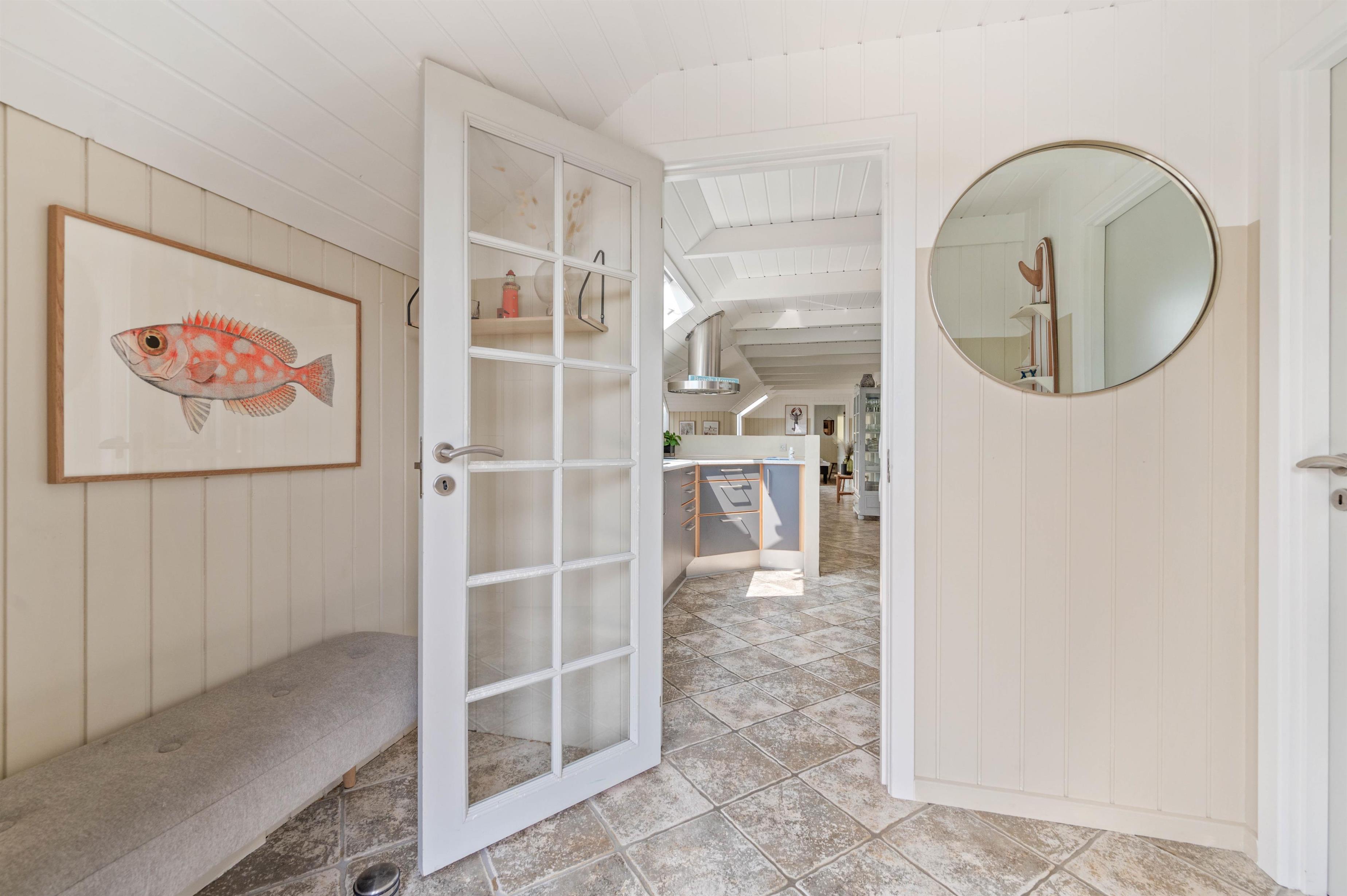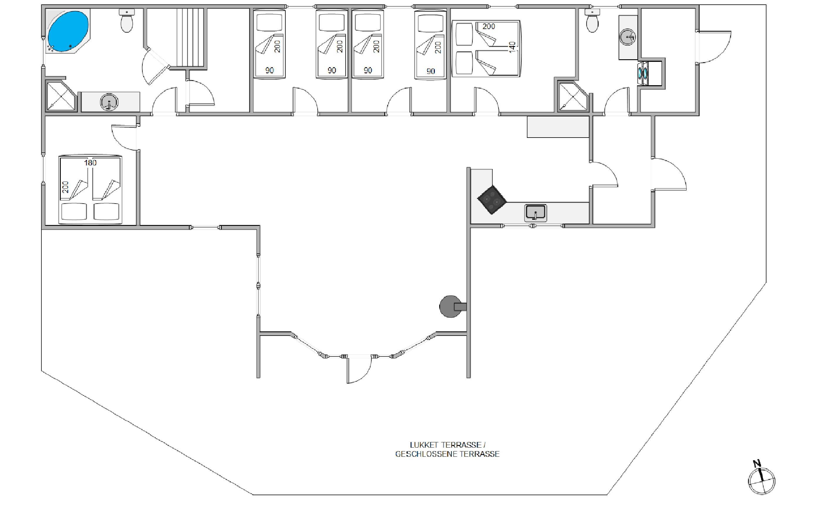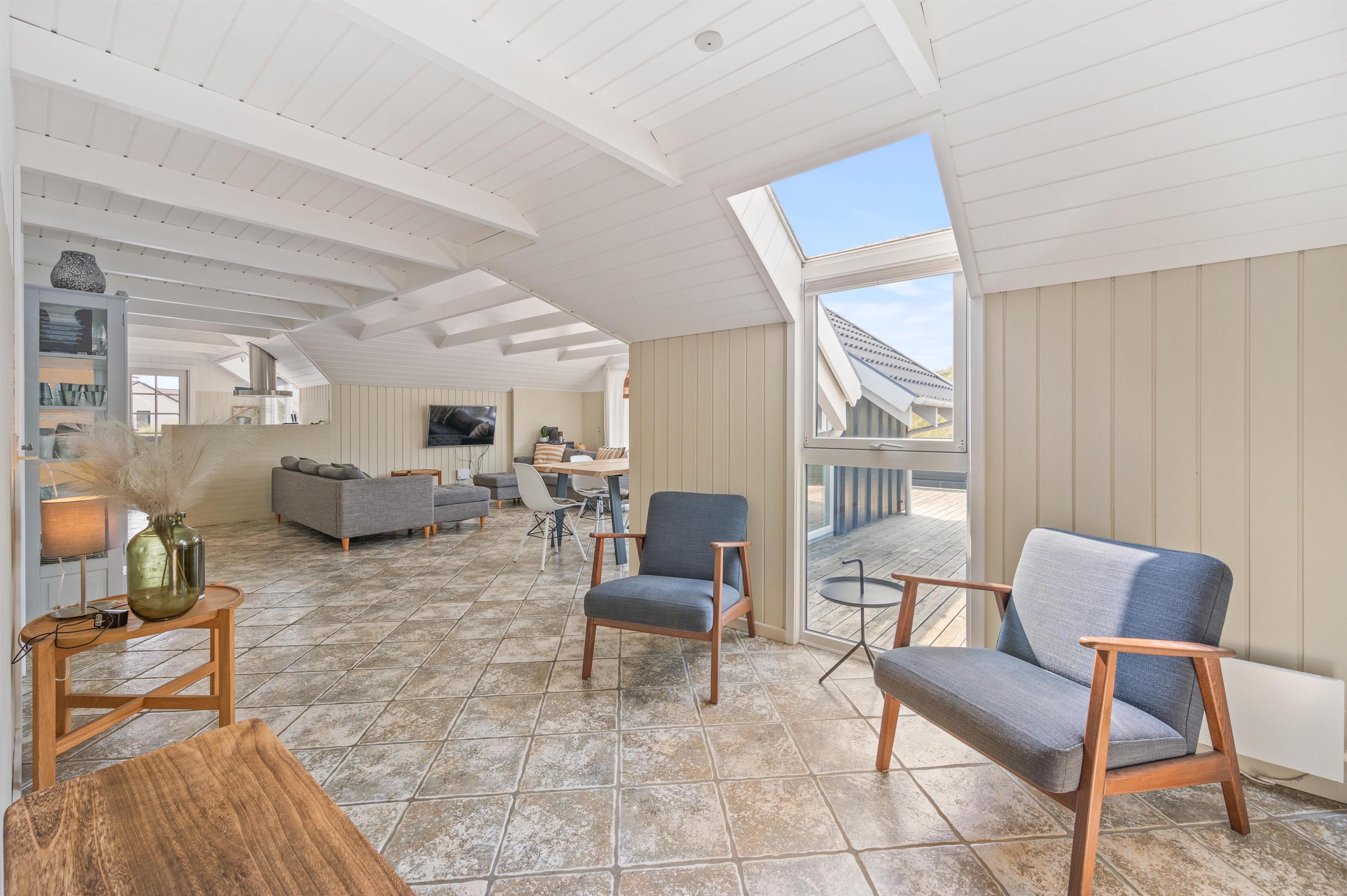 Terrassen er intet mindre end fantastisk. Den strækker sig omkring huset fra øst og mere end husets længde mod syd. Den er stor, helt lukker og delvist overdækker mod syd, så der er ofte mulighed for læ. Og området ved dette sommerhus er særdeles eftertragtet, dels fordi det ligger helt ud til det store fredede klitareal, som ligger helt op til Vesterhavet. Derudover er Søndervig centrum kun 1000 m væk, så skal der handles eller ønsker man at spise på en af byens restauranter, kan man klare dette uden at medbringe bil.