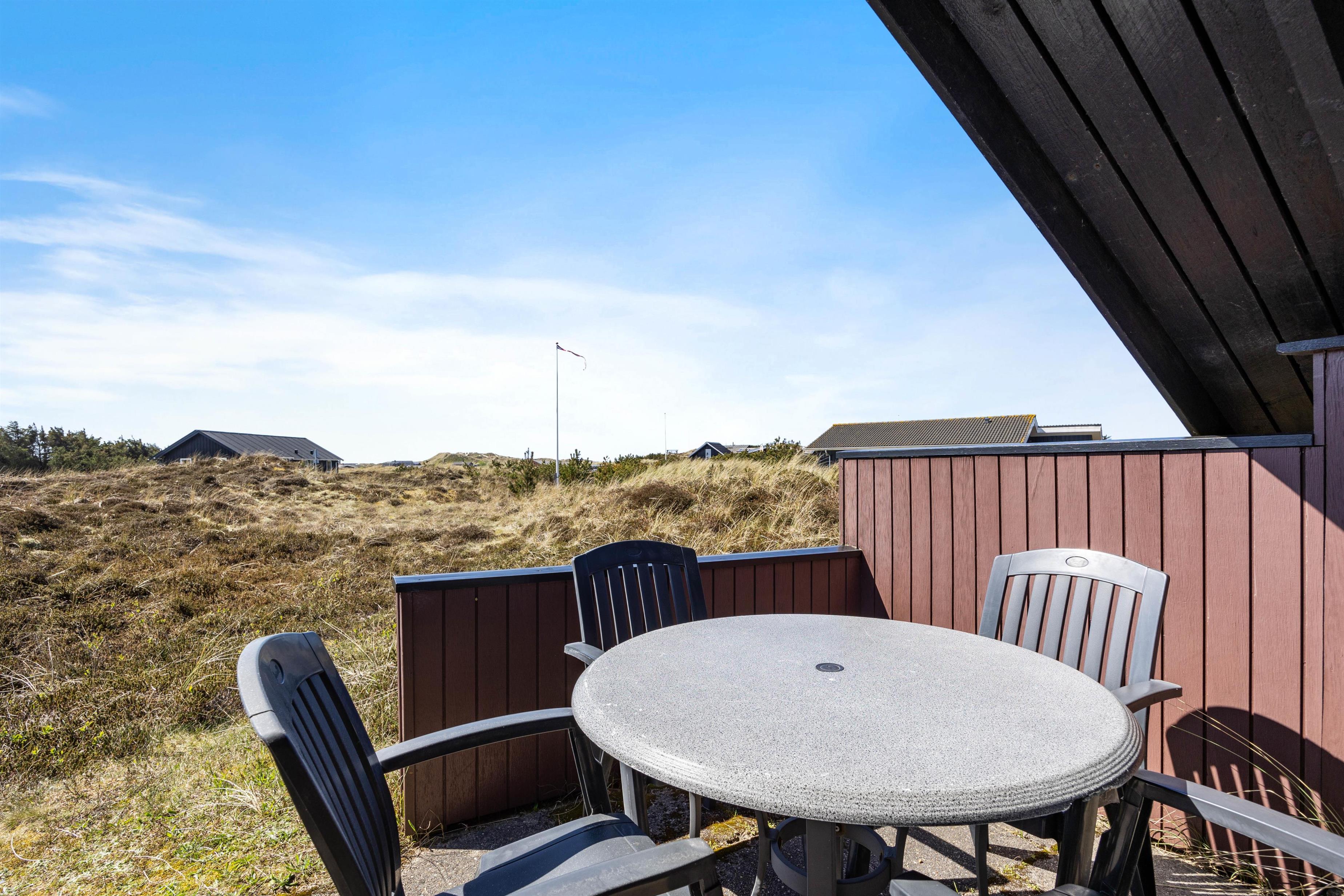 Fra opholdsstuen er der direkte udgang til den overdækkede syd- og vestvendte terrasse. Herfra kan I nyde et eneståede view ud over det åbne hedelandskab. På terrassen kan I slappe af i liggestolene, hygge med bøffer på grillen eller nyde en smuk solnedgang på en lun sommeraften til lyden af Vesterhavet i det fjerne og vinden, der danser med marehalmen omkring huset.