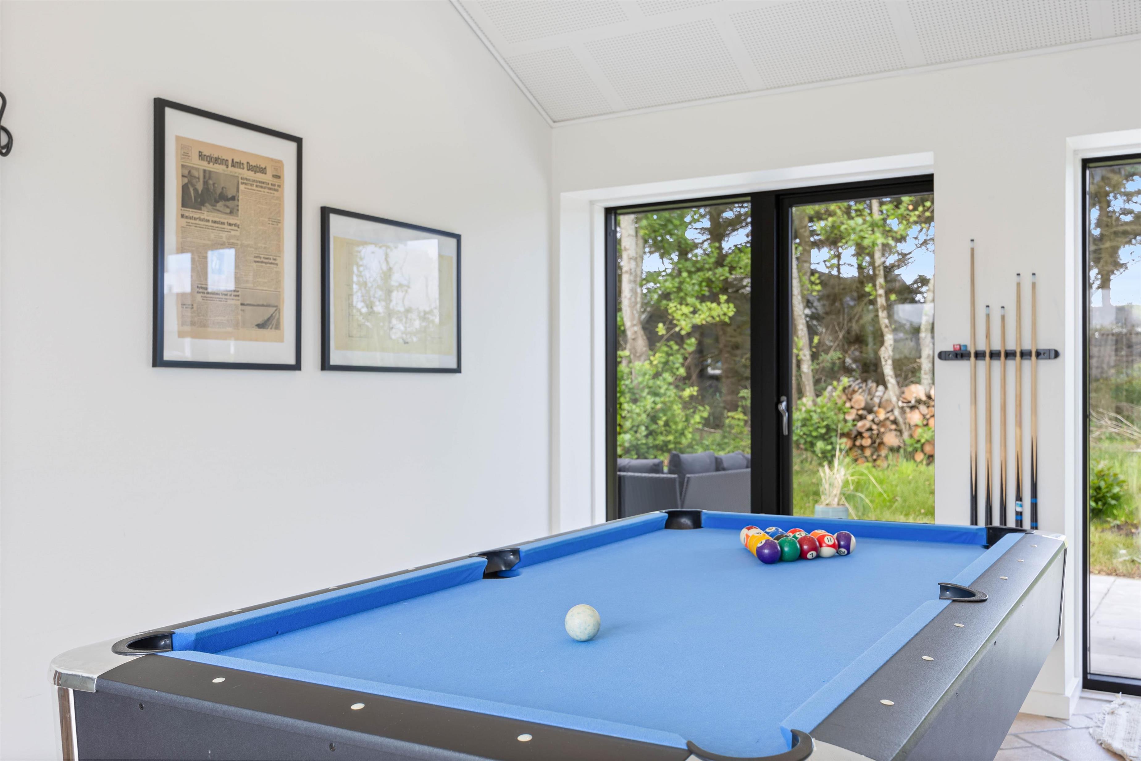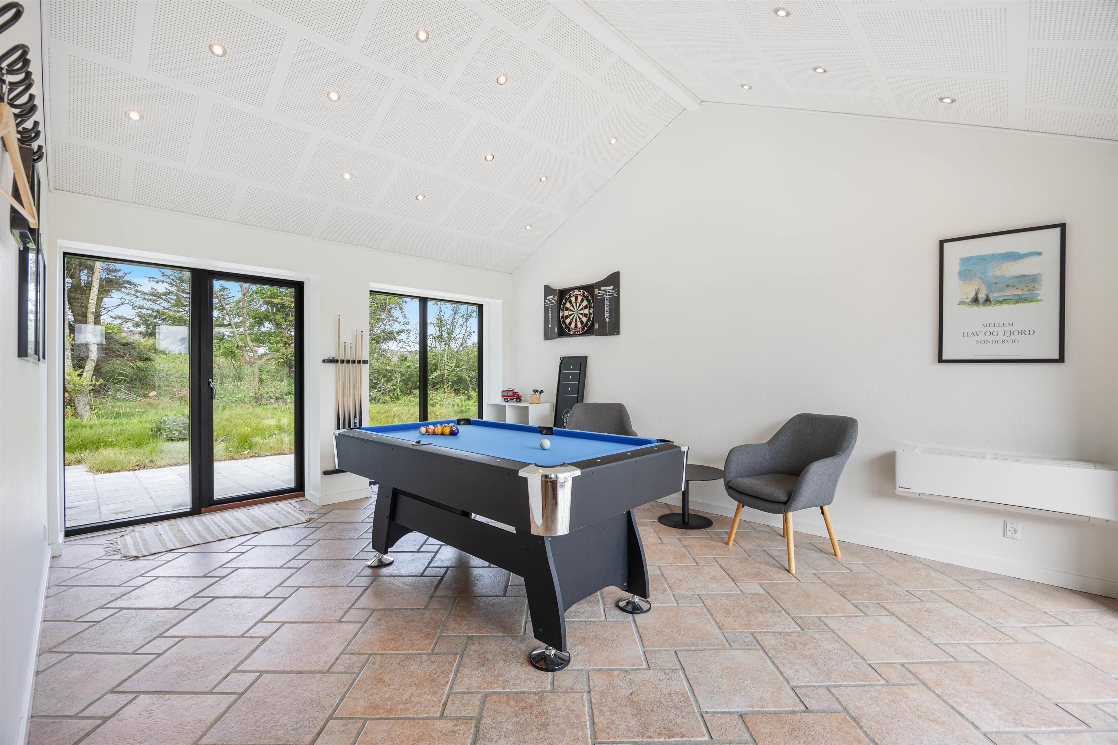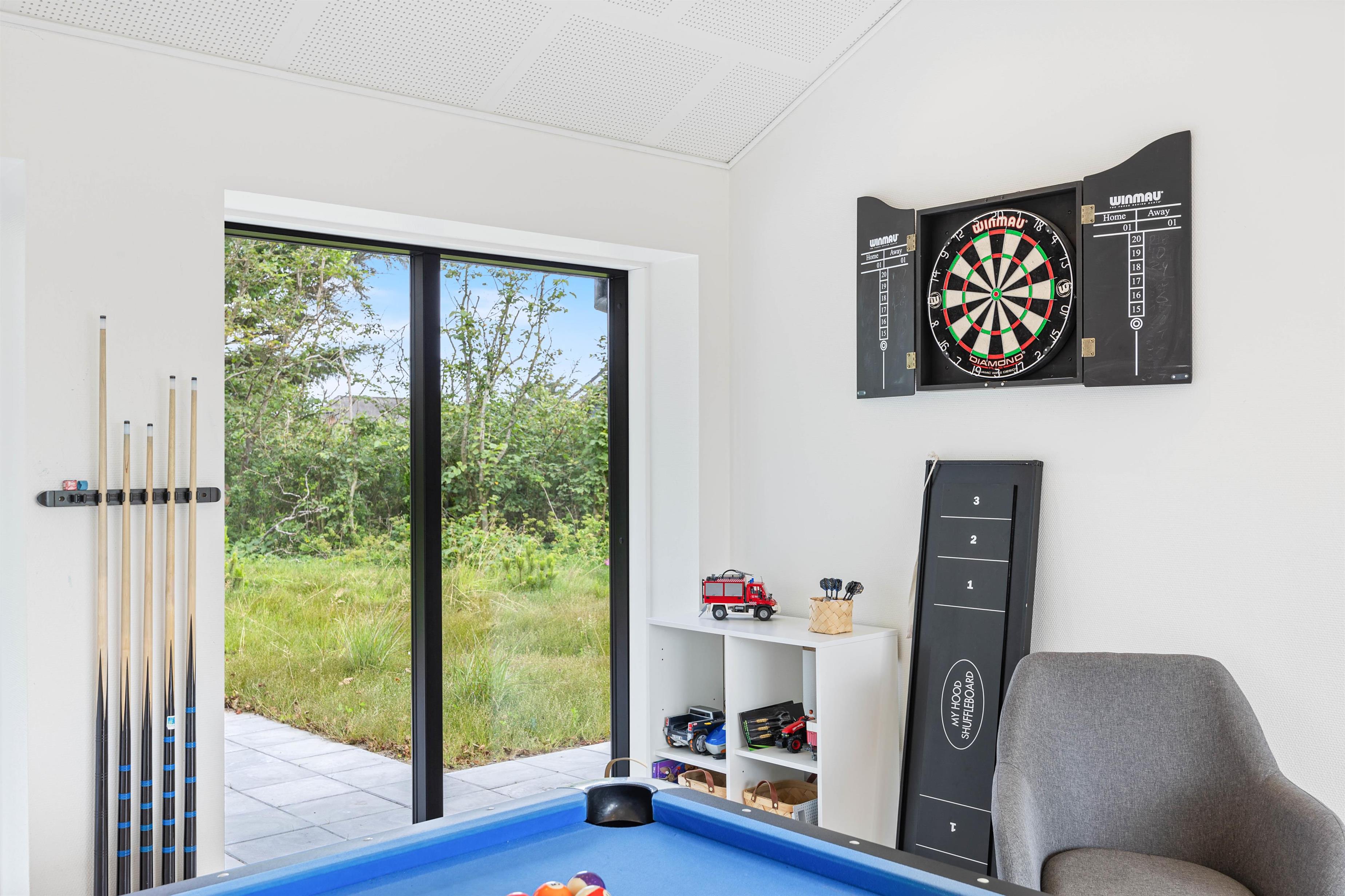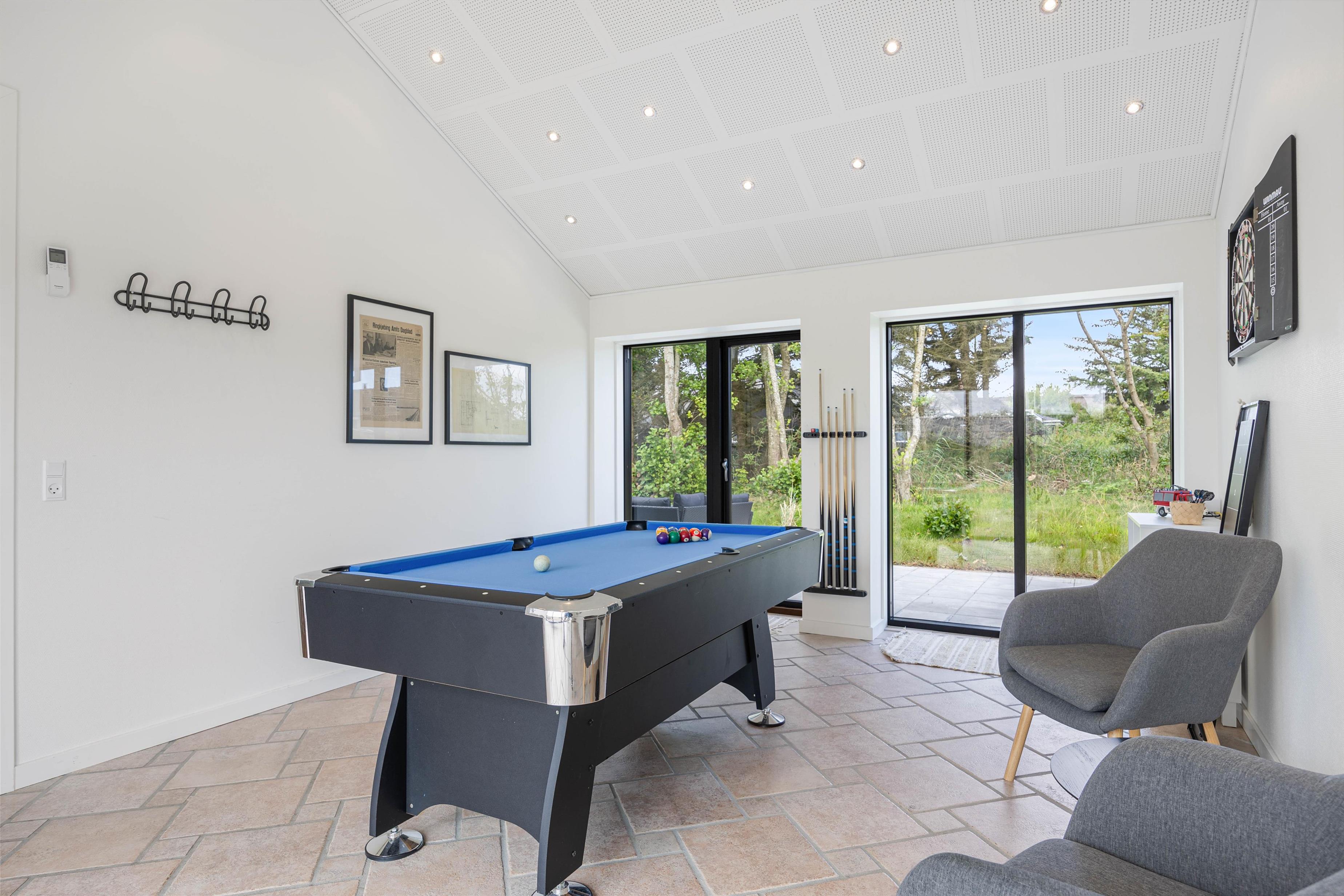 Hele opholdsrummet er stort, og med sommerhusets indretning gør det muligt at kombinere underholdning og afslapning. De aktive familiemedlemmer kan mødes til en spændende turnering ved billardbordet, mens dem, der foretrækker rendyrket afslapning, kan læne sig tilbage på sofaen med en god bog, mens ilden fra brændeovnen knitrer i baggrunden. Rundt omkring flere steder i huset er der masser af hyggekroge, hvor I kan læne jer tilbage og nyde noget afslapning.