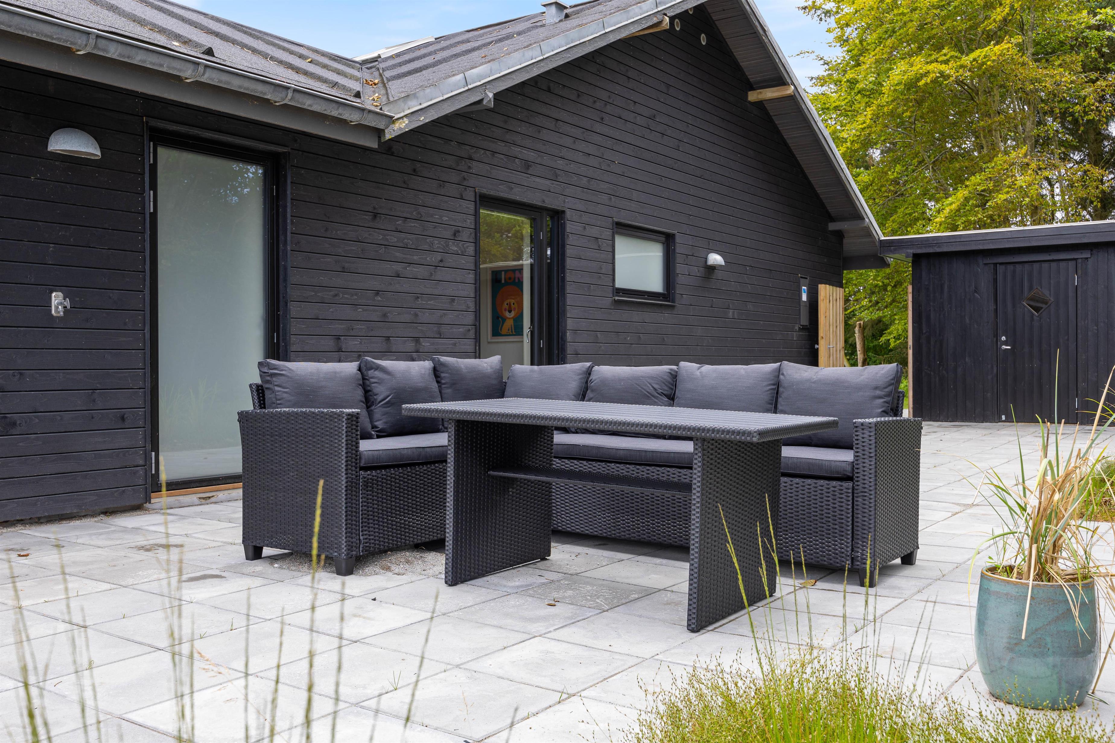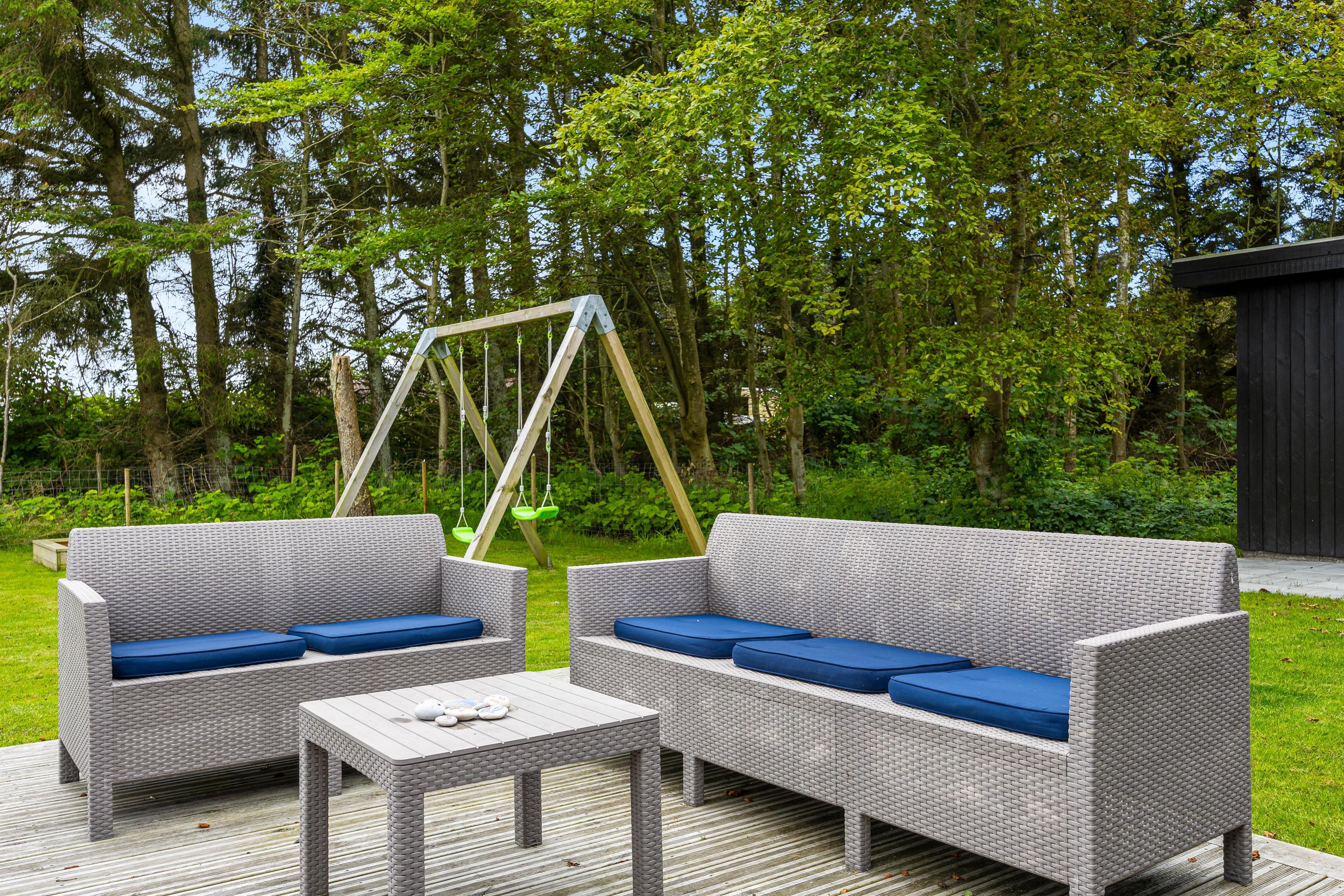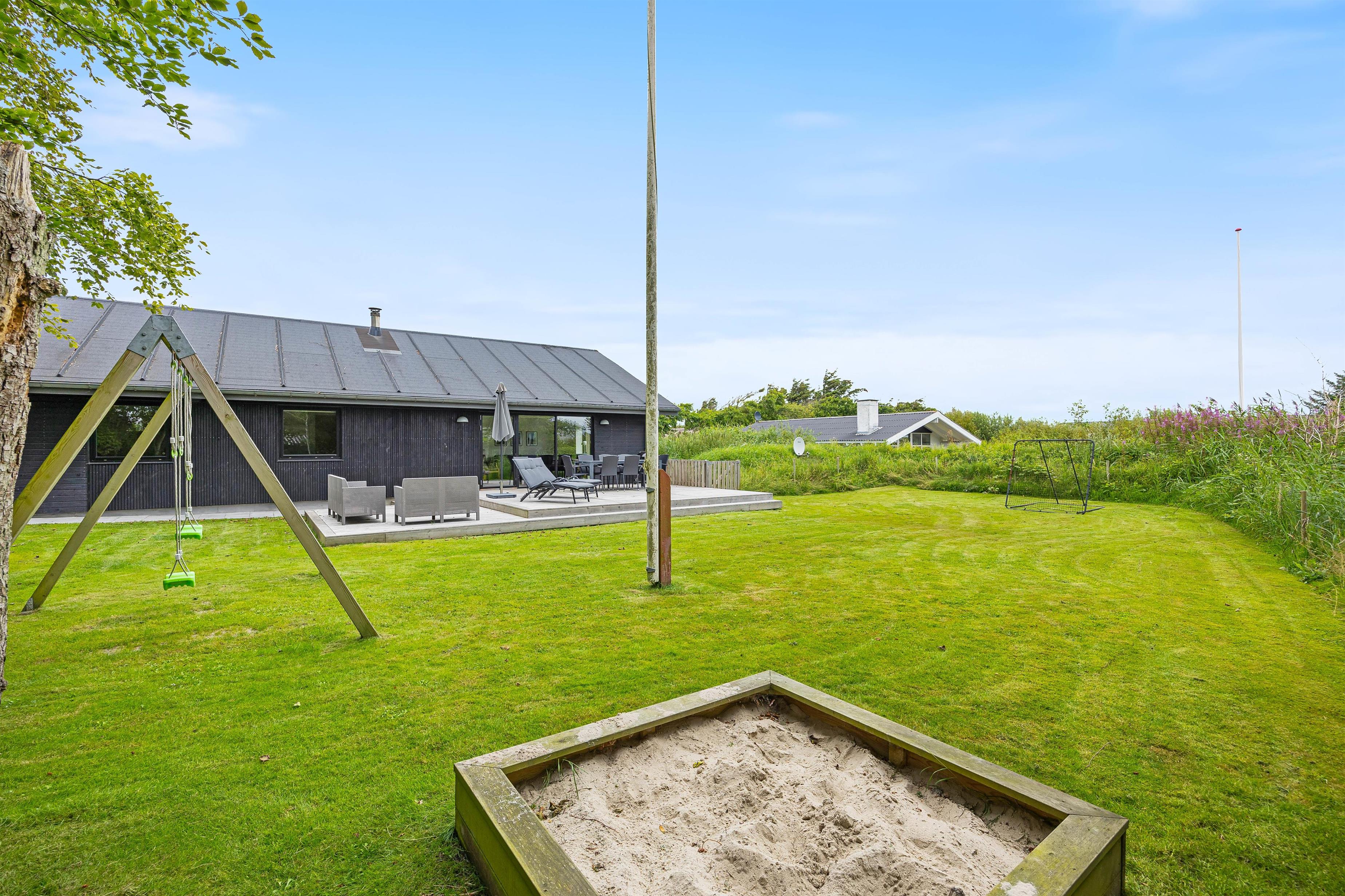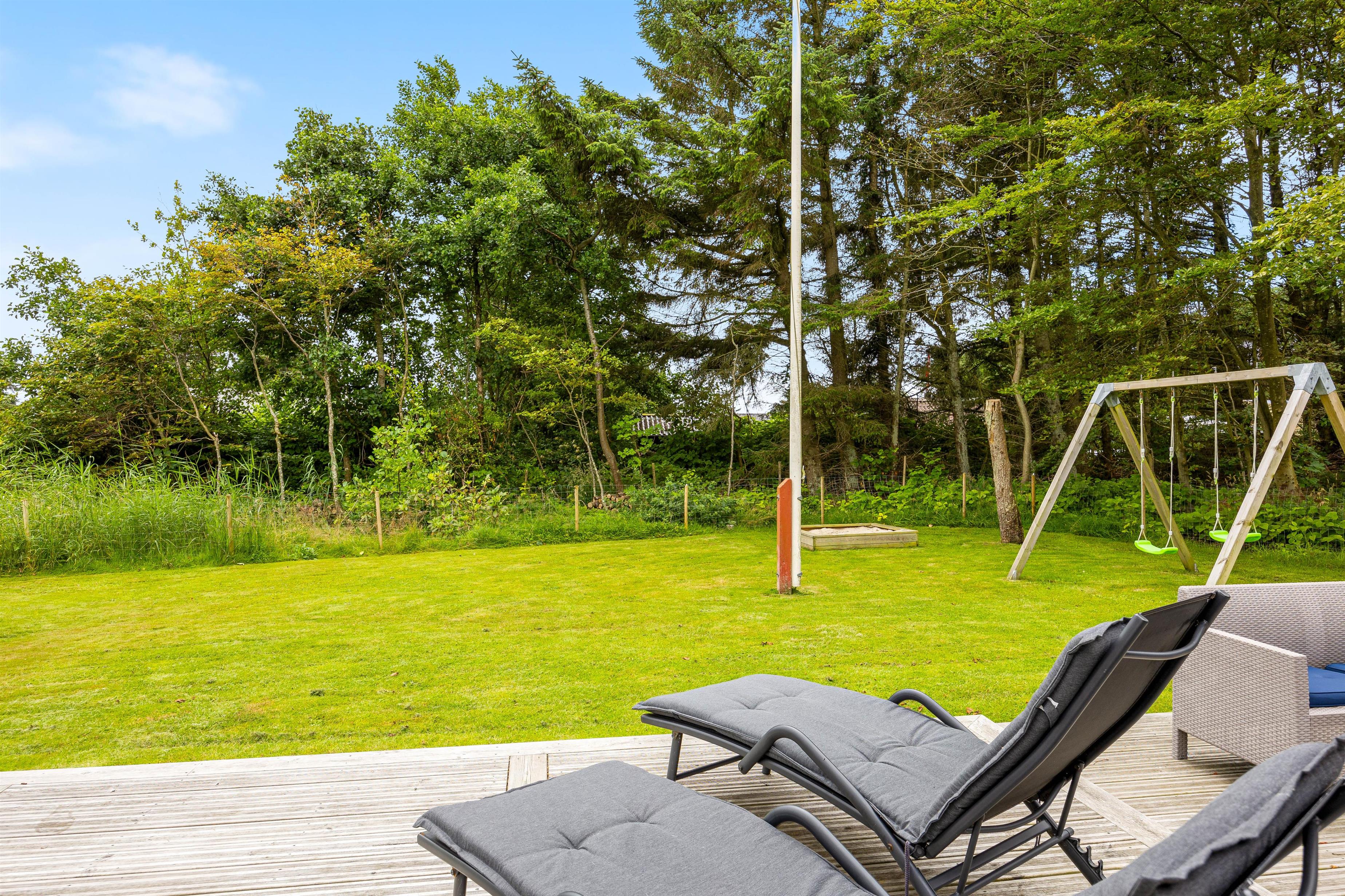 Sommerhuset har et skønt udeareal med åben terrasse og have mod syd. Her kan både børnene og hunden få fri leg, mens I ser til fra liggestolene eller tilbereder aftensmaden på grillen. På grunden er der desuden sandkasse og gyngestativ til glæde for de yngste familiemedlemmer.