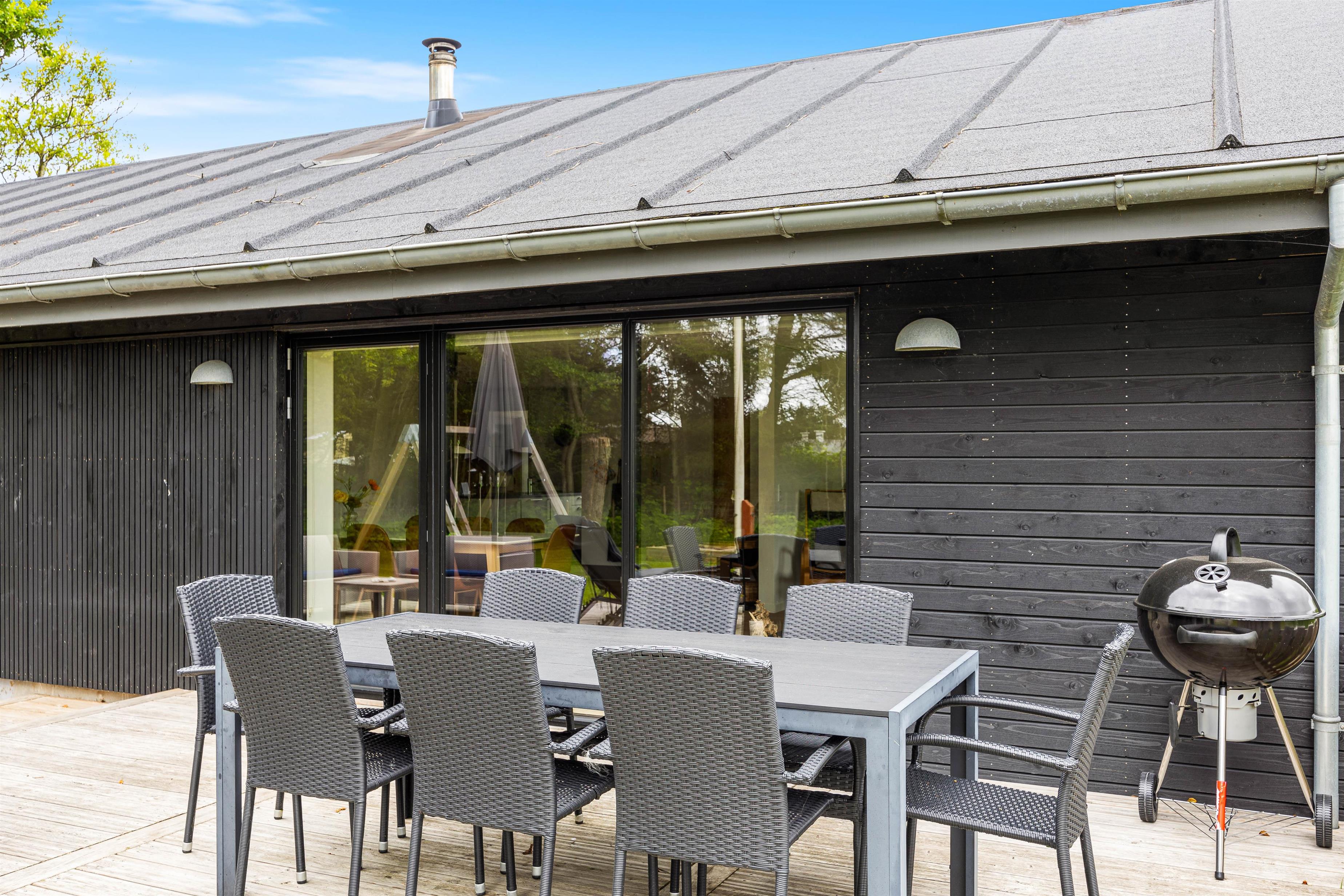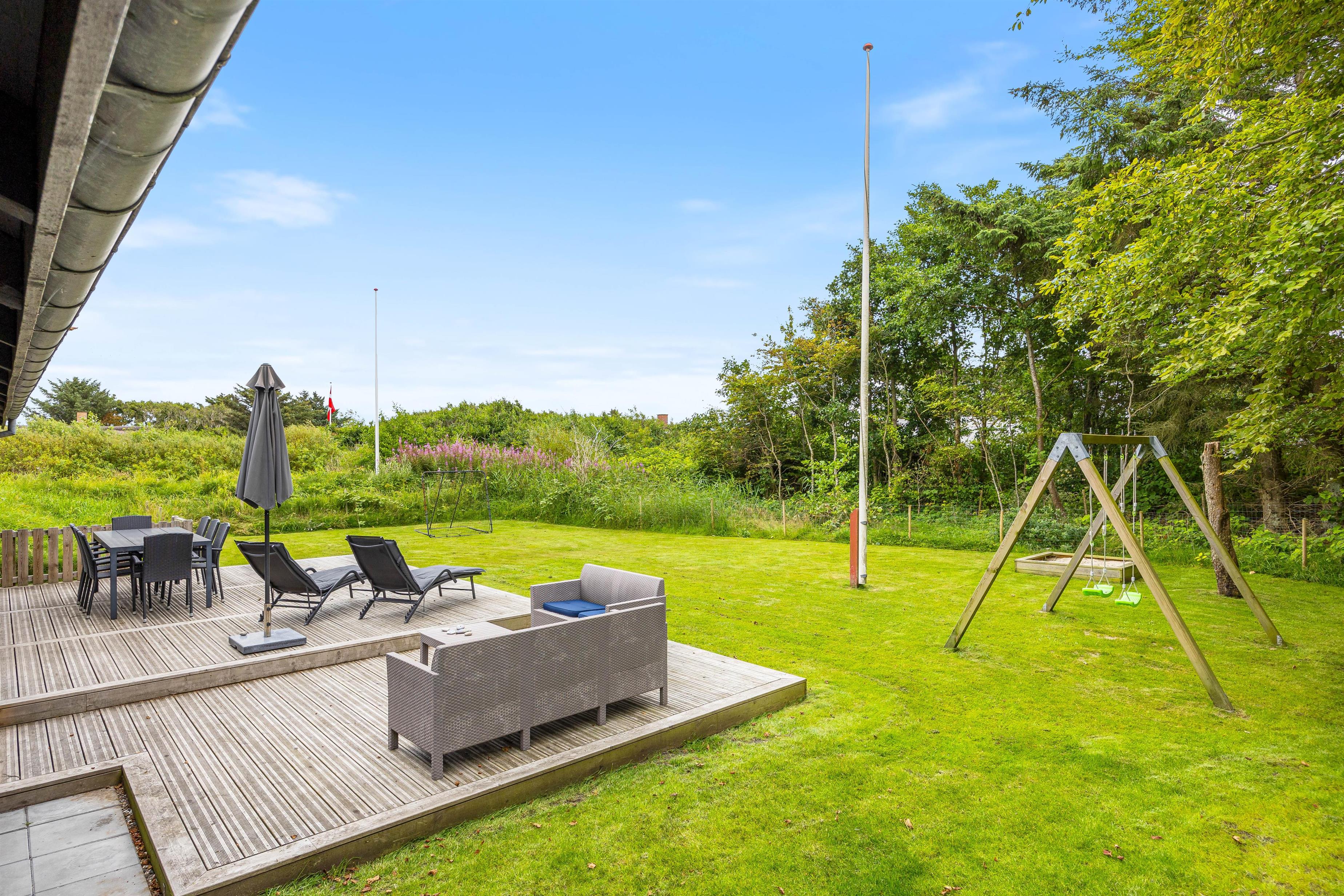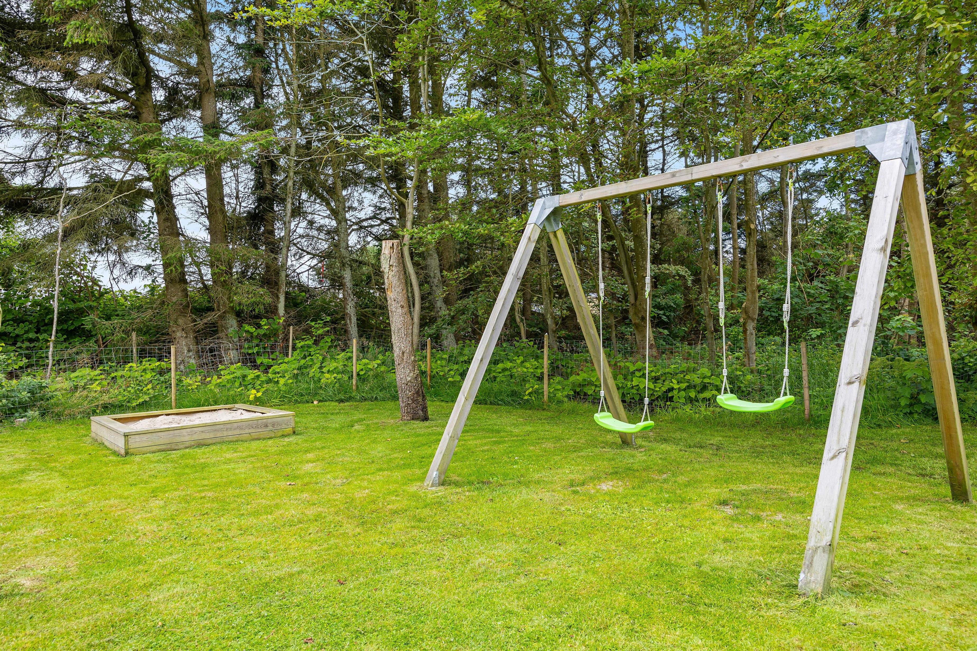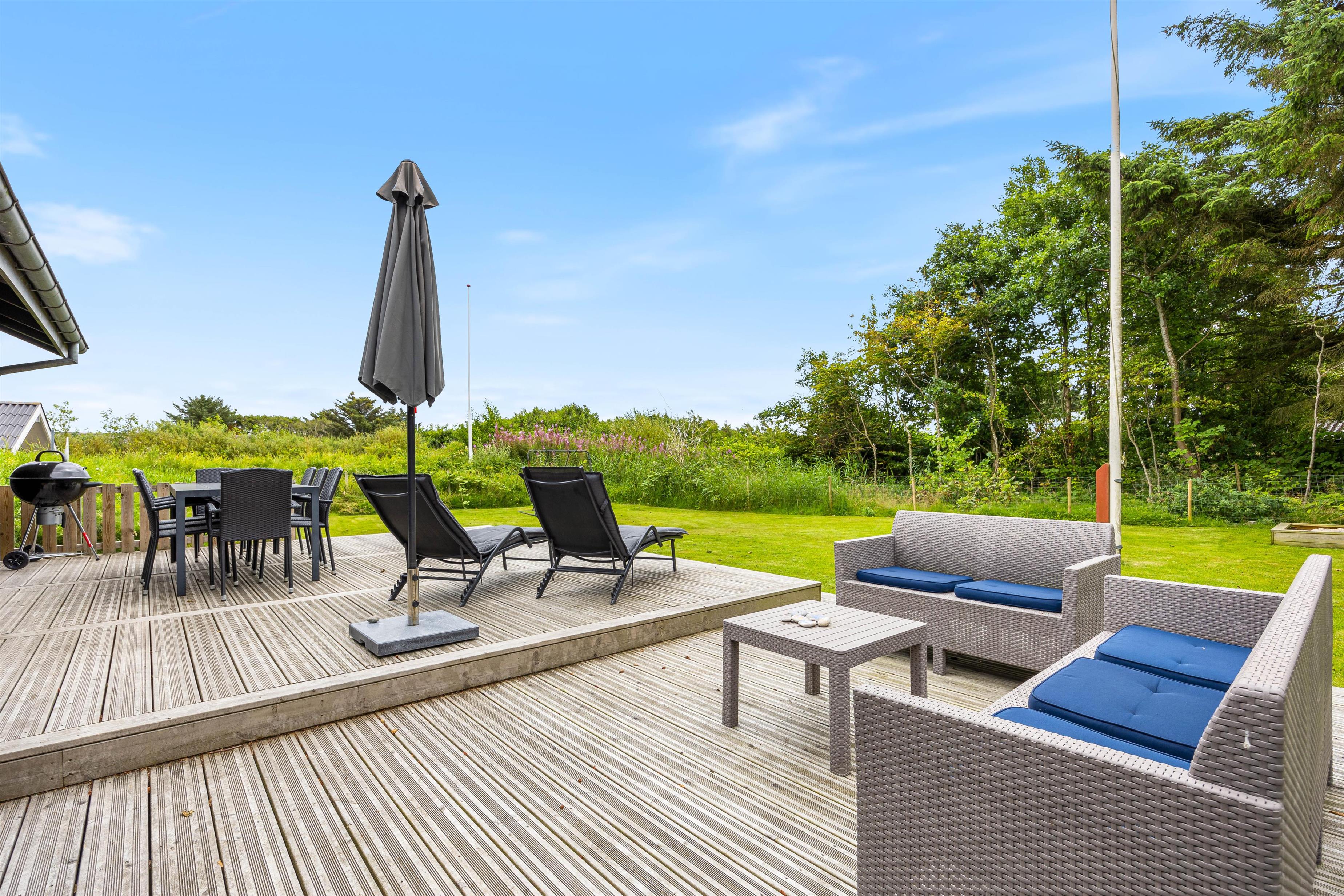 Sommerhuset har et skønt udeareal med åben terrasse og have mod syd. Her kan både børnene og hunden få fri leg, mens I ser til fra liggestolene eller tilbereder aftensmaden på grillen. På grunden er der desuden sandkasse og gyngestativ til glæde for de yngste familiemedlemmer.