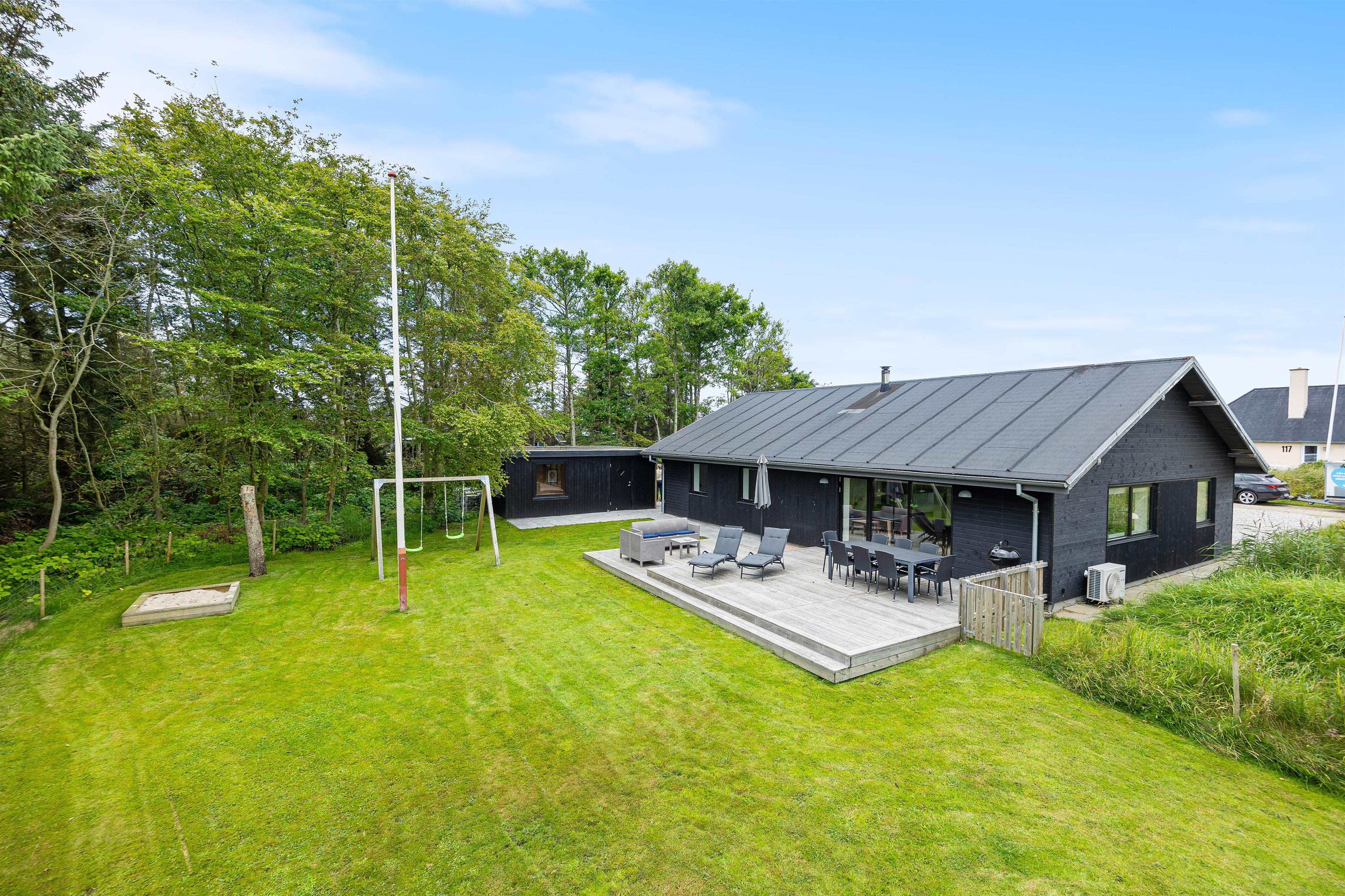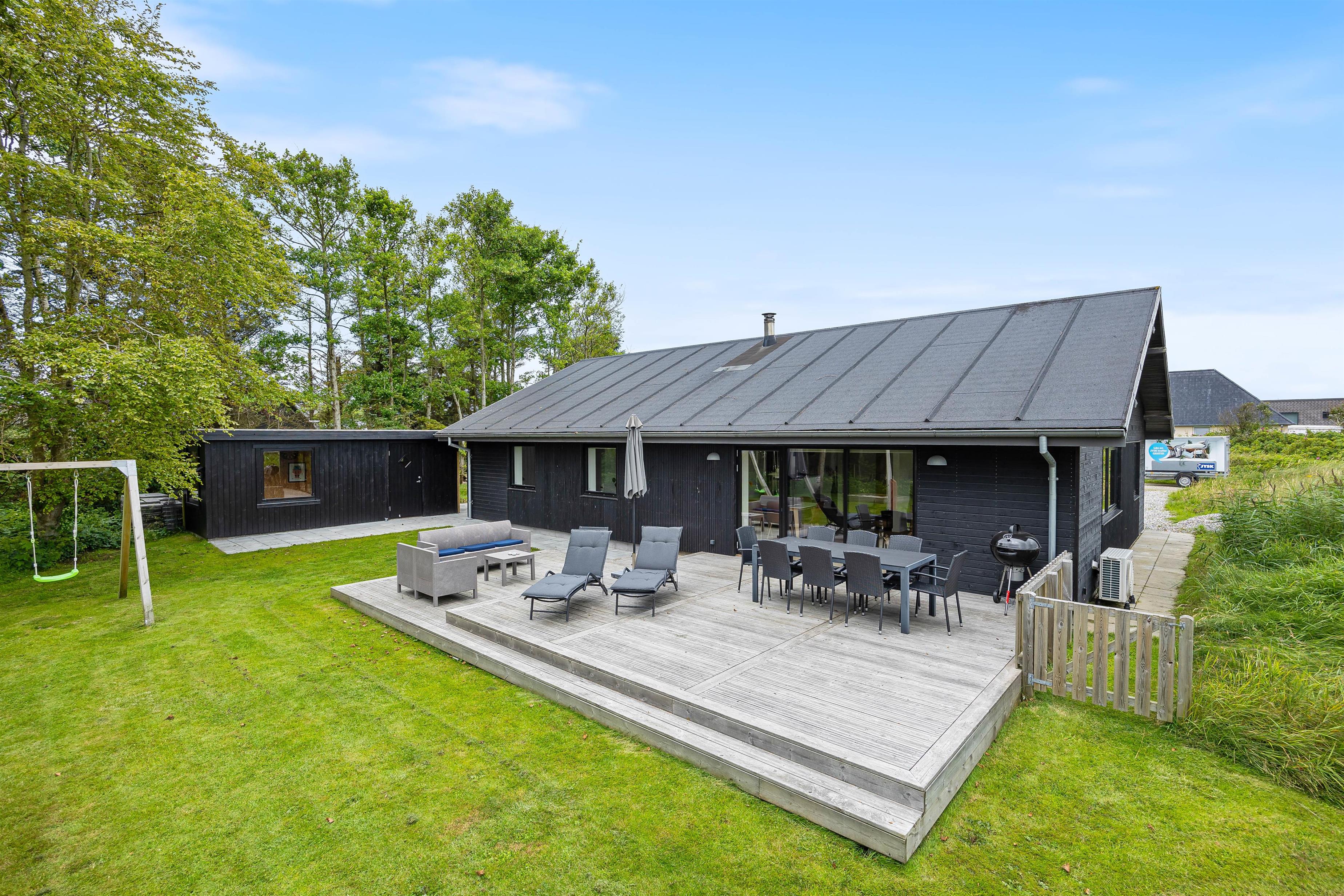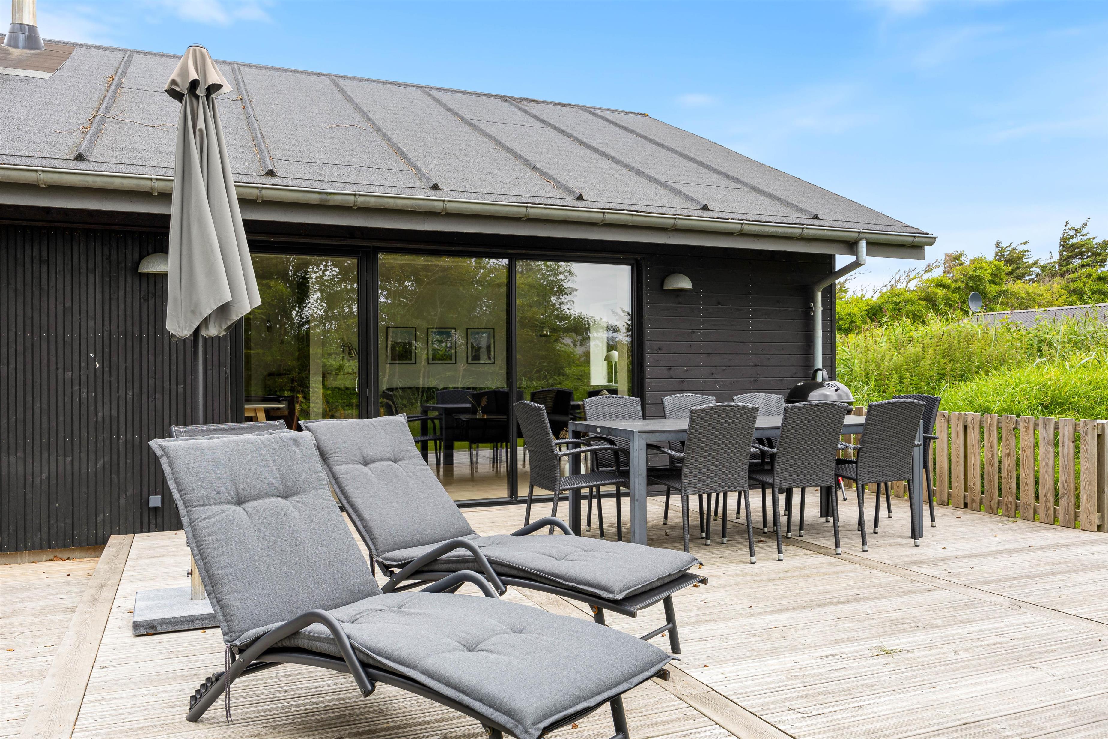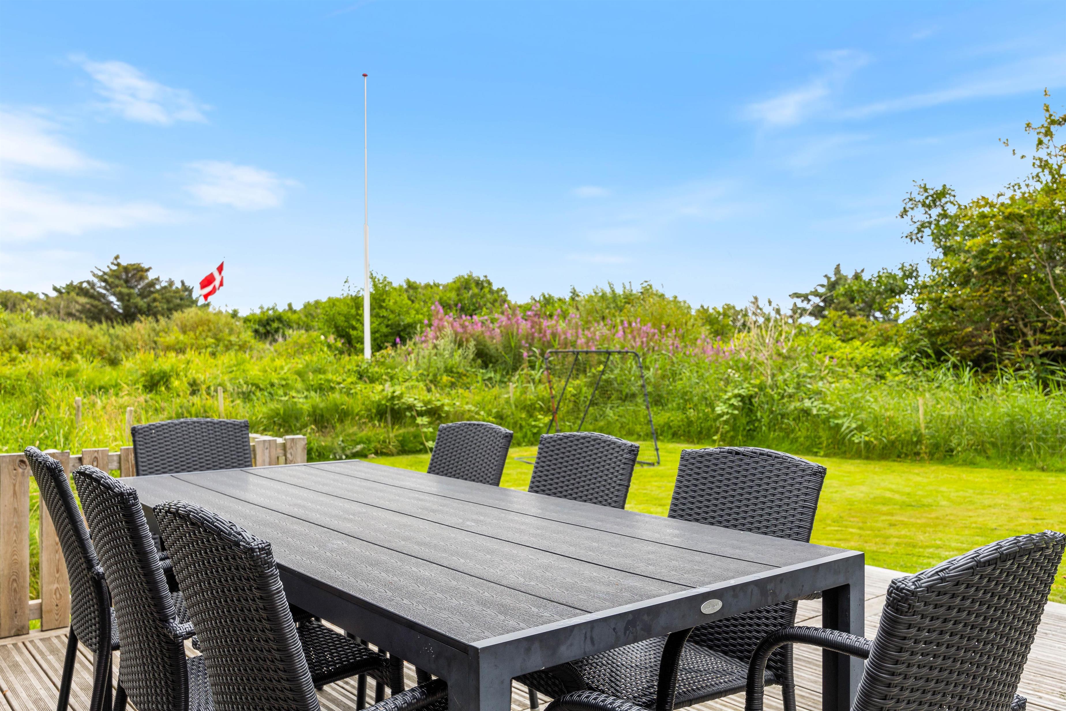Sommerhuset har et skønt udeareal med åben terrasse og have mod syd. Her kan både børnene og hunden få fri leg, mens I ser til fra liggestolene eller tilbereder aftensmaden på grillen. På grunden er der desuden sandkasse og gyngestativ til glæde for de yngste familiemedlemmer.