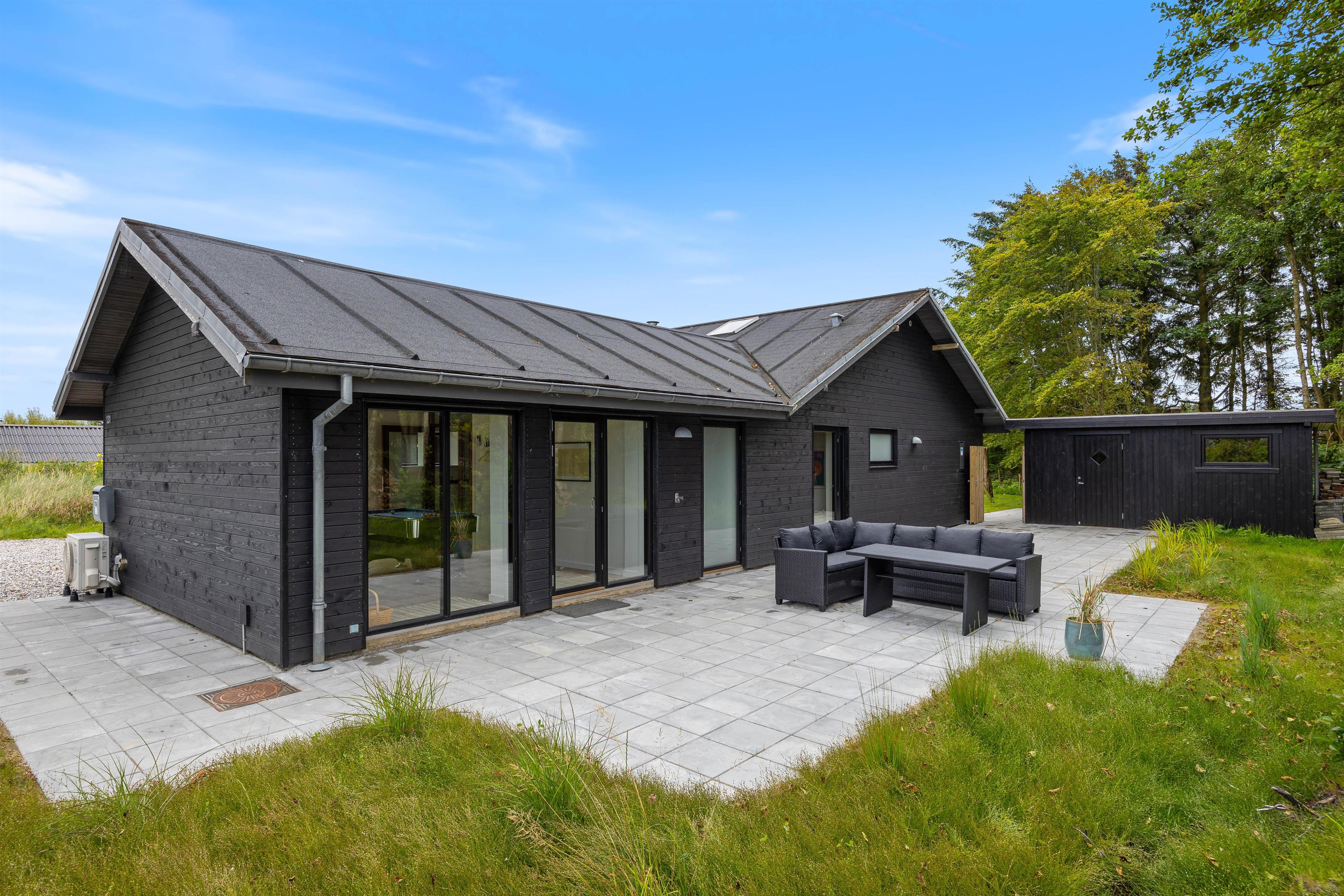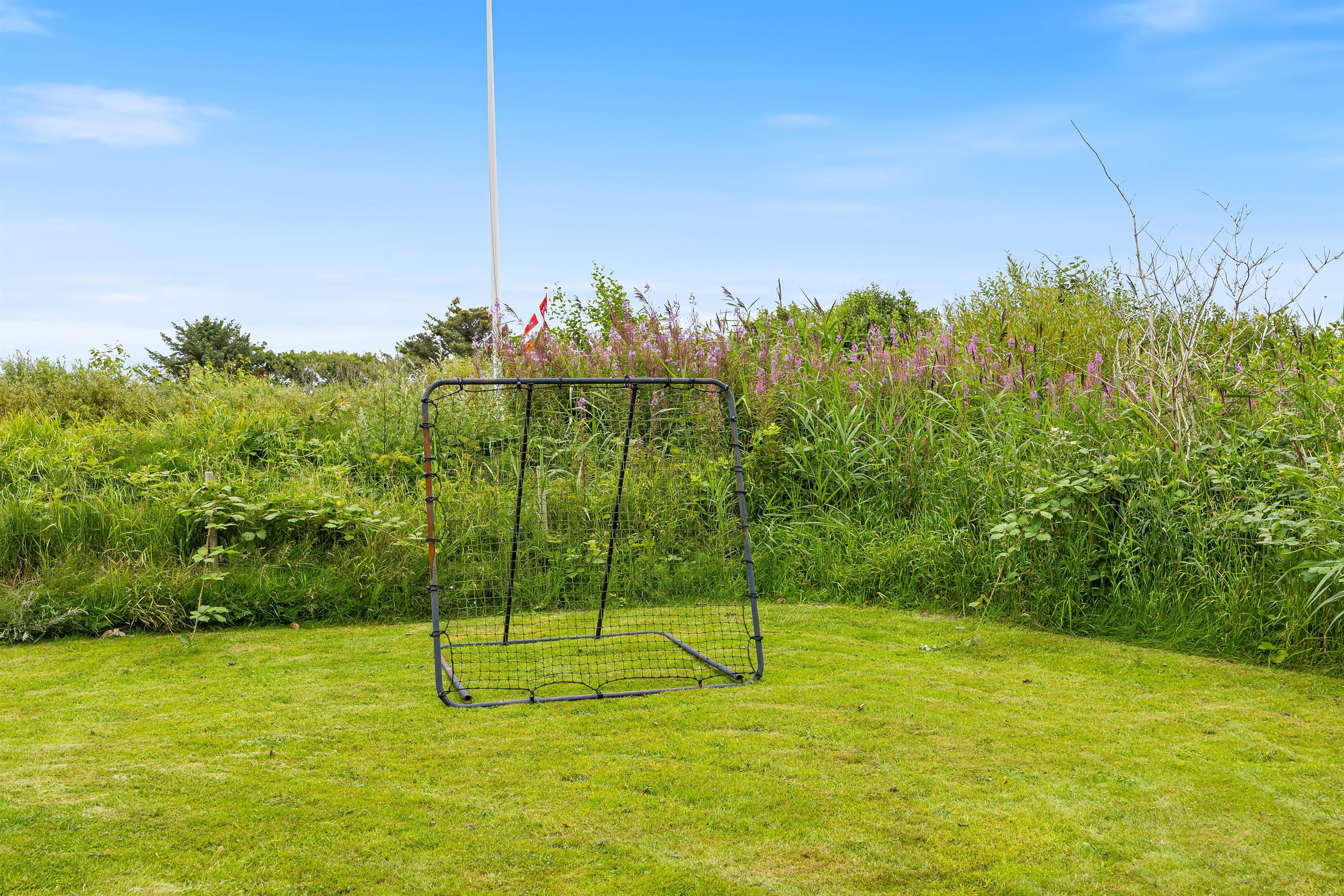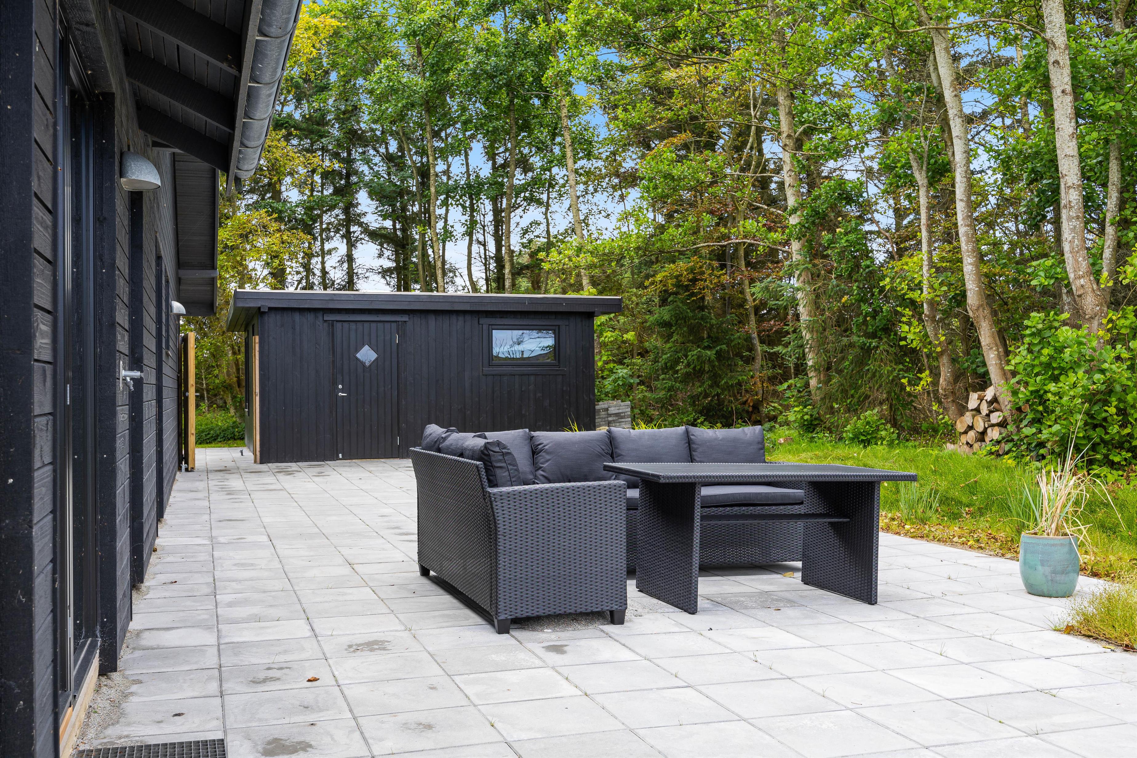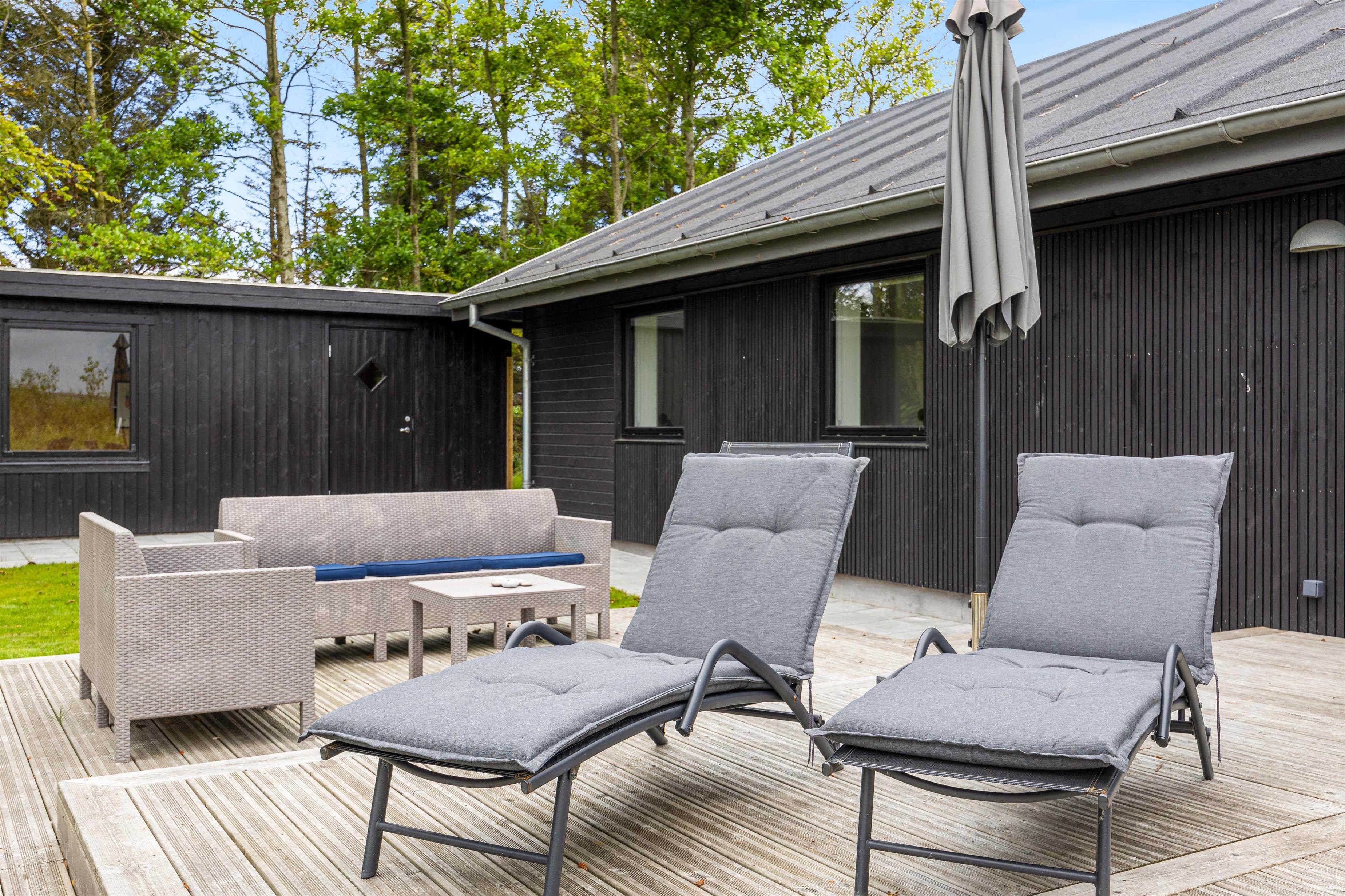 Sommerhuset har et skønt udeareal med åben terrasse og have mod syd. Her kan både børnene og hunden få fri leg, mens I ser til fra liggestolene eller tilbereder aftensmaden på grillen. På grunden er der desuden sandkasse og gyngestativ til glæde for de yngste familiemedlemmer.